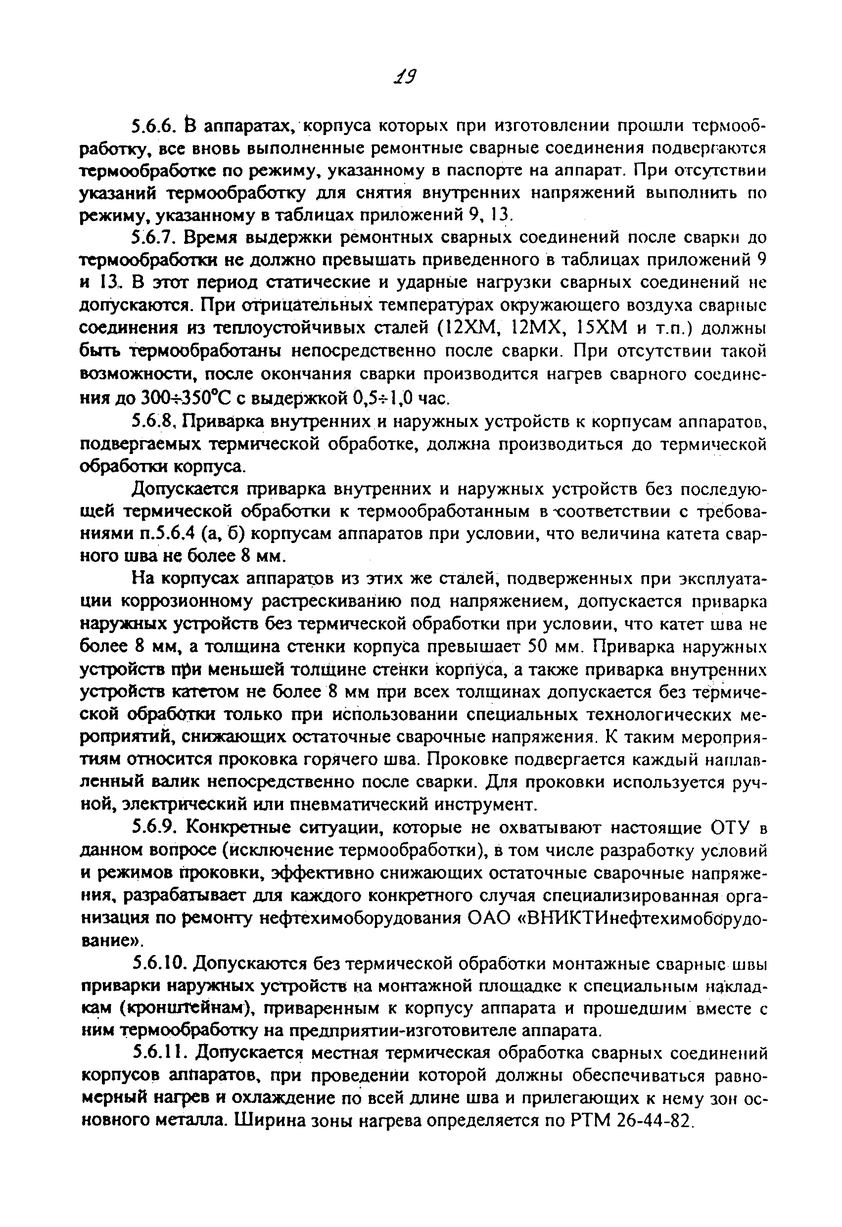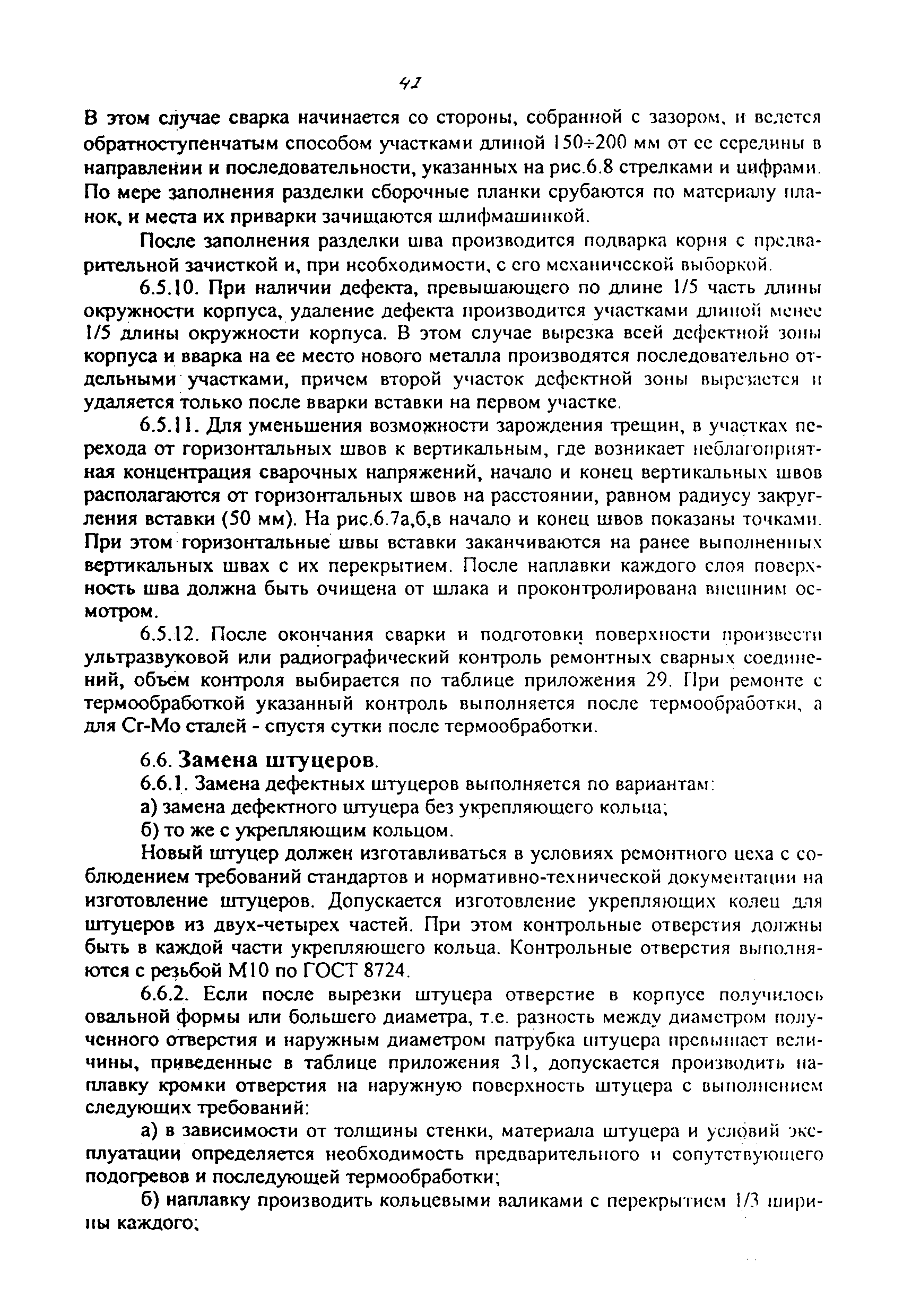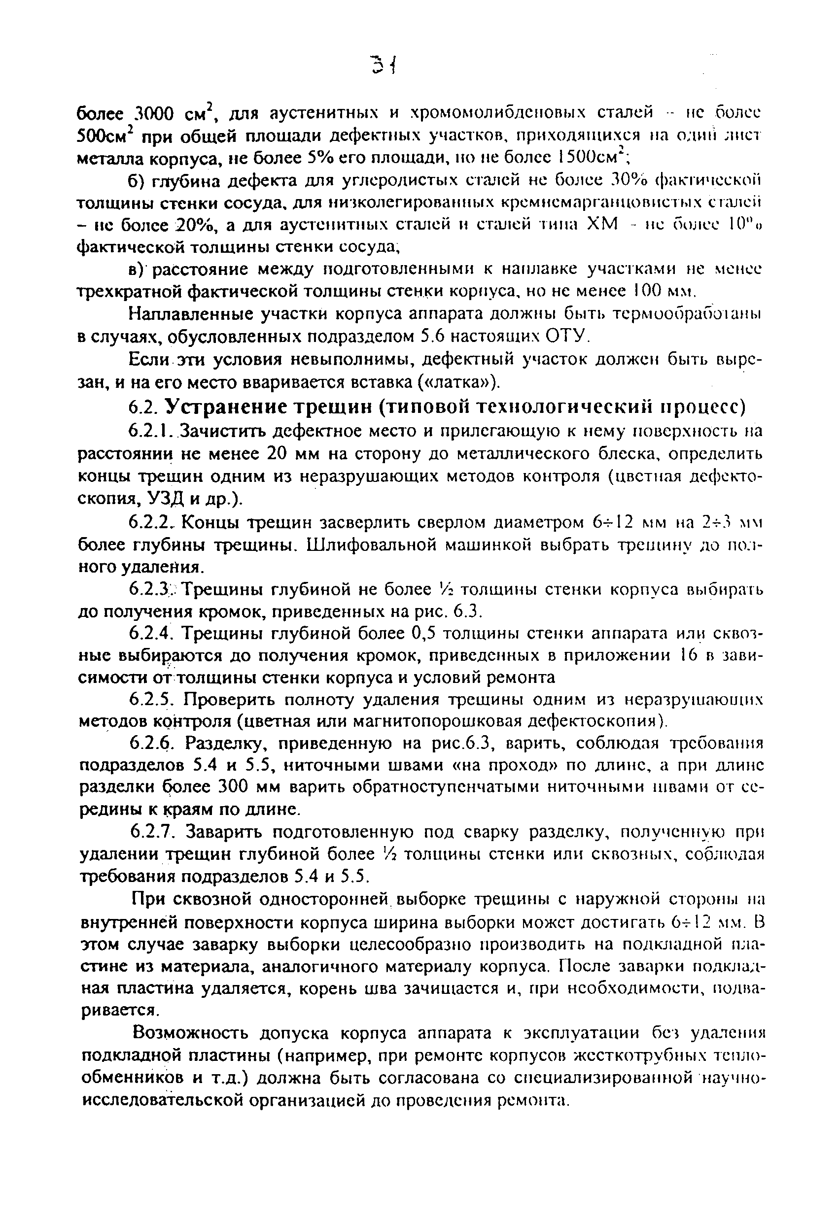 Сосуды и аппараты. Общие технические условия на ремонт корпусов| Обозначение: | ОТУ 3-01 | | Обозначение англ: | OUT 3-01 | | Статус: | взамен | | Название рус.: | Сосуды и аппараты. Общие технические условия на ремонт корпусов | | Дата добавления в базу: | 01.01.2019 | | Дата актуализации: | 01.01.2021 | | Область применения: | Технические условия являются руководящим документом при ремонте и реконструкции стальных сварных сосудов и аппаратов с толщиной стенки от 4 до 120 мм, работающих под давлением до 16 МПа (16 кгс/cм2) и температуре не ниже минус 70 градусов Цельсия и не выше 540 градусов Цельсия на нефтеперерабатывающих, нефтехимических и других взрывопожарных производствах | | Оглавление: | 1 Общие положения 2 Основные материалы 3 Сварочные электроды 4 Виды дефектов, определение их границ и выбор способов ремонта 5 Общие технические требования 5.1. Размещение сварных швов при ремонте 5.2. Подготовка дефектных мест под ремонтную сварку или наплавку 5.3. Требования к сборке деталей под ремонтную сварку 5.4. Температурные условия производства сварочных работ 5.5. Ремонтная сварка и наплавка 5.6. Термическая обработка корпусов после ремонтной сварки и наплавки 5.7. Контроль и требования к качеству ремонтной сварки и наплавки 5.8. Клеймение 5.9. Испытание аппаратов после ремонта корпусов 5.10. Пуск и остановка аппаратов в зимнее время 6. Специальные технические требования 6.1. Выбор способа устранения дефектов 6.2. Устранение трещин 6.3. Ремонт участка корпуса, пораженного коррозией 6.4. Замена дефектных днищ аппаратов 6.5. Замена дефектных участков корпуса 6.6. Замена штуцеров 6.7. Замена дефектного штуцера без укрепляющего кольца 6.8. Особенности замены дефектного штуцера с укрепляющим кольцом 6.9. Сварка вставки в корпус из биметалла с эксплуатационным изменением свойств плакирующего слоя 08 Х 13 Приложение 1. Ремонтная документация Приложения 2, 3, 4. Перечень материалов, используемых для ремонта сосудов, работающих под давлением Приложение 5. Электроды для ручной электродуговой сварки углеродистых, низколегированных и среднелегированных сталей Приложение 6. Электроды для ручной электродуговой сварки высоколегированных сталей и плакирующего слоя двухслойных сталей без обеспечения требований по стойкости наплавленного металла против МКК Приложение 7. Электроды для ручной электродуговой сварки высоколегированных сталей и плакирующего слоя двухслойных сталей с обеспечения требований по стойкости наплавленного металла против МКК Приложение 8. Допустимое содержание ферритной фазы в аустенитном металле шва Приложение 9. Выбор электродов, режимы и условия термообработки при сварке разнородных сталей Приложение 10. Рекомендуемые режимы прокалки и сроки годности наиболее распространённых сварочных электродов Приложение 11. Количество планок и прихваток на кольцевые стыки для горизонтальных корпусов аппаратов Приложение 12. Количество планок и прихваток на кольцевые стыки для вертикальных корпусов аппаратов Приложение 13. Режимы и условия термообработки при сварке корпусных деталей аппаратов Приложение 14. Минимальные нормы механических свойств сварных соединений Приложение 15. Предельно-допустимые значения измеряемых характеристик дефектов, выявленных ультразвуковым методом в сварных швах сосудов, аппаратов, изготовленных по ОСТ 26.291 (Р не больше 16 МПа) Приложение 16. Конструкти