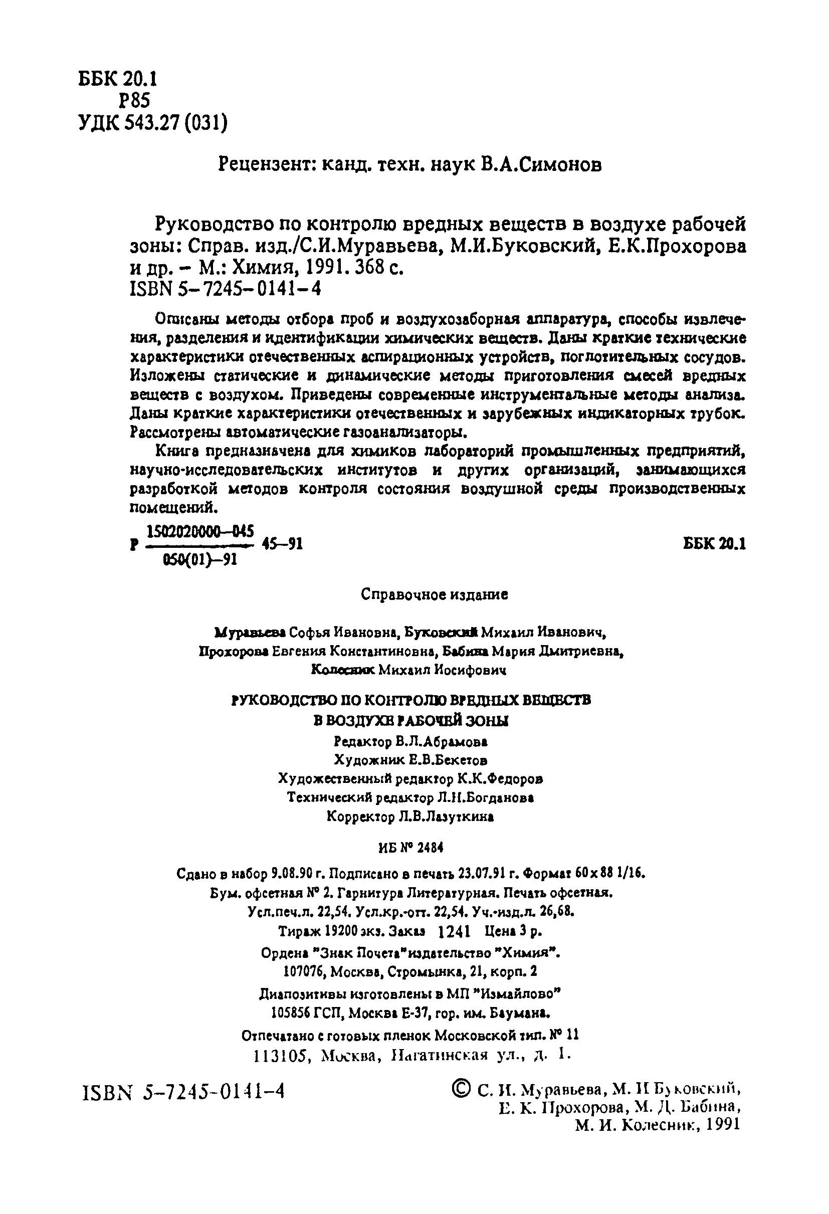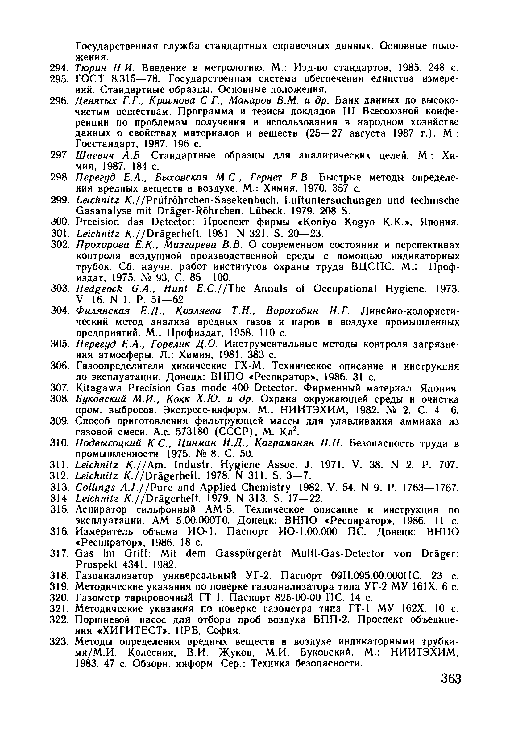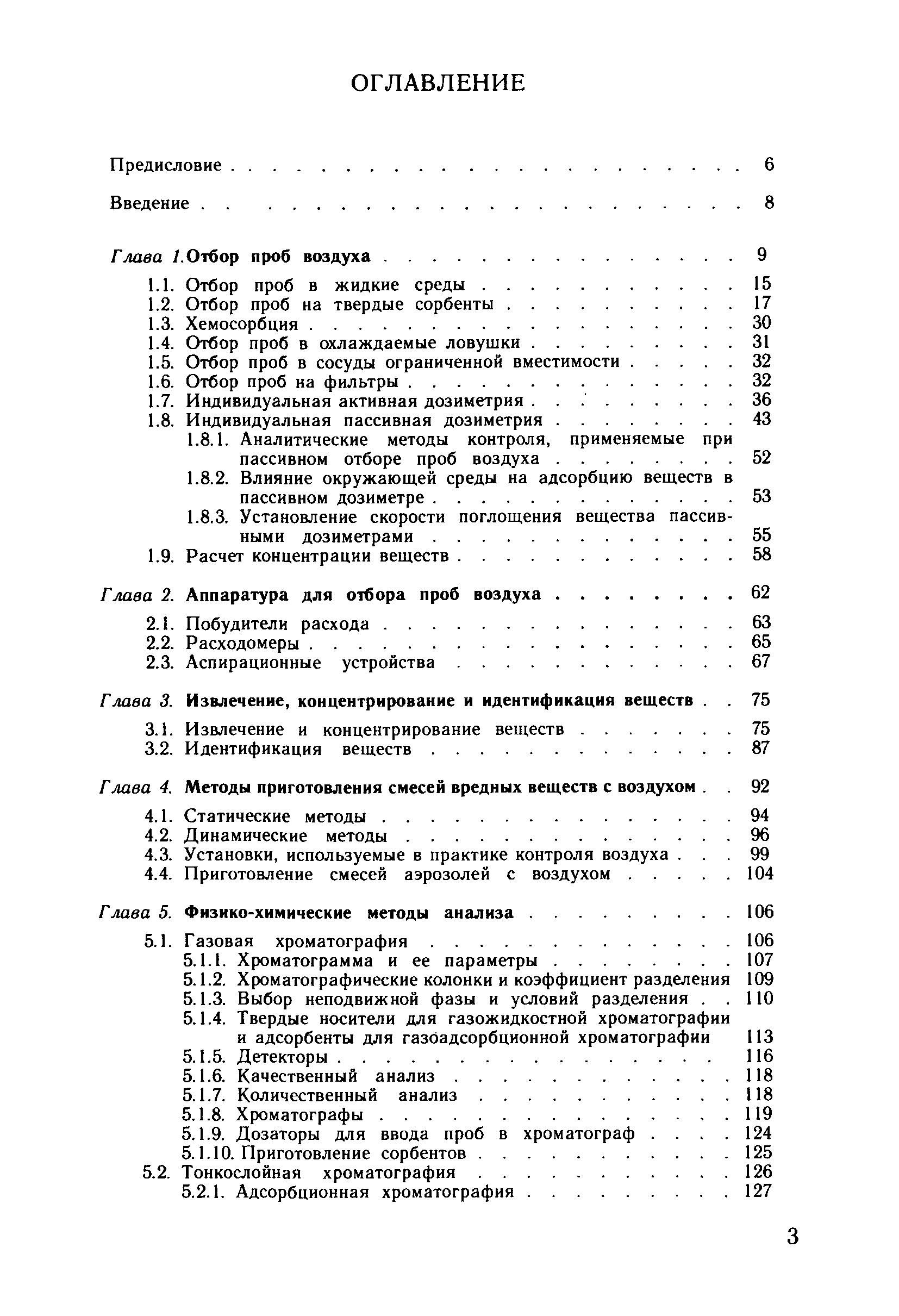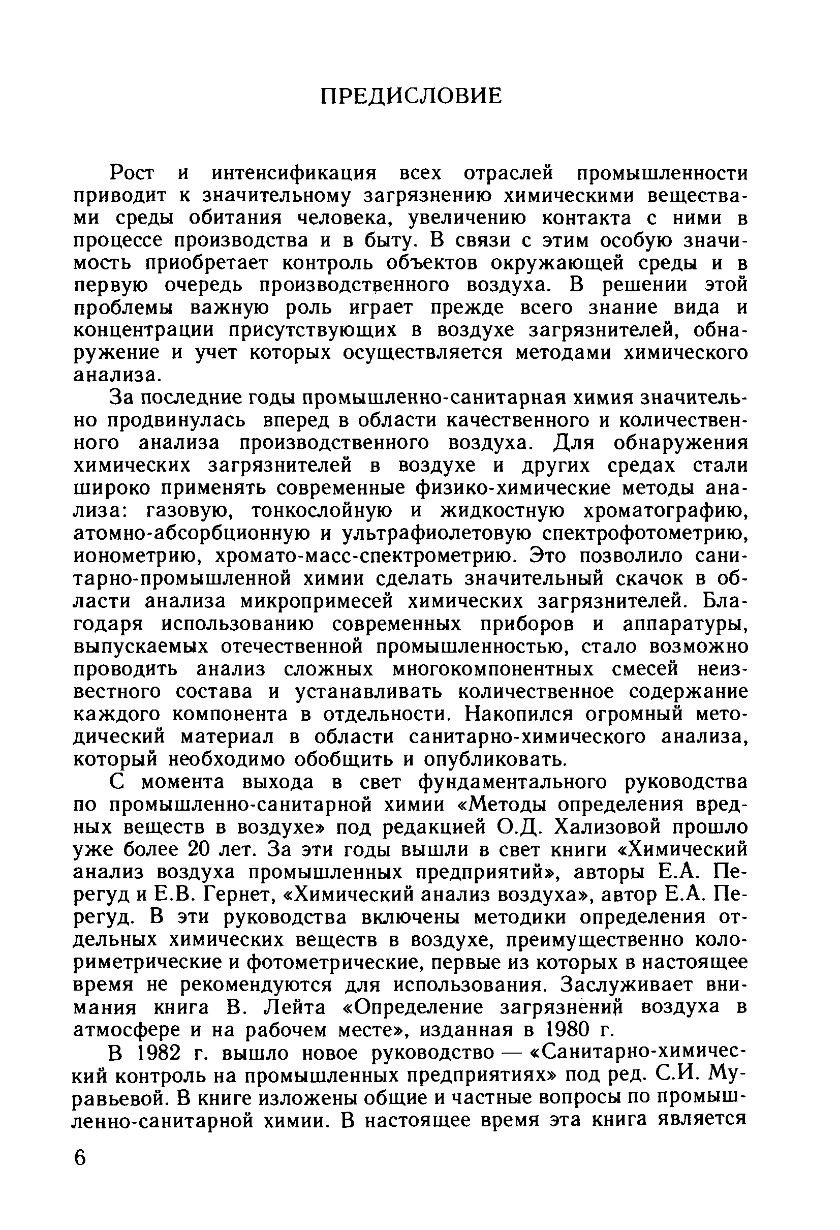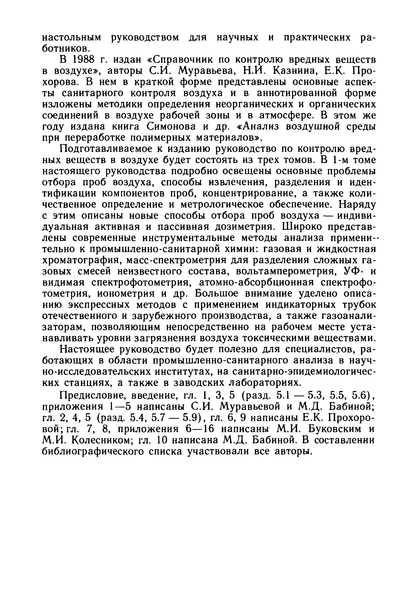 | Оглавление: | Введение Глава 1. Отбор проб воздуха 1.1. Отбор проб в жидкие среды 1.2. Отбор проб на твердые сорбенты 1.3. Хемосорбция 1.4. Отбор проб в охлаждаемые ловушки 1.5. Отбор проб в сосуды ограниченной вместимости 1.6. Отбор проб на фильтры 1.7. Индивидуальная активная дозиметрия 1.8. Индивидуальная пассивная дозиметрия 1.8.1. Аналитические методы контроля, применяемые при пассивном отборе проб воздуха 1.8.2. Влияние окружающей среды на адсорбцию веществ в пассивном дозиметре 1.8.3. Установление скорости поглощения вещества пассивными дозиметрами 1.9. Расчет концентрации веществ Глава 2. Аппаратура для отбора проб воздуха 2.1. Побудители расхода 2.2. Расходомеры 2.3. Аспирационные устройства Глава 3. Извлечение, концентрирование и идентификация веществ 3.1. Извлечение и концентрирование веществ 3.2. Идентификация веществ Глава 4. Методы приготовления смесей вредных веществ с воздухом 4.1. Статические методы 4.2. Динамические методы 4.3. Установки, используемые в практике контроля воздуха 4.4. Приготовление смесей аэрозолей с воздухом Глава 5. Физико-химические методы анализа 5.1. Газовая хроматография 5.1.1. Хроматограмма и ее параметры 5.1.2. Хроматографические колонки и коэффициент разделения 5.1.3. Выбор неподвижной фазы и условий разделения 5.1.4. Твердые носители для газожидкостной хроматографии и адсорбенты для газоадсорбционной хроматографии 5.1.5. Детекторы 5.1.6. Качественный анализ 5.1.7. Количественный анализ 5.1.8. Хроматографы 5.1.9. Дозаторы для ввода проб в хроматограф 5.1.10. Приготовление сорбентов 5.2. Тонкослойная хроматография 5.2.1. Адсорбционная хроматография 5.2.2. Распределительная хроматография 5.2.3. Сорбенты для ТСХ 5.2.4. Пластинки для ТСХ 5.2.5. Процесс разделения веществ на пластинке 5.2.6. Обнаружение веществ на хроматограмме 5.2.7. Количественный анализ 5.2.8. Оборудование для ТСХ 5.3. Жидкостная хроматография 5.4. Ионная хроматография 5.5. Масс-спектрометрия и хромато-масс-спектрометрия 5.6. Фотометрия 5.7. Спектроскопические методы 5.7.1. Атомно-эмиссионная спектрометрия 5.7.2. Атомно-абсорбционная спектрометрия 5.7.3. Атомно-флуоресцентная спектрометрия 5.7.4. Оптико-акустическая спектрометрия 5.8. Вольтамперометрия 5.9. Ионометрия Глава б. Метрологическое обеспечение контроля воздуха Глава 7. Измерение концентрации вредных веществ индикаторными трубками 7.1. Основные принципы работы индикаторных трубок 7.2. Подготовка и проведение измерений индикаторными трубками 7.3. Воздухозаборные устройства для индикаторных трубок 7.3.1. Аспиратор сильфонный АМ-5 7.3.2. Воздухозаборное устройство газоанализатора УГ-2 7.3.3. Ручной поршневой насос Китагавы 7.4. Газоопределители химические ГХ-М 7.5. Газоанализатор универсальный переносной УГ-2 7.5.1. Комплекты индикаторных средств 7.5.2. Подготовка и проведение анализа воздушной среды газоанализатором УГ-2 7.6. Зарубежные средства индикации 7.7. Индикаторные трубки длительного действия для определения среднесменных концентраций вредных веществ в воздухе Глава 8. Автоматический анализ воздушной среды производственных помещений 8.1. Общие сведения 8.2. Автоматические сигнализаторы довзрывоопасных концентраций 8.3. Газоанализаторы вредных веществ в воздухе 8.4. Магнитные и термомагнитные газоанализаторы кислорода 8.5. Общие требования к выбору мест отбора проб воздуха и к установке датчиков автоматических анализаторов контроля воздушной среды 8.