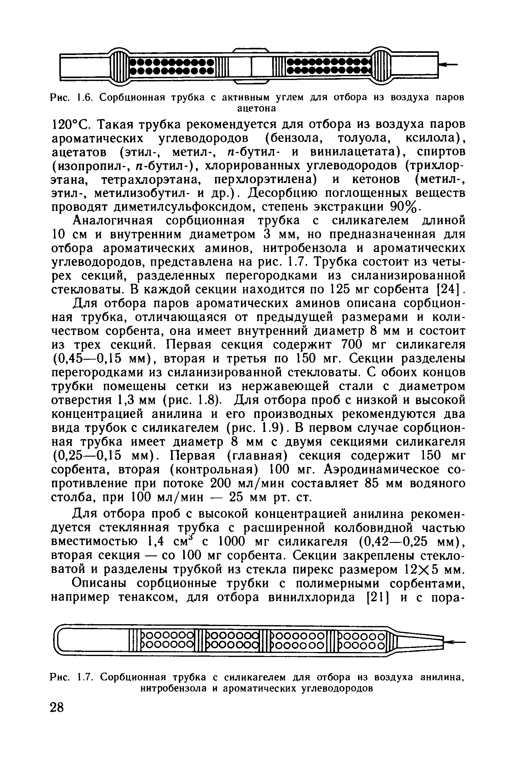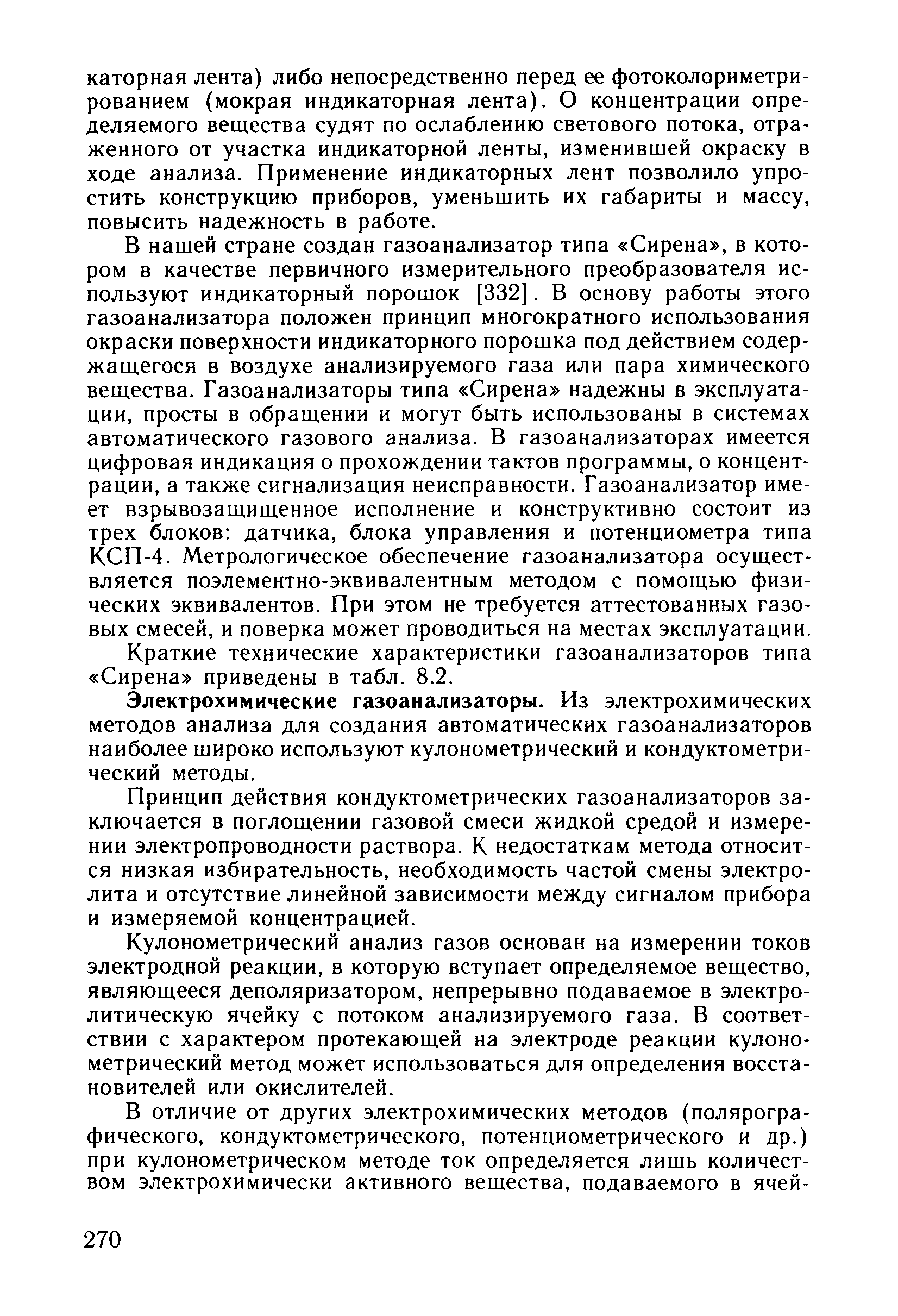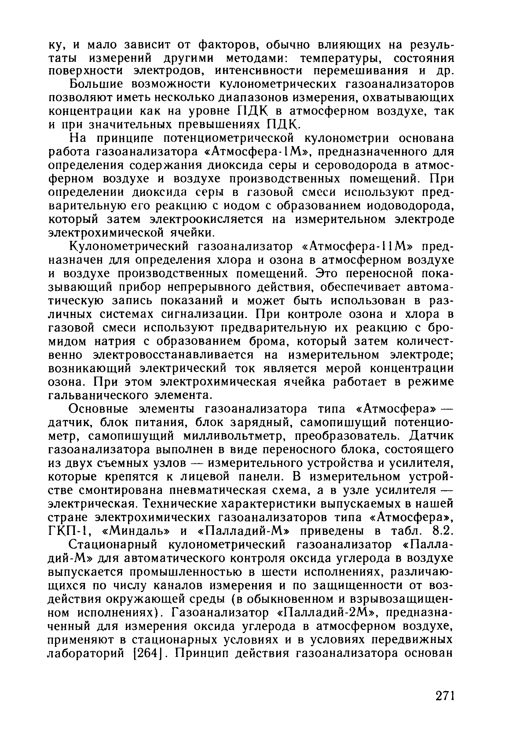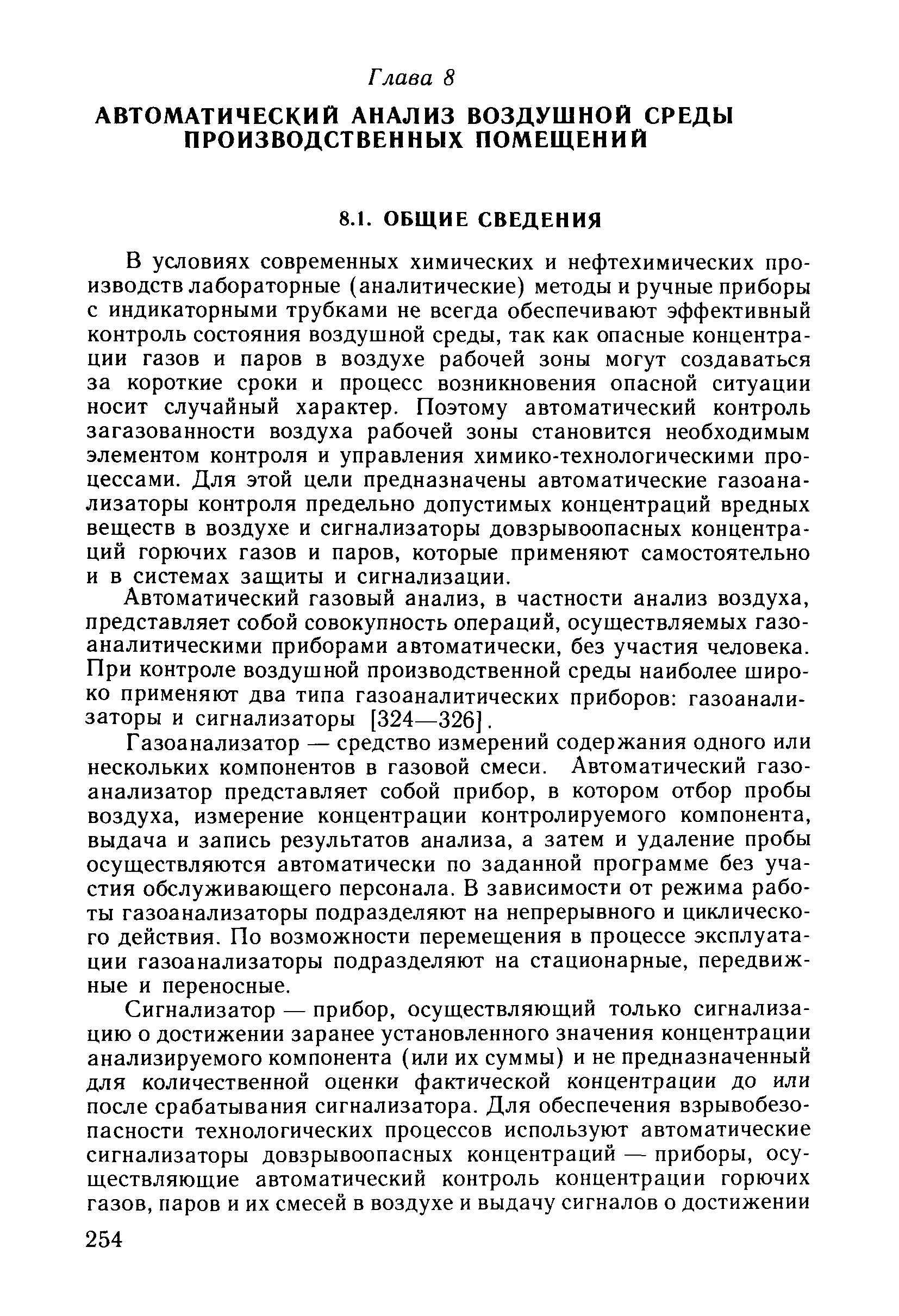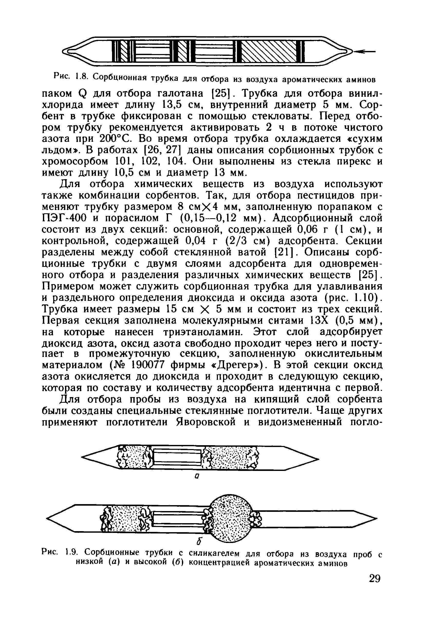| Оглавление: | Введение Глава 1. Отбор проб воздуха 1.1. Отбор проб в жидкие среды 1.2. Отбор проб на твердые сорбенты 1.3. Хемосорбция 1.4. Отбор проб в охлаждаемые ловушки 1.5. Отбор проб в сосуды ограниченной вместимости 1.6. Отбор проб на фильтры 1.7. Индивидуальная активная дозиметрия 1.8. Индивидуальная пассивная дозиметрия 1.8.1. Аналитические методы контроля, применяемые при пассивном отборе проб воздуха 1.8.2. Влияние окружающей среды на адсорбцию веществ в пассивном дозиметре 1.8.3. Установление скорости поглощения вещества пассивными дозиметрами 1.9. Расчет концентрации веществ Глава 2. Аппаратура для отбора проб воздуха 2.1. Побудители расхода 2.2. Расходомеры 2.3. Аспирационные устройства Глава 3. Извлечение, концентрирование и идентификация веществ 3.1. Извлечение и концентрирование веществ 3.2. Идентификация веществ Глава 4. Методы приготовления смесей вредных веществ с воздухом 4.1. Статические методы 4.2. Динамические методы 4.3. Установки, используемые в практике контроля воздуха 4.4. Приготовление смесей аэрозолей с воздухом Глава 5. Физико-химические методы анализа 5.1. Газовая хроматография 5.1.1. Хроматограмма и ее параметры 5.1.2. Хроматографические колонки и коэффициент разделения 5.1.3. Выбор неподвижной фазы и условий разделения 5.1.4. Твердые носители для газожидкостной хроматографии и адсорбенты для газоадсорбционной хроматографии 5.1.5. Детекторы 5.1.6. Качественный анализ 5.1.7. Количественный анализ 5.1.8. Хроматографы 5.1.9. Дозаторы для ввода проб в хроматограф 5.1.10. Приготовление сорбентов 5.2. Тонкослойная хроматография 5.2.1. Адсорбционная хроматография 5.2.2. Распределительная хроматография 5.2.3. Сорбенты для ТСХ 5.2.4. Пластинки для ТСХ 5.2.5. Процесс разделения веществ на пластинке 5.2.6. Обнаружение веществ на хроматограмме 5.2.7. Количественный анализ 5.2.8. Оборудование для ТСХ 5.3. Жидкостная хроматография 5.4. Ионная хроматография 5.5. Масс-спектрометрия и хромато-масс-спектрометрия 5.6. Фотометрия 5.7. Спектроскопические методы 5.7.1. Атомно-эмиссионная спектрометрия 5.7.2. Атомно-абсорбционная спектрометрия 5.7.3. Атомно-флуоресцентная спектрометрия 5.7.4. Оптико-акустическая спектрометрия 5.8. Вольтамперометрия 5.9. Ионометрия Глава б. Метрологическое обеспечение контроля воздуха Глава 7. Измерение концентрации вредных веществ индикаторными трубками 7.1. Основные принципы работы индикаторных трубок 7.2. Подготовка и проведение измерений индикаторными трубками 7.3. Воздухозаборные устройства для индикаторных трубок 7.3.1. Аспиратор сильфонный АМ-5 7.3.2. Воздухозаборное устройство газоанализатора УГ-2 7.3.3. Ручной поршневой насос Китагавы 7.4. Газоопределители химические ГХ-М 7.5. Газоанализатор универсальный переносной УГ-2 7.5.1. Комплекты индикаторных средств 7.5.2. Подготовка и проведение анализа воздушной среды газоанализатором УГ-2 7.6. Зарубежные средства индикации 7.7. Индикаторные трубки длительного действия для определения среднесменных концентраций вредных веществ в воздухе Глава 8. Автоматический анализ воздушной среды производственных помещений 8.1. Общие сведения 8.2. Автоматические сигнализаторы довзрывоопасных концентраций 8.3. Газоанализаторы вредных веществ в воздухе 8.4. Магнитные и термомагнитные газоанализаторы кислорода 8.5. Общие требования к выбору мест отбора проб воздуха и к установке датчиков автоматических анализаторов контроля воздушной среды 8.