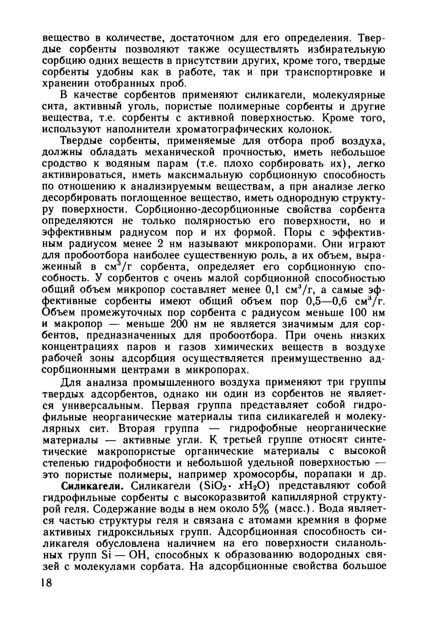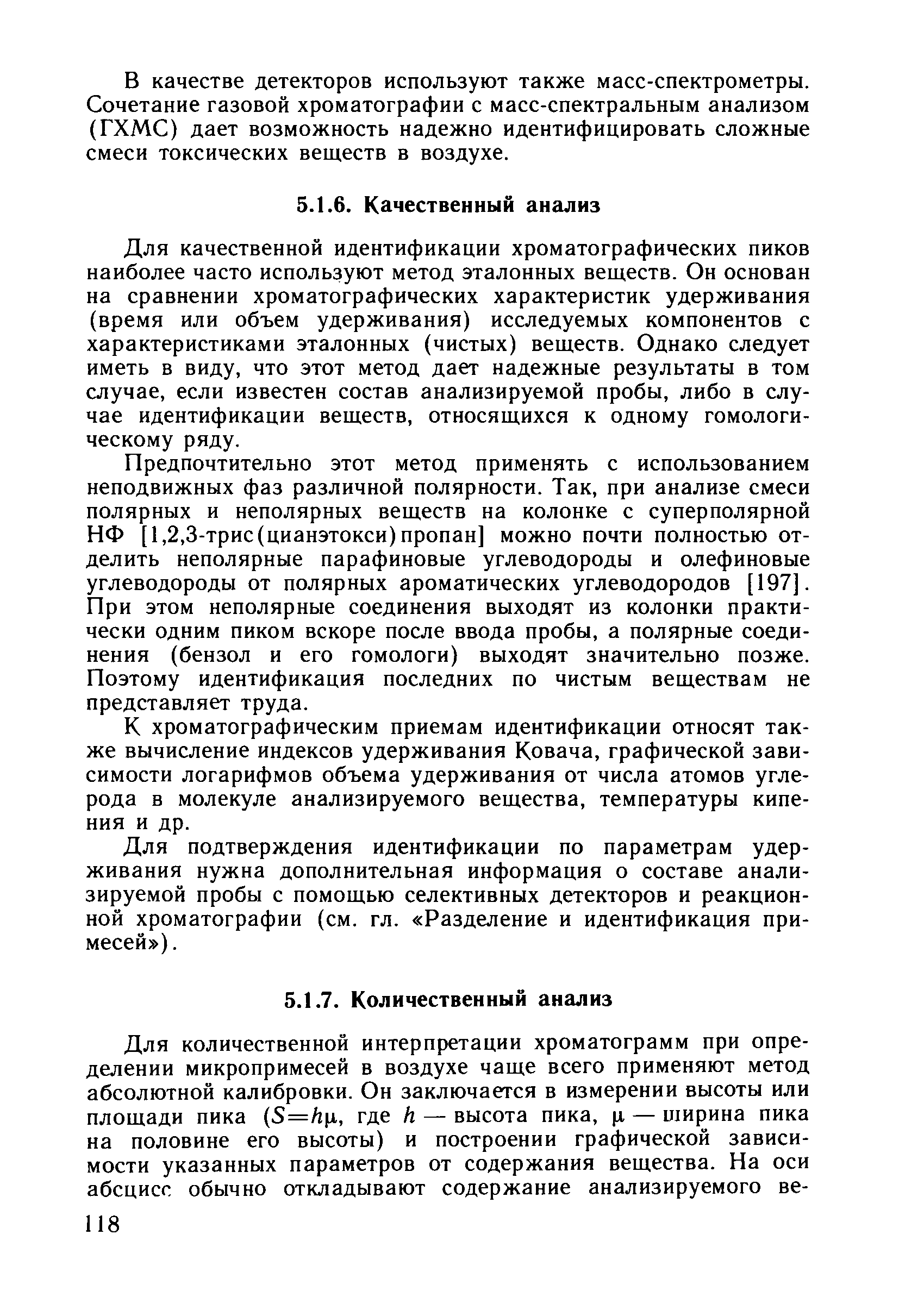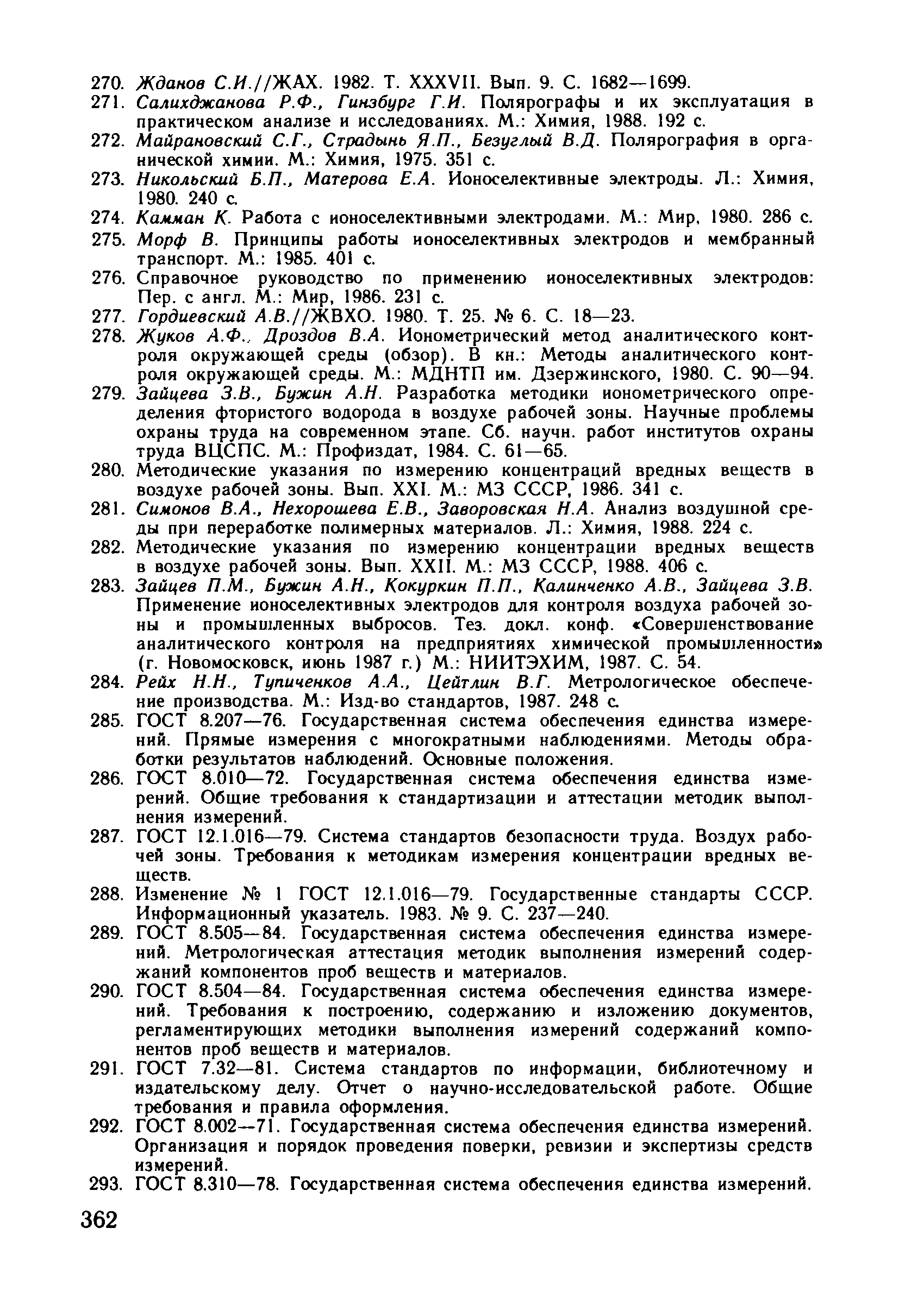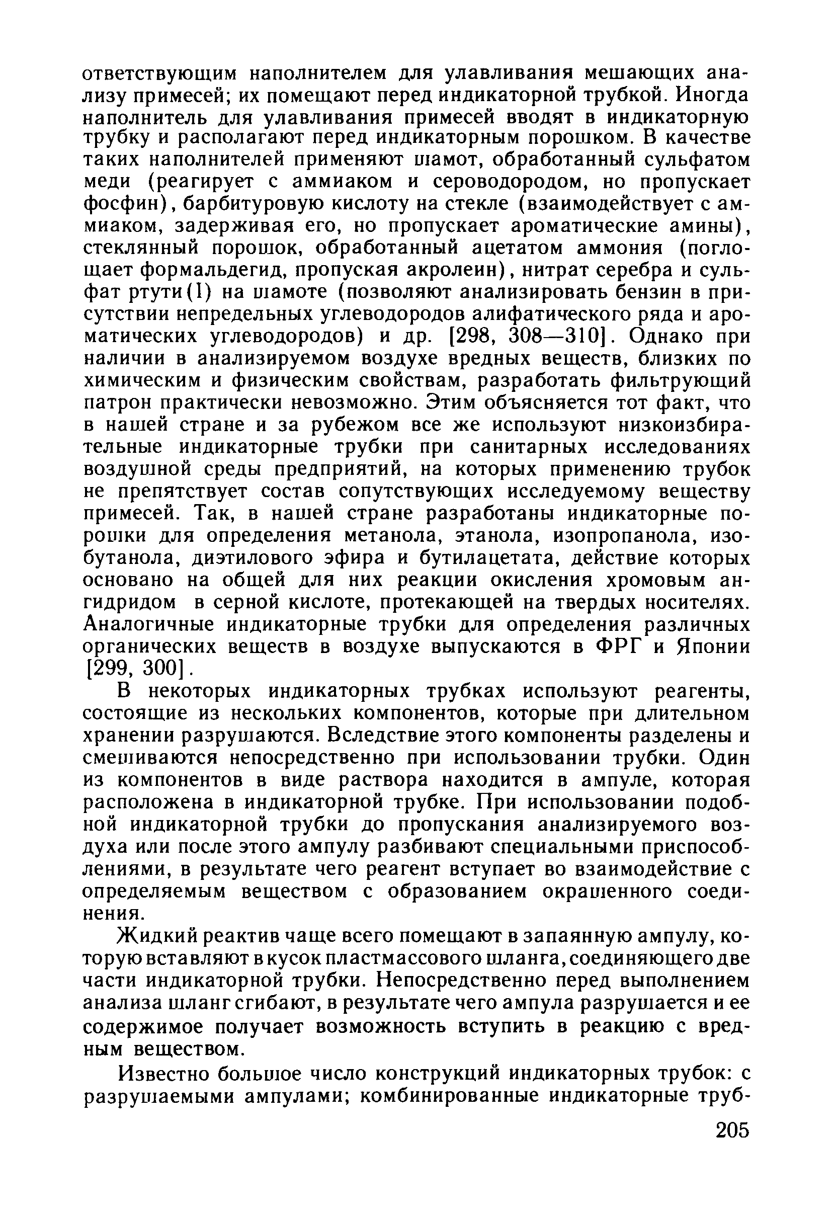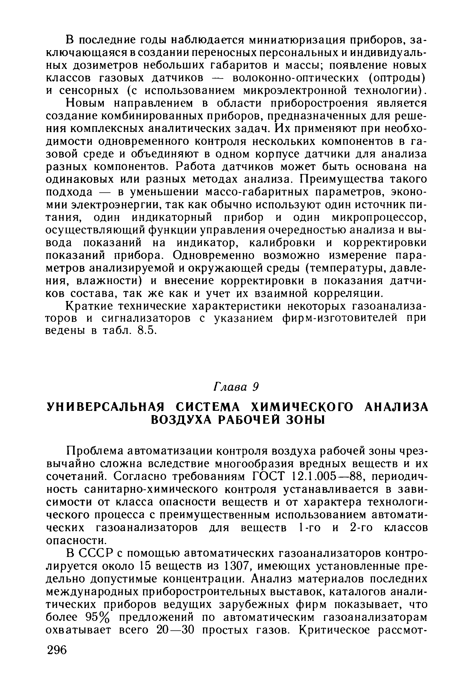 | Оглавление: | Введение Глава 1. Отбор проб воздуха 1.1. Отбор проб в жидкие среды 1.2. Отбор проб на твердые сорбенты 1.3. Хемосорбция 1.4. Отбор проб в охлаждаемые ловушки 1.5. Отбор проб в сосуды ограниченной вместимости 1.6. Отбор проб на фильтры 1.7. Индивидуальная активная дозиметрия 1.8. Индивидуальная пассивная дозиметрия 1.8.1. Аналитические методы контроля, применяемые при пассивном отборе проб воздуха 1.8.2. Влияние окружающей среды на адсорбцию веществ в пассивном дозиметре 1.8.3. Установление скорости поглощения вещества пассивными дозиметрами 1.9. Расчет концентрации веществ Глава 2. Аппаратура для отбора проб воздуха 2.1. Побудители расхода 2.2. Расходомеры 2.3. Аспирационные устройства Глава 3. Извлечение, концентрирование и идентификация веществ 3.1. Извлечение и концентрирование веществ 3.2. Идентификация веществ Глава 4. Методы приготовления смесей вредных веществ с воздухом 4.1. Статические методы 4.2. Динамические методы 4.3. Установки, используемые в практике контроля воздуха 4.4. Приготовление смесей аэрозолей с воздухом Глава 5. Физико-химические методы анализа 5.1. Газовая хроматография 5.1.1. Хроматограмма и ее параметры 5.1.2. Хроматографические колонки и коэффициент разделения 5.1.3. Выбор неподвижной фазы и условий разделения 5.1.4. Твердые носители для газожидкостной хроматографии и адсорбенты для газоадсорбционной хроматографии 5.1.5. Детекторы 5.1.6. Качественный анализ 5.1.7. Количественный анализ 5.1.8. Хроматографы 5.1.9. Дозаторы для ввода проб в хроматограф 5.1.10. Приготовление сорбентов 5.2. Тонкослойная хроматография 5.2.1. Адсорбционная хроматография 5.2.2. Распределительная хроматография 5.2.3. Сорбенты для ТСХ 5.2.4. Пластинки для ТСХ 5.2.5. Процесс разделения веществ на пластинке 5.2.6. Обнаружение веществ на хроматограмме 5.2.7. Количественный анализ 5.2.8. Оборудование для ТСХ 5.3. Жидкостная хроматография 5.4. Ионная хроматография 5.5. Масс-спектрометрия и хромато-масс-спектрометрия 5.6. Фотометрия 5.7. Спектроскопические методы 5.7.1. Атомно-эмиссионная спектрометрия 5.7.2. Атомно-абсорбционная спектрометрия 5.7.3. Атомно-флуоресцентная спектрометрия 5.7.4. Оптико-акустическая спектрометрия 5.8. Вольтамперометрия 5.9. Ионометрия Глава б. Метрологическое обеспечение контроля воздуха Глава 7. Измерение концентрации вредных веществ индикаторными трубками 7.1. Основные принципы работы индикаторных трубок 7.2. Подготовка и проведение измерений индикаторными трубками 7.3. Воздухозаборные устройства для индикаторных трубок 7.3.1. Аспиратор сильфонный АМ-5 7.3.2. Воздухозаборное устройство газоанализатора УГ-2 7.3.3. Ручной поршневой насос Китагавы 7.4. Газоопределители химические ГХ-М 7.5. Газоанализатор универсальный переносной УГ-2 7.5.1. Комплекты индикаторных средств 7.5.2. Подготовка и проведение анализа воздушной среды газоанализатором УГ-2 7.6. Зарубежные средства индикации 7.7. Индикаторные трубки длительного действия для определения среднесменных концентраций вредных веществ в воздухе Глава 8. Автоматический анализ воздушной среды производственных помещений 8.1. Общие сведения 8.2. Автоматические сигнализаторы довзрывоопасных концентраций 8.3. Газоанализаторы вредных веществ в воздухе 8.4. Магнитные и термомагнитные газоанализаторы кислорода 8.5. Общие требования к выбору мест отбора проб воздуха и к установке датчиков автоматических анализаторов контроля воздушной среды 8.