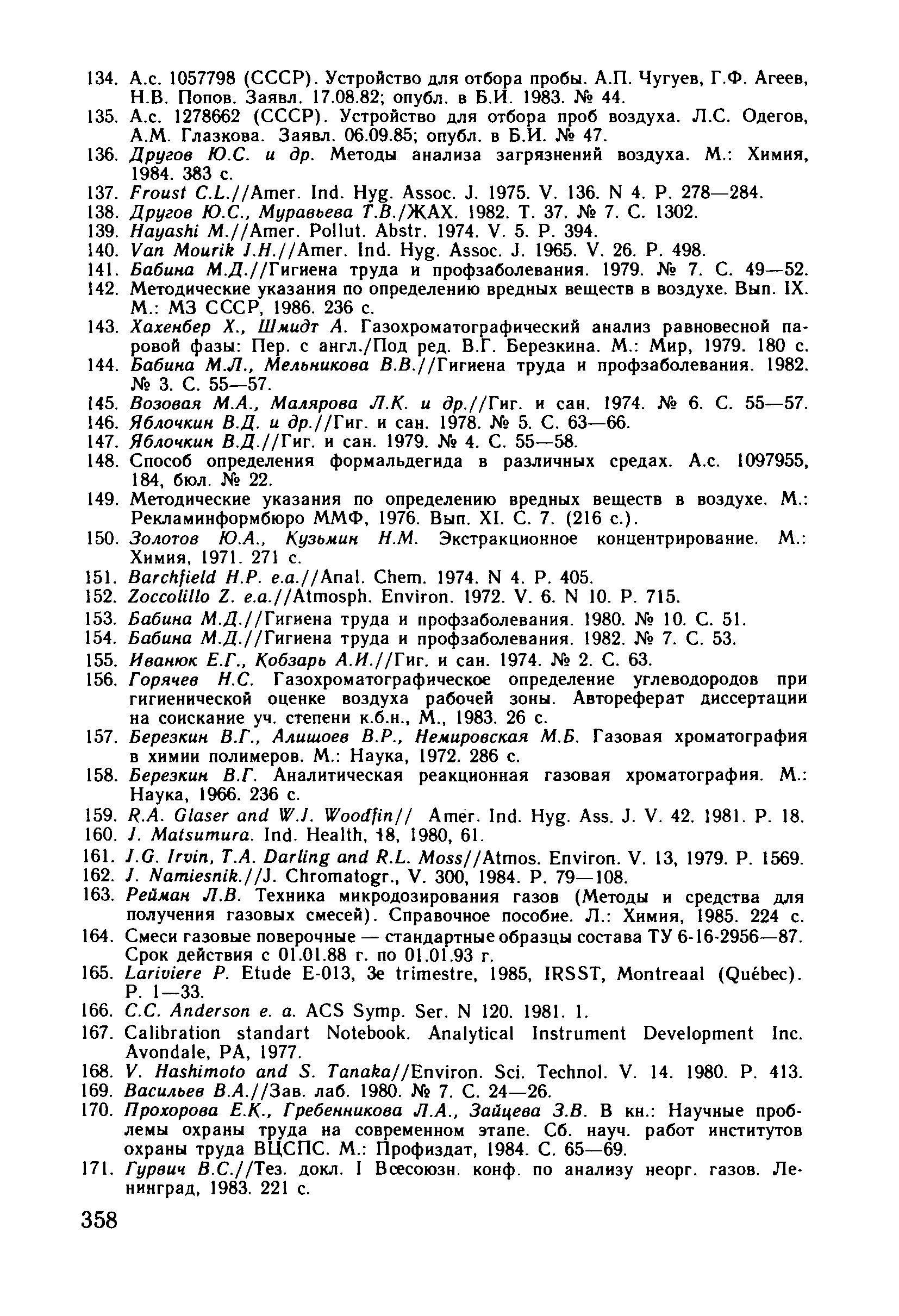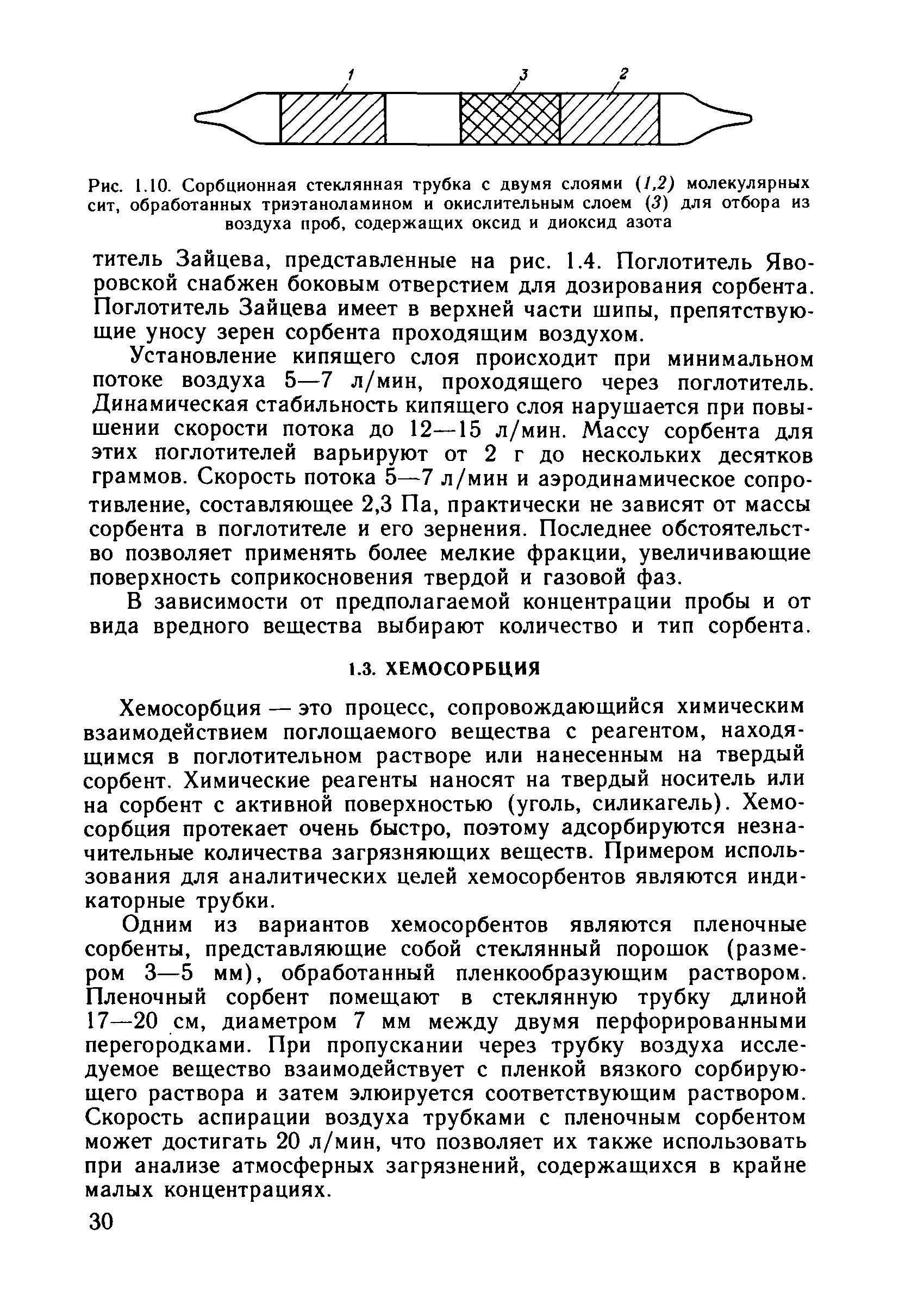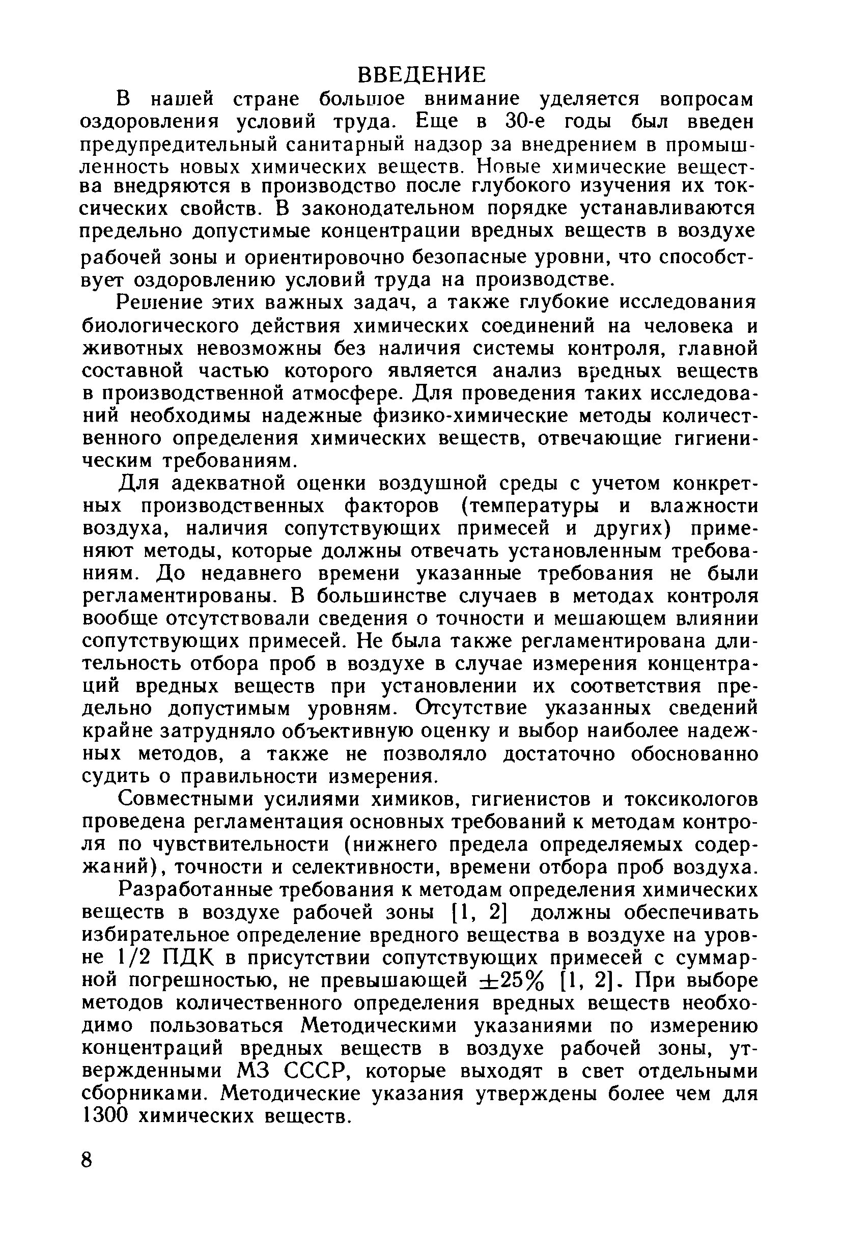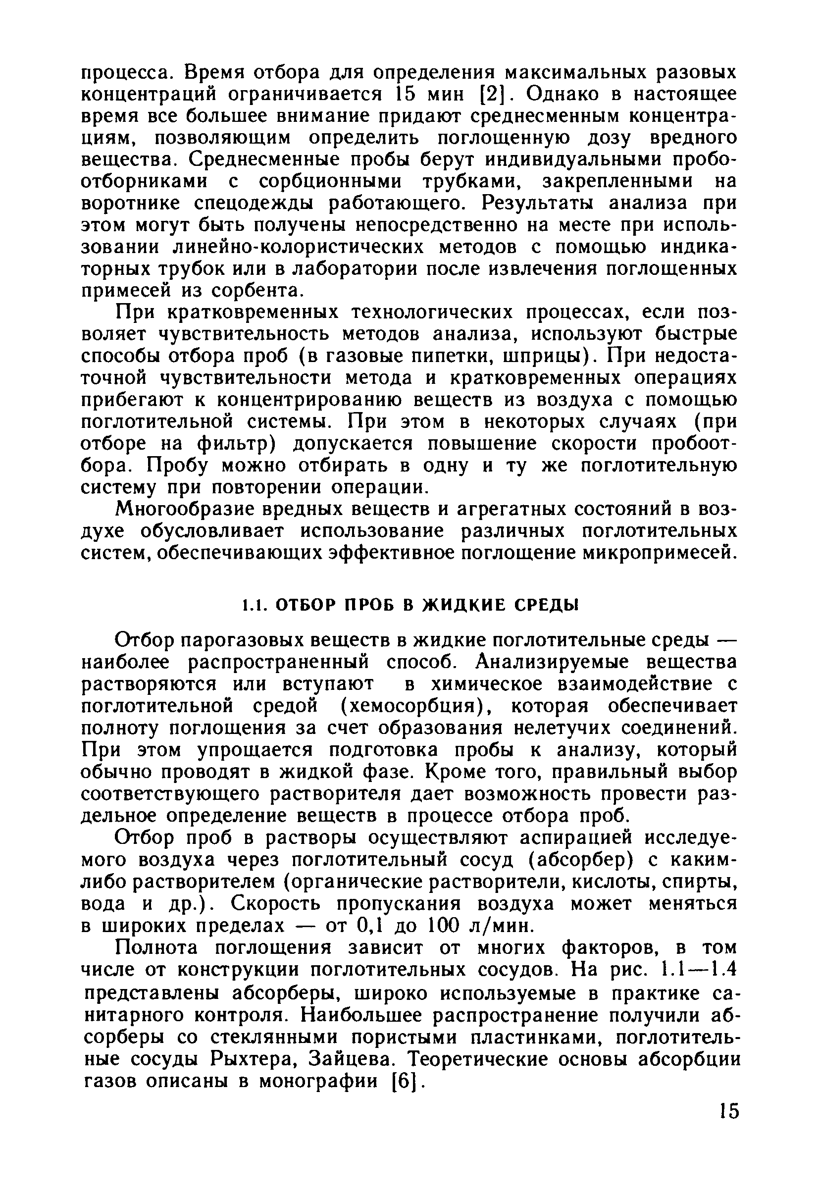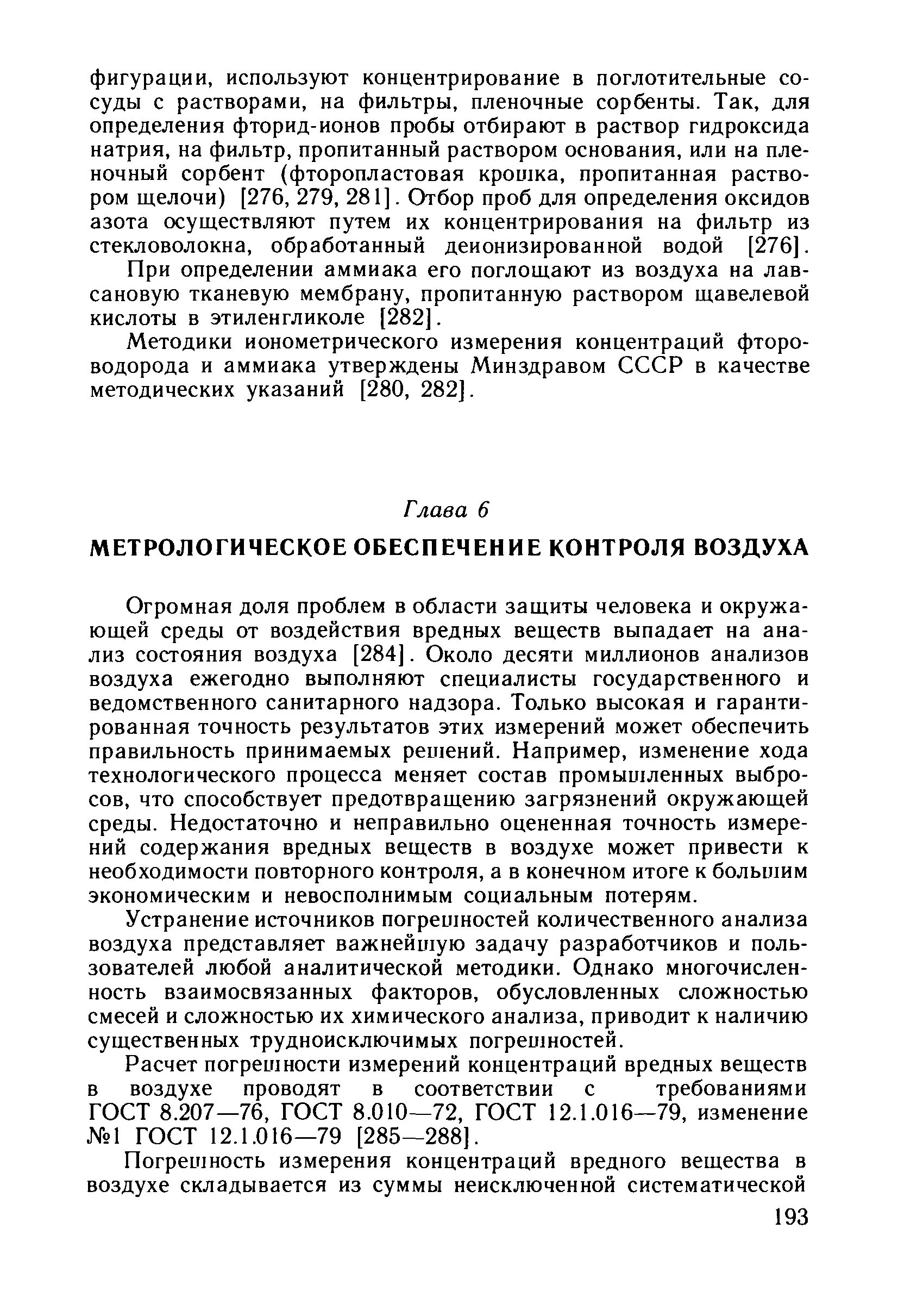 | Оглавление: | Введение Глава 1. Отбор проб воздуха 1.1. Отбор проб в жидкие среды 1.2. Отбор проб на твердые сорбенты 1.3. Хемосорбция 1.4. Отбор проб в охлаждаемые ловушки 1.5. Отбор проб в сосуды ограниченной вместимости 1.6. Отбор проб на фильтры 1.7. Индивидуальная активная дозиметрия 1.8. Индивидуальная пассивная дозиметрия 1.8.1. Аналитические методы контроля, применяемые при пассивном отборе проб воздуха 1.8.2. Влияние окружающей среды на адсорбцию веществ в пассивном дозиметре 1.8.3. Установление скорости поглощения вещества пассивными дозиметрами 1.9. Расчет концентрации веществ Глава 2. Аппаратура для отбора проб воздуха 2.1. Побудители расхода 2.2. Расходомеры 2.3. Аспирационные устройства Глава 3. Извлечение, концентрирование и идентификация веществ 3.1. Извлечение и концентрирование веществ 3.2. Идентификация веществ Глава 4. Методы приготовления смесей вредных веществ с воздухом 4.1. Статические методы 4.2. Динамические методы 4.3. Установки, используемые в практике контроля воздуха 4.4. Приготовление смесей аэрозолей с воздухом Глава 5. Физико-химические методы анализа 5.1. Газовая хроматография 5.1.1. Хроматограмма и ее параметры 5.1.2. Хроматографические колонки и коэффициент разделения 5.1.3. Выбор неподвижной фазы и условий разделения 5.1.4. Твердые носители для газожидкостной хроматографии и адсорбенты для газоадсорбционной хроматографии 5.1.5. Детекторы 5.1.6. Качественный анализ 5.1.7. Количественный анализ 5.1.8. Хроматографы 5.1.9. Дозаторы для ввода проб в хроматограф 5.1.10. Приготовление сорбентов 5.2. Тонкослойная хроматография 5.2.1. Адсорбционная хроматография 5.2.2. Распределительная хроматография 5.2.3. Сорбенты для ТСХ 5.2.4. Пластинки для ТСХ 5.2.5. Процесс разделения веществ на пластинке 5.2.6. Обнаружение веществ на хроматограмме 5.2.7. Количественный анализ 5.2.8. Оборудование для ТСХ 5.3. Жидкостная хроматография 5.4. Ионная хроматография 5.5. Масс-спектрометрия и хромато-масс-спектрометрия 5.6. Фотометрия 5.7. Спектроскопические методы 5.7.1. Атомно-эмиссионная спектрометрия 5.7.2. Атомно-абсорбционная спектрометрия 5.7.3. Атомно-флуоресцентная спектрометрия 5.7.4. Оптико-акустическая спектрометрия 5.8. Вольтамперометрия 5.9. Ионометрия Глава б. Метрологическое обеспечение контроля воздуха Глава 7. Измерение концентрации вредных веществ индикаторными трубками 7.1. Основные принципы работы индикаторных трубок 7.2. Подготовка и проведение измерений индикаторными трубками 7.3. Воздухозаборные устройства для индикаторных трубок 7.3.1. Аспиратор сильфонный АМ-5 7.3.2. Воздухозаборное устройство газоанализатора УГ-2 7.3.3. Ручной поршневой насос Китагавы 7.4. Газоопределители химические ГХ-М 7.5. Газоанализатор универсальный переносной УГ-2 7.5.1. Комплекты индикаторных средств 7.5.2. Подготовка и проведение анализа воздушной среды газоанализатором УГ-2 7.6. Зарубежные средства индикации 7.7. Индикаторные трубки длительного действия для определения среднесменных концентраций вредных веществ в воздухе Глава 8. Автоматический анализ воздушной среды производственных помещений 8.1. Общие сведения 8.2. Автоматические сигнализаторы довзрывоопасных концентраций 8.3. Газоанализаторы вредных веществ в воздухе 8.4. Магнитные и термомагнитные газоанализаторы кислорода 8.5. Общие требования к выбору мест отбора проб воздуха и к установке датчиков автоматических анализаторов контроля воздушной среды 8.
