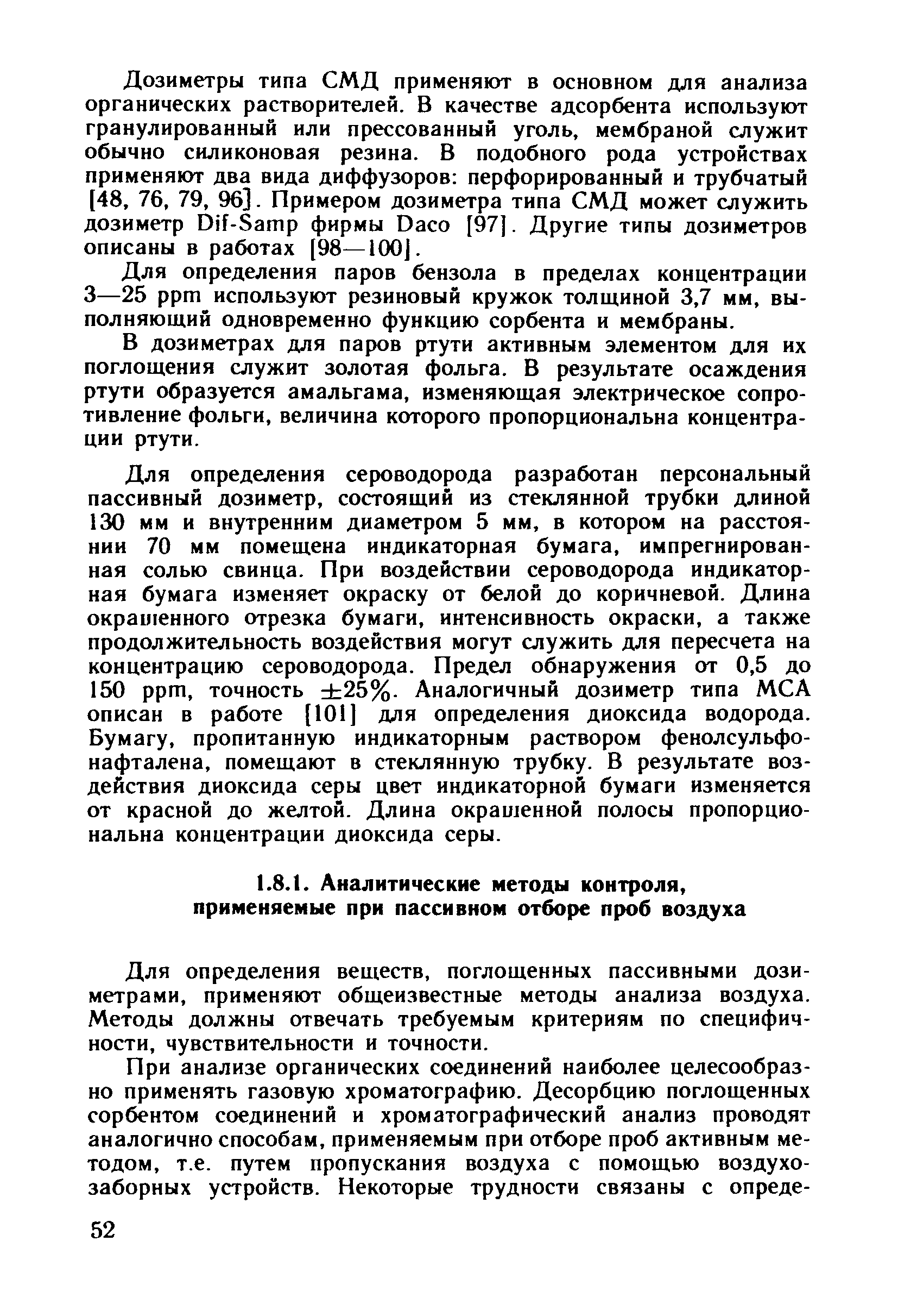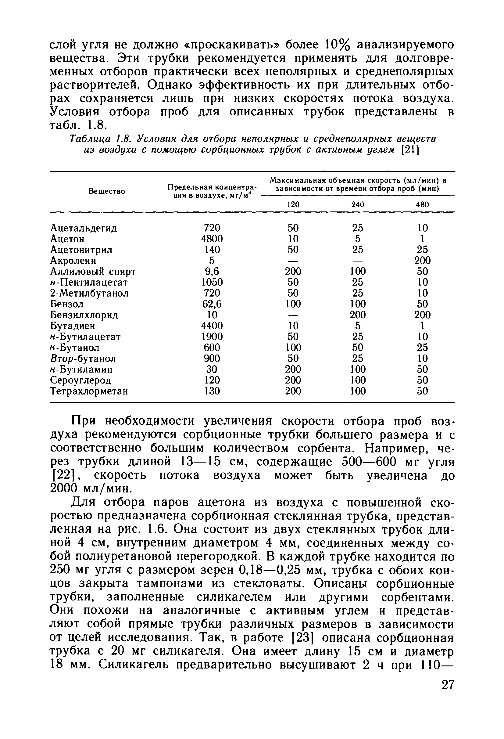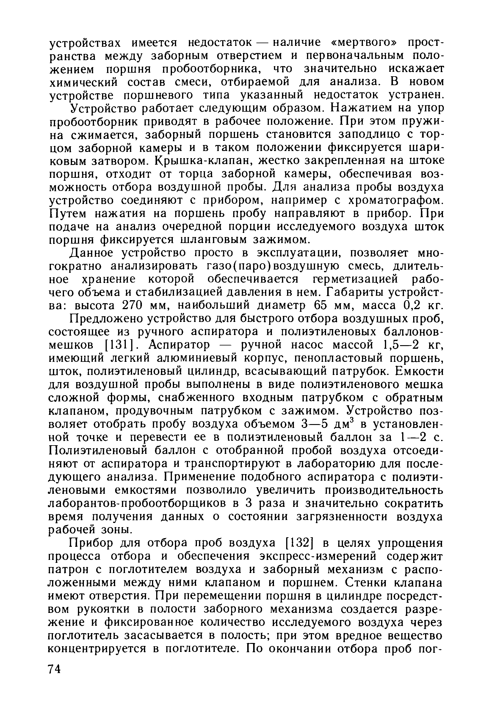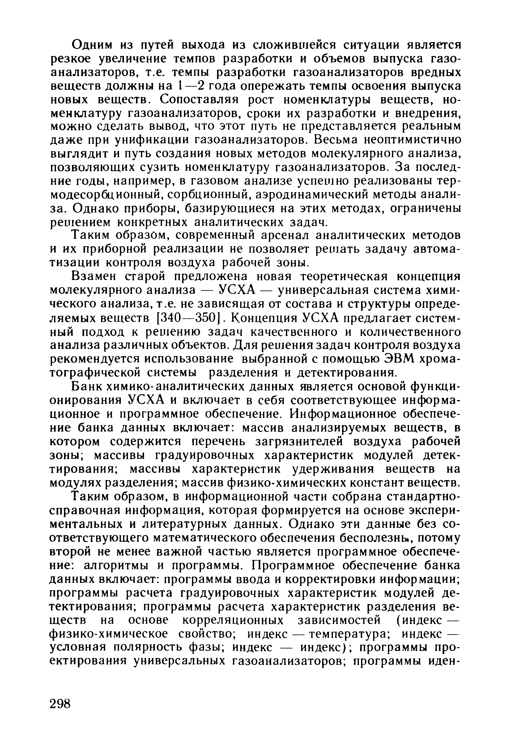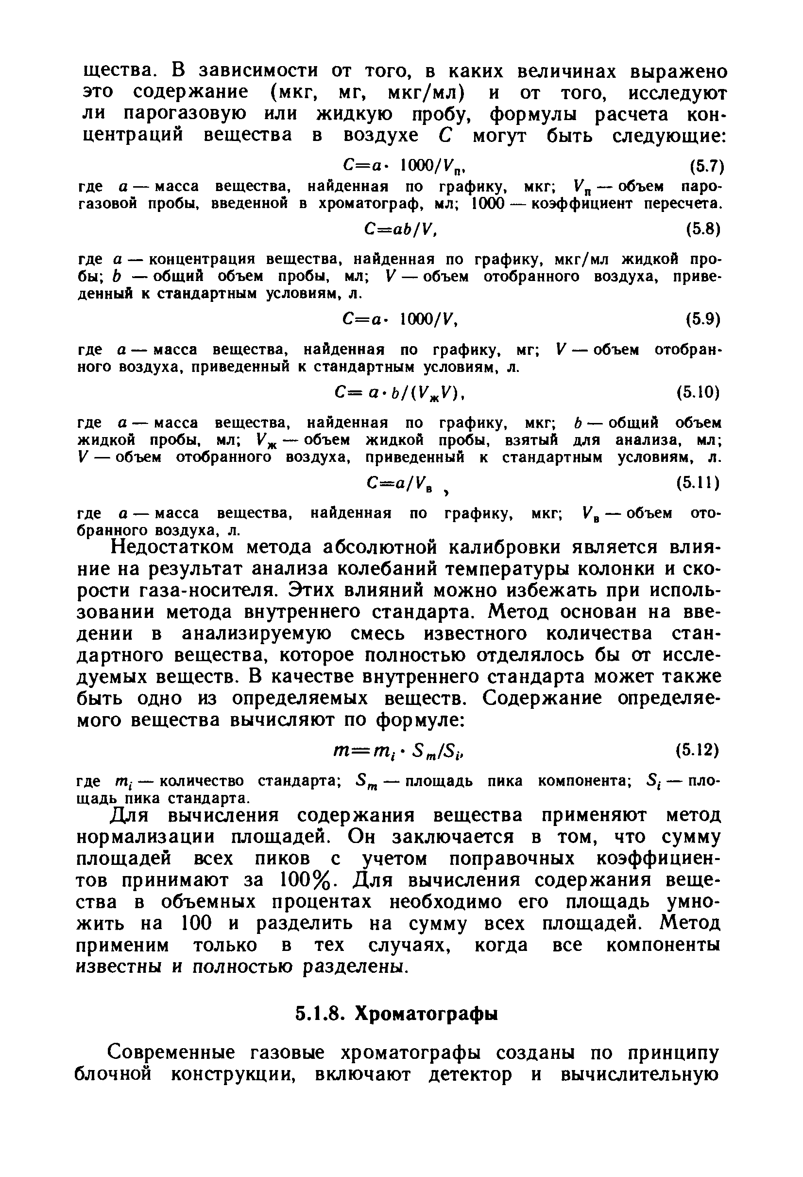 | Оглавление: | Введение Глава 1. Отбор проб воздуха 1.1. Отбор проб в жидкие среды 1.2. Отбор проб на твердые сорбенты 1.3. Хемосорбция 1.4. Отбор проб в охлаждаемые ловушки 1.5. Отбор проб в сосуды ограниченной вместимости 1.6. Отбор проб на фильтры 1.7. Индивидуальная активная дозиметрия 1.8. Индивидуальная пассивная дозиметрия 1.8.1. Аналитические методы контроля, применяемые при пассивном отборе проб воздуха 1.8.2. Влияние окружающей среды на адсорбцию веществ в пассивном дозиметре 1.8.3. Установление скорости поглощения вещества пассивными дозиметрами 1.9. Расчет концентрации веществ Глава 2. Аппаратура для отбора проб воздуха 2.1. Побудители расхода 2.2. Расходомеры 2.3. Аспирационные устройства Глава 3. Извлечение, концентрирование и идентификация веществ 3.1. Извлечение и концентрирование веществ 3.2. Идентификация веществ Глава 4. Методы приготовления смесей вредных веществ с воздухом 4.1. Статические методы 4.2. Динамические методы 4.3. Установки, используемые в практике контроля воздуха 4.4. Приготовление смесей аэрозолей с воздухом Глава 5. Физико-химические методы анализа 5.1. Газовая хроматография 5.1.1. Хроматограмма и ее параметры 5.1.2. Хроматографические колонки и коэффициент разделения 5.1.3. Выбор неподвижной фазы и условий разделения 5.1.4. Твердые носители для газожидкостной хроматографии и адсорбенты для газоадсорбционной хроматографии 5.1.5. Детекторы 5.1.6. Качественный анализ 5.1.7. Количественный анализ 5.1.8. Хроматографы 5.1.9. Дозаторы для ввода проб в хроматограф 5.1.10. Приготовление сорбентов 5.2. Тонкослойная хроматография 5.2.1. Адсорбционная хроматография 5.2.2. Распределительная хроматография 5.2.3. Сорбенты для ТСХ 5.2.4. Пластинки для ТСХ 5.2.5. Процесс разделения веществ на пластинке 5.2.6. Обнаружение веществ на хроматограмме 5.2.7. Количественный анализ 5.2.8. Оборудование для ТСХ 5.3. Жидкостная хроматография 5.4. Ионная хроматография 5.5. Масс-спектрометрия и хромато-масс-спектрометрия 5.6. Фотометрия 5.7. Спектроскопические методы 5.7.1. Атомно-эмиссионная спектрометрия 5.7.2. Атомно-абсорбционная спектрометрия 5.7.3. Атомно-флуоресцентная спектрометрия 5.7.4. Оптико-акустическая спектрометрия 5.8. Вольтамперометрия 5.9. Ионометрия Глава б. Метрологическое обеспечение контроля воздуха Глава 7. Измерение концентрации вредных веществ индикаторными трубками 7.1. Основные принципы работы индикаторных трубок 7.2. Подготовка и проведение измерений индикаторными трубками 7.3. Воздухозаборные устройства для индикаторных трубок 7.3.1. Аспиратор сильфонный АМ-5 7.3.2. Воздухозаборное устройство газоанализатора УГ-2 7.3.3. Ручной поршневой насос Китагавы 7.4. Газоопределители химические ГХ-М 7.5. Газоанализатор универсальный переносной УГ-2 7.5.1. Комплекты индикаторных средств 7.5.2. Подготовка и проведение анализа воздушной среды газоанализатором УГ-2 7.6. Зарубежные средства индикации 7.7. Индикаторные трубки длительного действия для определения среднесменных концентраций вредных веществ в воздухе Глава 8. Автоматический анализ воздушной среды производственных помещений 8.1. Общие сведения 8.2. Автоматические сигнализаторы довзрывоопасных концентраций 8.3. Газоанализаторы вредных веществ в воздухе 8.4. Магнитные и термомагнитные газоанализаторы кислорода 8.5. Общие требования к выбору мест отбора проб воздуха и к установке датчиков автоматических анализаторов контроля воздушной среды 8.