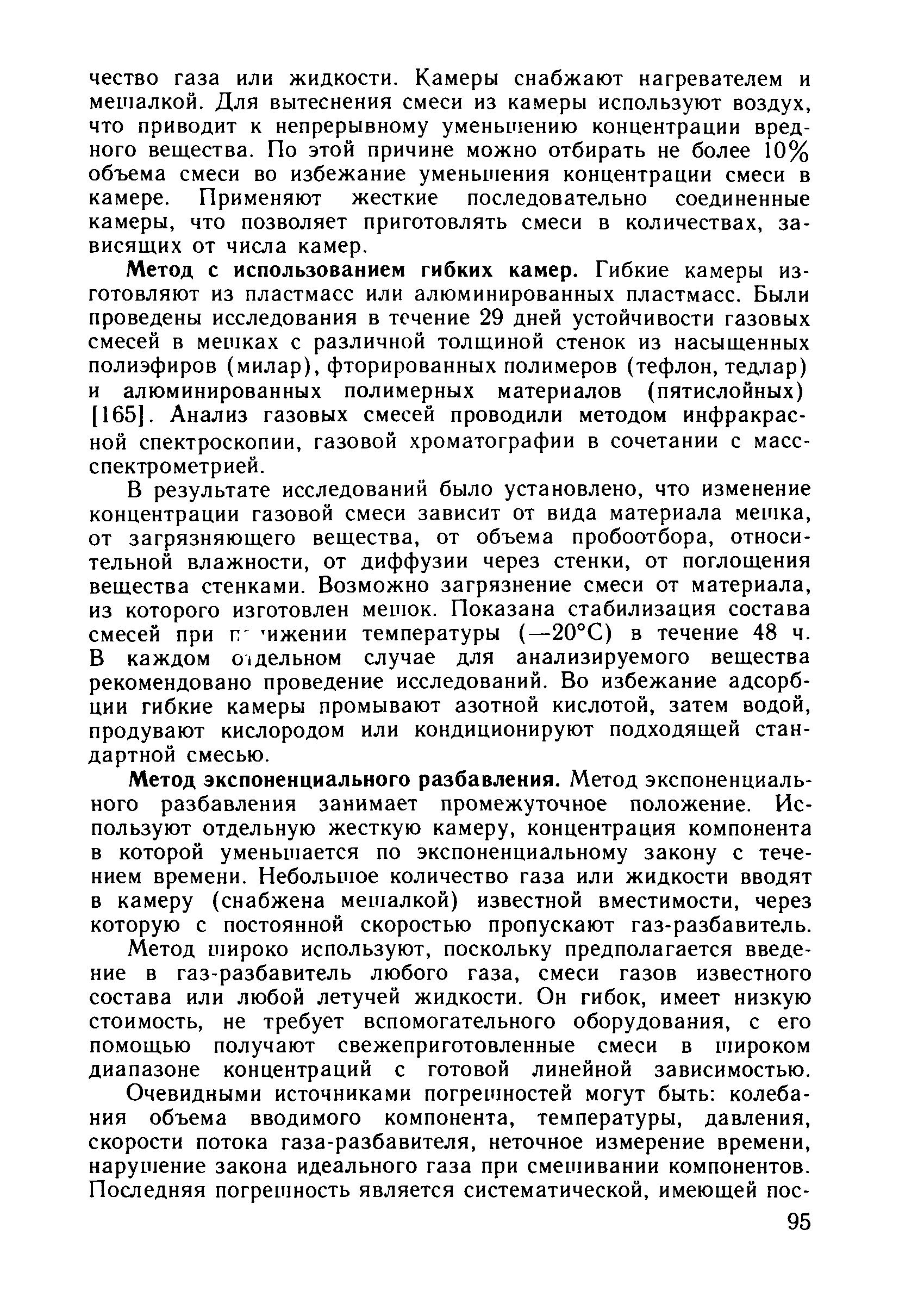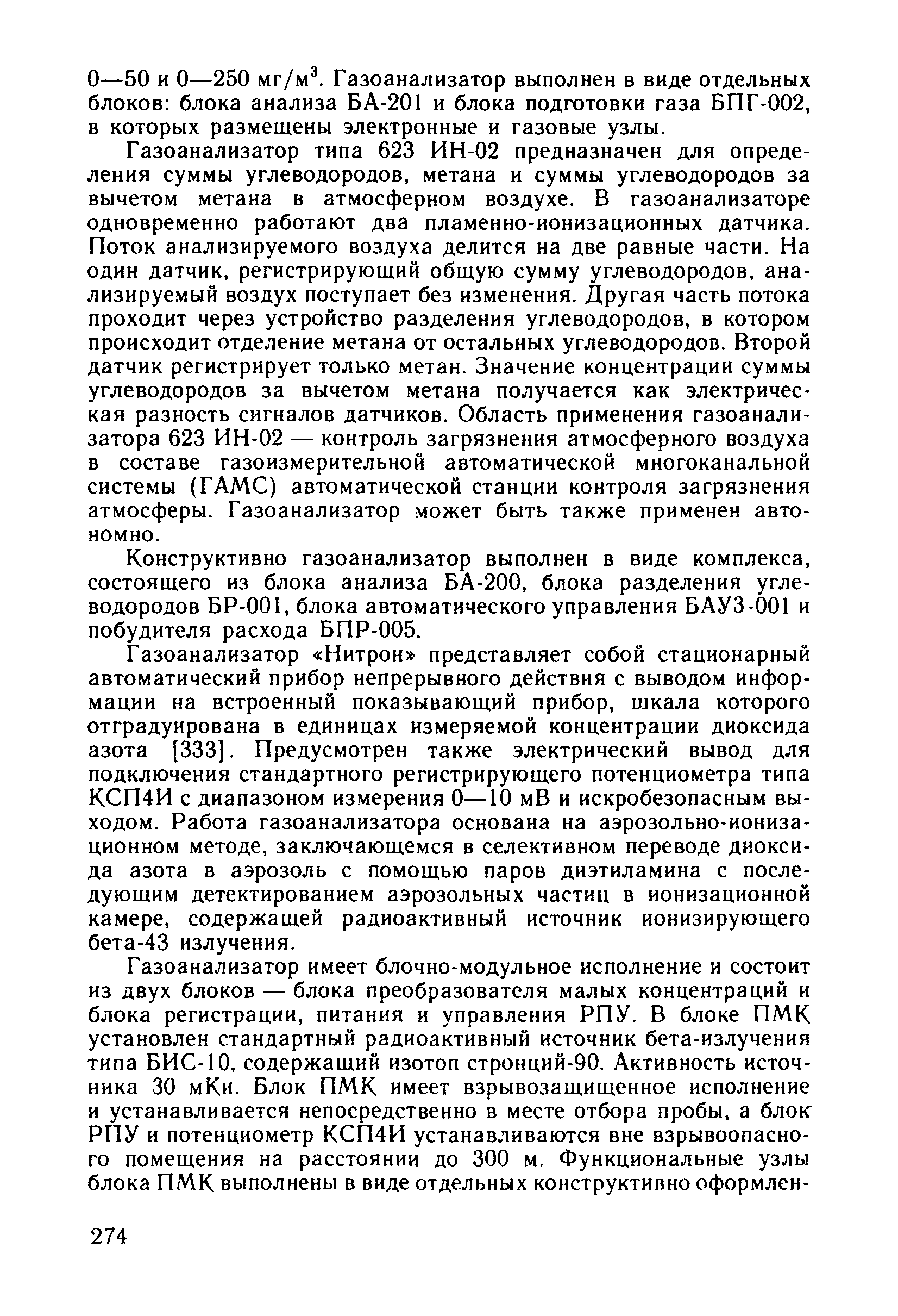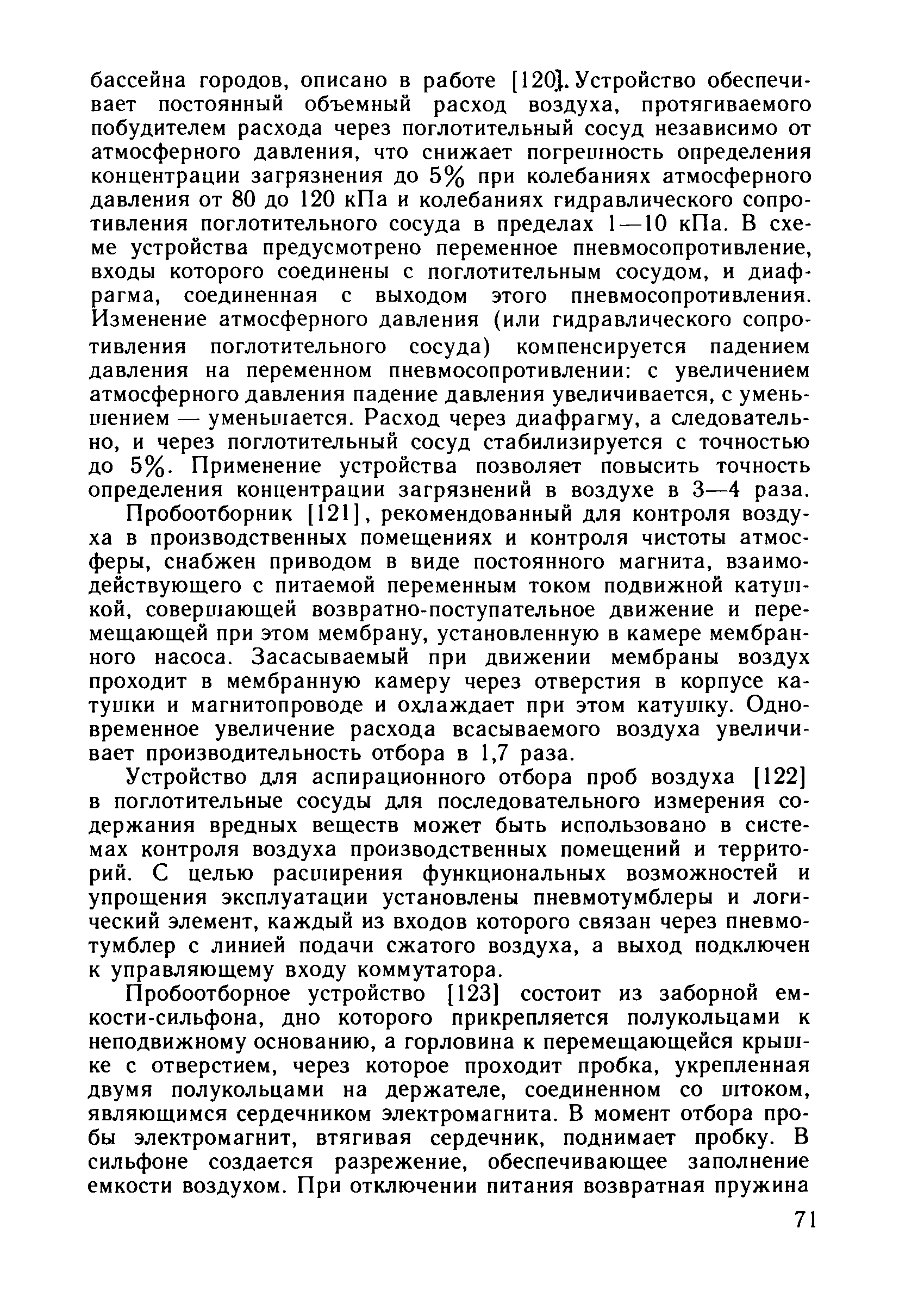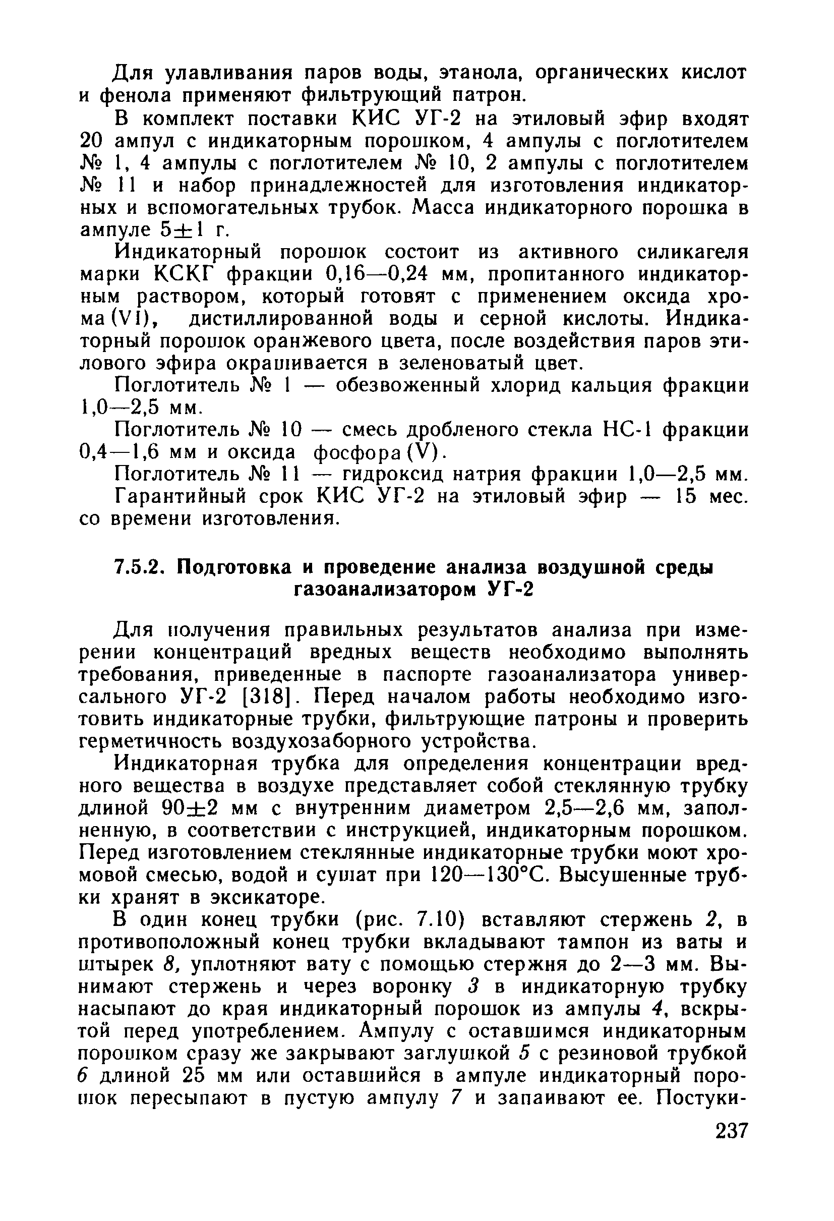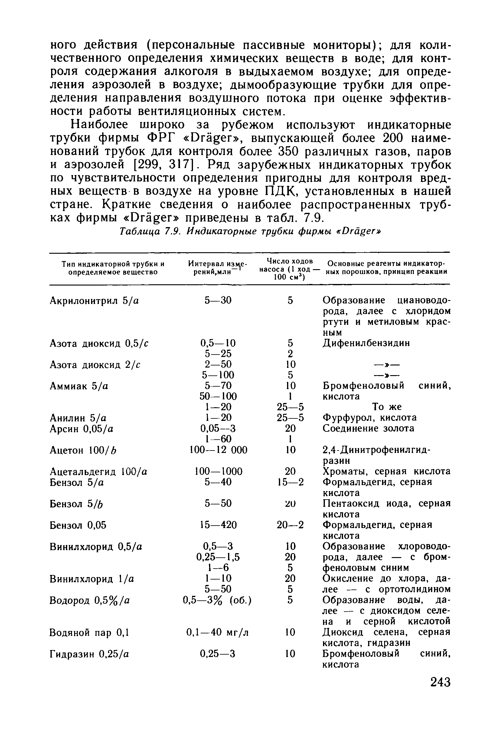 | Оглавление: | Введение Глава 1. Отбор проб воздуха 1.1. Отбор проб в жидкие среды 1.2. Отбор проб на твердые сорбенты 1.3. Хемосорбция 1.4. Отбор проб в охлаждаемые ловушки 1.5. Отбор проб в сосуды ограниченной вместимости 1.6. Отбор проб на фильтры 1.7. Индивидуальная активная дозиметрия 1.8. Индивидуальная пассивная дозиметрия 1.8.1. Аналитические методы контроля, применяемые при пассивном отборе проб воздуха 1.8.2. Влияние окружающей среды на адсорбцию веществ в пассивном дозиметре 1.8.3. Установление скорости поглощения вещества пассивными дозиметрами 1.9. Расчет концентрации веществ Глава 2. Аппаратура для отбора проб воздуха 2.1. Побудители расхода 2.2. Расходомеры 2.3. Аспирационные устройства Глава 3. Извлечение, концентрирование и идентификация веществ 3.1. Извлечение и концентрирование веществ 3.2. Идентификация веществ Глава 4. Методы приготовления смесей вредных веществ с воздухом 4.1. Статические методы 4.2. Динамические методы 4.3. Установки, используемые в практике контроля воздуха 4.4. Приготовление смесей аэрозолей с воздухом Глава 5. Физико-химические методы анализа 5.1. Газовая хроматография 5.1.1. Хроматограмма и ее параметры 5.1.2. Хроматографические колонки и коэффициент разделения 5.1.3. Выбор неподвижной фазы и условий разделения 5.1.4. Твердые носители для газожидкостной хроматографии и адсорбенты для газоадсорбционной хроматографии 5.1.5. Детекторы 5.1.6. Качественный анализ 5.1.7. Количественный анализ 5.1.8. Хроматографы 5.1.9. Дозаторы для ввода проб в хроматограф 5.1.10. Приготовление сорбентов 5.2. Тонкослойная хроматография 5.2.1. Адсорбционная хроматография 5.2.2. Распределительная хроматография 5.2.3. Сорбенты для ТСХ 5.2.4. Пластинки для ТСХ 5.2.5. Процесс разделения веществ на пластинке 5.2.6. Обнаружение веществ на хроматограмме 5.2.7. Количественный анализ 5.2.8. Оборудование для ТСХ 5.3. Жидкостная хроматография 5.4. Ионная хроматография 5.5. Масс-спектрометрия и хромато-масс-спектрометрия 5.6. Фотометрия 5.7. Спектроскопические методы 5.7.1. Атомно-эмиссионная спектрометрия 5.7.2. Атомно-абсорбционная спектрометрия 5.7.3. Атомно-флуоресцентная спектрометрия 5.7.4. Оптико-акустическая спектрометрия 5.8. Вольтамперометрия 5.9. Ионометрия Глава б. Метрологическое обеспечение контроля воздуха Глава 7. Измерение концентрации вредных веществ индикаторными трубками 7.1. Основные принципы работы индикаторных трубок 7.2. Подготовка и проведение измерений индикаторными трубками 7.3. Воздухозаборные устройства для индикаторных трубок 7.3.1. Аспиратор сильфонный АМ-5 7.3.2. Воздухозаборное устройство газоанализатора УГ-2 7.3.3. Ручной поршневой насос Китагавы 7.4. Газоопределители химические ГХ-М 7.5. Газоанализатор универсальный переносной УГ-2 7.5.1. Комплекты индикаторных средств 7.5.2. Подготовка и проведение анализа воздушной среды газоанализатором УГ-2 7.6. Зарубежные средства индикации 7.7. Индикаторные трубки длительного действия для определения среднесменных концентраций вредных веществ в воздухе Глава 8. Автоматический анализ воздушной среды производственных помещений 8.1. Общие сведения 8.2. Автоматические сигнализаторы довзрывоопасных концентраций 8.3. Газоанализаторы вредных веществ в воздухе 8.4. Магнитные и термомагнитные газоанализаторы кислорода 8.5. Общие требования к выбору мест отбора проб воздуха и к установке датчиков автоматических анализаторов контроля воздушной среды 8.