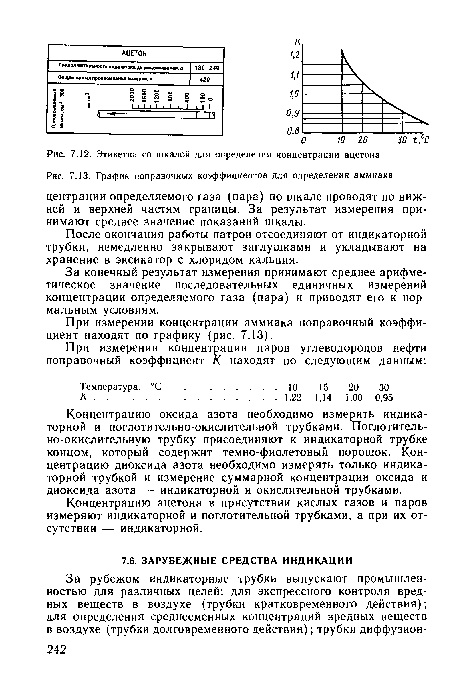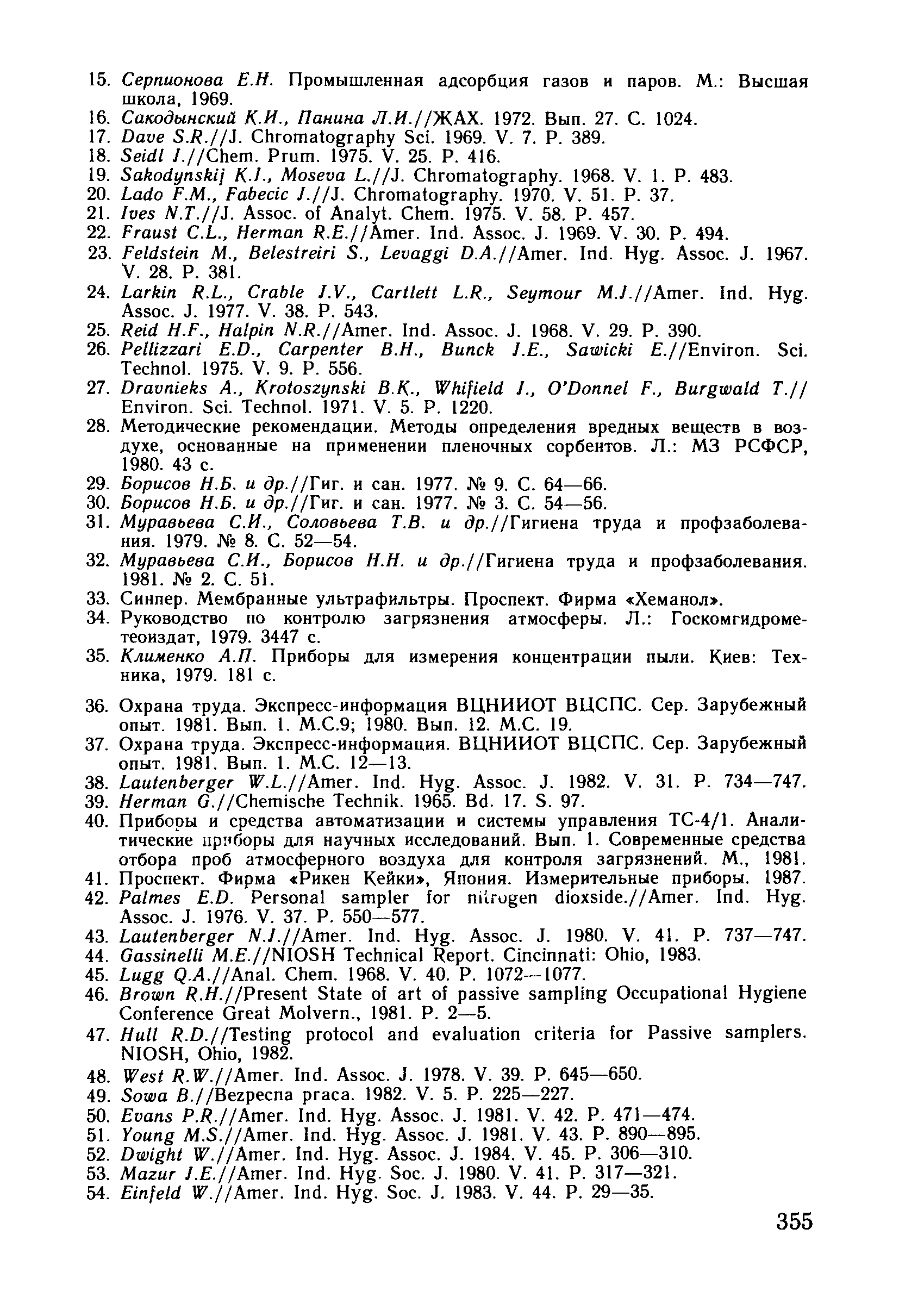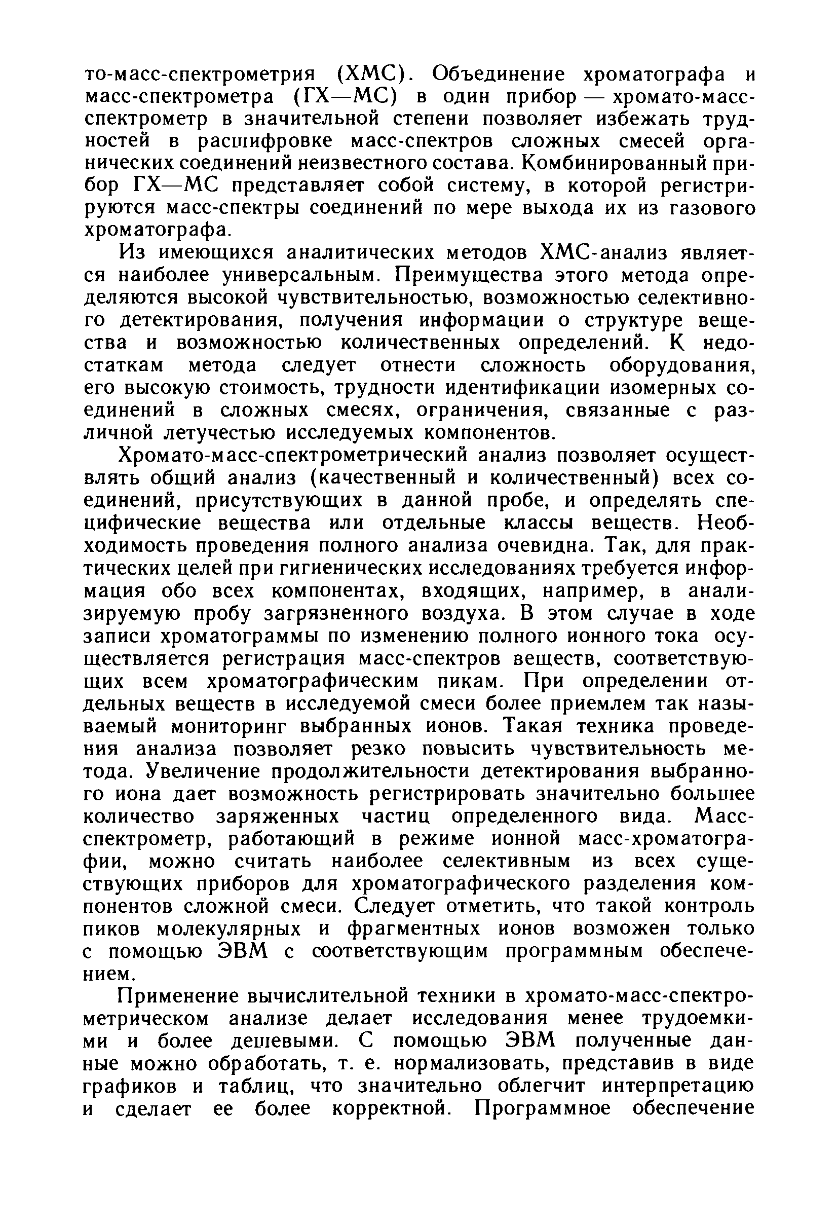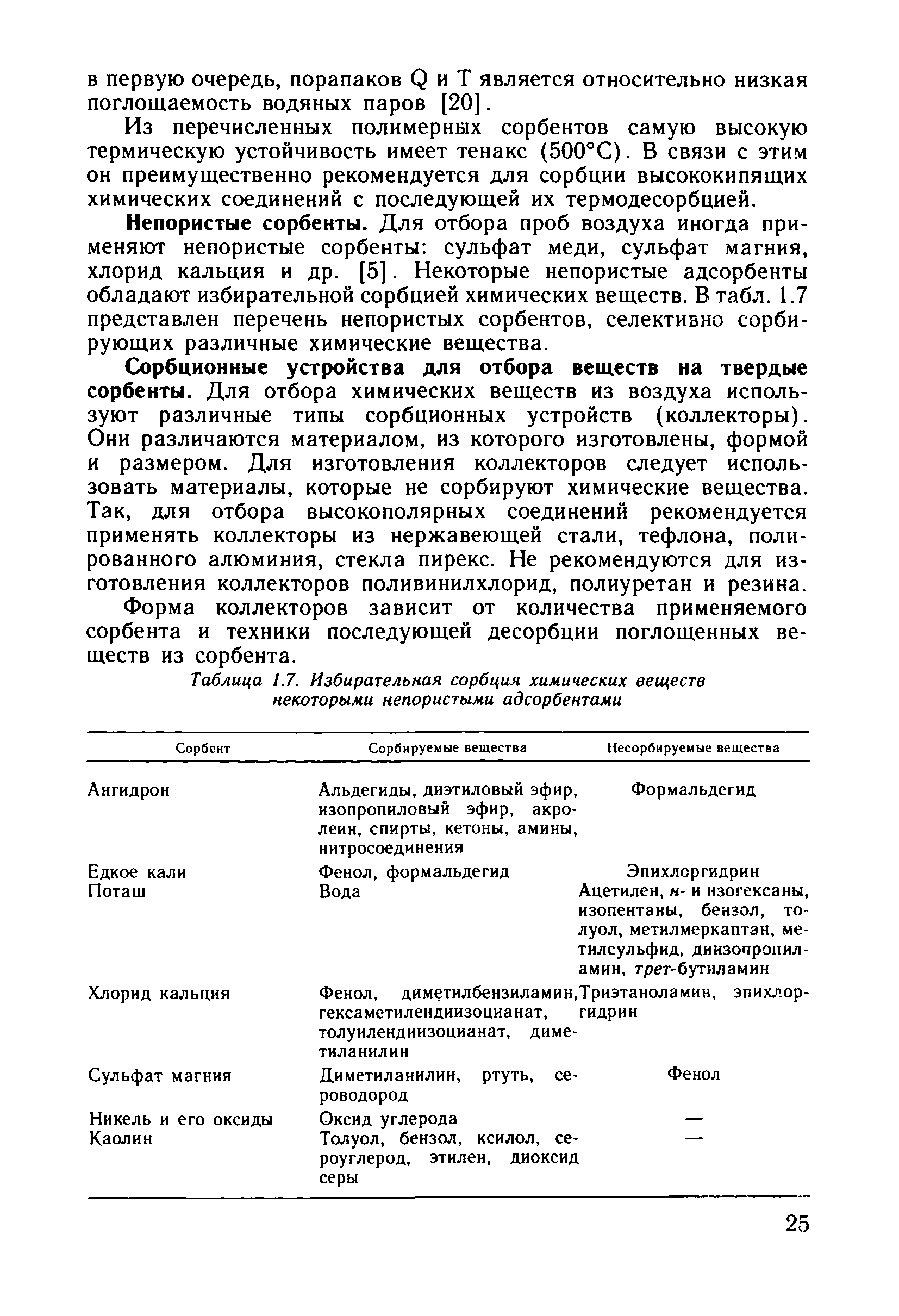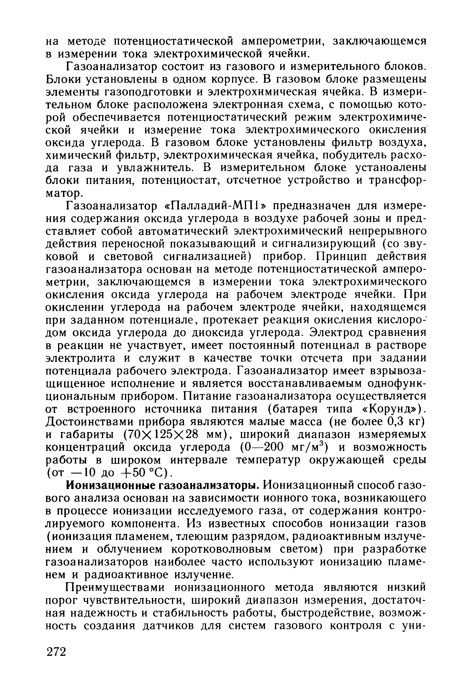 | Оглавление: | Введение Глава 1. Отбор проб воздуха 1.1. Отбор проб в жидкие среды 1.2. Отбор проб на твердые сорбенты 1.3. Хемосорбция 1.4. Отбор проб в охлаждаемые ловушки 1.5. Отбор проб в сосуды ограниченной вместимости 1.6. Отбор проб на фильтры 1.7. Индивидуальная активная дозиметрия 1.8. Индивидуальная пассивная дозиметрия 1.8.1. Аналитические методы контроля, применяемые при пассивном отборе проб воздуха 1.8.2. Влияние окружающей среды на адсорбцию веществ в пассивном дозиметре 1.8.3. Установление скорости поглощения вещества пассивными дозиметрами 1.9. Расчет концентрации веществ Глава 2. Аппаратура для отбора проб воздуха 2.1. Побудители расхода 2.2. Расходомеры 2.3. Аспирационные устройства Глава 3. Извлечение, концентрирование и идентификация веществ 3.1. Извлечение и концентрирование веществ 3.2. Идентификация веществ Глава 4. Методы приготовления смесей вредных веществ с воздухом 4.1. Статические методы 4.2. Динамические методы 4.3. Установки, используемые в практике контроля воздуха 4.4. Приготовление смесей аэрозолей с воздухом Глава 5. Физико-химические методы анализа 5.1. Газовая хроматография 5.1.1. Хроматограмма и ее параметры 5.1.2. Хроматографические колонки и коэффициент разделения 5.1.3. Выбор неподвижной фазы и условий разделения 5.1.4. Твердые носители для газожидкостной хроматографии и адсорбенты для газоадсорбционной хроматографии 5.1.5. Детекторы 5.1.6. Качественный анализ 5.1.7. Количественный анализ 5.1.8. Хроматографы 5.1.9. Дозаторы для ввода проб в хроматограф 5.1.10. Приготовление сорбентов 5.2. Тонкослойная хроматография 5.2.1. Адсорбционная хроматография 5.2.2. Распределительная хроматография 5.2.3. Сорбенты для ТСХ 5.2.4. Пластинки для ТСХ 5.2.5. Процесс разделения веществ на пластинке 5.2.6. Обнаружение веществ на хроматограмме 5.2.7. Количественный анализ 5.2.8. Оборудование для ТСХ 5.3. Жидкостная хроматография 5.4. Ионная хроматография 5.5. Масс-спектрометрия и хромато-масс-спектрометрия 5.6. Фотометрия 5.7. Спектроскопические методы 5.7.1. Атомно-эмиссионная спектрометрия 5.7.2. Атомно-абсорбционная спектрометрия 5.7.3. Атомно-флуоресцентная спектрометрия 5.7.4. Оптико-акустическая спектрометрия 5.8. Вольтамперометрия 5.9. Ионометрия Глава б. Метрологическое обеспечение контроля воздуха Глава 7. Измерение концентрации вредных веществ индикаторными трубками 7.1. Основные принципы работы индикаторных трубок 7.2. Подготовка и проведение измерений индикаторными трубками 7.3. Воздухозаборные устройства для индикаторных трубок 7.3.1. Аспиратор сильфонный АМ-5 7.3.2. Воздухозаборное устройство газоанализатора УГ-2 7.3.3. Ручной поршневой насос Китагавы 7.4. Газоопределители химические ГХ-М 7.5. Газоанализатор универсальный переносной УГ-2 7.5.1. Комплекты индикаторных средств 7.5.2. Подготовка и проведение анализа воздушной среды газоанализатором УГ-2 7.6. Зарубежные средства индикации 7.7. Индикаторные трубки длительного действия для определения среднесменных концентраций вредных веществ в воздухе Глава 8. Автоматический анализ воздушной среды производственных помещений 8.1. Общие сведения 8.2. Автоматические сигнализаторы довзрывоопасных концентраций 8.3. Газоанализаторы вредных веществ в воздухе 8.4. Магнитные и термомагнитные газоанализаторы кислорода 8.5. Общие требования к выбору мест отбора проб воздуха и к установке датчиков автоматических анализаторов контроля воздушной среды 8.