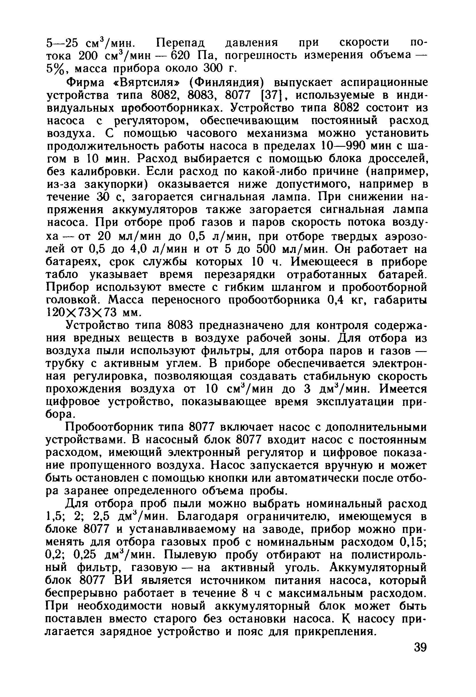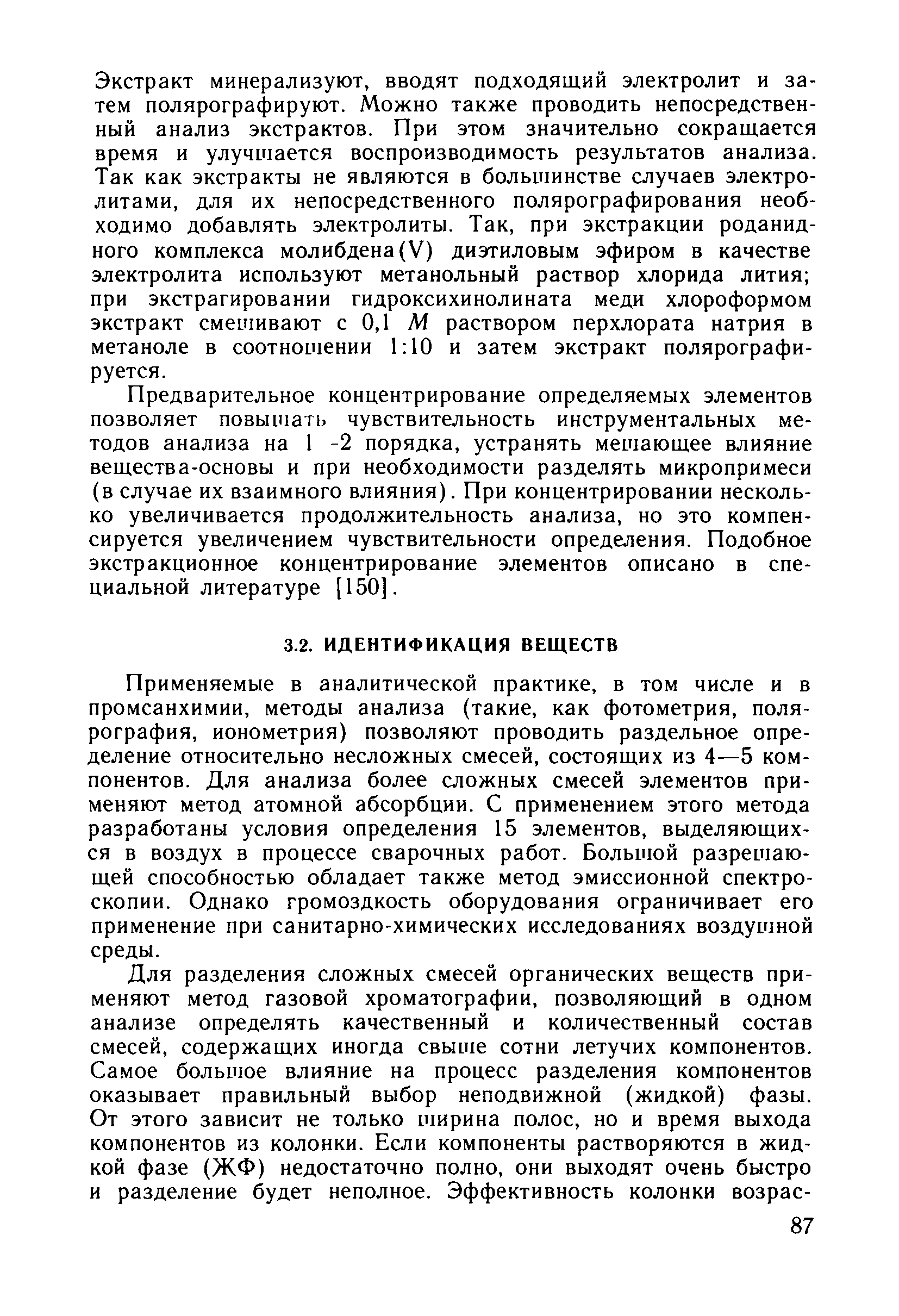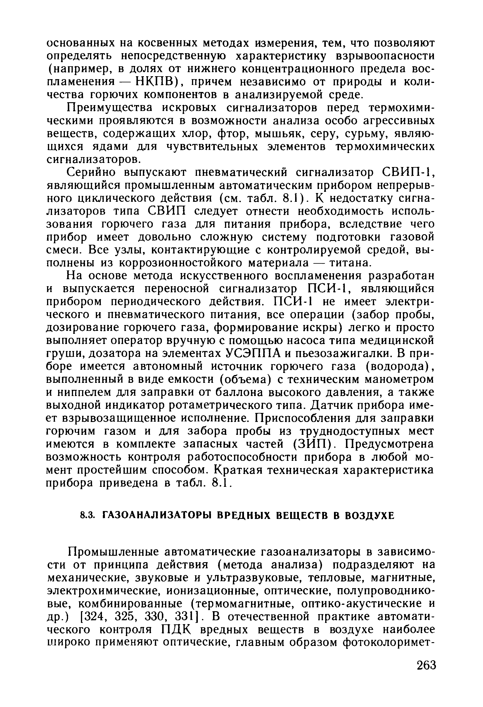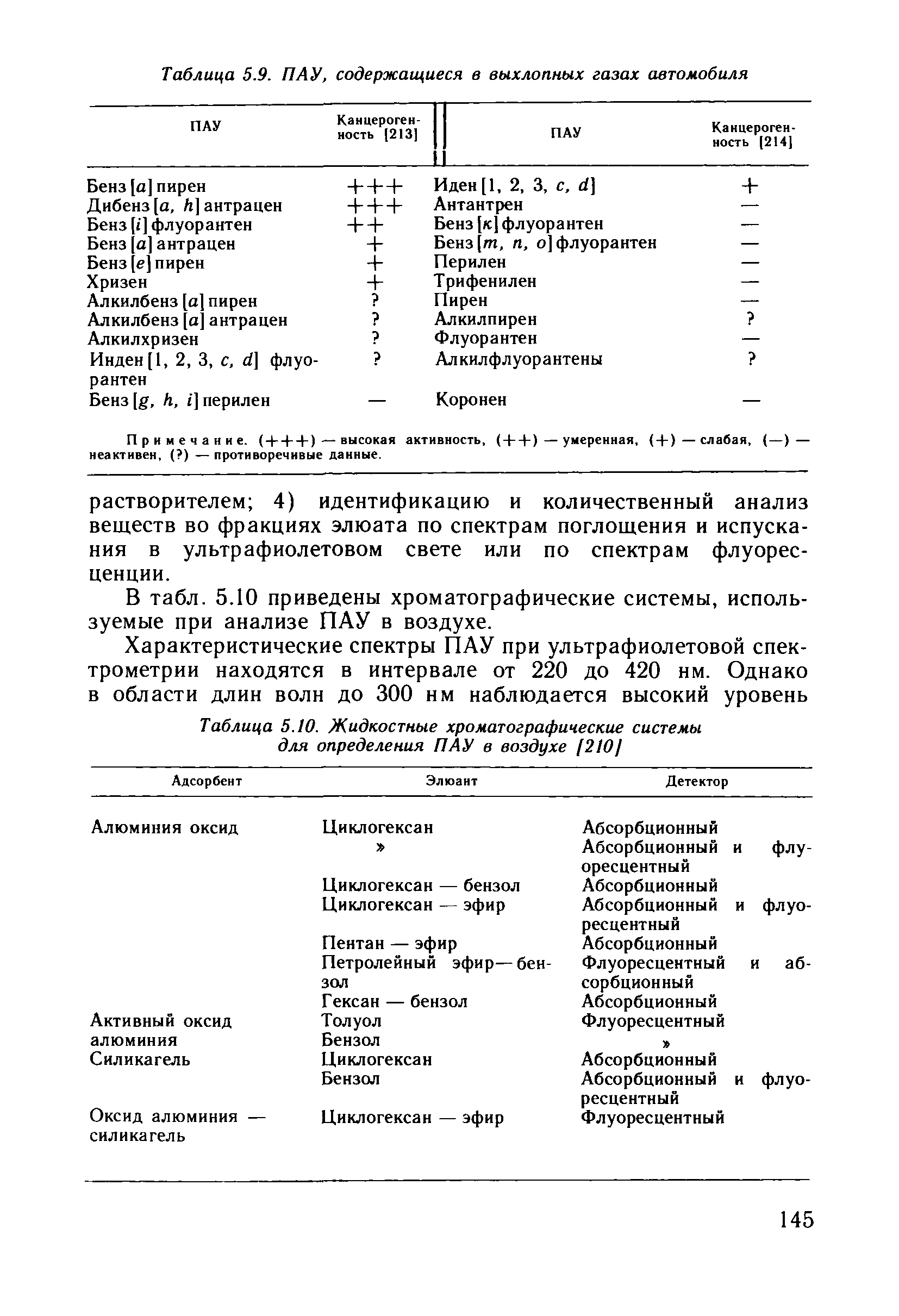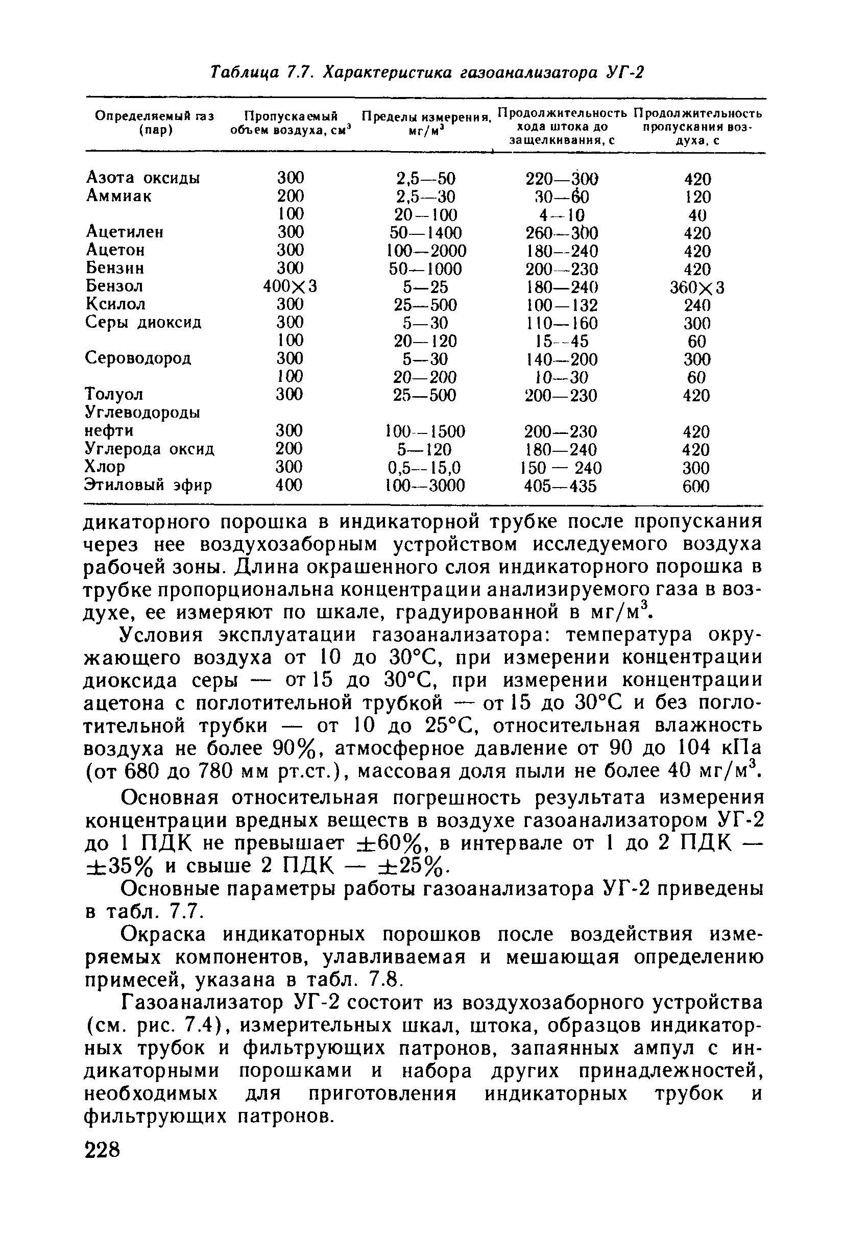 | Оглавление: | Введение Глава 1. Отбор проб воздуха 1.1. Отбор проб в жидкие среды 1.2. Отбор проб на твердые сорбенты 1.3. Хемосорбция 1.4. Отбор проб в охлаждаемые ловушки 1.5. Отбор проб в сосуды ограниченной вместимости 1.6. Отбор проб на фильтры 1.7. Индивидуальная активная дозиметрия 1.8. Индивидуальная пассивная дозиметрия 1.8.1. Аналитические методы контроля, применяемые при пассивном отборе проб воздуха 1.8.2. Влияние окружающей среды на адсорбцию веществ в пассивном дозиметре 1.8.3. Установление скорости поглощения вещества пассивными дозиметрами 1.9. Расчет концентрации веществ Глава 2. Аппаратура для отбора проб воздуха 2.1. Побудители расхода 2.2. Расходомеры 2.3. Аспирационные устройства Глава 3. Извлечение, концентрирование и идентификация веществ 3.1. Извлечение и концентрирование веществ 3.2. Идентификация веществ Глава 4. Методы приготовления смесей вредных веществ с воздухом 4.1. Статические методы 4.2. Динамические методы 4.3. Установки, используемые в практике контроля воздуха 4.4. Приготовление смесей аэрозолей с воздухом Глава 5. Физико-химические методы анализа 5.1. Газовая хроматография 5.1.1. Хроматограмма и ее параметры 5.1.2. Хроматографические колонки и коэффициент разделения 5.1.3. Выбор неподвижной фазы и условий разделения 5.1.4. Твердые носители для газожидкостной хроматографии и адсорбенты для газоадсорбционной хроматографии 5.1.5. Детекторы 5.1.6. Качественный анализ 5.1.7. Количественный анализ 5.1.8. Хроматографы 5.1.9. Дозаторы для ввода проб в хроматограф 5.1.10. Приготовление сорбентов 5.2. Тонкослойная хроматография 5.2.1. Адсорбционная хроматография 5.2.2. Распределительная хроматография 5.2.3. Сорбенты для ТСХ 5.2.4. Пластинки для ТСХ 5.2.5. Процесс разделения веществ на пластинке 5.2.6. Обнаружение веществ на хроматограмме 5.2.7. Количественный анализ 5.2.8. Оборудование для ТСХ 5.3. Жидкостная хроматография 5.4. Ионная хроматография 5.5. Масс-спектрометрия и хромато-масс-спектрометрия 5.6. Фотометрия 5.7. Спектроскопические методы 5.7.1. Атомно-эмиссионная спектрометрия 5.7.2. Атомно-абсорбционная спектрометрия 5.7.3. Атомно-флуоресцентная спектрометрия 5.7.4. Оптико-акустическая спектрометрия 5.8. Вольтамперометрия 5.9. Ионометрия Глава б. Метрологическое обеспечение контроля воздуха Глава 7. Измерение концентрации вредных веществ индикаторными трубками 7.1. Основные принципы работы индикаторных трубок 7.2. Подготовка и проведение измерений индикаторными трубками 7.3. Воздухозаборные устройства для индикаторных трубок 7.3.1. Аспиратор сильфонный АМ-5 7.3.2. Воздухозаборное устройство газоанализатора УГ-2 7.3.3. Ручной поршневой насос Китагавы 7.4. Газоопределители химические ГХ-М 7.5. Газоанализатор универсальный переносной УГ-2 7.5.1. Комплекты индикаторных средств 7.5.2. Подготовка и проведение анализа воздушной среды газоанализатором УГ-2 7.6. Зарубежные средства индикации 7.7. Индикаторные трубки длительного действия для определения среднесменных концентраций вредных веществ в воздухе Глава 8. Автоматический анализ воздушной среды производственных помещений 8.1. Общие сведения 8.2. Автоматические сигнализаторы довзрывоопасных концентраций 8.3. Газоанализаторы вредных веществ в воздухе 8.4. Магнитные и термомагнитные газоанализаторы кислорода 8.5. Общие требования к выбору мест отбора проб воздуха и к установке датчиков автоматических анализаторов контроля воздушной среды 8.