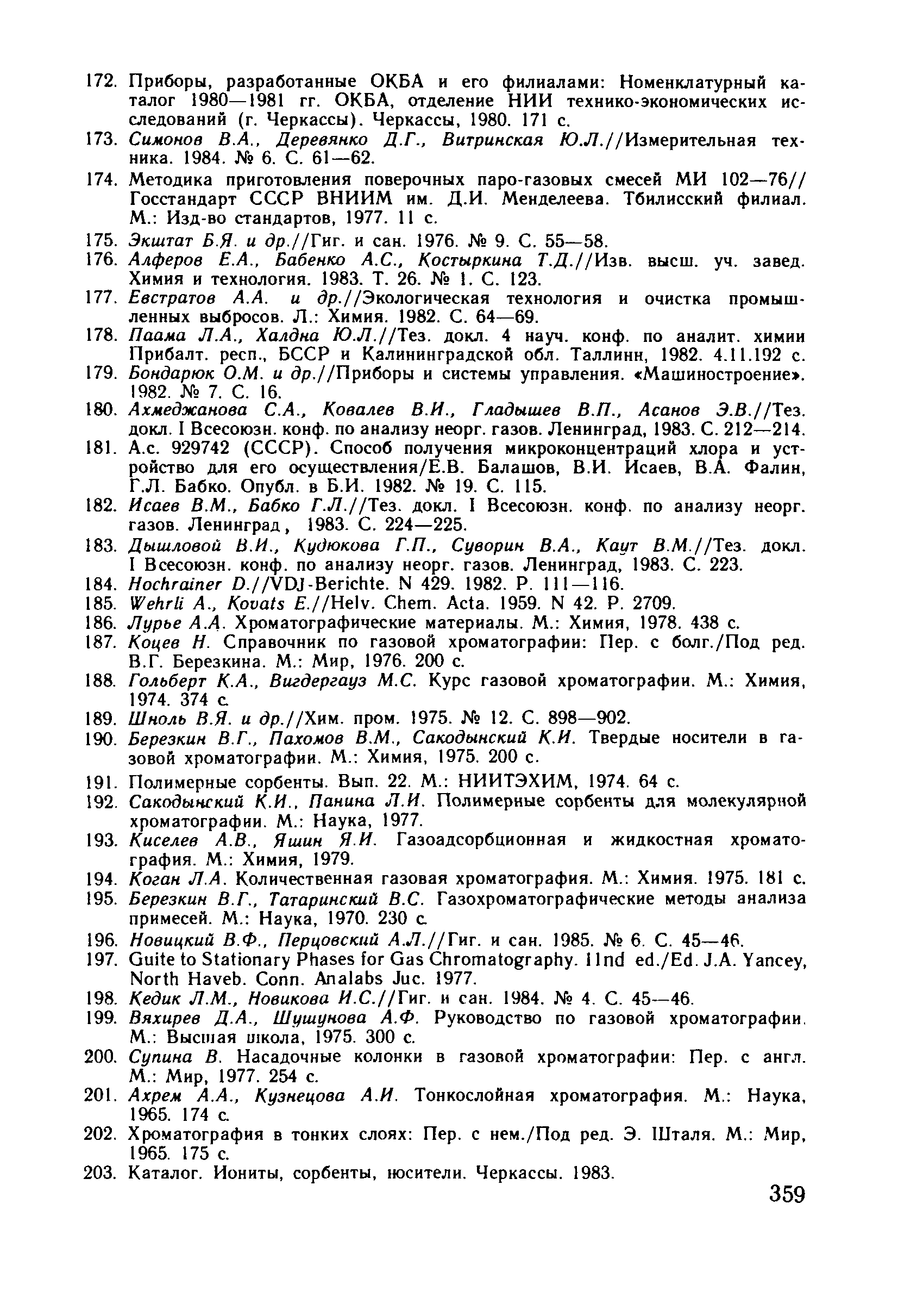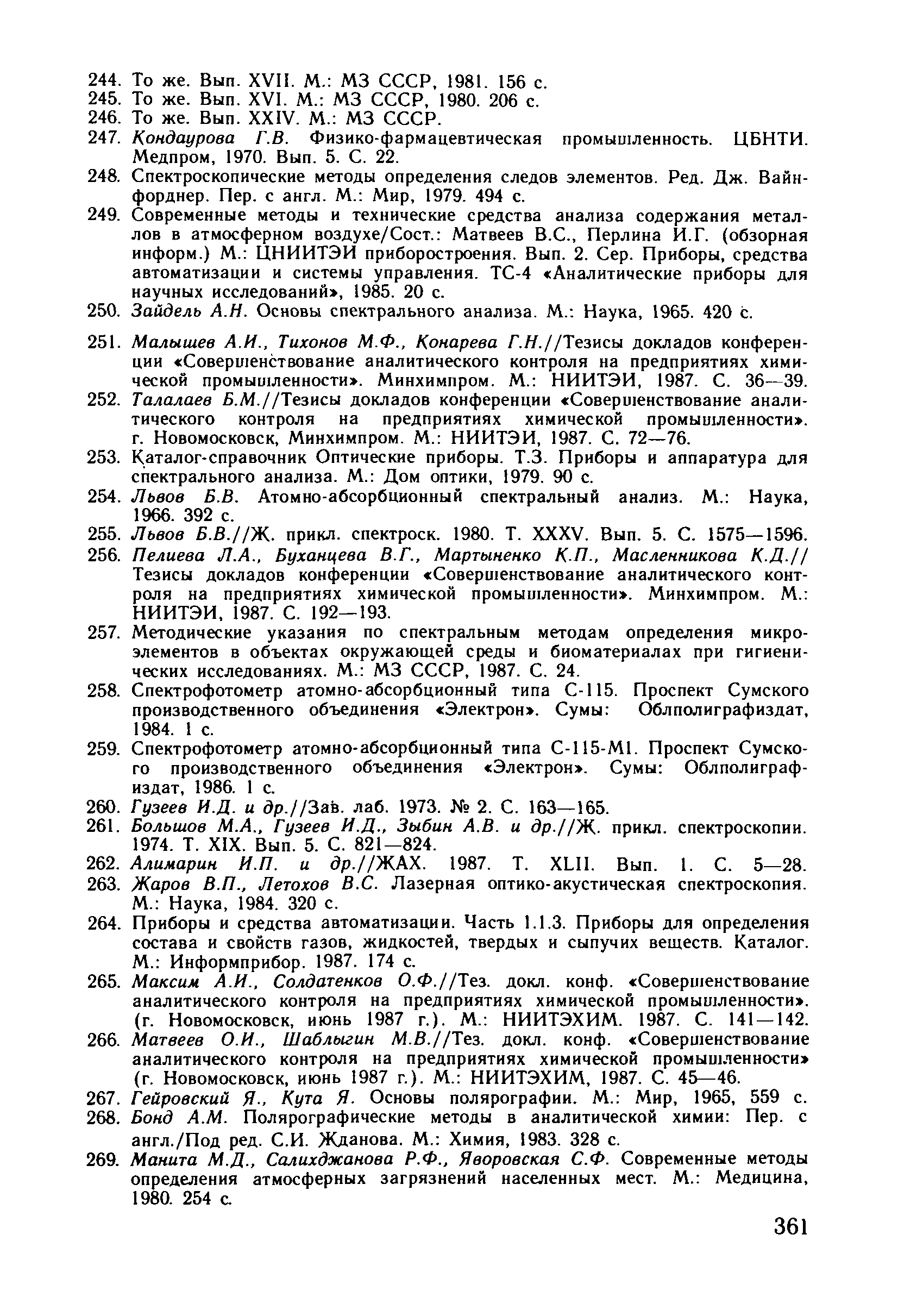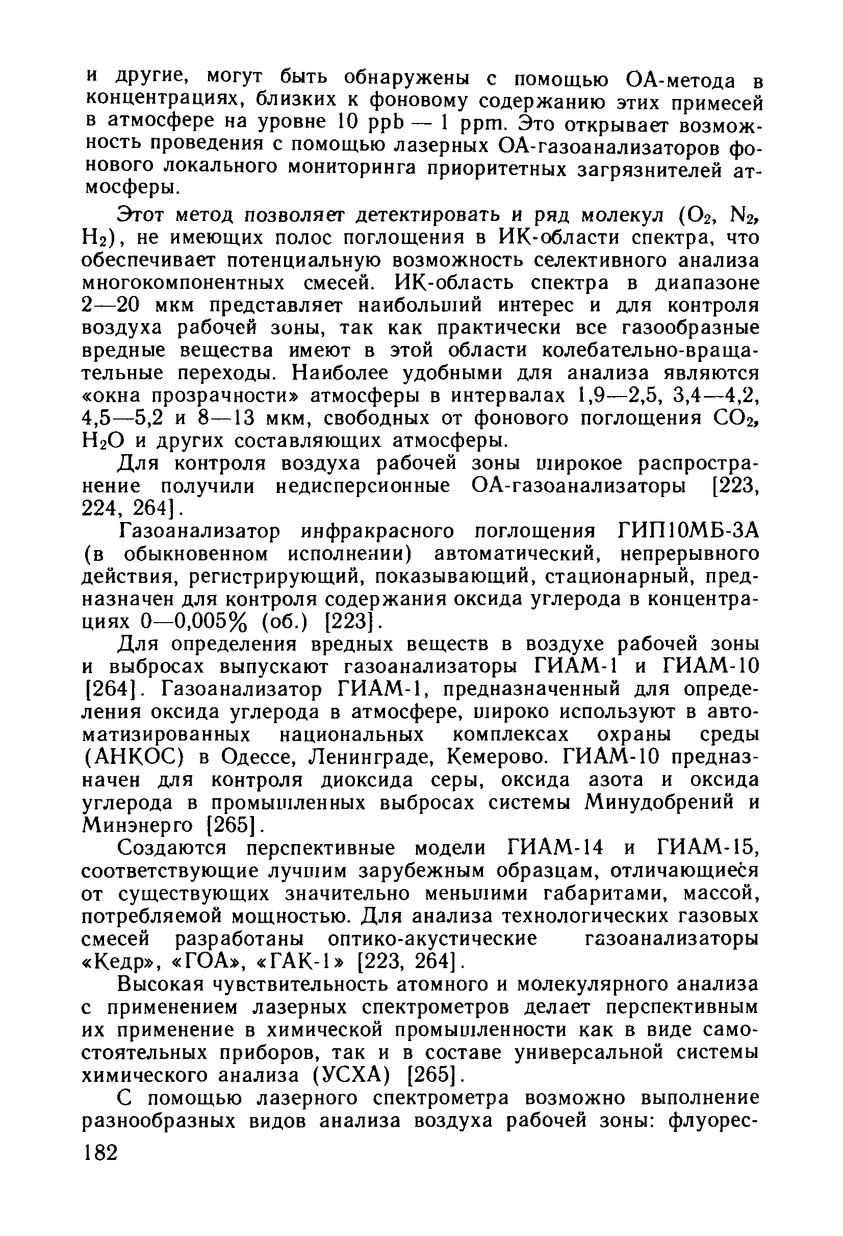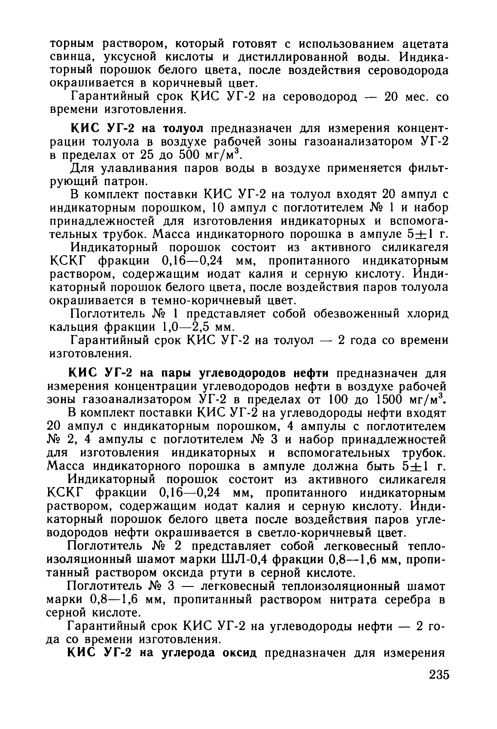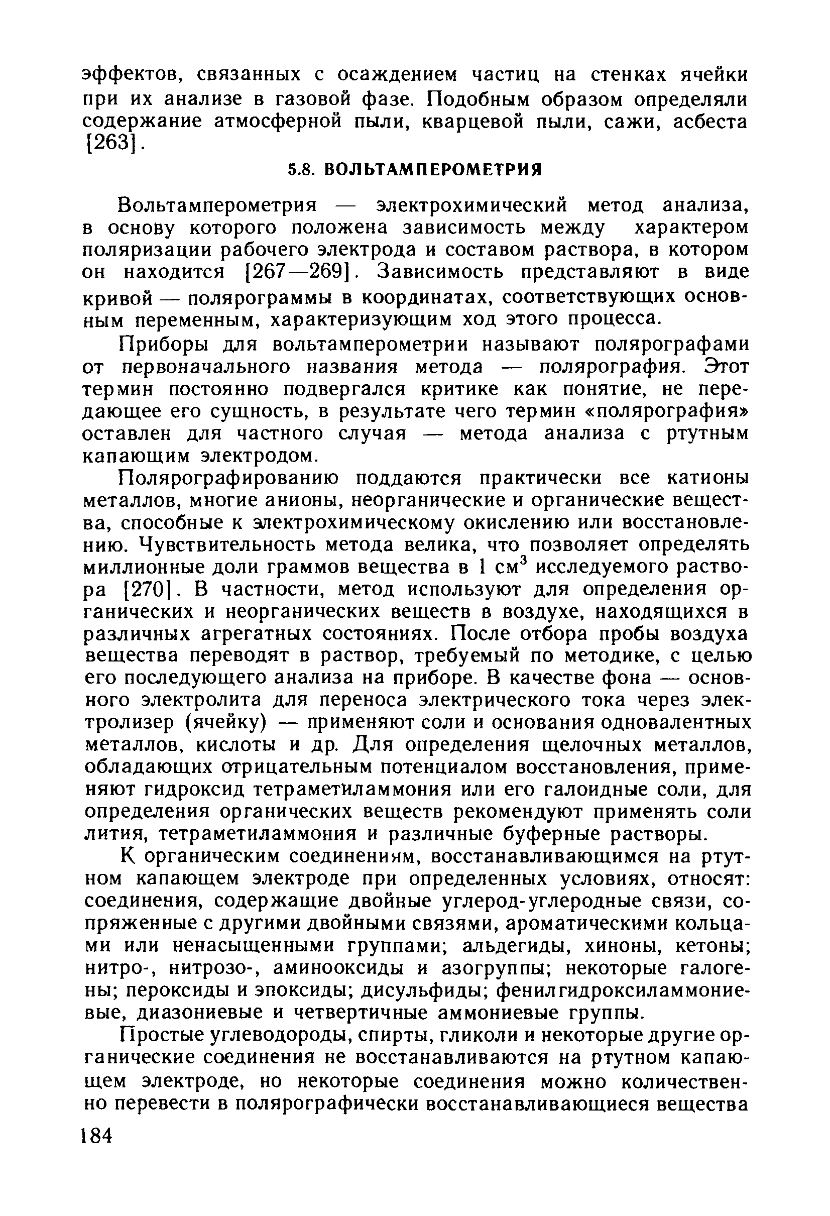 | Оглавление: | Введение Глава 1. Отбор проб воздуха 1.1. Отбор проб в жидкие среды 1.2. Отбор проб на твердые сорбенты 1.3. Хемосорбция 1.4. Отбор проб в охлаждаемые ловушки 1.5. Отбор проб в сосуды ограниченной вместимости 1.6. Отбор проб на фильтры 1.7. Индивидуальная активная дозиметрия 1.8. Индивидуальная пассивная дозиметрия 1.8.1. Аналитические методы контроля, применяемые при пассивном отборе проб воздуха 1.8.2. Влияние окружающей среды на адсорбцию веществ в пассивном дозиметре 1.8.3. Установление скорости поглощения вещества пассивными дозиметрами 1.9. Расчет концентрации веществ Глава 2. Аппаратура для отбора проб воздуха 2.1. Побудители расхода 2.2. Расходомеры 2.3. Аспирационные устройства Глава 3. Извлечение, концентрирование и идентификация веществ 3.1. Извлечение и концентрирование веществ 3.2. Идентификация веществ Глава 4. Методы приготовления смесей вредных веществ с воздухом 4.1. Статические методы 4.2. Динамические методы 4.3. Установки, используемые в практике контроля воздуха 4.4. Приготовление смесей аэрозолей с воздухом Глава 5. Физико-химические методы анализа 5.1. Газовая хроматография 5.1.1. Хроматограмма и ее параметры 5.1.2. Хроматографические колонки и коэффициент разделения 5.1.3. Выбор неподвижной фазы и условий разделения 5.1.4. Твердые носители для газожидкостной хроматографии и адсорбенты для газоадсорбционной хроматографии 5.1.5. Детекторы 5.1.6. Качественный анализ 5.1.7. Количественный анализ 5.1.8. Хроматографы 5.1.9. Дозаторы для ввода проб в хроматограф 5.1.10. Приготовление сорбентов 5.2. Тонкослойная хроматография 5.2.1. Адсорбционная хроматография 5.2.2. Распределительная хроматография 5.2.3. Сорбенты для ТСХ 5.2.4. Пластинки для ТСХ 5.2.5. Процесс разделения веществ на пластинке 5.2.6. Обнаружение веществ на хроматограмме 5.2.7. Количественный анализ 5.2.8. Оборудование для ТСХ 5.3. Жидкостная хроматография 5.4. Ионная хроматография 5.5. Масс-спектрометрия и хромато-масс-спектрометрия 5.6. Фотометрия 5.7. Спектроскопические методы 5.7.1. Атомно-эмиссионная спектрометрия 5.7.2. Атомно-абсорбционная спектрометрия 5.7.3. Атомно-флуоресцентная спектрометрия 5.7.4. Оптико-акустическая спектрометрия 5.8. Вольтамперометрия 5.9. Ионометрия Глава б. Метрологическое обеспечение контроля воздуха Глава 7. Измерение концентрации вредных веществ индикаторными трубками 7.1. Основные принципы работы индикаторных трубок 7.2. Подготовка и проведение измерений индикаторными трубками 7.3. Воздухозаборные устройства для индикаторных трубок 7.3.1. Аспиратор сильфонный АМ-5 7.3.2. Воздухозаборное устройство газоанализатора УГ-2 7.3.3. Ручной поршневой насос Китагавы 7.4. Газоопределители химические ГХ-М 7.5. Газоанализатор универсальный переносной УГ-2 7.5.1. Комплекты индикаторных средств 7.5.2. Подготовка и проведение анализа воздушной среды газоанализатором УГ-2 7.6. Зарубежные средства индикации 7.7. Индикаторные трубки длительного действия для определения среднесменных концентраций вредных веществ в воздухе Глава 8. Автоматический анализ воздушной среды производственных помещений 8.1. Общие сведения 8.2. Автоматические сигнализаторы довзрывоопасных концентраций 8.3. Газоанализаторы вредных веществ в воздухе 8.4. Магнитные и термомагнитные газоанализаторы кислорода 8.5. Общие требования к выбору мест отбора проб воздуха и к установке датчиков автоматических анализаторов контроля воздушной среды 8.