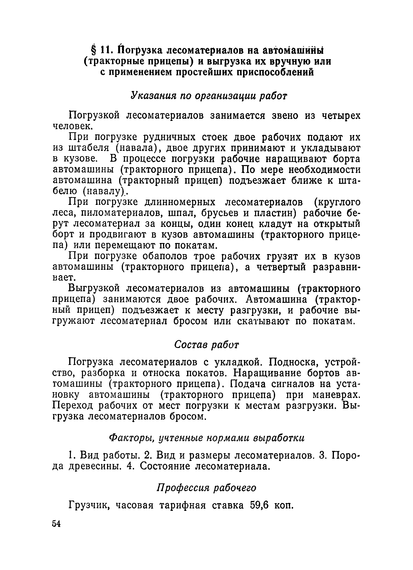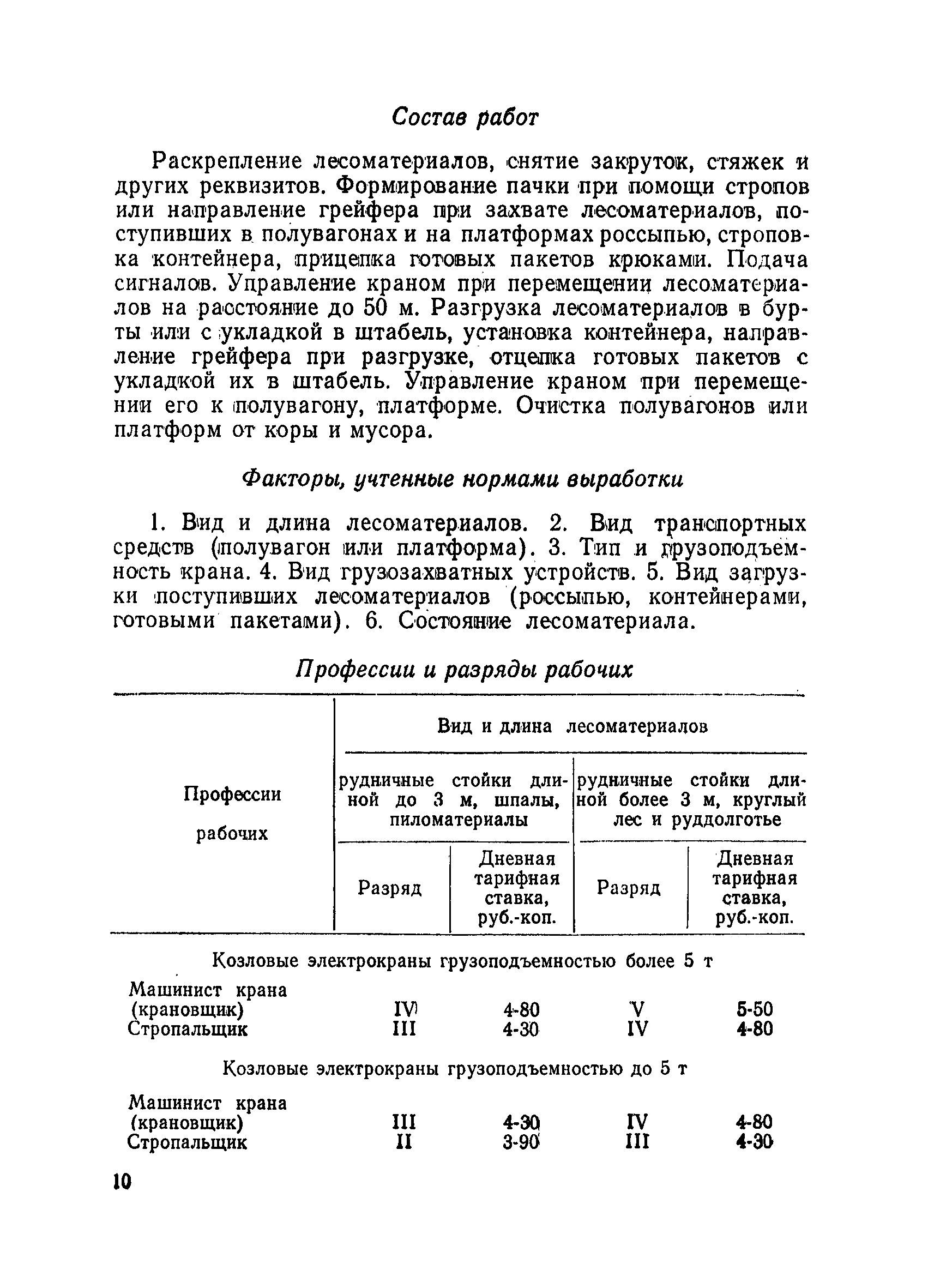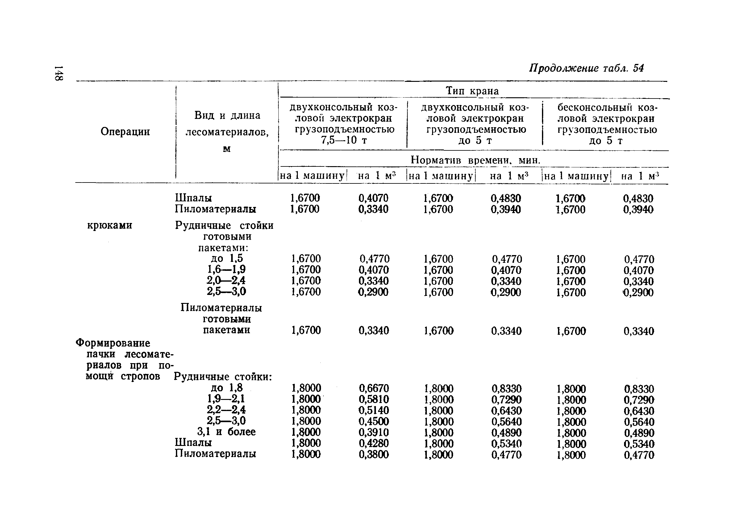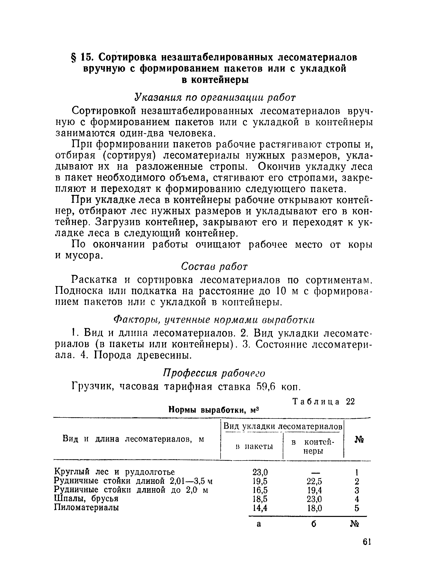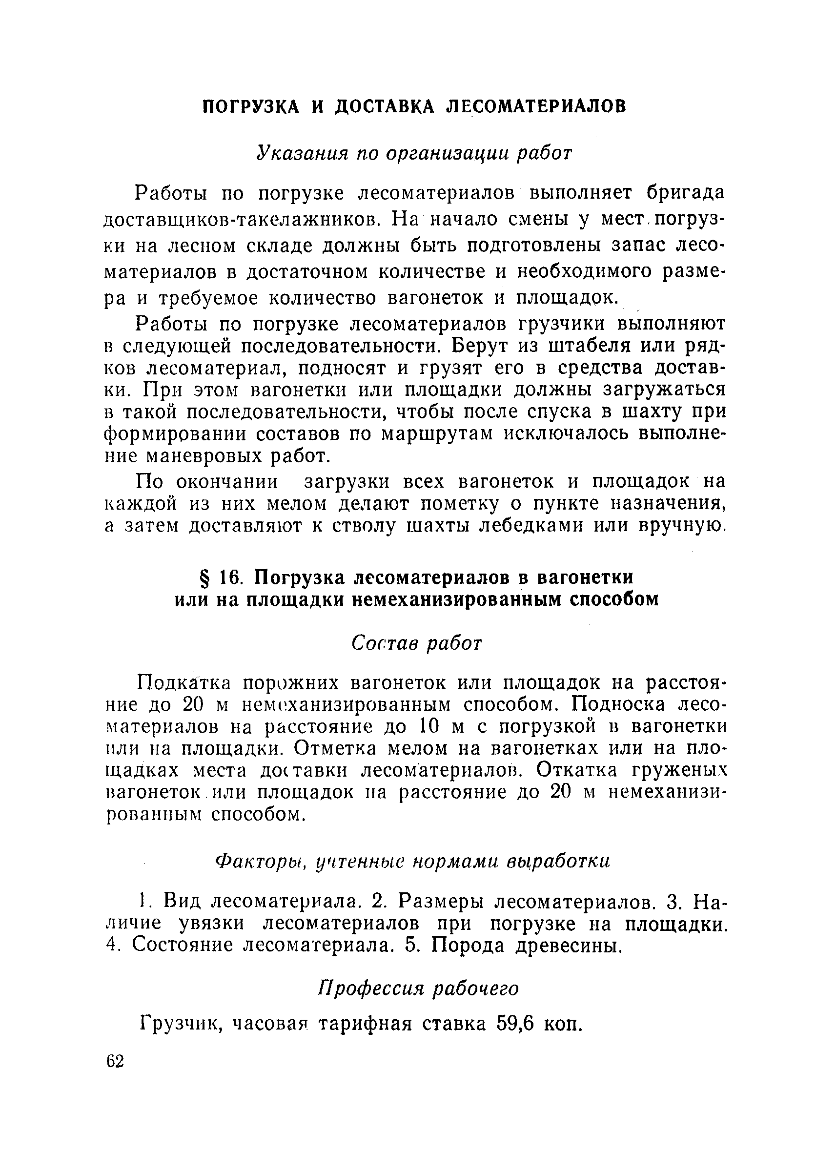 Типовые нормы выработки на переработку лесоматериалов на лесных складах предприятий (организаций) угольной промышленности| Статус: | справочные материалы, мп, тпр | | Название рус.: | Типовые нормы выработки на переработку лесоматериалов на лесных складах предприятий (организаций) угольной промышленности | | Дата добавления в базу: | 01.01.2019 | | Дата актуализации: | 01.01.2021 | | Область применения: | Типовые нормы рекомендуются для использования в качестве основы при разработке Единых отраслевых и бассейновых норм выработки, а также для применения на предприятиях и в организациях как местных технически обоснованных норм после утверждения их руководителем по согласованию с соответствующим комитетом профсоюза и нормативно-исследовательской станцией комбината (треста). Материалы сборника могут быть использованы научно-исследовательскими и проектными организациями, изучающими вопросы организации и нормирования труда | | Оглавление: | Порядок применения типовых норм Общая часть Раздел I. Разгрузочные работы § 1. Выгрузка лесоматериалов кранами из железнодорожного подвижного состава § 2. Выгрузка лесоматериалов из железнодорожного подвижного состава вручную или с применением простейших приспособлений Раздел II. Механизированное лесопиление и разделка леса § 3. Распиловка леса па лесопильных рамах § 4. Разборка и установка поставов рамных пил § 5. Продольная распиловка леса на круглопильных станках § 6. Заготовка рудничных стоек на круглопильных станках § 7. Заготовка рудничных стоек ручными электро- или бензопилами § 8. Поперечная распиловка пиломатериалов (досок, обаполов, затяжек, распилов, брусьев, шпал) на круглопильных станках Раздел III. Транспортно-перевалочные и вспомогательные работы § 9. Перемещение лесоматериалов кранами по территории склада § 10. Погрузка лесоматериалов кранами на автомашины (тракторные прицепы) § 11. Погрузка лесоматериалов на автомашины (тракторные прицепы) и выгрузка их вручную или с применением простейших приспособлений § 12. Перемещение леса автопогрузчиками § 13. Сортировка и перемещение круглого леса лебедками или тракторами § 14. Механизированное пакетирование рудничных стоек § 15. Сортировка незаштабелированных лесоматериалов вручную с формированием пакетов или с укладкой в контейнеры § 16. Погрузка лесоматериалов в вагонетки или на площадки немеханизированным способом § 17. Доставка лесоматериалов в вагонетках или на площадках немеханизированным способом § 18. Доставка лесоматериалов в вагонетках или на площадках лебедками § 19. Доставка лесоматериалов конвейерами § 20. Штабелировка круглого леса и рудничного долготья лебедками Раздел IV. Прочие работы § 21. Окорка рудничных стоек на механическом станке § 22. Окорка рудничных стоек вручную § 23. Пропитка пиломатериалов антисептиками § 24. Заточка рамных пил на суппортном станке ТчПА-3 § 25. Нарезка, заточка круглых, рамных и цепных пил на наждачном станке. Развод зубьев и правка пил § 26. Разные работы на лесном складе § 27. Вывозка отходов и мусора Раздел V. Расчетные нормативы времени по операциям или группам операций рабочих процессов Выгрузка лесоматериалов кранами из железнодорожного подвижного состава Выгрузка лесоматериалов из железнодорожного подвижного состава вручную или с применением простейших приспособлений Распиловка леса на лесопильны