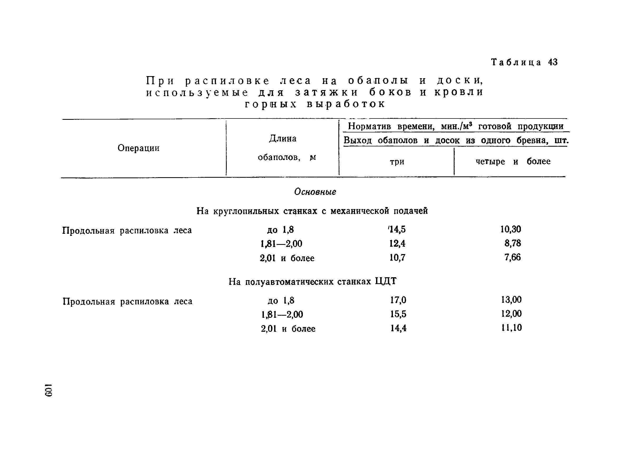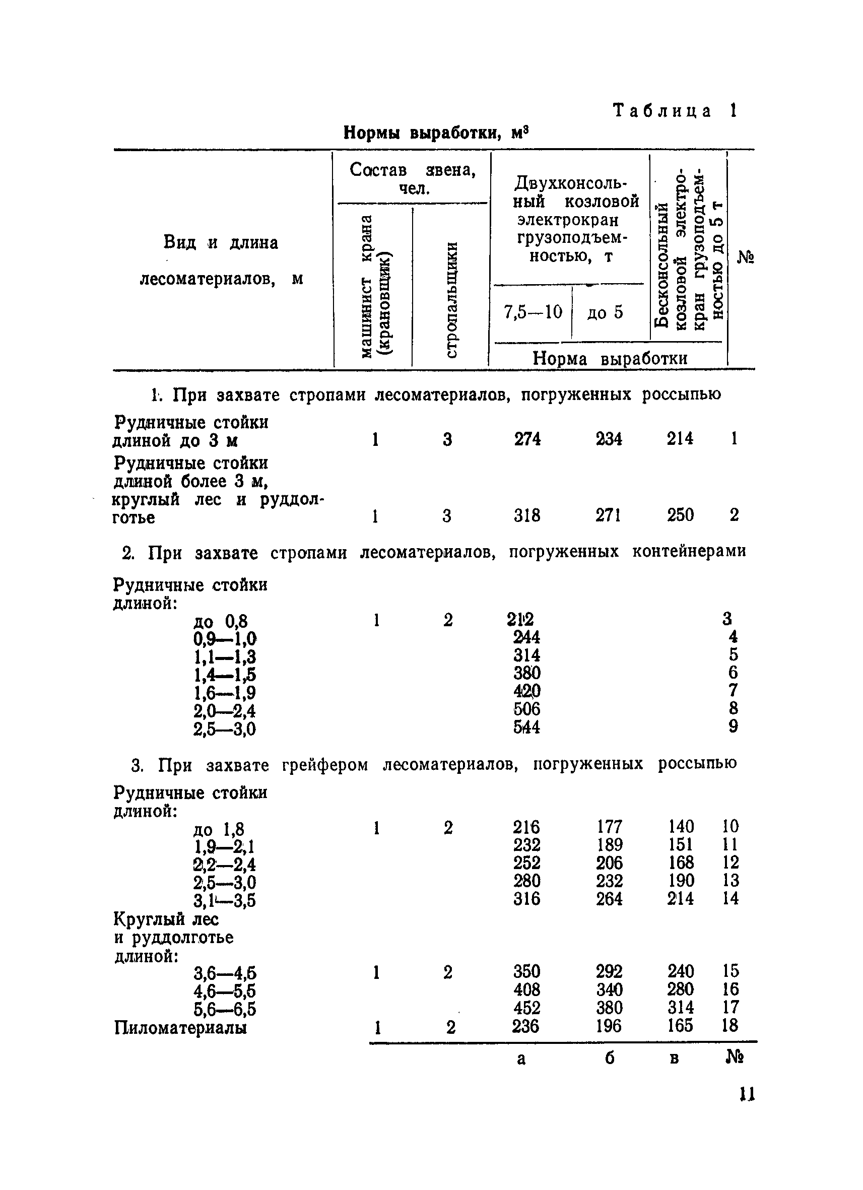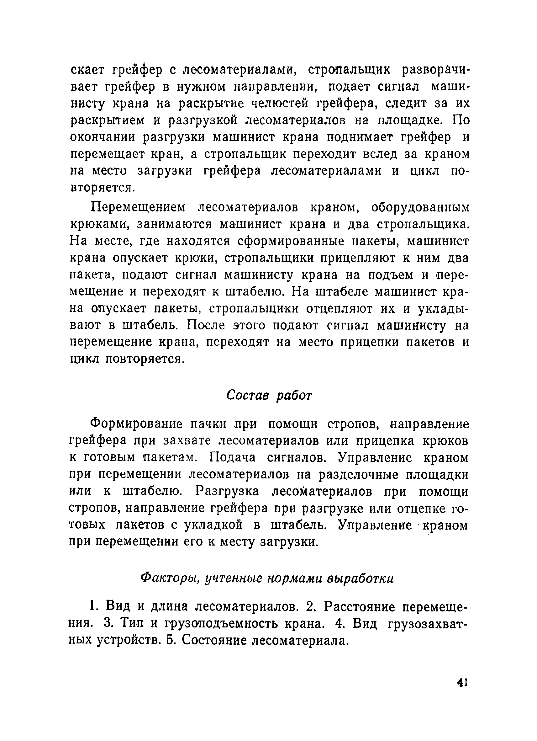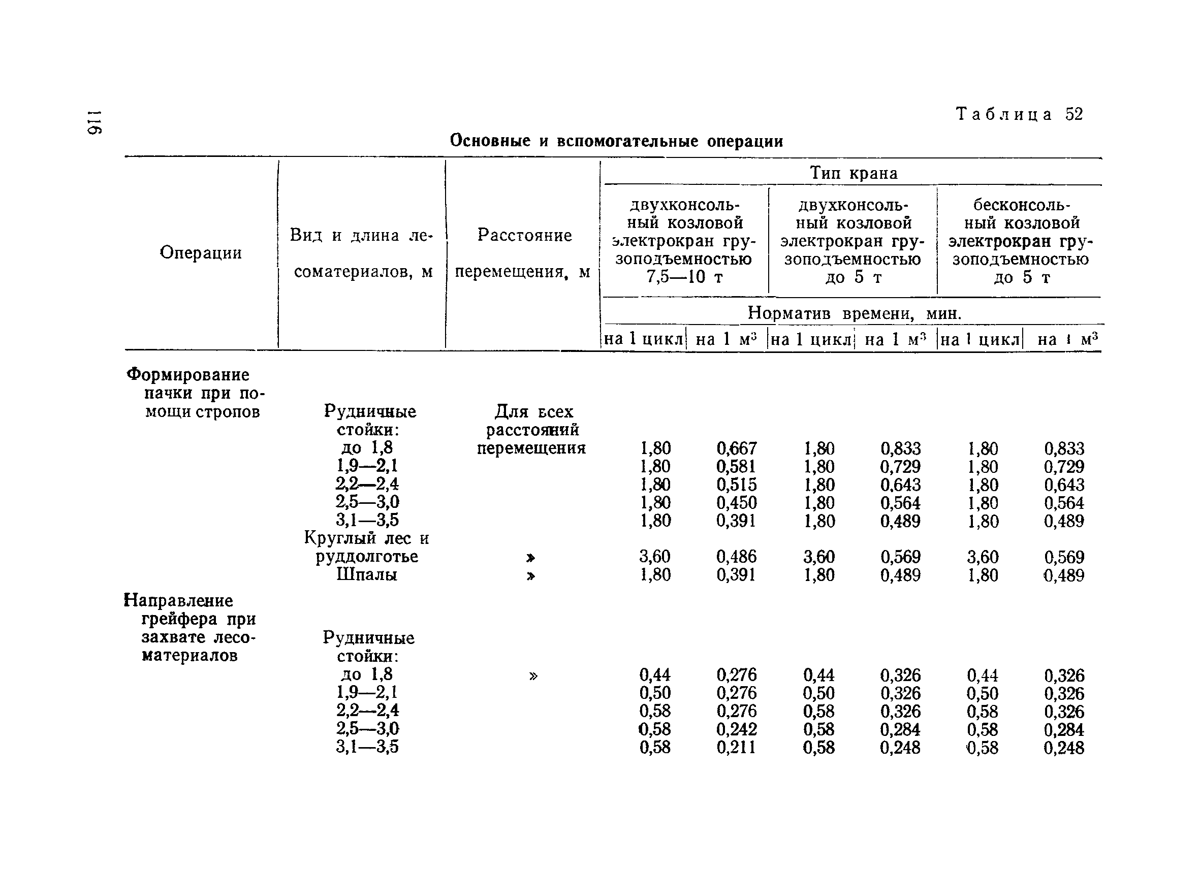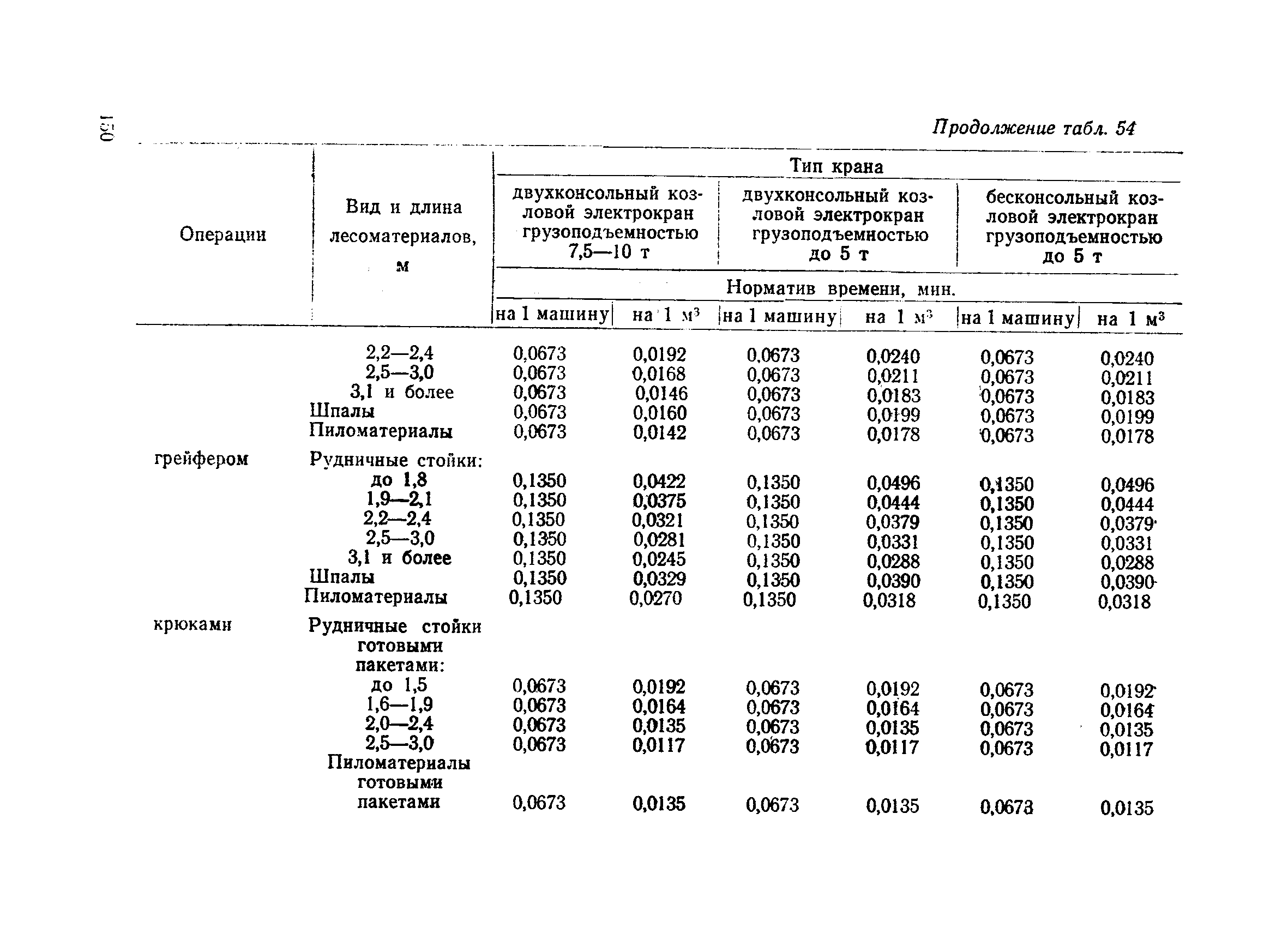Типовые нормы выработки на переработку лесоматериалов на лесных складах предприятий (организаций) угольной промышленности| Статус: | справочные материалы, мп, тпр | | Название рус.: | Типовые нормы выработки на переработку лесоматериалов на лесных складах предприятий (организаций) угольной промышленности | | Дата добавления в базу: | 01.01.2019 | | Дата актуализации: | 01.01.2021 | | Область применения: | Типовые нормы рекомендуются для использования в качестве основы при разработке Единых отраслевых и бассейновых норм выработки, а также для применения на предприятиях и в организациях как местных технически обоснованных норм после утверждения их руководителем по согласованию с соответствующим комитетом профсоюза и нормативно-исследовательской станцией комбината (треста). Материалы сборника могут быть использованы научно-исследовательскими и проектными организациями, изучающими вопросы организации и нормирования труда | | Оглавление: | Порядок применения типовых норм Общая часть Раздел I. Разгрузочные работы § 1. Выгрузка лесоматериалов кранами из железнодорожного подвижного состава § 2. Выгрузка лесоматериалов из железнодорожного подвижного состава вручную или с применением простейших приспособлений Раздел II. Механизированное лесопиление и разделка леса § 3. Распиловка леса па лесопильных рамах § 4. Разборка и установка поставов рамных пил § 5. Продольная распиловка леса на круглопильных станках § 6. Заготовка рудничных стоек на круглопильных станках § 7. Заготовка рудничных стоек ручными электро- или бензопилами § 8. Поперечная распиловка пиломатериалов (досок, обаполов, затяжек, распилов, брусьев, шпал) на круглопильных станках Раздел III. Транспортно-перевалочные и вспомогательные работы § 9. Перемещение лесоматериалов кранами по территории склада § 10. Погрузка лесоматериалов кранами на автомашины (тракторные прицепы) § 11. Погрузка лесоматериалов на автомашины (тракторные прицепы) и выгрузка их вручную или с применением простейших приспособлений § 12. Перемещение леса автопогрузчиками § 13. Сортировка и перемещение круглого леса лебедками или тракторами § 14. Механизированное пакетирование рудничных стоек § 15. Сортировка незаштабелированных лесоматериалов вручную с формированием пакетов или с укладкой в контейнеры § 16. Погрузка лесоматериалов в вагонетки или на площадки немеханизированным способом § 17. Доставка лесоматериалов в вагонетках или на площадках немеханизированным способом § 18. Доставка лесоматериалов в вагонетках или на площадках лебедками § 19. Доставка лесоматериалов конвейерами § 20. Штабелировка круглого леса и рудничного долготья лебедками Раздел IV. Прочие работы § 21. Окорка рудничных стоек на механическом станке § 22. Окорка рудничных стоек вручную § 23. Пропитка пиломатериалов антисептиками § 24. Заточка рамных пил на суппортном станке ТчПА-3 § 25. Нарезка, заточка круглых, рамных и цепных пил на наждачном станке. Развод зубьев и правка пил § 26. Разные работы на лесном складе § 27. Вывозка отходов и мусора Раздел V. Расчетные нормативы времени по операциям или группам операций рабочих процессов Выгрузка лесоматериалов кранами из железнодорожного подвижного состава Выгрузка лесоматериалов из железнодорожного подвижного состава вручную или с применением простейших приспособлений Распиловка леса на лесопильны