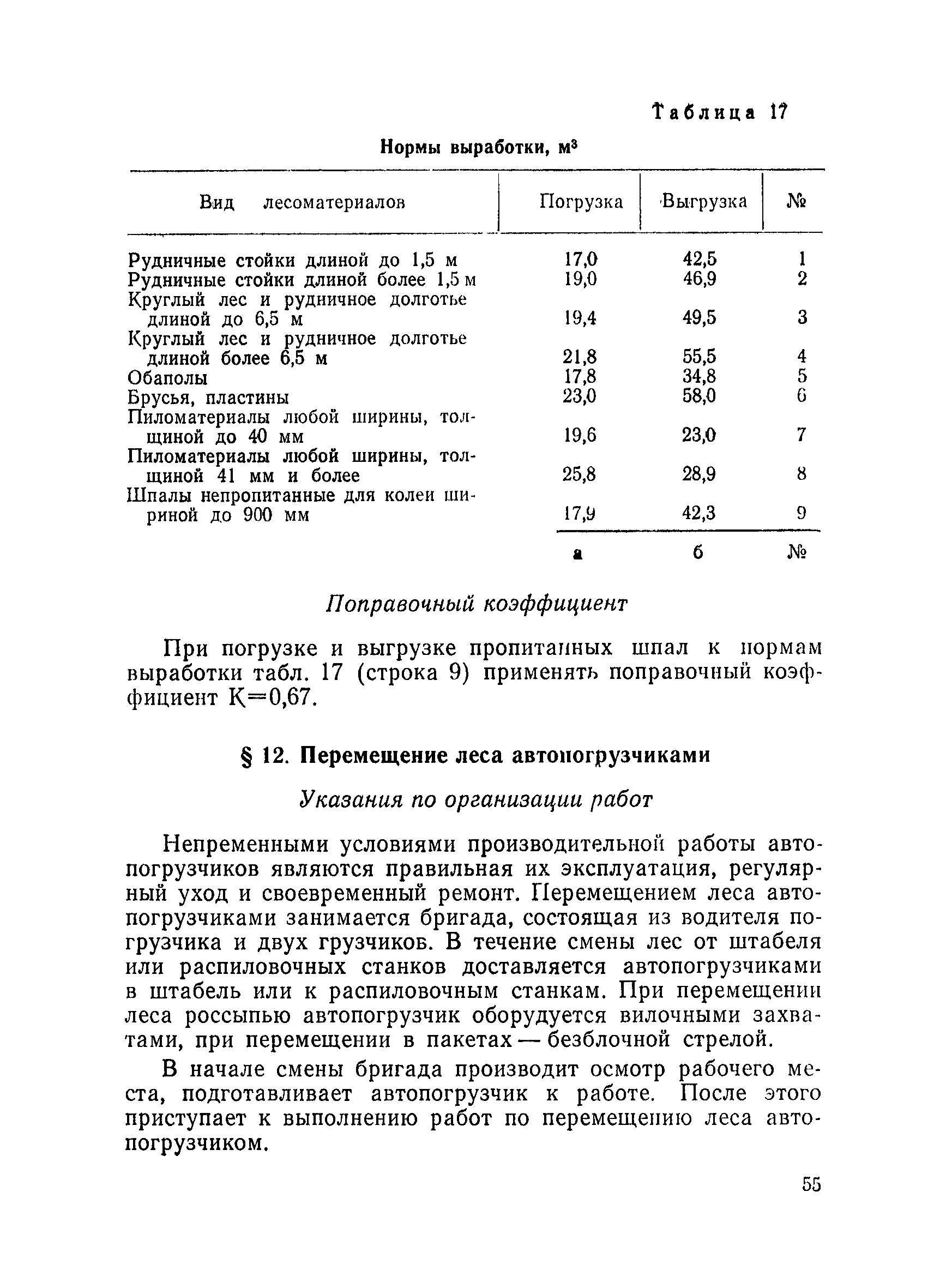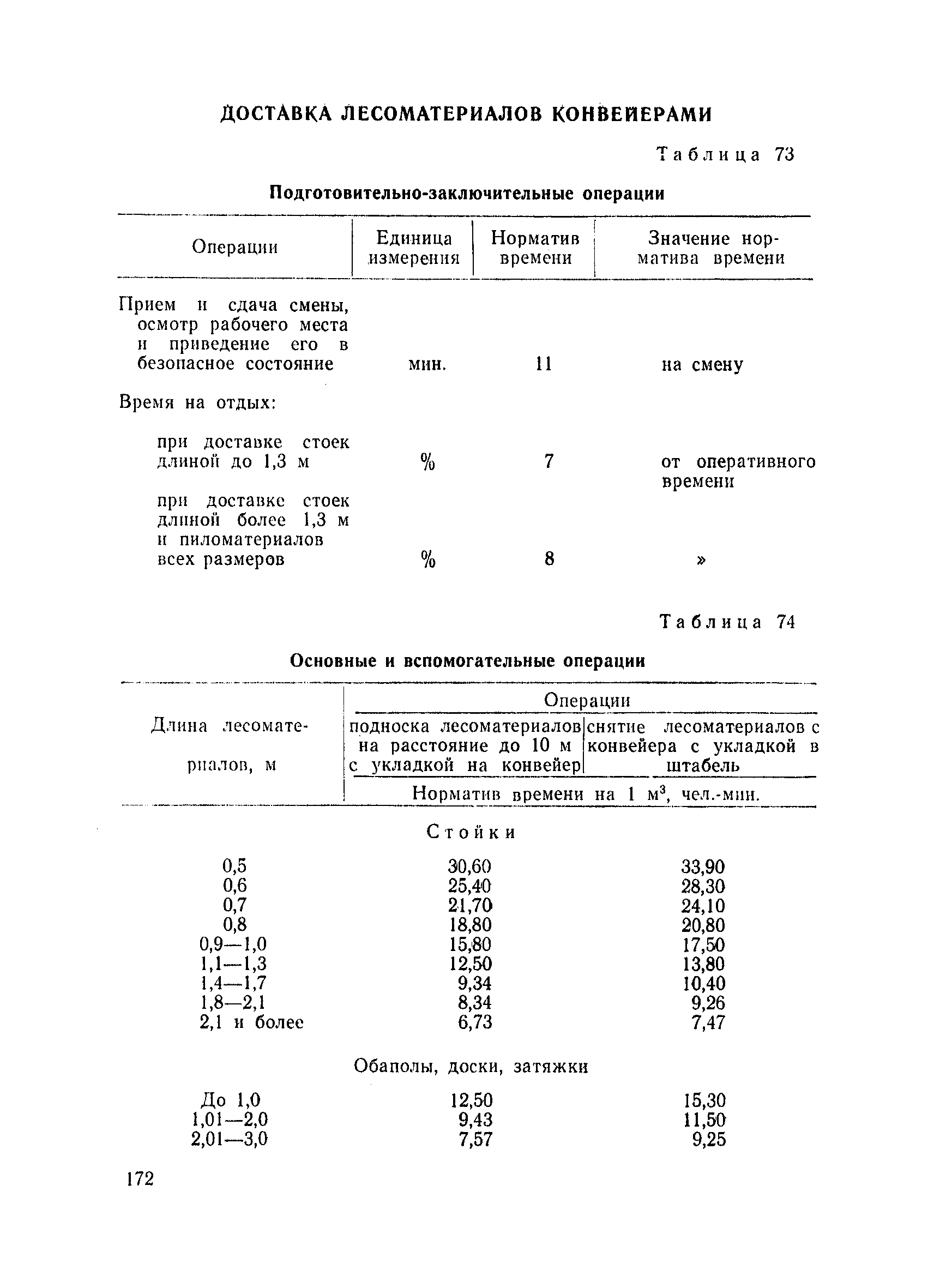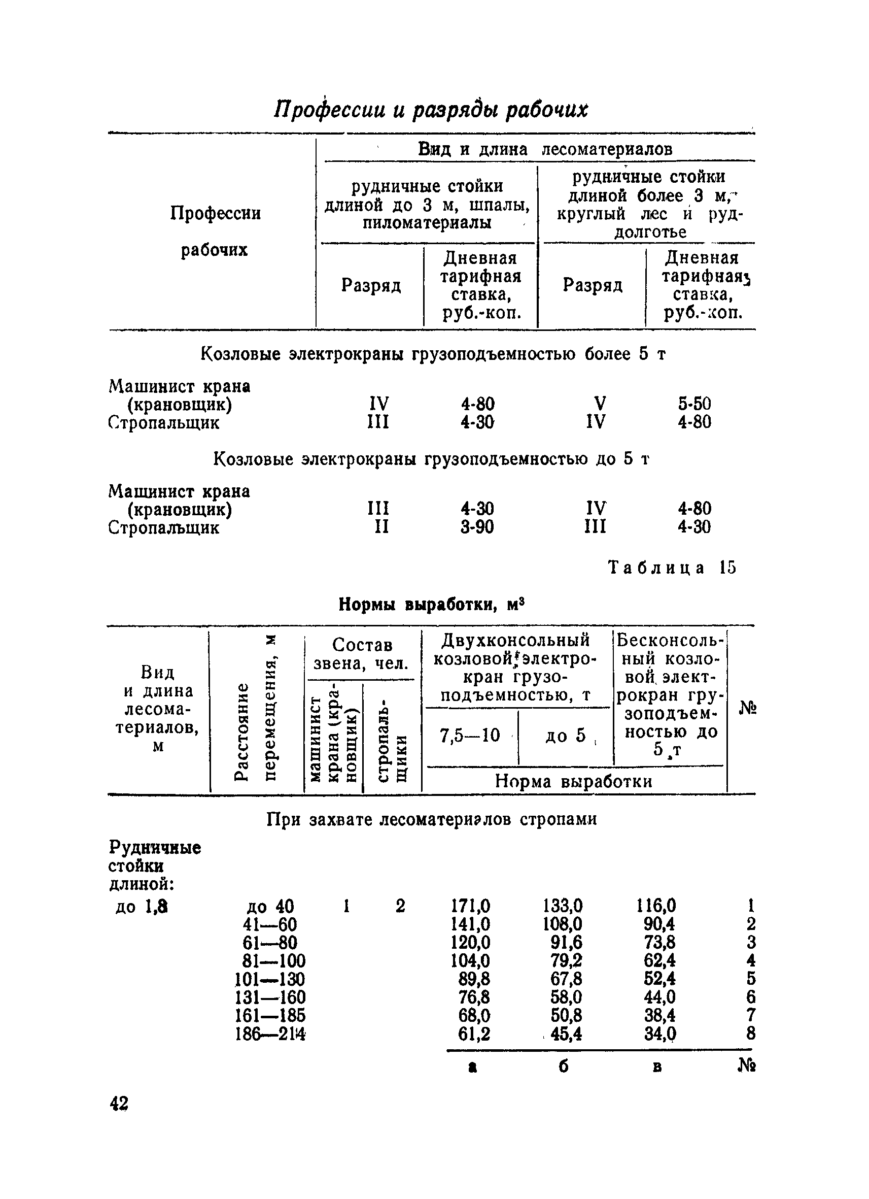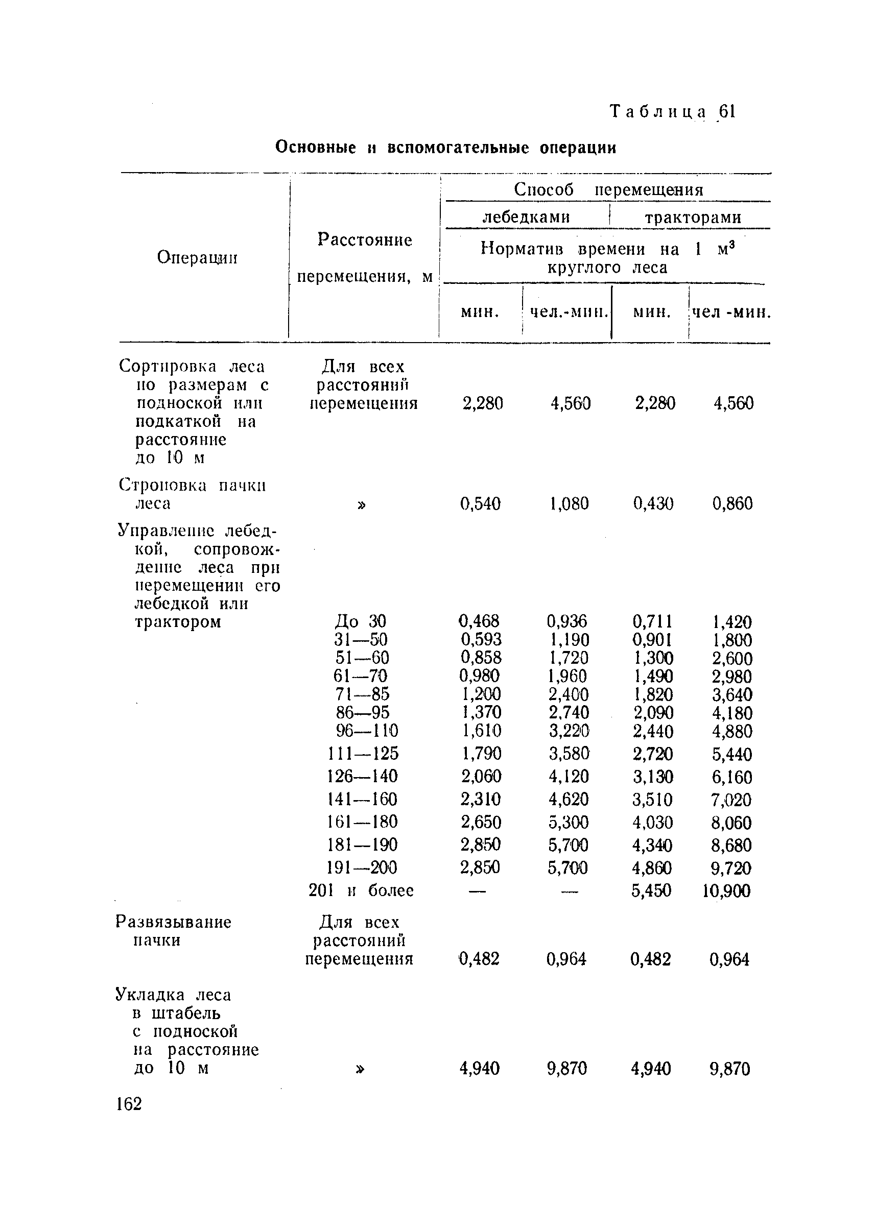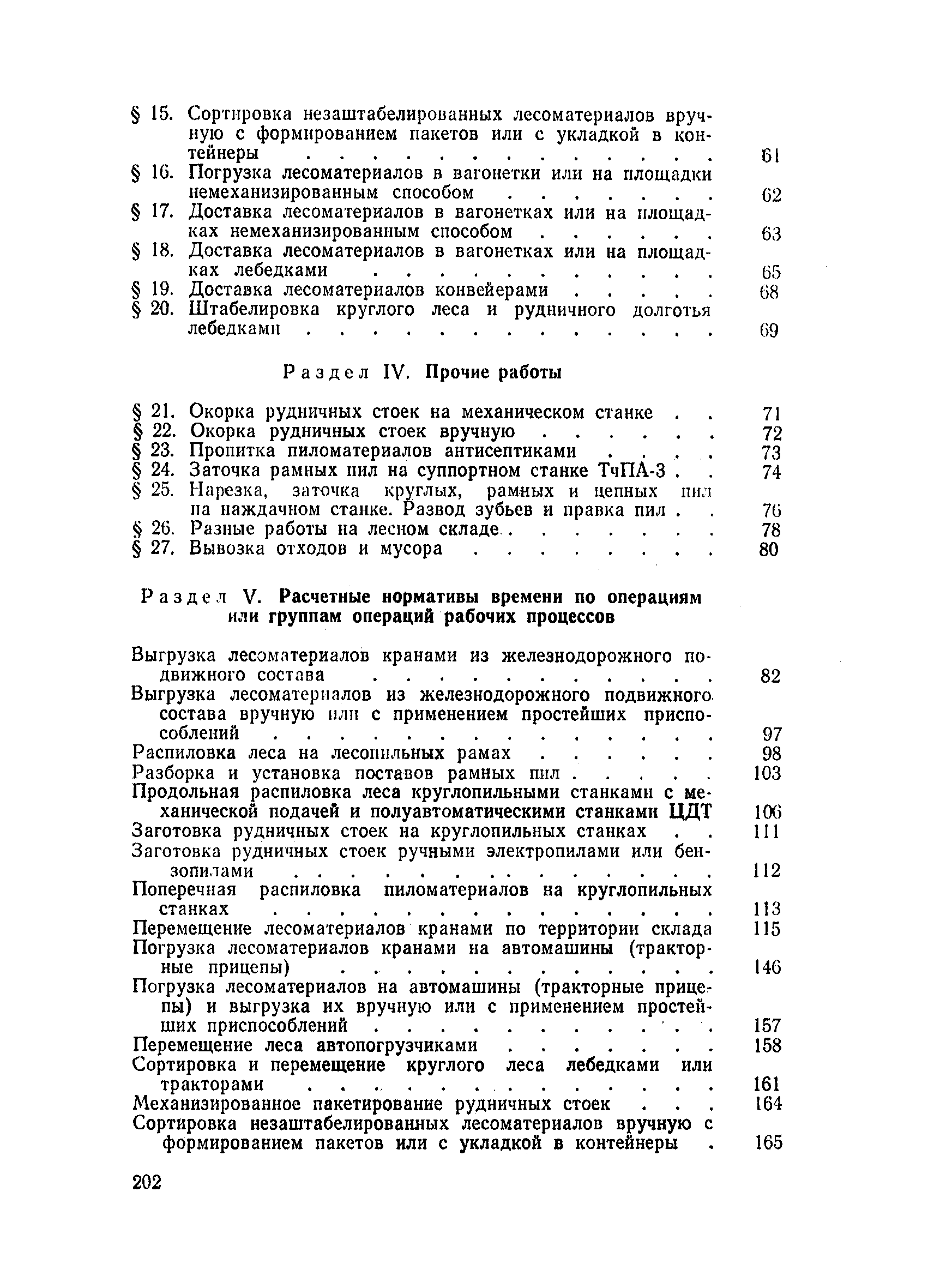 Типовые нормы выработки на переработку лесоматериалов на лесных складах предприятий (организаций) угольной промышленности| Статус: | справочные материалы, мп, тпр | | Название рус.: | Типовые нормы выработки на переработку лесоматериалов на лесных складах предприятий (организаций) угольной промышленности | | Дата добавления в базу: | 01.01.2019 | | Дата актуализации: | 01.01.2021 | | Область применения: | Типовые нормы рекомендуются для использования в качестве основы при разработке Единых отраслевых и бассейновых норм выработки, а также для применения на предприятиях и в организациях как местных технически обоснованных норм после утверждения их руководителем по согласованию с соответствующим комитетом профсоюза и нормативно-исследовательской станцией комбината (треста). Материалы сборника могут быть использованы научно-исследовательскими и проектными организациями, изучающими вопросы организации и нормирования труда | | Оглавление: | Порядок применения типовых норм Общая часть Раздел I. Разгрузочные работы § 1. Выгрузка лесоматериалов кранами из железнодорожного подвижного состава § 2. Выгрузка лесоматериалов из железнодорожного подвижного состава вручную или с применением простейших приспособлений Раздел II. Механизированное лесопиление и разделка леса § 3. Распиловка леса па лесопильных рамах § 4. Разборка и установка поставов рамных пил § 5. Продольная распиловка леса на круглопильных станках § 6. Заготовка рудничных стоек на круглопильных станках § 7. Заготовка рудничных стоек ручными электро- или бензопилами § 8. Поперечная распиловка пиломатериалов (досок, обаполов, затяжек, распилов, брусьев, шпал) на круглопильных станках Раздел III. Транспортно-перевалочные и вспомогательные работы § 9. Перемещение лесоматериалов кранами по территории склада § 10. Погрузка лесоматериалов кранами на автомашины (тракторные прицепы) § 11. Погрузка лесоматериалов на автомашины (тракторные прицепы) и выгрузка их вручную или с применением простейших приспособлений § 12. Перемещение леса автопогрузчиками § 13. Сортировка и перемещение круглого леса лебедками или тракторами § 14. Механизированное пакетирование рудничных стоек § 15. Сортировка незаштабелированных лесоматериалов вручную с формированием пакетов или с укладкой в контейнеры § 16. Погрузка лесоматериалов в вагонетки или на площадки немеханизированным способом § 17. Доставка лесоматериалов в вагонетках или на площадках немеханизированным способом § 18. Доставка лесоматериалов в вагонетках или на площадках лебедками § 19. Доставка лесоматериалов конвейерами § 20. Штабелировка круглого леса и рудничного долготья лебедками Раздел IV. Прочие работы § 21. Окорка рудничных стоек на механическом станке § 22. Окорка рудничных стоек вручную § 23. Пропитка пиломатериалов антисептиками § 24. Заточка рамных пил на суппортном станке ТчПА-3 § 25. Нарезка, заточка круглых, рамных и цепных пил на наждачном станке. Развод зубьев и правка пил § 26. Разные работы на лесном складе § 27. Вывозка отходов и мусора Раздел V. Расчетные нормативы времени по операциям или группам операций рабочих процессов Выгрузка лесоматериалов кранами из железнодорожного подвижного состава Выгрузка лесоматериалов из железнодорожного подвижного состава вручную или с применением простейших приспособлений Распиловка леса на лесопильны