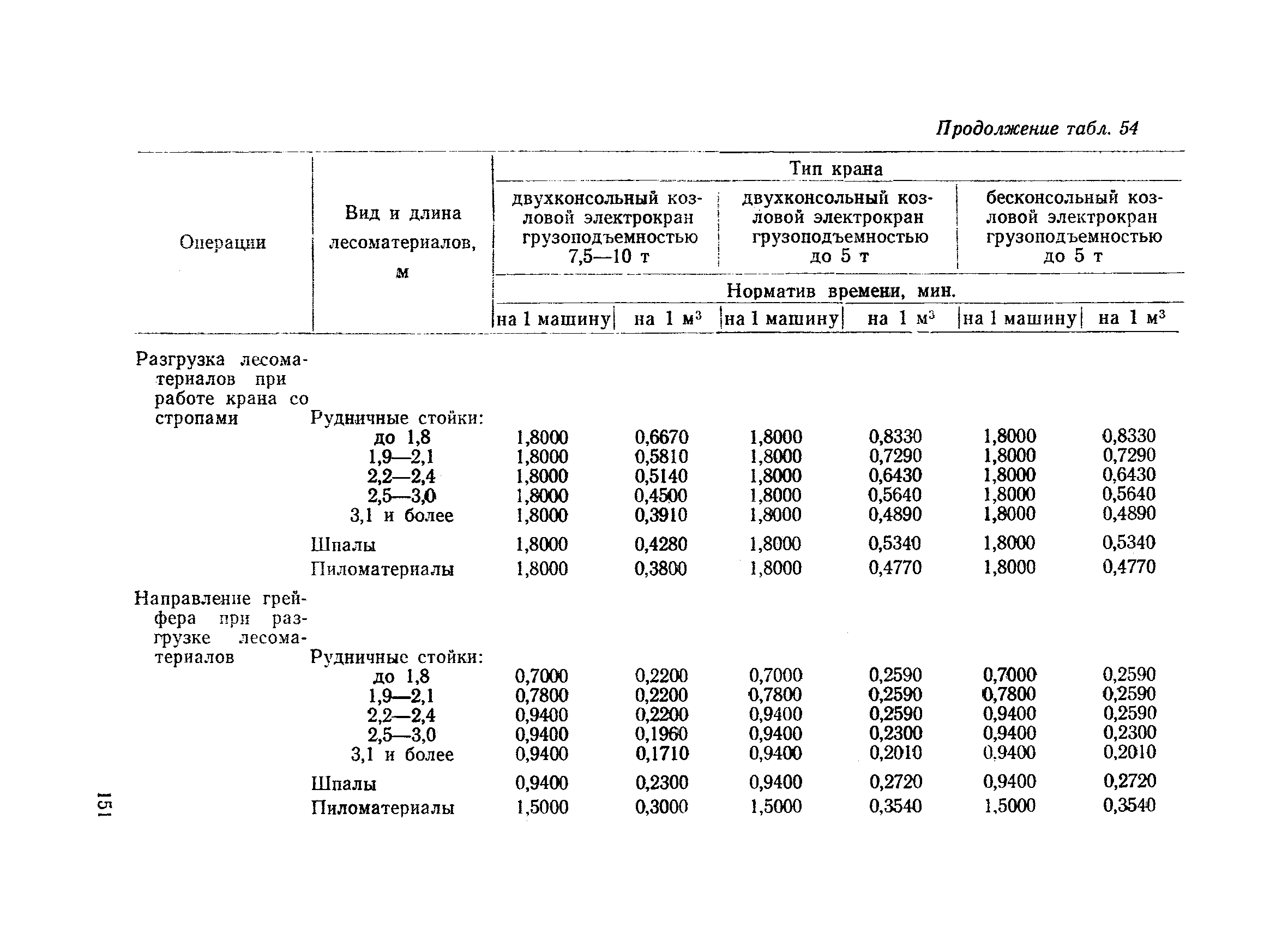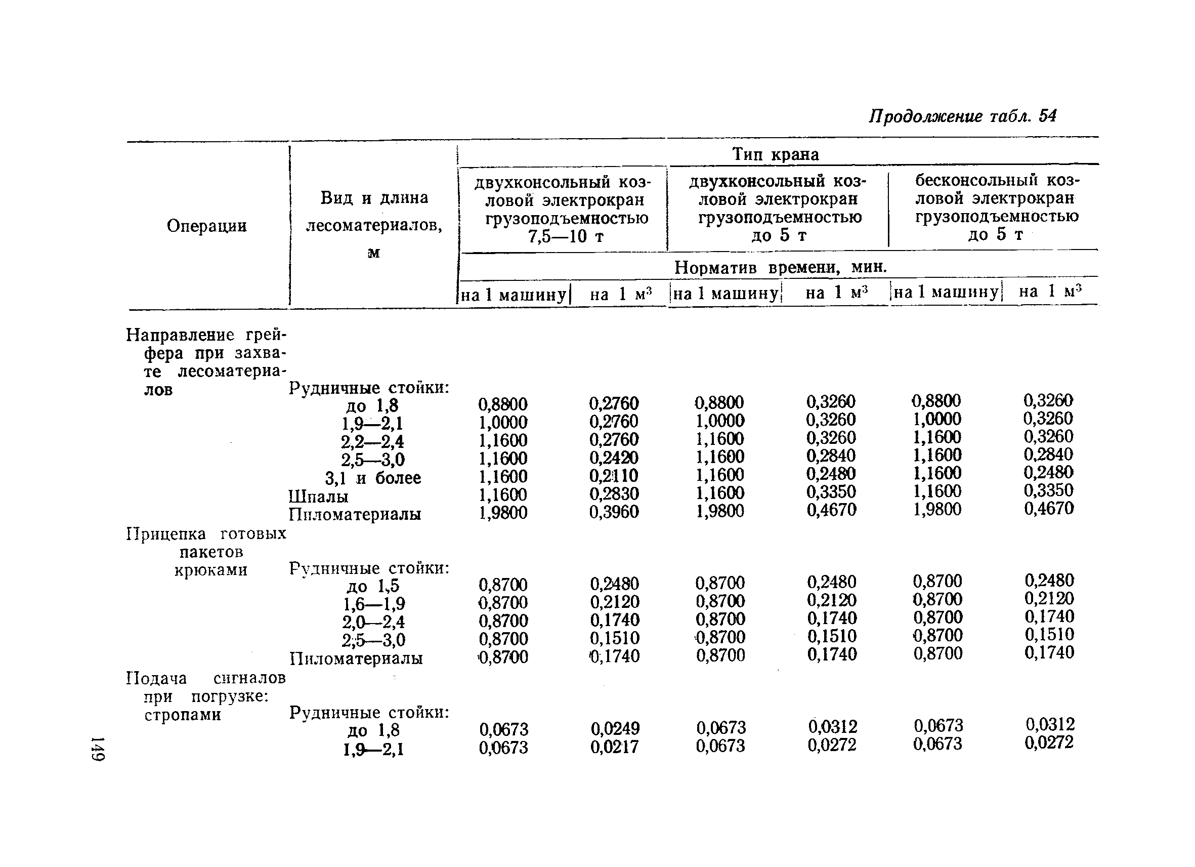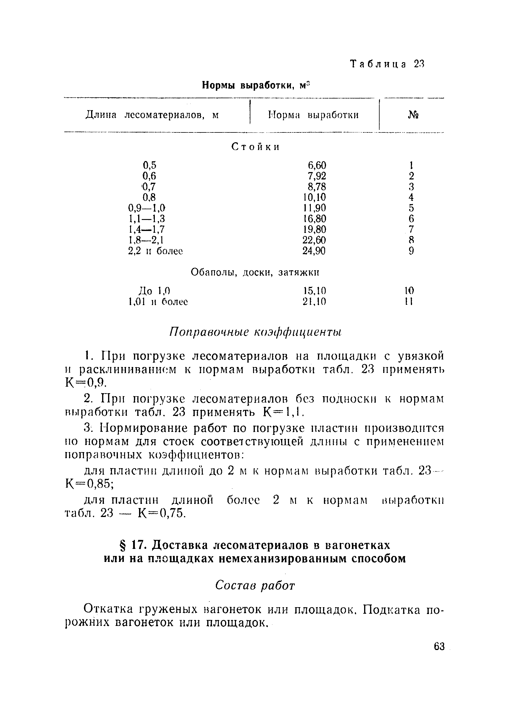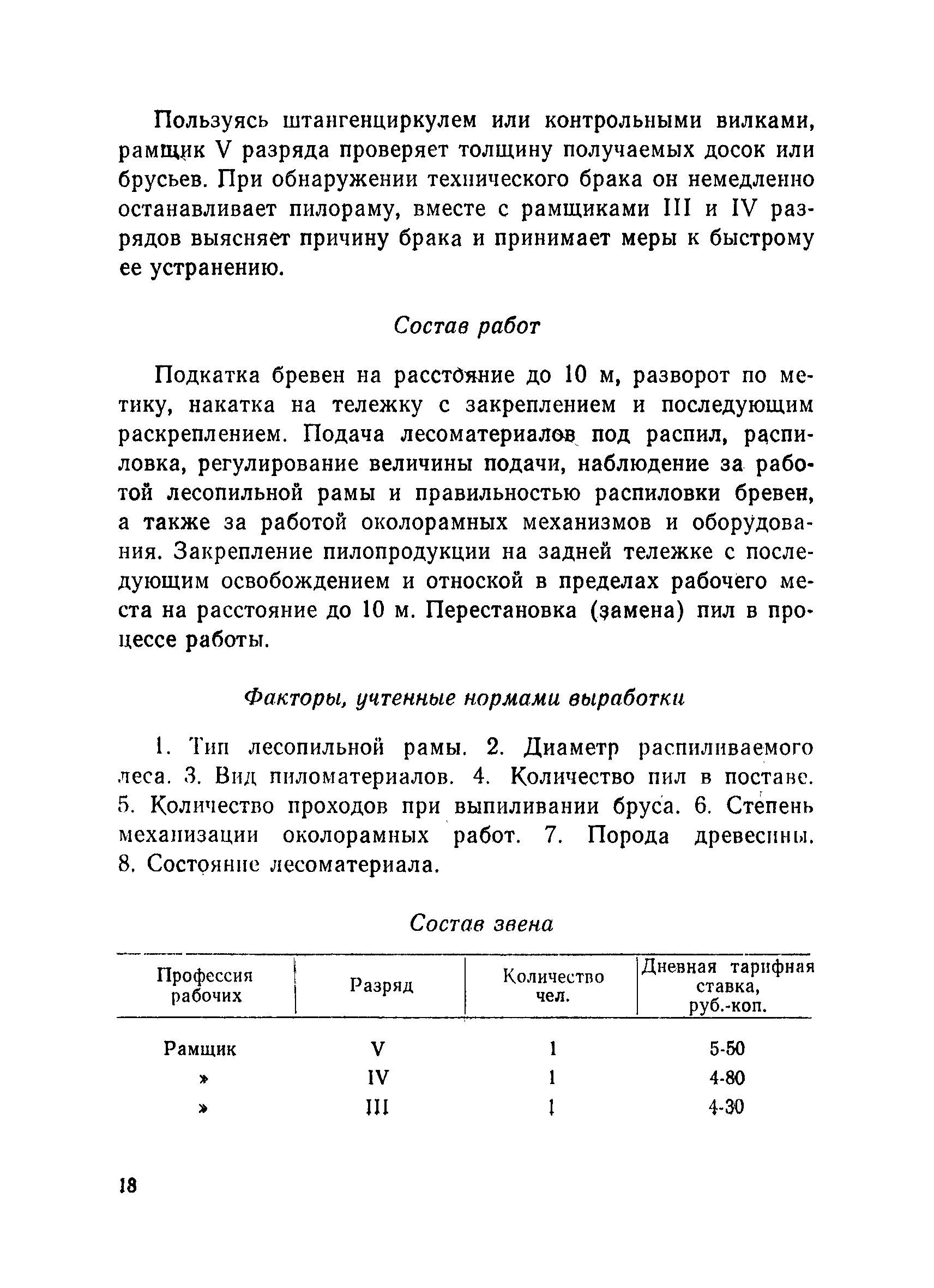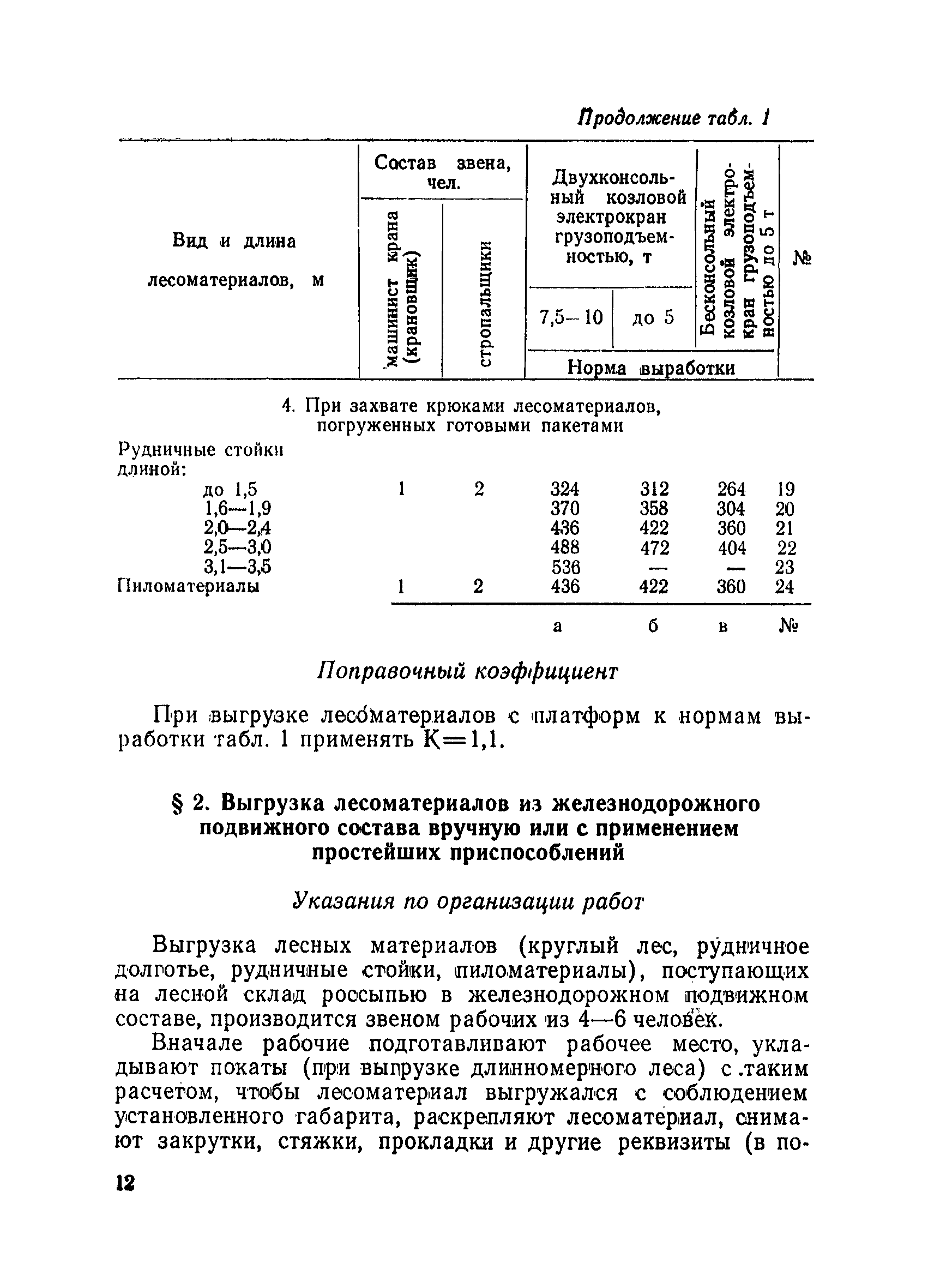 Типовые нормы выработки на переработку лесоматериалов на лесных складах предприятий (организаций) угольной промышленности| Статус: | справочные материалы, мп, тпр | | Название рус.: | Типовые нормы выработки на переработку лесоматериалов на лесных складах предприятий (организаций) угольной промышленности | | Дата добавления в базу: | 01.01.2019 | | Дата актуализации: | 01.01.2021 | | Область применения: | Типовые нормы рекомендуются для использования в качестве основы при разработке Единых отраслевых и бассейновых норм выработки, а также для применения на предприятиях и в организациях как местных технически обоснованных норм после утверждения их руководителем по согласованию с соответствующим комитетом профсоюза и нормативно-исследовательской станцией комбината (треста). Материалы сборника могут быть использованы научно-исследовательскими и проектными организациями, изучающими вопросы организации и нормирования труда | | Оглавление: | Порядок применения типовых норм Общая часть Раздел I. Разгрузочные работы § 1. Выгрузка лесоматериалов кранами из железнодорожного подвижного состава § 2. Выгрузка лесоматериалов из железнодорожного подвижного состава вручную или с применением простейших приспособлений Раздел II. Механизированное лесопиление и разделка леса § 3. Распиловка леса па лесопильных рамах § 4. Разборка и установка поставов рамных пил § 5. Продольная распиловка леса на круглопильных станках § 6. Заготовка рудничных стоек на круглопильных станках § 7. Заготовка рудничных стоек ручными электро- или бензопилами § 8. Поперечная распиловка пиломатериалов (досок, обаполов, затяжек, распилов, брусьев, шпал) на круглопильных станках Раздел III. Транспортно-перевалочные и вспомогательные работы § 9. Перемещение лесоматериалов кранами по территории склада § 10. Погрузка лесоматериалов кранами на автомашины (тракторные прицепы) § 11. Погрузка лесоматериалов на автомашины (тракторные прицепы) и выгрузка их вручную или с применением простейших приспособлений § 12. Перемещение леса автопогрузчиками § 13. Сортировка и перемещение круглого леса лебедками или тракторами § 14. Механизированное пакетирование рудничных стоек § 15. Сортировка незаштабелированных лесоматериалов вручную с формированием пакетов или с укладкой в контейнеры § 16. Погрузка лесоматериалов в вагонетки или на площадки немеханизированным способом § 17. Доставка лесоматериалов в вагонетках или на площадках немеханизированным способом § 18. Доставка лесоматериалов в вагонетках или на площадках лебедками § 19. Доставка лесоматериалов конвейерами § 20. Штабелировка круглого леса и рудничного долготья лебедками Раздел IV. Прочие работы § 21. Окорка рудничных стоек на механическом станке § 22. Окорка рудничных стоек вручную § 23. Пропитка пиломатериалов антисептиками § 24. Заточка рамных пил на суппортном станке ТчПА-3 § 25. Нарезка, заточка круглых, рамных и цепных пил на наждачном станке. Развод зубьев и правка пил § 26. Разные работы на лесном складе § 27. Вывозка отходов и мусора Раздел V. Расчетные нормативы времени по операциям или группам операций рабочих процессов Выгрузка лесоматериалов кранами из железнодорожного подвижного состава Выгрузка лесоматериалов из железнодорожного подвижного состава вручную или с применением простейших приспособлений Распиловка леса на лесопильны