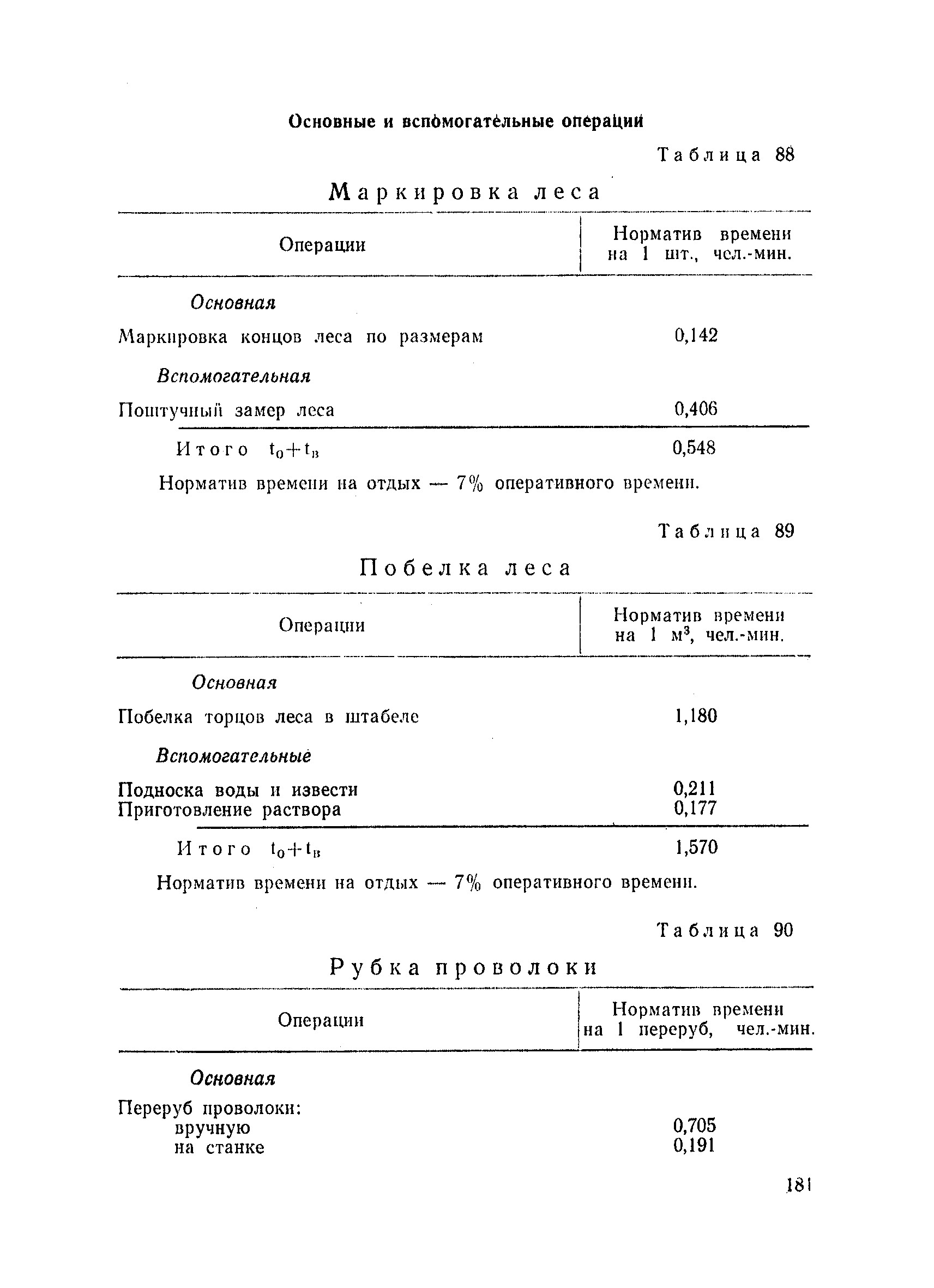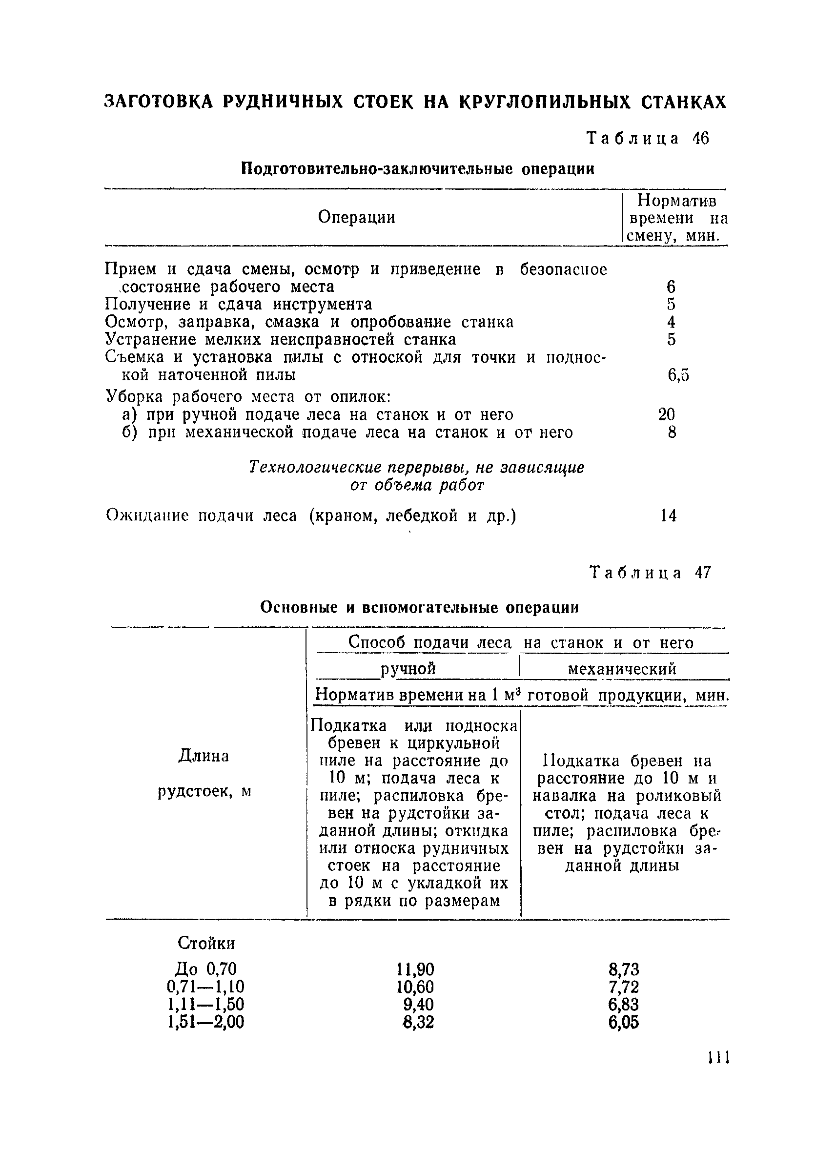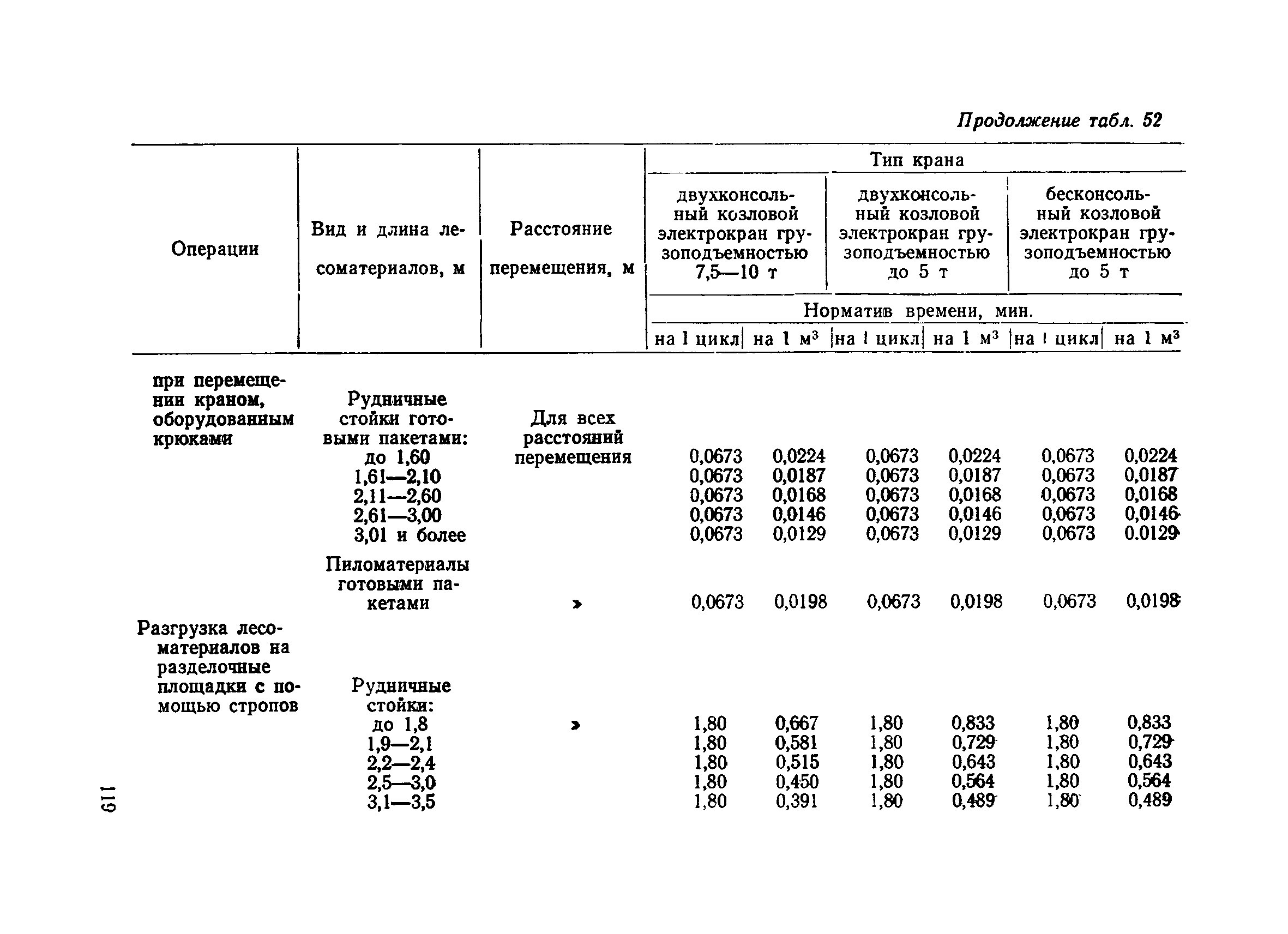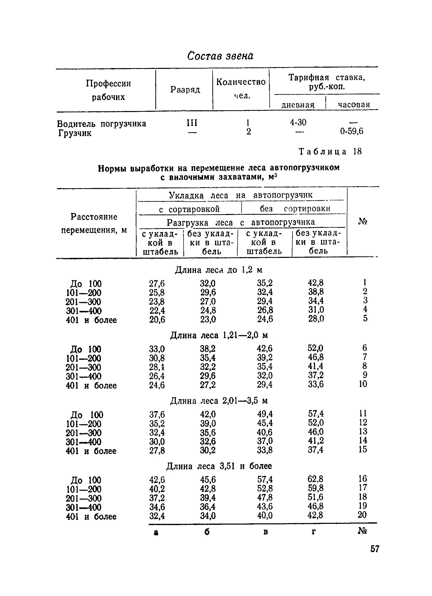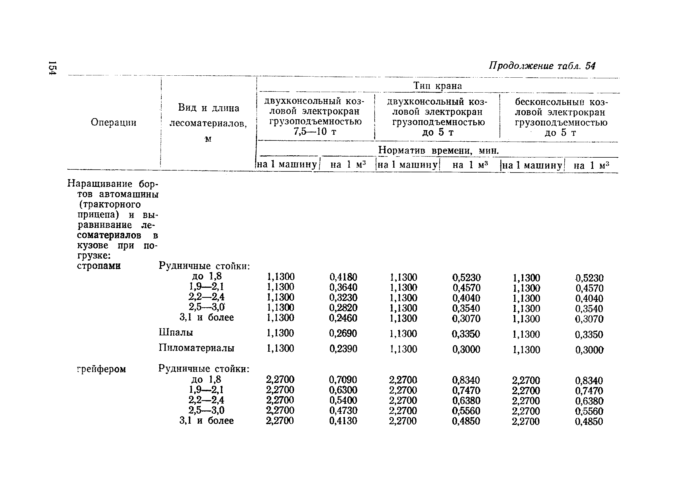 Типовые нормы выработки на переработку лесоматериалов на лесных складах предприятий (организаций) угольной промышленности| Статус: | справочные материалы, мп, тпр | | Название рус.: | Типовые нормы выработки на переработку лесоматериалов на лесных складах предприятий (организаций) угольной промышленности | | Дата добавления в базу: | 01.01.2019 | | Дата актуализации: | 01.01.2021 | | Область применения: | Типовые нормы рекомендуются для использования в качестве основы при разработке Единых отраслевых и бассейновых норм выработки, а также для применения на предприятиях и в организациях как местных технически обоснованных норм после утверждения их руководителем по согласованию с соответствующим комитетом профсоюза и нормативно-исследовательской станцией комбината (треста). Материалы сборника могут быть использованы научно-исследовательскими и проектными организациями, изучающими вопросы организации и нормирования труда | | Оглавление: | Порядок применения типовых норм Общая часть Раздел I. Разгрузочные работы § 1. Выгрузка лесоматериалов кранами из железнодорожного подвижного состава § 2. Выгрузка лесоматериалов из железнодорожного подвижного состава вручную или с применением простейших приспособлений Раздел II. Механизированное лесопиление и разделка леса § 3. Распиловка леса па лесопильных рамах § 4. Разборка и установка поставов рамных пил § 5. Продольная распиловка леса на круглопильных станках § 6. Заготовка рудничных стоек на круглопильных станках § 7. Заготовка рудничных стоек ручными электро- или бензопилами § 8. Поперечная распиловка пиломатериалов (досок, обаполов, затяжек, распилов, брусьев, шпал) на круглопильных станках Раздел III. Транспортно-перевалочные и вспомогательные работы § 9. Перемещение лесоматериалов кранами по территории склада § 10. Погрузка лесоматериалов кранами на автомашины (тракторные прицепы) § 11. Погрузка лесоматериалов на автомашины (тракторные прицепы) и выгрузка их вручную или с применением простейших приспособлений § 12. Перемещение леса автопогрузчиками § 13. Сортировка и перемещение круглого леса лебедками или тракторами § 14. Механизированное пакетирование рудничных стоек § 15. Сортировка незаштабелированных лесоматериалов вручную с формированием пакетов или с укладкой в контейнеры § 16. Погрузка лесоматериалов в вагонетки или на площадки немеханизированным способом § 17. Доставка лесоматериалов в вагонетках или на площадках немеханизированным способом § 18. Доставка лесоматериалов в вагонетках или на площадках лебедками § 19. Доставка лесоматериалов конвейерами § 20. Штабелировка круглого леса и рудничного долготья лебедками Раздел IV. Прочие работы § 21. Окорка рудничных стоек на механическом станке § 22. Окорка рудничных стоек вручную § 23. Пропитка пиломатериалов антисептиками § 24. Заточка рамных пил на суппортном станке ТчПА-3 § 25. Нарезка, заточка круглых, рамных и цепных пил на наждачном станке. Развод зубьев и правка пил § 26. Разные работы на лесном складе § 27. Вывозка отходов и мусора Раздел V. Расчетные нормативы времени по операциям или группам операций рабочих процессов Выгрузка лесоматериалов кранами из железнодорожного подвижного состава Выгрузка лесоматериалов из железнодорожного подвижного состава вручную или с применением простейших приспособлений Распиловка леса на лесопильны