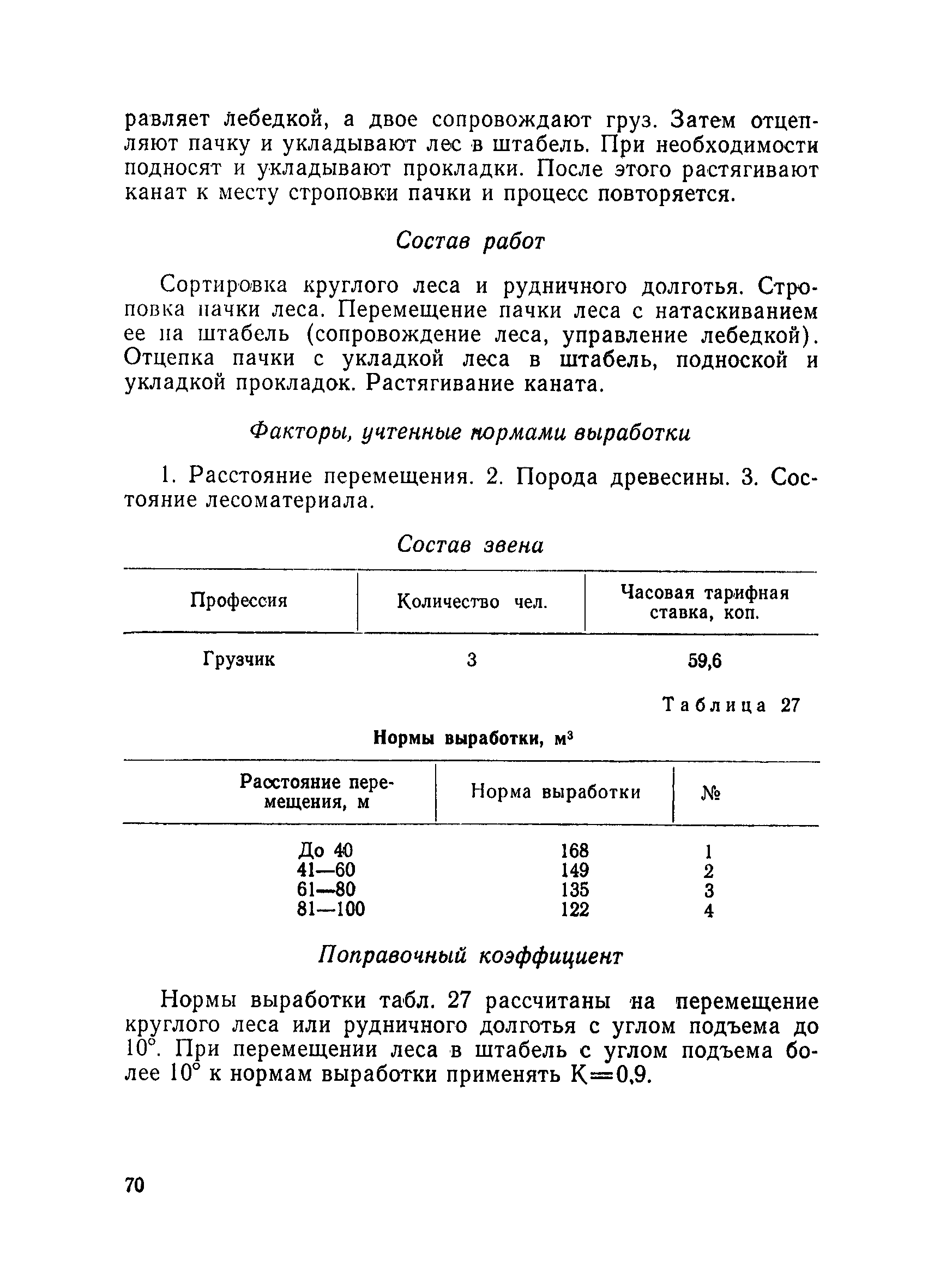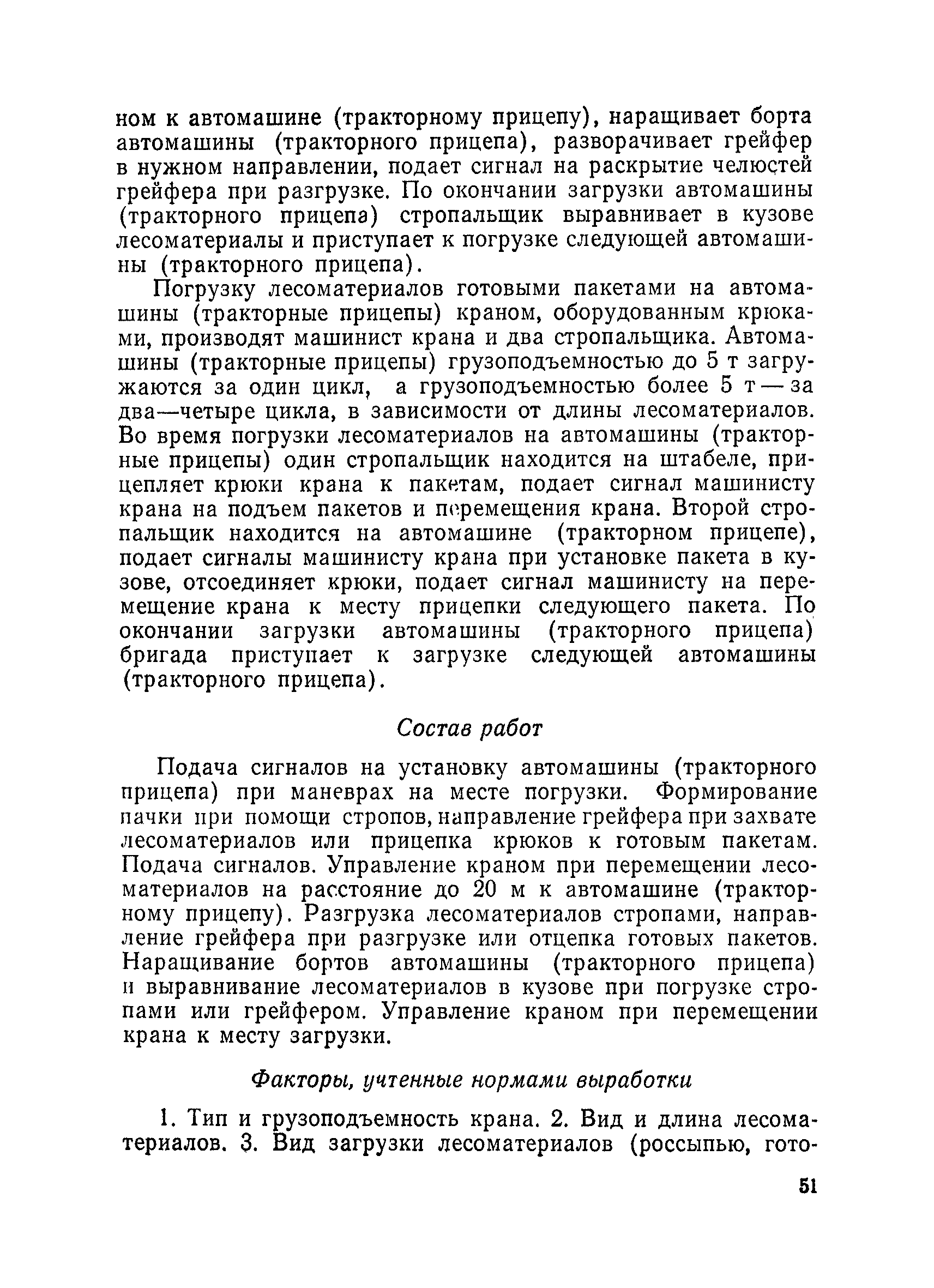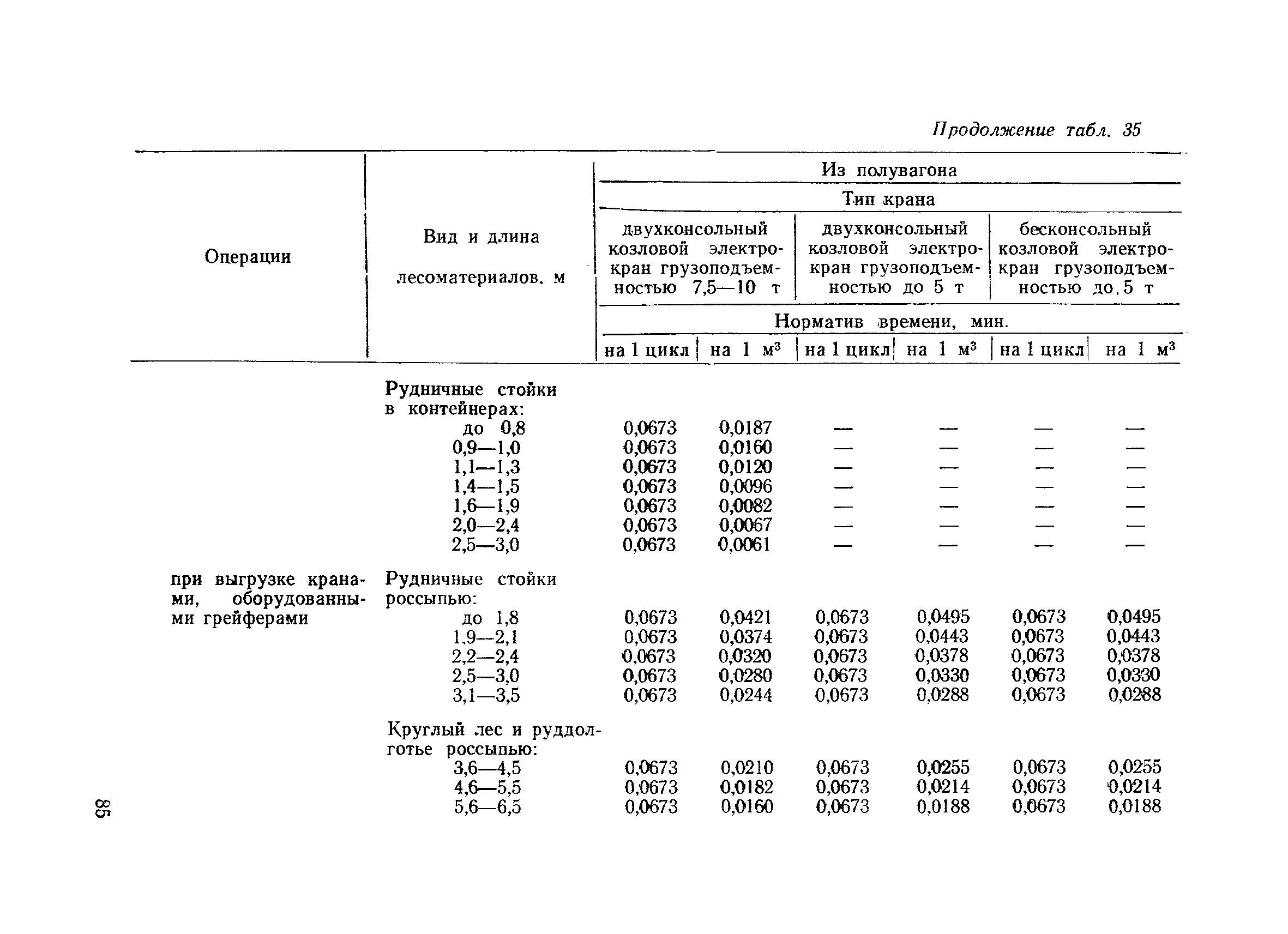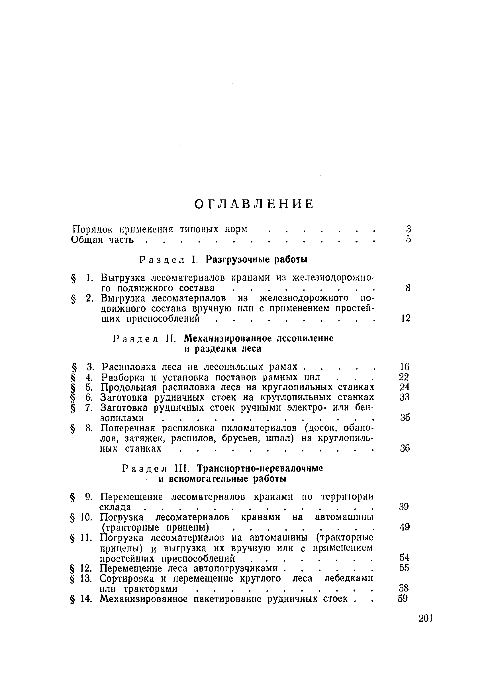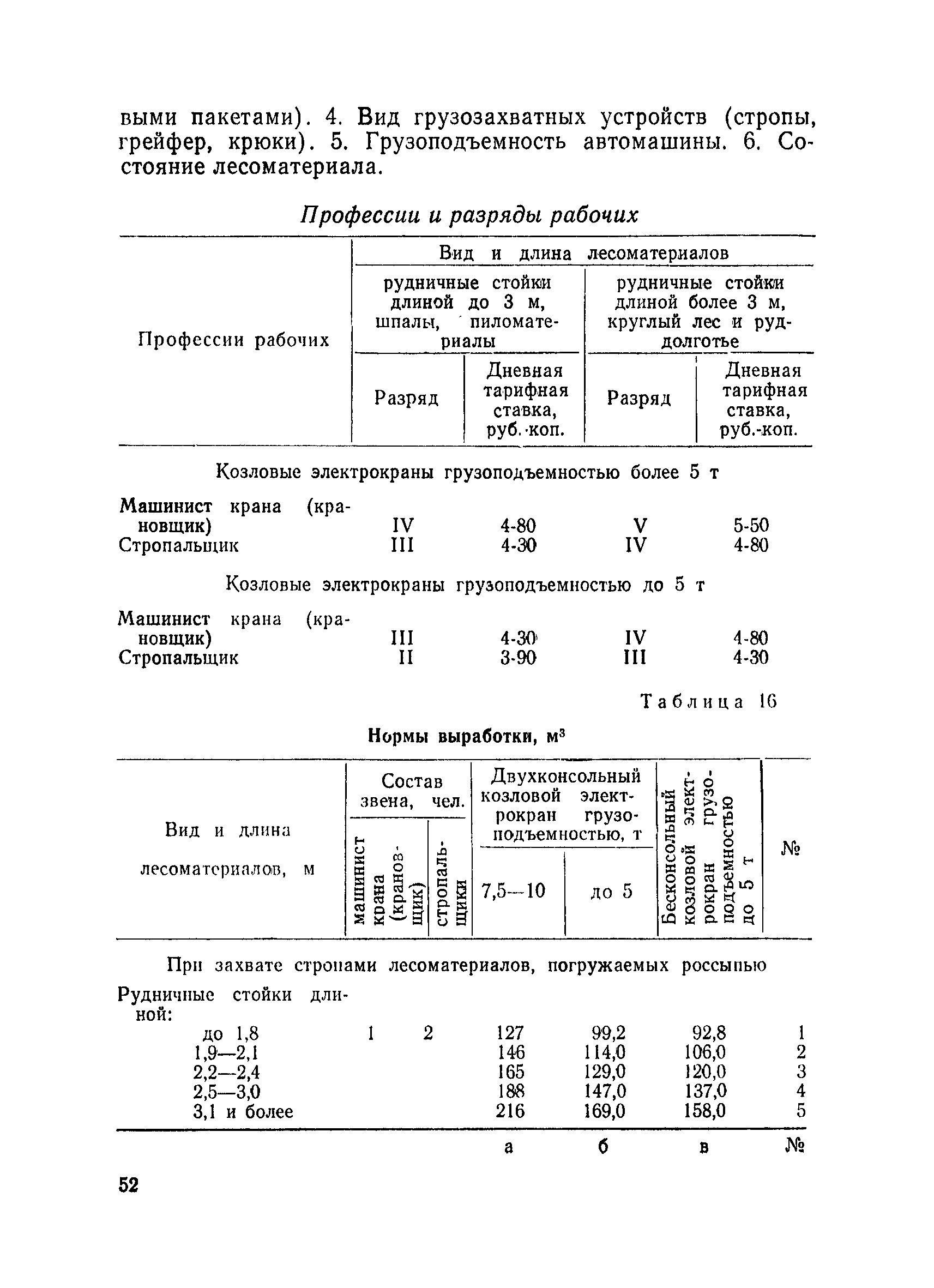 Типовые нормы выработки на переработку лесоматериалов на лесных складах предприятий (организаций) угольной промышленности| Статус: | справочные материалы, мп, тпр | | Название рус.: | Типовые нормы выработки на переработку лесоматериалов на лесных складах предприятий (организаций) угольной промышленности | | Дата добавления в базу: | 01.01.2019 | | Дата актуализации: | 01.01.2021 | | Область применения: | Типовые нормы рекомендуются для использования в качестве основы при разработке Единых отраслевых и бассейновых норм выработки, а также для применения на предприятиях и в организациях как местных технически обоснованных норм после утверждения их руководителем по согласованию с соответствующим комитетом профсоюза и нормативно-исследовательской станцией комбината (треста). Материалы сборника могут быть использованы научно-исследовательскими и проектными организациями, изучающими вопросы организации и нормирования труда | | Оглавление: | Порядок применения типовых норм Общая часть Раздел I. Разгрузочные работы § 1. Выгрузка лесоматериалов кранами из железнодорожного подвижного состава § 2. Выгрузка лесоматериалов из железнодорожного подвижного состава вручную или с применением простейших приспособлений Раздел II. Механизированное лесопиление и разделка леса § 3. Распиловка леса па лесопильных рамах § 4. Разборка и установка поставов рамных пил § 5. Продольная распиловка леса на круглопильных станках § 6. Заготовка рудничных стоек на круглопильных станках § 7. Заготовка рудничных стоек ручными электро- или бензопилами § 8. Поперечная распиловка пиломатериалов (досок, обаполов, затяжек, распилов, брусьев, шпал) на круглопильных станках Раздел III. Транспортно-перевалочные и вспомогательные работы § 9. Перемещение лесоматериалов кранами по территории склада § 10. Погрузка лесоматериалов кранами на автомашины (тракторные прицепы) § 11. Погрузка лесоматериалов на автомашины (тракторные прицепы) и выгрузка их вручную или с применением простейших приспособлений § 12. Перемещение леса автопогрузчиками § 13. Сортировка и перемещение круглого леса лебедками или тракторами § 14. Механизированное пакетирование рудничных стоек § 15. Сортировка незаштабелированных лесоматериалов вручную с формированием пакетов или с укладкой в контейнеры § 16. Погрузка лесоматериалов в вагонетки или на площадки немеханизированным способом § 17. Доставка лесоматериалов в вагонетках или на площадках немеханизированным способом § 18. Доставка лесоматериалов в вагонетках или на площадках лебедками § 19. Доставка лесоматериалов конвейерами § 20. Штабелировка круглого леса и рудничного долготья лебедками Раздел IV. Прочие работы § 21. Окорка рудничных стоек на механическом станке § 22. Окорка рудничных стоек вручную § 23. Пропитка пиломатериалов антисептиками § 24. Заточка рамных пил на суппортном станке ТчПА-3 § 25. Нарезка, заточка круглых, рамных и цепных пил на наждачном станке. Развод зубьев и правка пил § 26. Разные работы на лесном складе § 27. Вывозка отходов и мусора Раздел V. Расчетные нормативы времени по операциям или группам операций рабочих процессов Выгрузка лесоматериалов кранами из железнодорожного подвижного состава Выгрузка лесоматериалов из железнодорожного подвижного состава вручную или с применением простейших приспособлений Распиловка леса на лесопильны