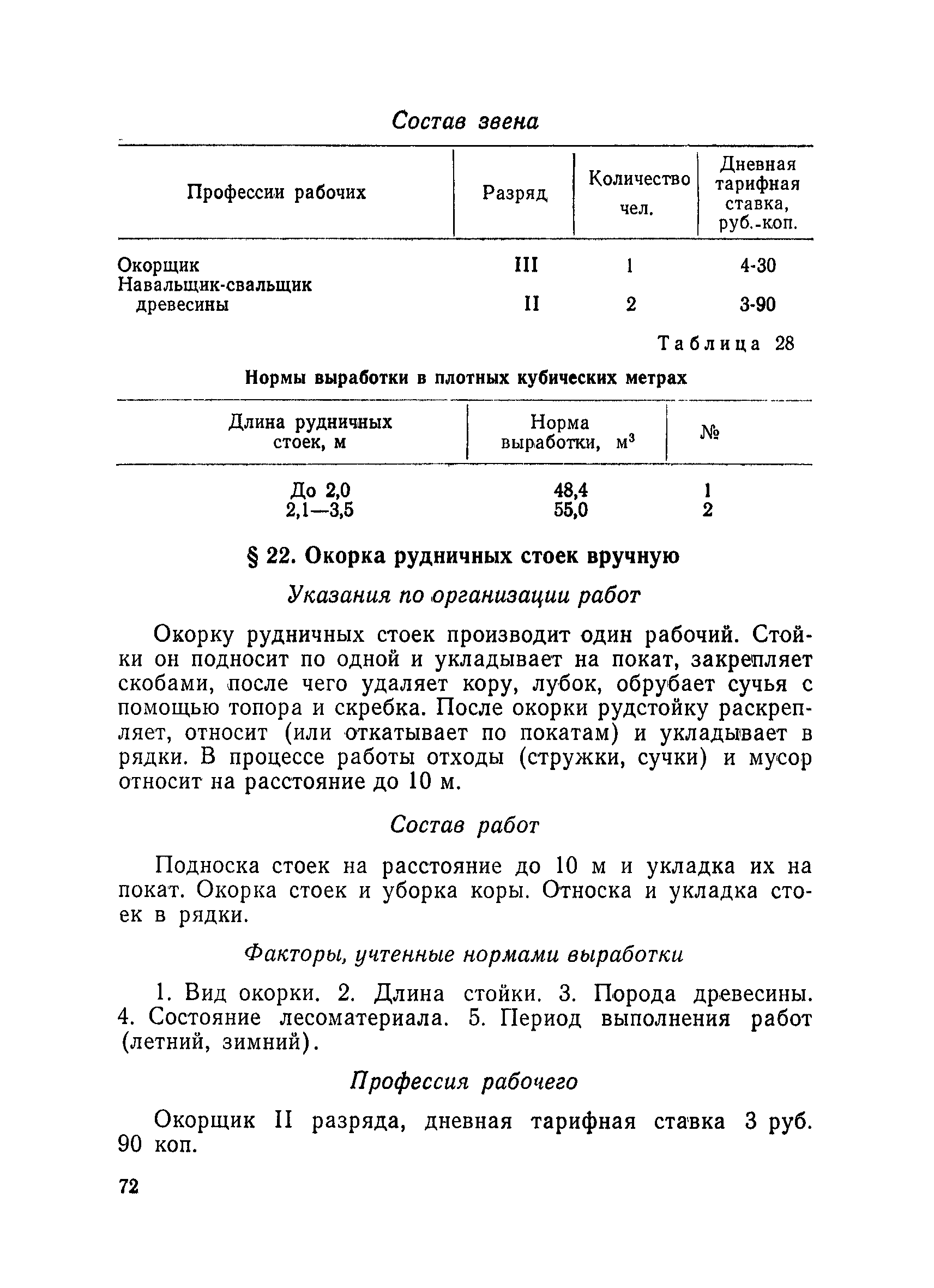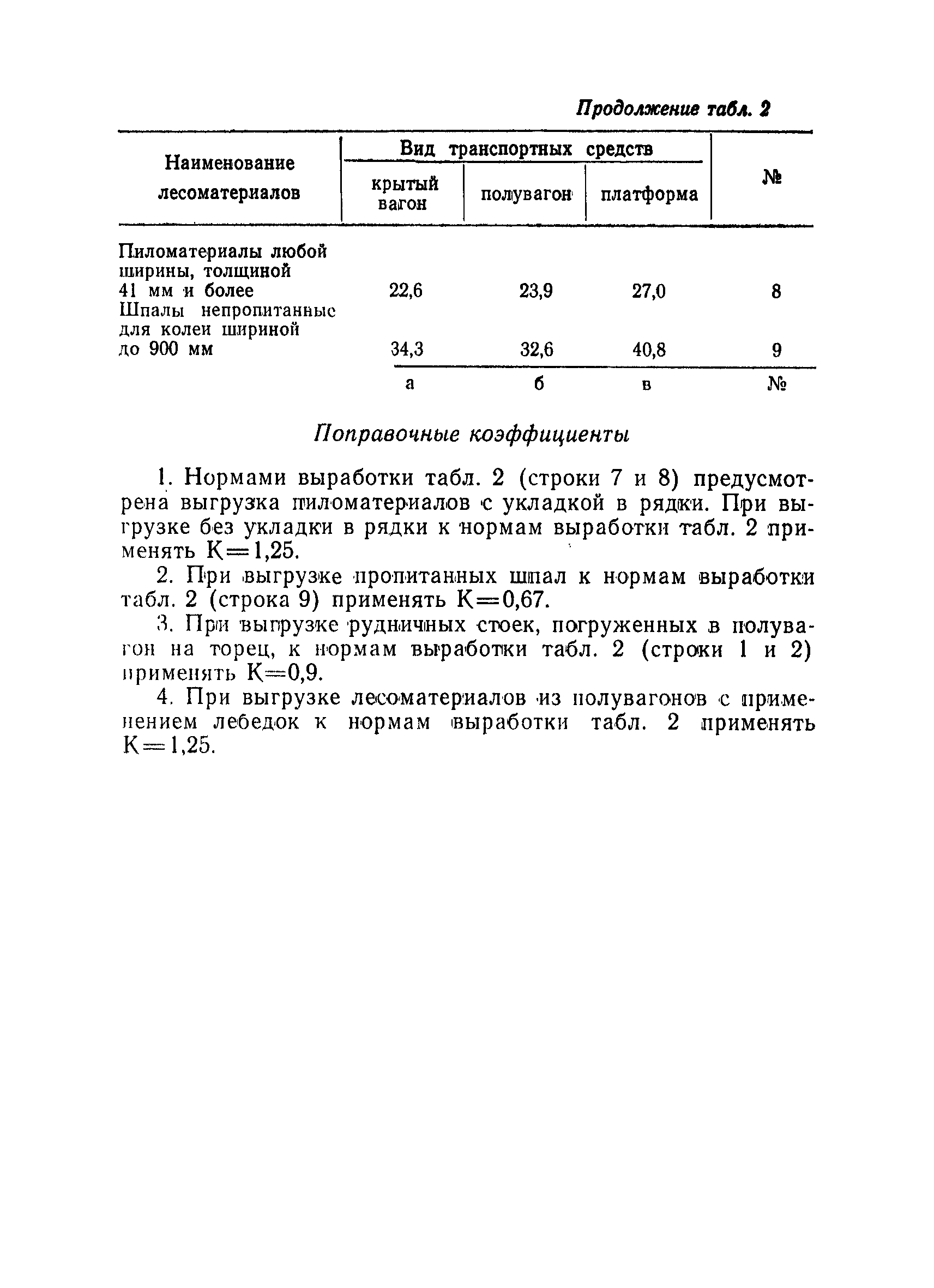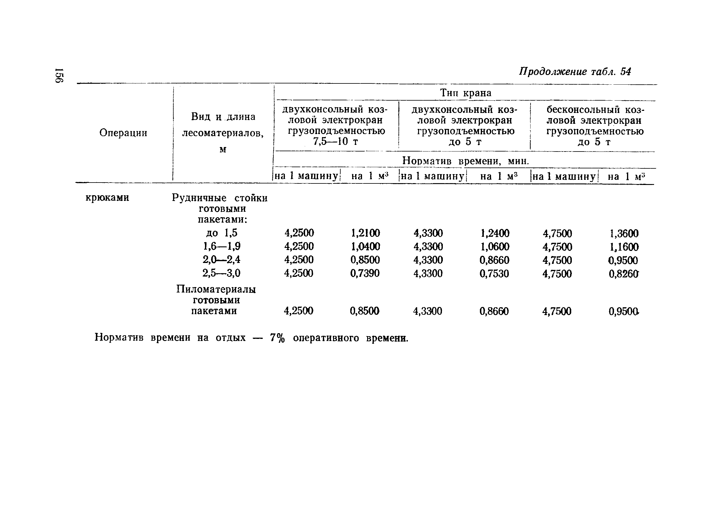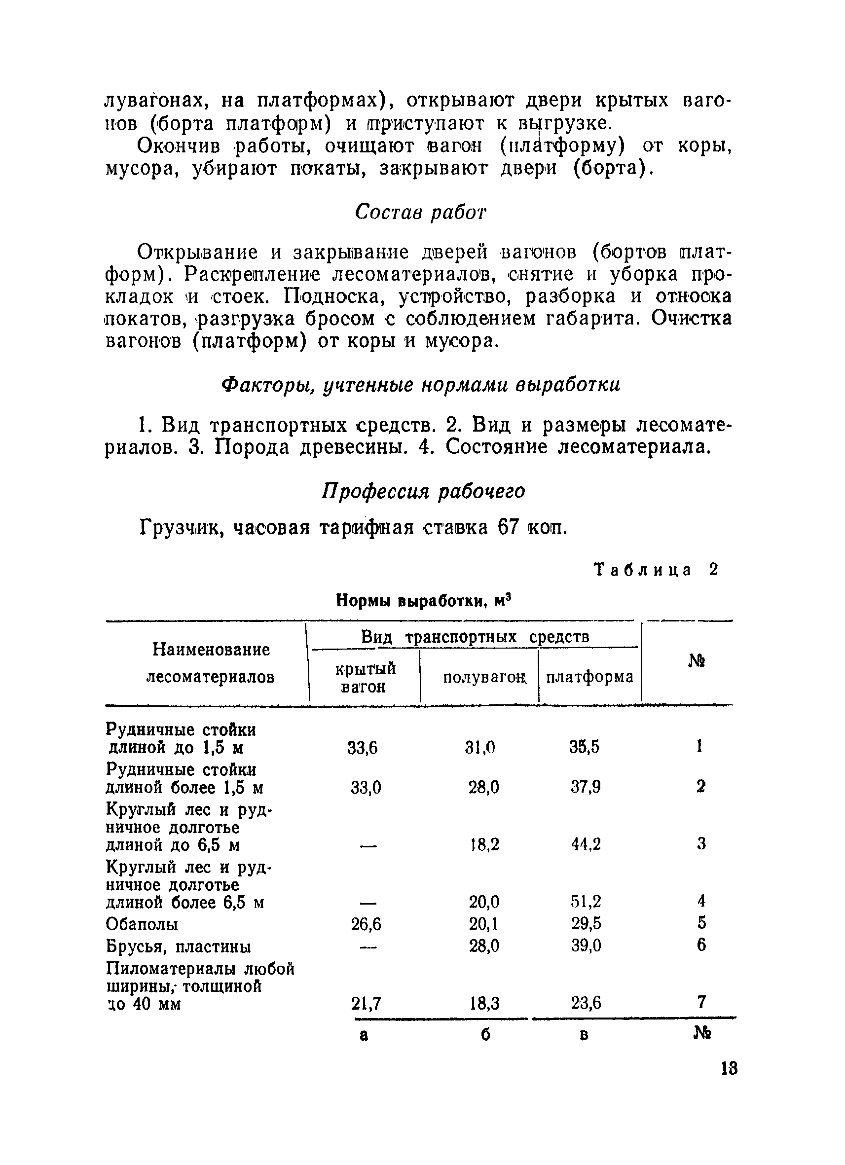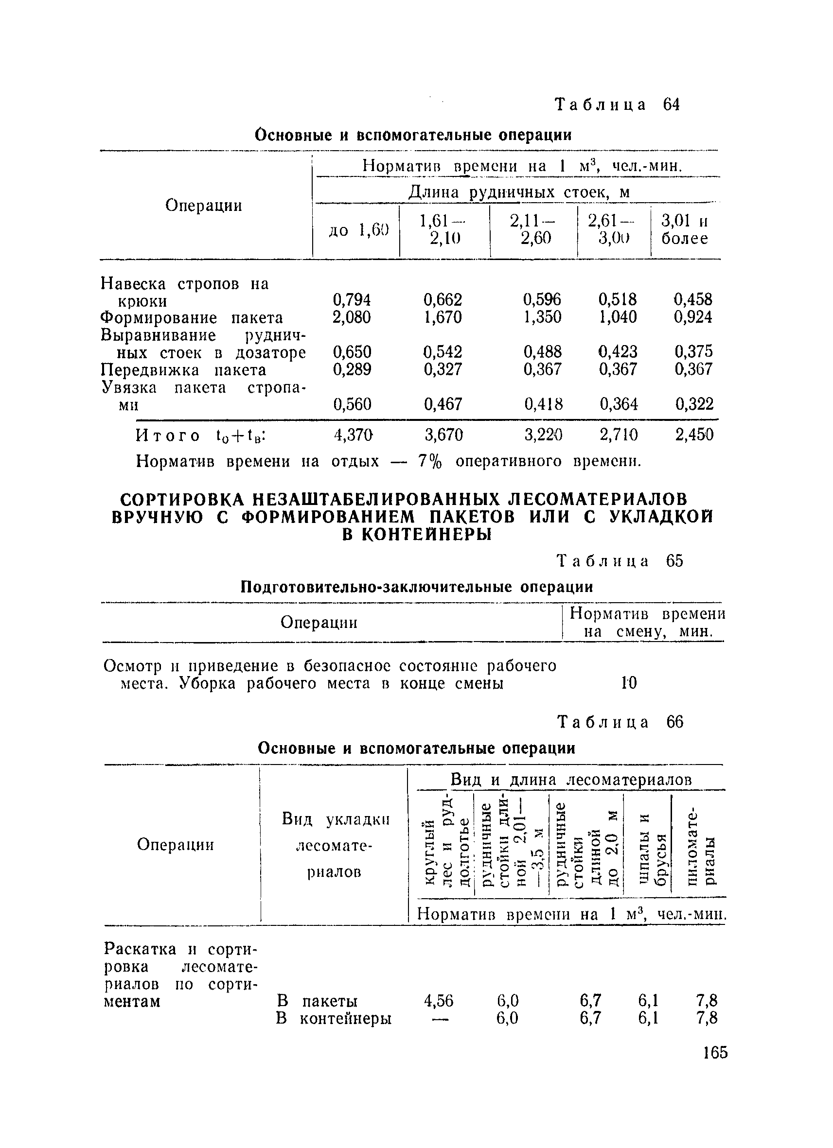 Типовые нормы выработки на переработку лесоматериалов на лесных складах предприятий (организаций) угольной промышленности| Статус: | справочные материалы, мп, тпр | | Название рус.: | Типовые нормы выработки на переработку лесоматериалов на лесных складах предприятий (организаций) угольной промышленности | | Дата добавления в базу: | 01.01.2019 | | Дата актуализации: | 01.01.2021 | | Область применения: | Типовые нормы рекомендуются для использования в качестве основы при разработке Единых отраслевых и бассейновых норм выработки, а также для применения на предприятиях и в организациях как местных технически обоснованных норм после утверждения их руководителем по согласованию с соответствующим комитетом профсоюза и нормативно-исследовательской станцией комбината (треста). Материалы сборника могут быть использованы научно-исследовательскими и проектными организациями, изучающими вопросы организации и нормирования труда | | Оглавление: | Порядок применения типовых норм Общая часть Раздел I. Разгрузочные работы § 1. Выгрузка лесоматериалов кранами из железнодорожного подвижного состава § 2. Выгрузка лесоматериалов из железнодорожного подвижного состава вручную или с применением простейших приспособлений Раздел II. Механизированное лесопиление и разделка леса § 3. Распиловка леса па лесопильных рамах § 4. Разборка и установка поставов рамных пил § 5. Продольная распиловка леса на круглопильных станках § 6. Заготовка рудничных стоек на круглопильных станках § 7. Заготовка рудничных стоек ручными электро- или бензопилами § 8. Поперечная распиловка пиломатериалов (досок, обаполов, затяжек, распилов, брусьев, шпал) на круглопильных станках Раздел III. Транспортно-перевалочные и вспомогательные работы § 9. Перемещение лесоматериалов кранами по территории склада § 10. Погрузка лесоматериалов кранами на автомашины (тракторные прицепы) § 11. Погрузка лесоматериалов на автомашины (тракторные прицепы) и выгрузка их вручную или с применением простейших приспособлений § 12. Перемещение леса автопогрузчиками § 13. Сортировка и перемещение круглого леса лебедками или тракторами § 14. Механизированное пакетирование рудничных стоек § 15. Сортировка незаштабелированных лесоматериалов вручную с формированием пакетов или с укладкой в контейнеры § 16. Погрузка лесоматериалов в вагонетки или на площадки немеханизированным способом § 17. Доставка лесоматериалов в вагонетках или на площадках немеханизированным способом § 18. Доставка лесоматериалов в вагонетках или на площадках лебедками § 19. Доставка лесоматериалов конвейерами § 20. Штабелировка круглого леса и рудничного долготья лебедками Раздел IV. Прочие работы § 21. Окорка рудничных стоек на механическом станке § 22. Окорка рудничных стоек вручную § 23. Пропитка пиломатериалов антисептиками § 24. Заточка рамных пил на суппортном станке ТчПА-3 § 25. Нарезка, заточка круглых, рамных и цепных пил на наждачном станке. Развод зубьев и правка пил § 26. Разные работы на лесном складе § 27. Вывозка отходов и мусора Раздел V. Расчетные нормативы времени по операциям или группам операций рабочих процессов Выгрузка лесоматериалов кранами из железнодорожного подвижного состава Выгрузка лесоматериалов из железнодорожного подвижного состава вручную или с применением простейших приспособлений Распиловка леса на лесопильны