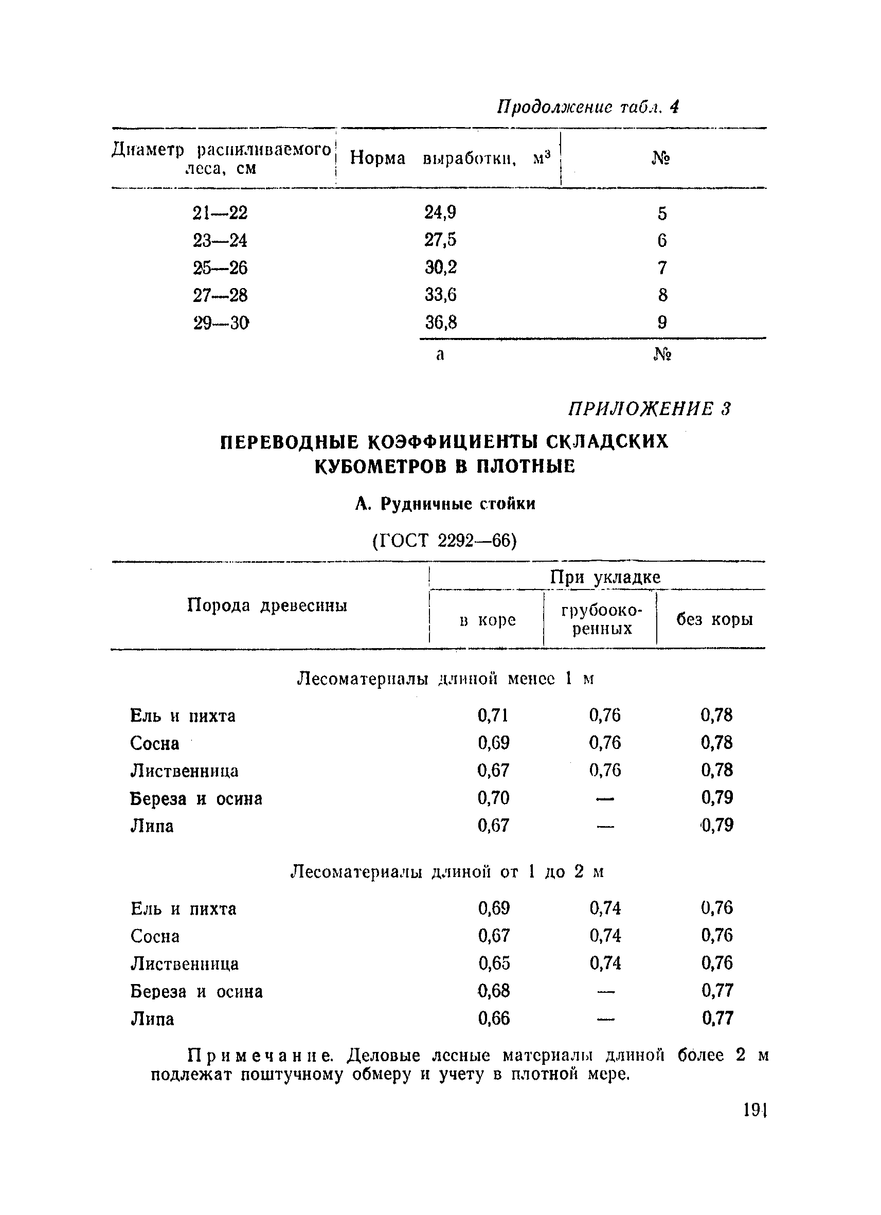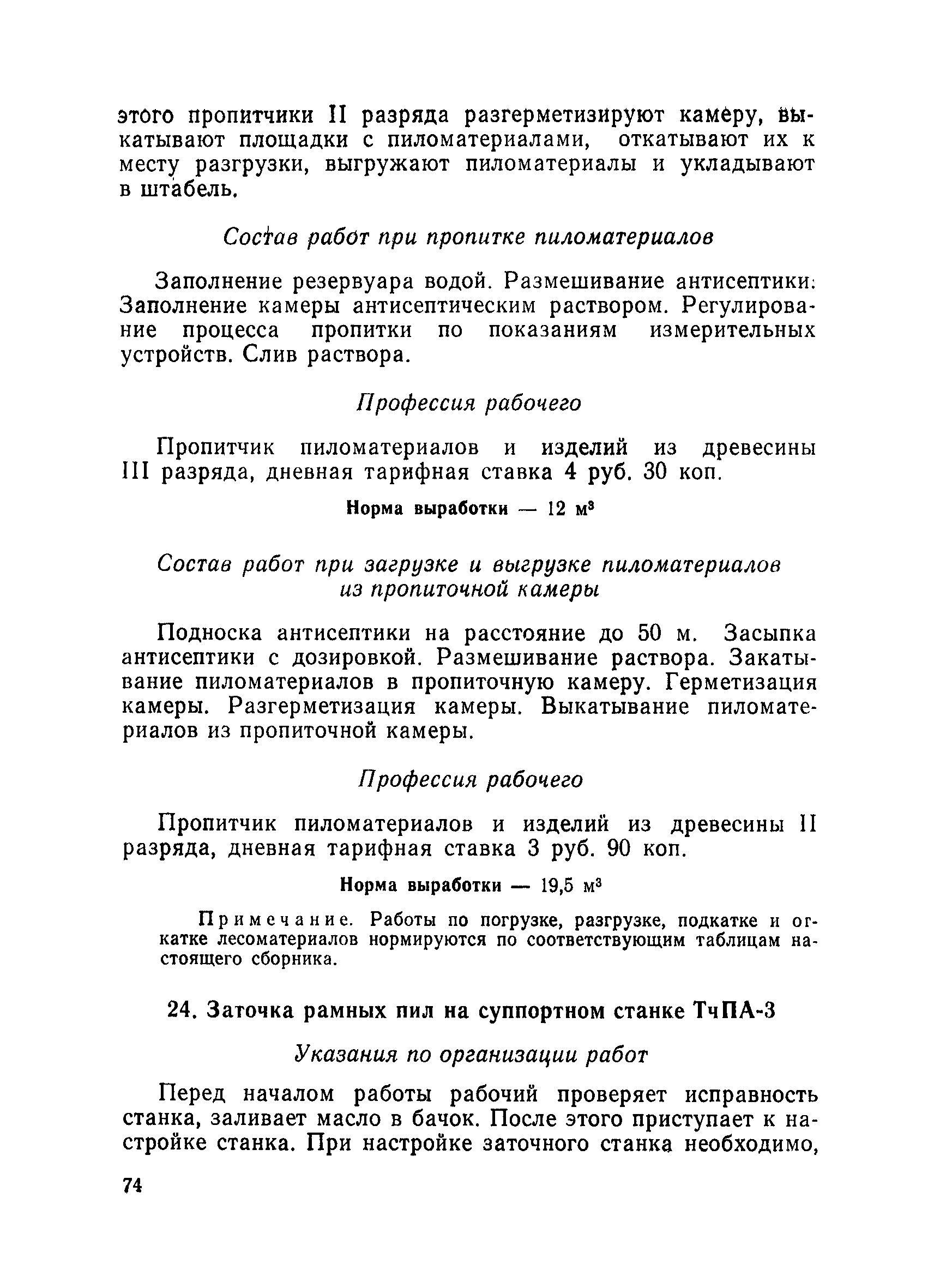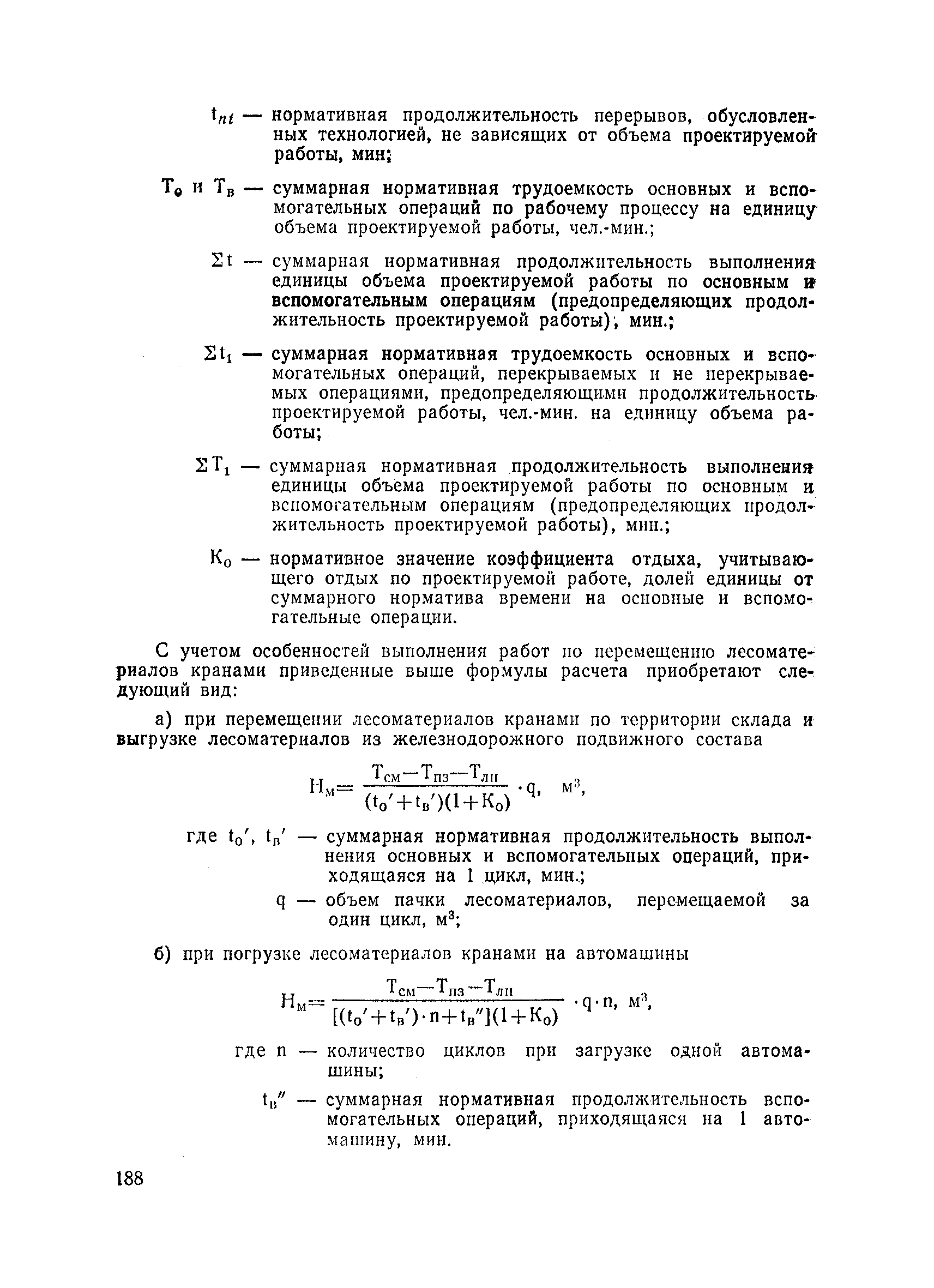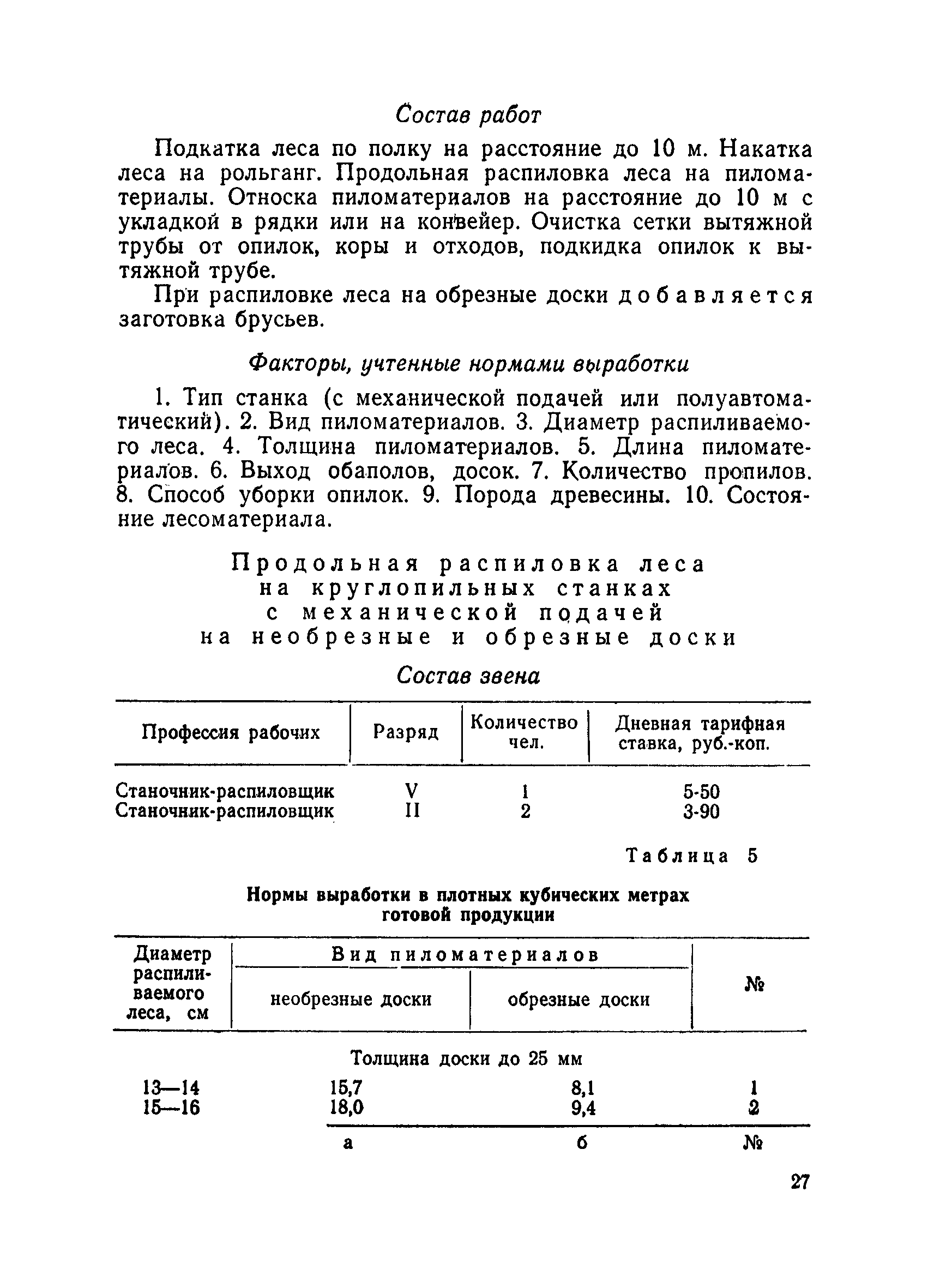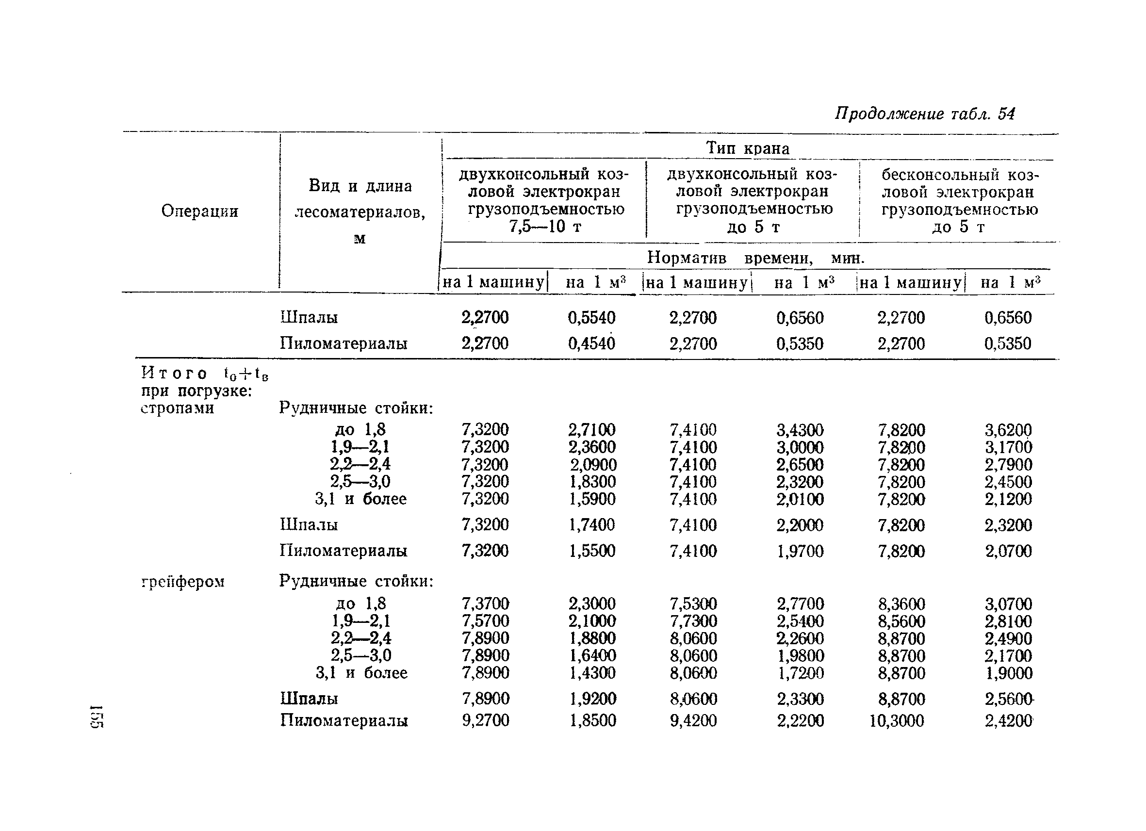 Типовые нормы выработки на переработку лесоматериалов на лесных складах предприятий (организаций) угольной промышленности| Статус: | справочные материалы, мп, тпр | | Название рус.: | Типовые нормы выработки на переработку лесоматериалов на лесных складах предприятий (организаций) угольной промышленности | | Дата добавления в базу: | 01.01.2019 | | Дата актуализации: | 01.01.2021 | | Область применения: | Типовые нормы рекомендуются для использования в качестве основы при разработке Единых отраслевых и бассейновых норм выработки, а также для применения на предприятиях и в организациях как местных технически обоснованных норм после утверждения их руководителем по согласованию с соответствующим комитетом профсоюза и нормативно-исследовательской станцией комбината (треста). Материалы сборника могут быть использованы научно-исследовательскими и проектными организациями, изучающими вопросы организации и нормирования труда | | Оглавление: | Порядок применения типовых норм Общая часть Раздел I. Разгрузочные работы § 1. Выгрузка лесоматериалов кранами из железнодорожного подвижного состава § 2. Выгрузка лесоматериалов из железнодорожного подвижного состава вручную или с применением простейших приспособлений Раздел II. Механизированное лесопиление и разделка леса § 3. Распиловка леса па лесопильных рамах § 4. Разборка и установка поставов рамных пил § 5. Продольная распиловка леса на круглопильных станках § 6. Заготовка рудничных стоек на круглопильных станках § 7. Заготовка рудничных стоек ручными электро- или бензопилами § 8. Поперечная распиловка пиломатериалов (досок, обаполов, затяжек, распилов, брусьев, шпал) на круглопильных станках Раздел III. Транспортно-перевалочные и вспомогательные работы § 9. Перемещение лесоматериалов кранами по территории склада § 10. Погрузка лесоматериалов кранами на автомашины (тракторные прицепы) § 11. Погрузка лесоматериалов на автомашины (тракторные прицепы) и выгрузка их вручную или с применением простейших приспособлений § 12. Перемещение леса автопогрузчиками § 13. Сортировка и перемещение круглого леса лебедками или тракторами § 14. Механизированное пакетирование рудничных стоек § 15. Сортировка незаштабелированных лесоматериалов вручную с формированием пакетов или с укладкой в контейнеры § 16. Погрузка лесоматериалов в вагонетки или на площадки немеханизированным способом § 17. Доставка лесоматериалов в вагонетках или на площадках немеханизированным способом § 18. Доставка лесоматериалов в вагонетках или на площадках лебедками § 19. Доставка лесоматериалов конвейерами § 20. Штабелировка круглого леса и рудничного долготья лебедками Раздел IV. Прочие работы § 21. Окорка рудничных стоек на механическом станке § 22. Окорка рудничных стоек вручную § 23. Пропитка пиломатериалов антисептиками § 24. Заточка рамных пил на суппортном станке ТчПА-3 § 25. Нарезка, заточка круглых, рамных и цепных пил на наждачном станке. Развод зубьев и правка пил § 26. Разные работы на лесном складе § 27. Вывозка отходов и мусора Раздел V. Расчетные нормативы времени по операциям или группам операций рабочих процессов Выгрузка лесоматериалов кранами из железнодорожного подвижного состава Выгрузка лесоматериалов из железнодорожного подвижного состава вручную или с применением простейших приспособлений Распиловка леса на лесопильны