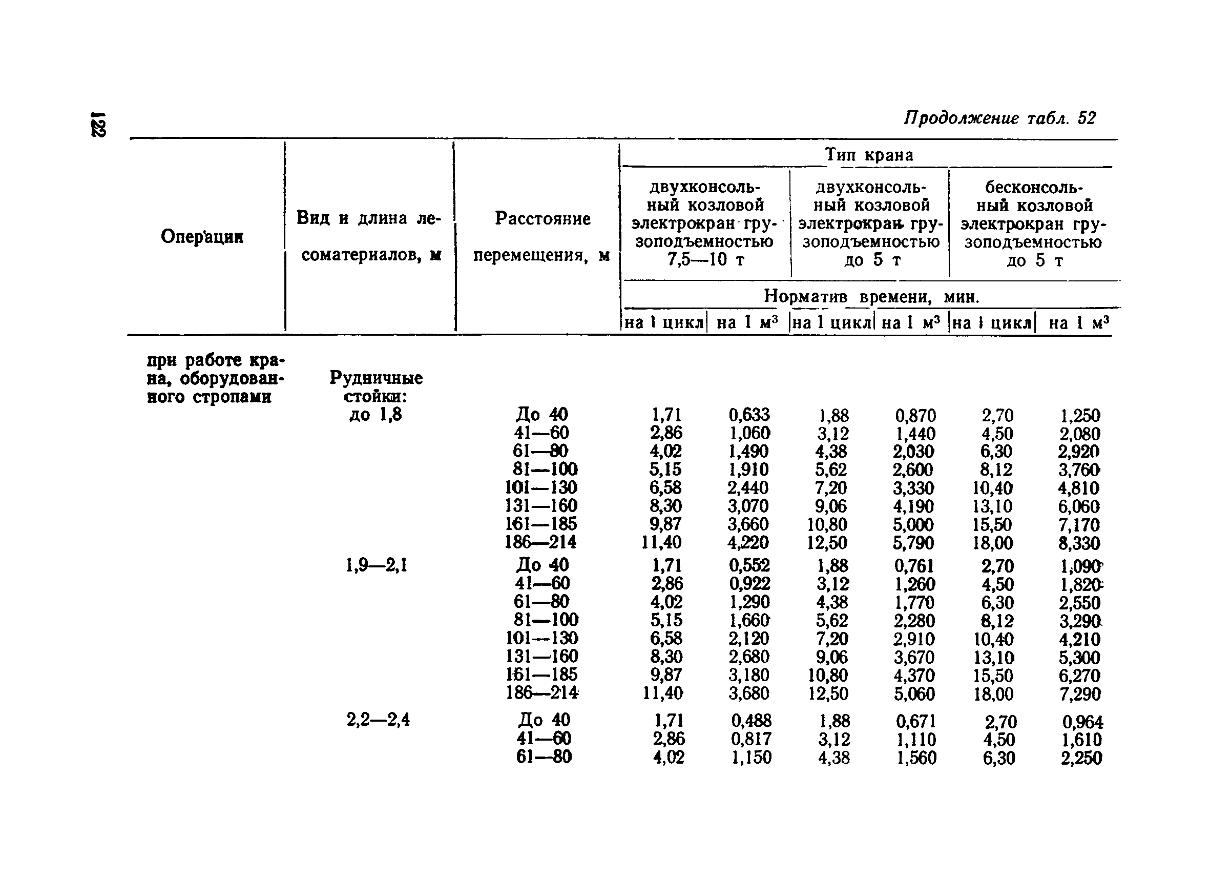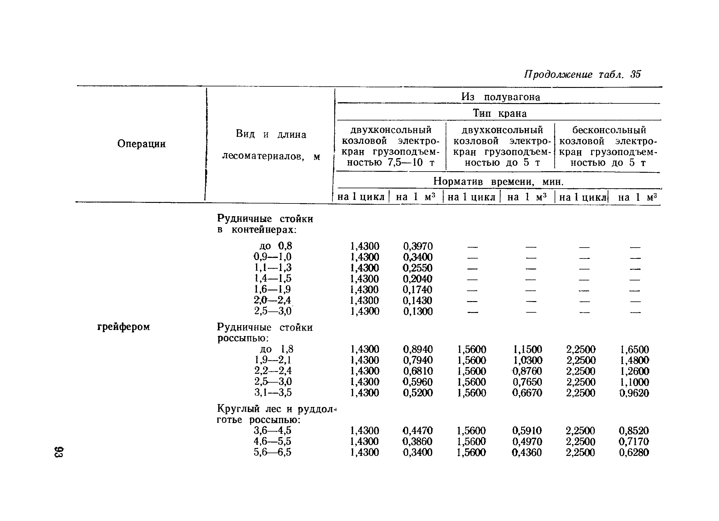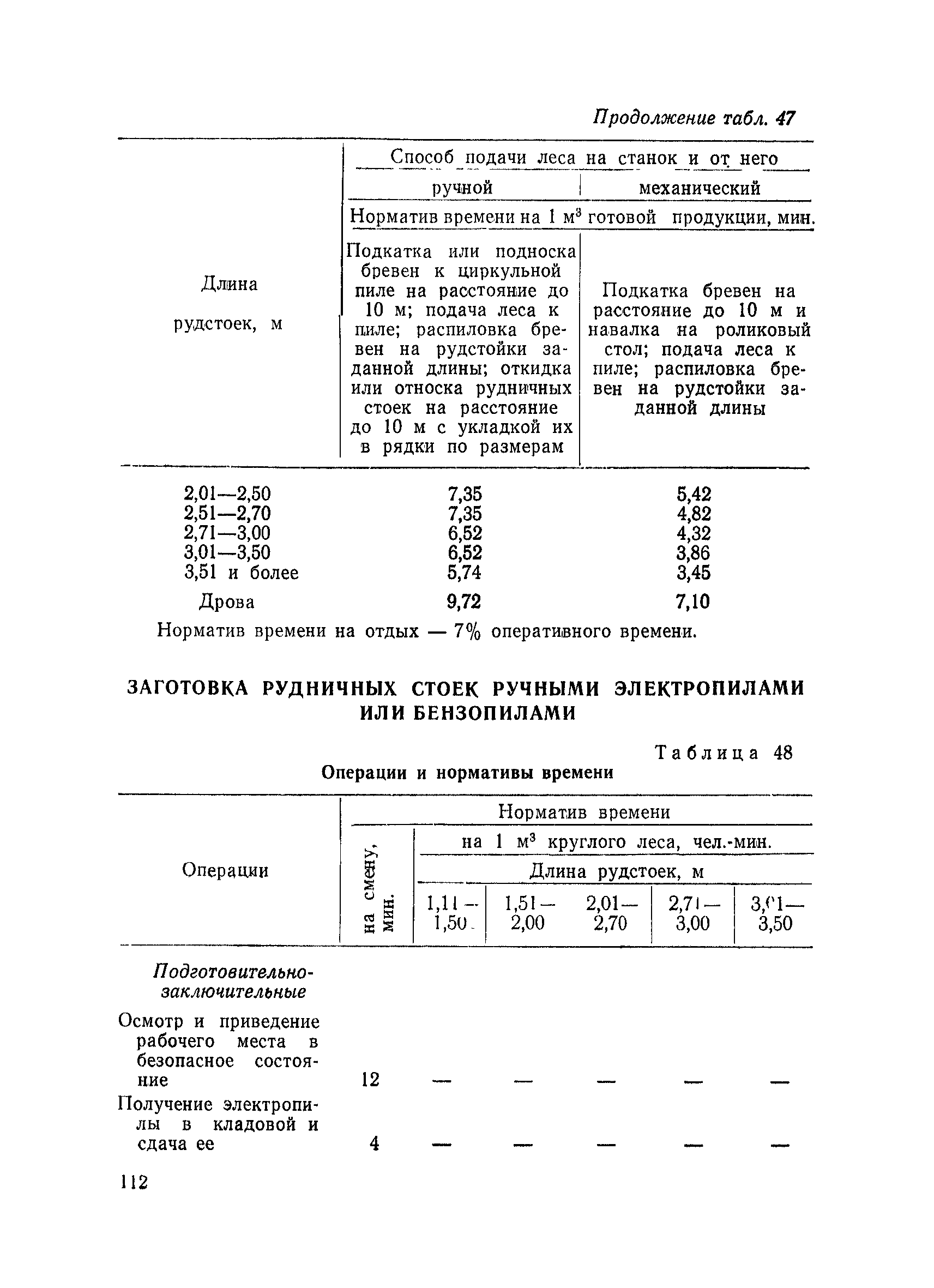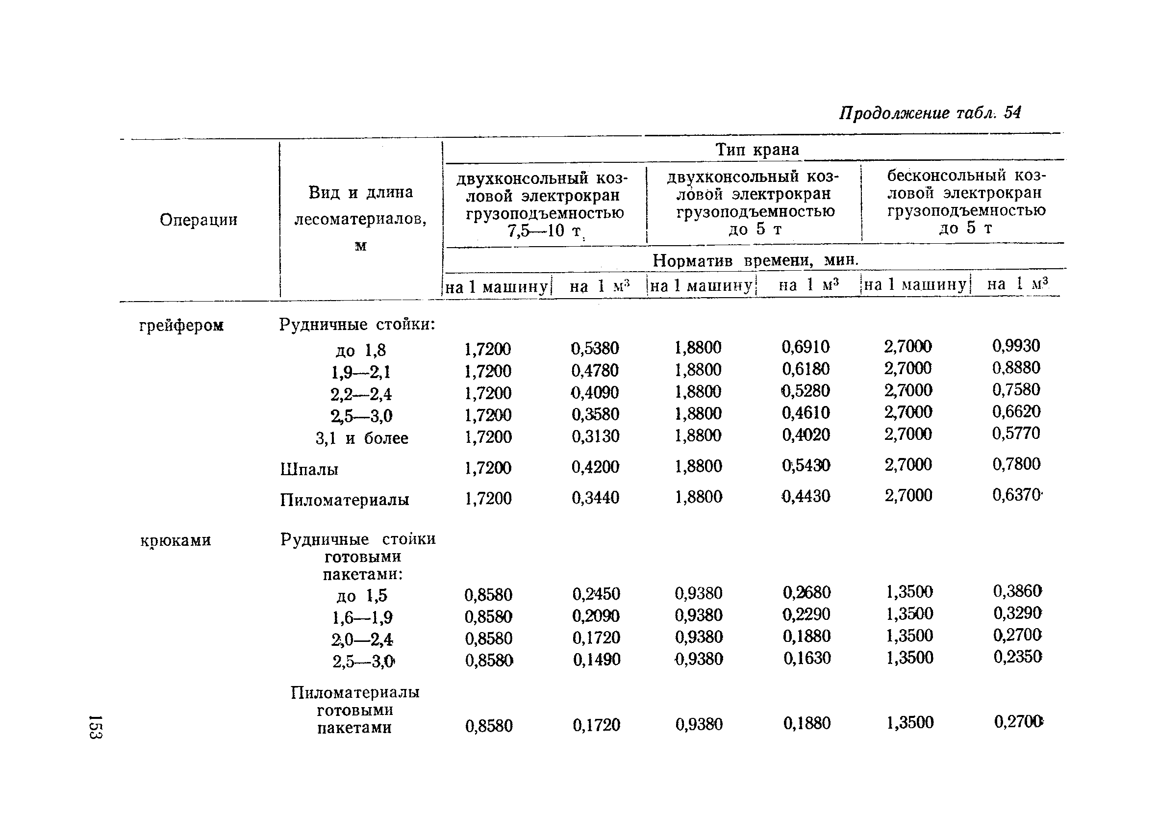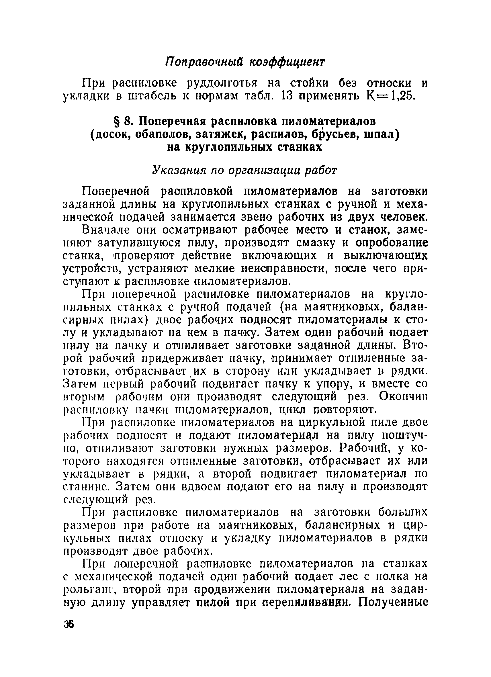 Типовые нормы выработки на переработку лесоматериалов на лесных складах предприятий (организаций) угольной промышленности| Статус: | справочные материалы, мп, тпр | | Название рус.: | Типовые нормы выработки на переработку лесоматериалов на лесных складах предприятий (организаций) угольной промышленности | | Дата добавления в базу: | 01.01.2019 | | Дата актуализации: | 01.01.2021 | | Область применения: | Типовые нормы рекомендуются для использования в качестве основы при разработке Единых отраслевых и бассейновых норм выработки, а также для применения на предприятиях и в организациях как местных технически обоснованных норм после утверждения их руководителем по согласованию с соответствующим комитетом профсоюза и нормативно-исследовательской станцией комбината (треста). Материалы сборника могут быть использованы научно-исследовательскими и проектными организациями, изучающими вопросы организации и нормирования труда | | Оглавление: | Порядок применения типовых норм Общая часть Раздел I. Разгрузочные работы § 1. Выгрузка лесоматериалов кранами из железнодорожного подвижного состава § 2. Выгрузка лесоматериалов из железнодорожного подвижного состава вручную или с применением простейших приспособлений Раздел II. Механизированное лесопиление и разделка леса § 3. Распиловка леса па лесопильных рамах § 4. Разборка и установка поставов рамных пил § 5. Продольная распиловка леса на круглопильных станках § 6. Заготовка рудничных стоек на круглопильных станках § 7. Заготовка рудничных стоек ручными электро- или бензопилами § 8. Поперечная распиловка пиломатериалов (досок, обаполов, затяжек, распилов, брусьев, шпал) на круглопильных станках Раздел III. Транспортно-перевалочные и вспомогательные работы § 9. Перемещение лесоматериалов кранами по территории склада § 10. Погрузка лесоматериалов кранами на автомашины (тракторные прицепы) § 11. Погрузка лесоматериалов на автомашины (тракторные прицепы) и выгрузка их вручную или с применением простейших приспособлений § 12. Перемещение леса автопогрузчиками § 13. Сортировка и перемещение круглого леса лебедками или тракторами § 14. Механизированное пакетирование рудничных стоек § 15. Сортировка незаштабелированных лесоматериалов вручную с формированием пакетов или с укладкой в контейнеры § 16. Погрузка лесоматериалов в вагонетки или на площадки немеханизированным способом § 17. Доставка лесоматериалов в вагонетках или на площадках немеханизированным способом § 18. Доставка лесоматериалов в вагонетках или на площадках лебедками § 19. Доставка лесоматериалов конвейерами § 20. Штабелировка круглого леса и рудничного долготья лебедками Раздел IV. Прочие работы § 21. Окорка рудничных стоек на механическом станке § 22. Окорка рудничных стоек вручную § 23. Пропитка пиломатериалов антисептиками § 24. Заточка рамных пил на суппортном станке ТчПА-3 § 25. Нарезка, заточка круглых, рамных и цепных пил на наждачном станке. Развод зубьев и правка пил § 26. Разные работы на лесном складе § 27. Вывозка отходов и мусора Раздел V. Расчетные нормативы времени по операциям или группам операций рабочих процессов Выгрузка лесоматериалов кранами из железнодорожного подвижного состава Выгрузка лесоматериалов из железнодорожного подвижного состава вручную или с применением простейших приспособлений Распиловка леса на лесопильны