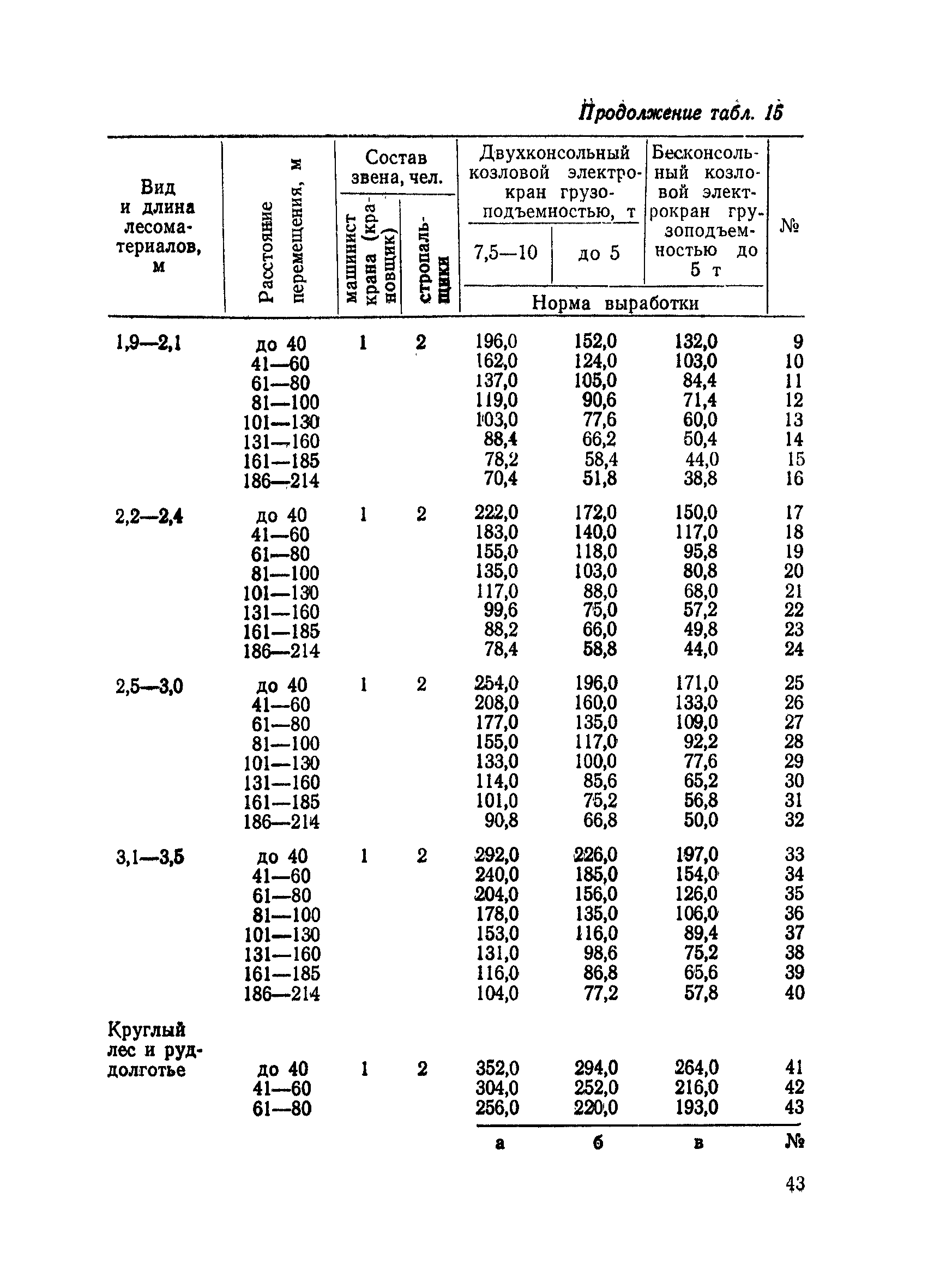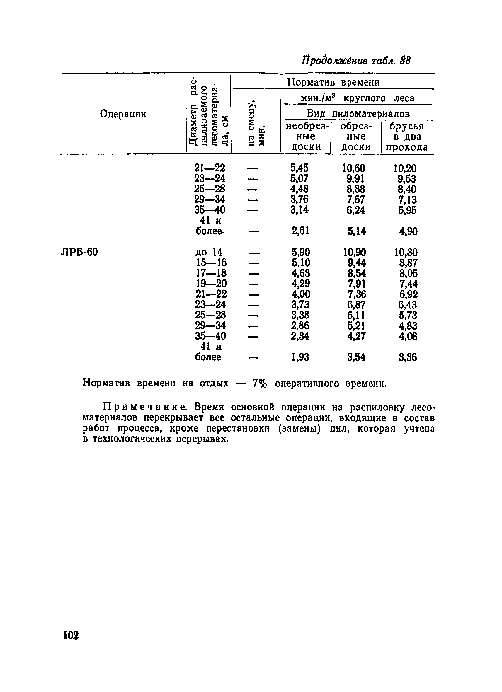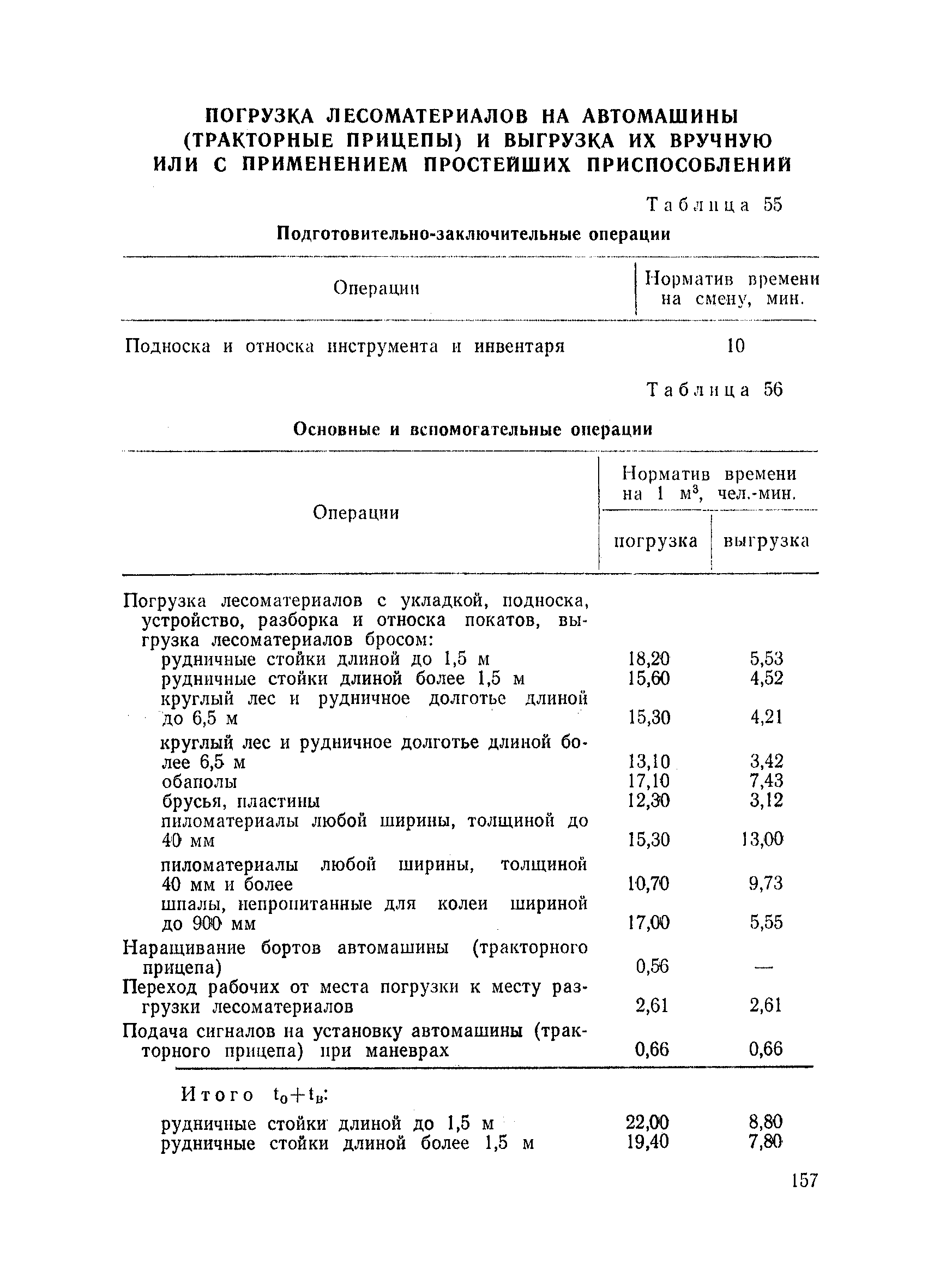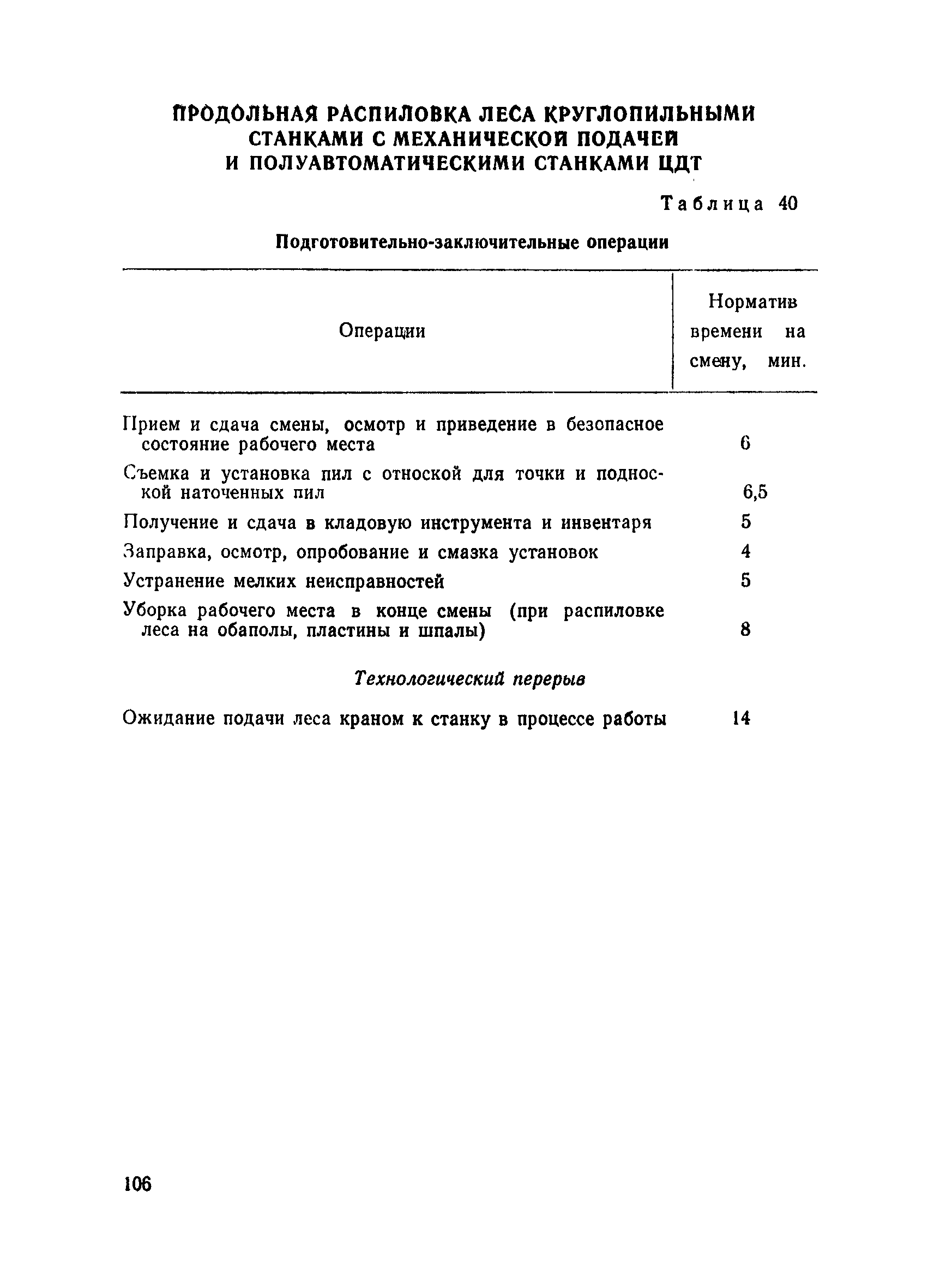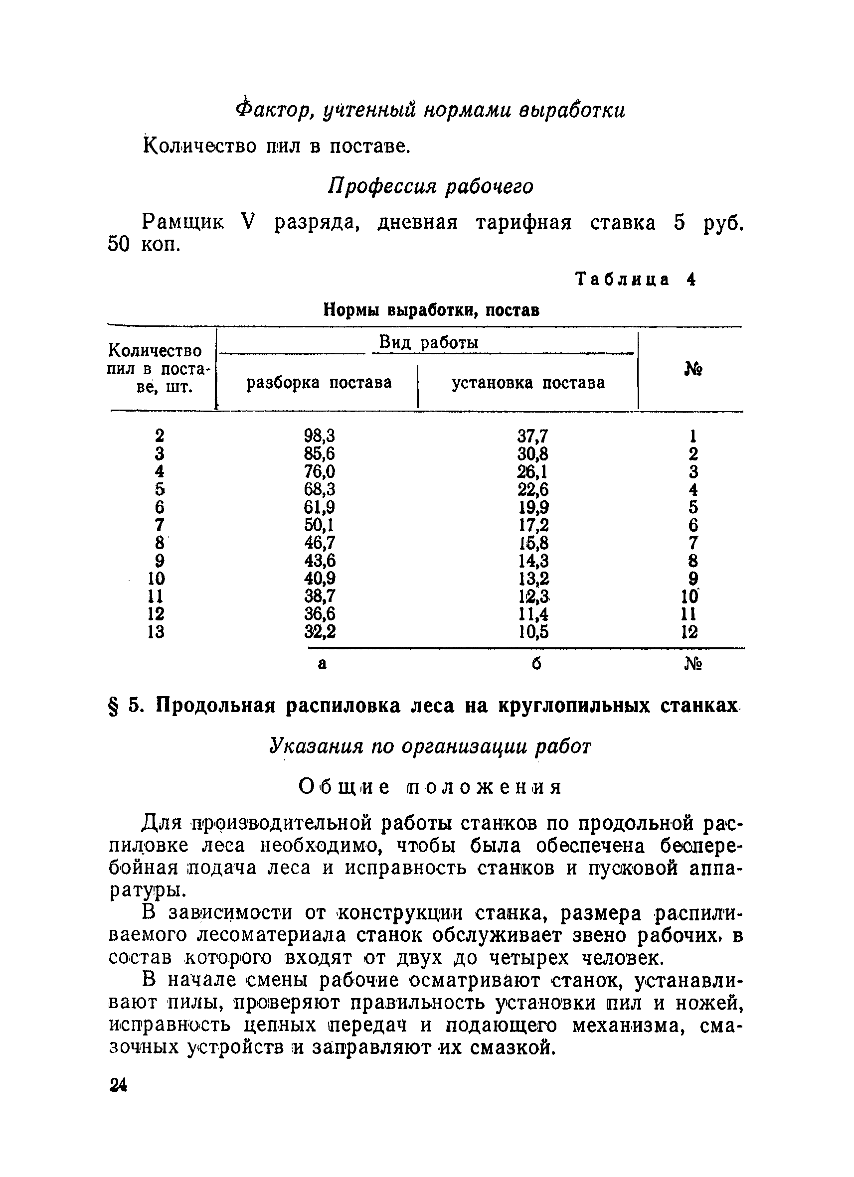 Типовые нормы выработки на переработку лесоматериалов на лесных складах предприятий (организаций) угольной промышленности| Статус: | справочные материалы, мп, тпр | | Название рус.: | Типовые нормы выработки на переработку лесоматериалов на лесных складах предприятий (организаций) угольной промышленности | | Дата добавления в базу: | 01.01.2019 | | Дата актуализации: | 01.01.2021 | | Область применения: | Типовые нормы рекомендуются для использования в качестве основы при разработке Единых отраслевых и бассейновых норм выработки, а также для применения на предприятиях и в организациях как местных технически обоснованных норм после утверждения их руководителем по согласованию с соответствующим комитетом профсоюза и нормативно-исследовательской станцией комбината (треста). Материалы сборника могут быть использованы научно-исследовательскими и проектными организациями, изучающими вопросы организации и нормирования труда | | Оглавление: | Порядок применения типовых норм Общая часть Раздел I. Разгрузочные работы § 1. Выгрузка лесоматериалов кранами из железнодорожного подвижного состава § 2. Выгрузка лесоматериалов из железнодорожного подвижного состава вручную или с применением простейших приспособлений Раздел II. Механизированное лесопиление и разделка леса § 3. Распиловка леса па лесопильных рамах § 4. Разборка и установка поставов рамных пил § 5. Продольная распиловка леса на круглопильных станках § 6. Заготовка рудничных стоек на круглопильных станках § 7. Заготовка рудничных стоек ручными электро- или бензопилами § 8. Поперечная распиловка пиломатериалов (досок, обаполов, затяжек, распилов, брусьев, шпал) на круглопильных станках Раздел III. Транспортно-перевалочные и вспомогательные работы § 9. Перемещение лесоматериалов кранами по территории склада § 10. Погрузка лесоматериалов кранами на автомашины (тракторные прицепы) § 11. Погрузка лесоматериалов на автомашины (тракторные прицепы) и выгрузка их вручную или с применением простейших приспособлений § 12. Перемещение леса автопогрузчиками § 13. Сортировка и перемещение круглого леса лебедками или тракторами § 14. Механизированное пакетирование рудничных стоек § 15. Сортировка незаштабелированных лесоматериалов вручную с формированием пакетов или с укладкой в контейнеры § 16. Погрузка лесоматериалов в вагонетки или на площадки немеханизированным способом § 17. Доставка лесоматериалов в вагонетках или на площадках немеханизированным способом § 18. Доставка лесоматериалов в вагонетках или на площадках лебедками § 19. Доставка лесоматериалов конвейерами § 20. Штабелировка круглого леса и рудничного долготья лебедками Раздел IV. Прочие работы § 21. Окорка рудничных стоек на механическом станке § 22. Окорка рудничных стоек вручную § 23. Пропитка пиломатериалов антисептиками § 24. Заточка рамных пил на суппортном станке ТчПА-3 § 25. Нарезка, заточка круглых, рамных и цепных пил на наждачном станке. Развод зубьев и правка пил § 26. Разные работы на лесном складе § 27. Вывозка отходов и мусора Раздел V. Расчетные нормативы времени по операциям или группам операций рабочих процессов Выгрузка лесоматериалов кранами из железнодорожного подвижного состава Выгрузка лесоматериалов из железнодорожного подвижного состава вручную или с применением простейших приспособлений Распиловка леса на лесопильны