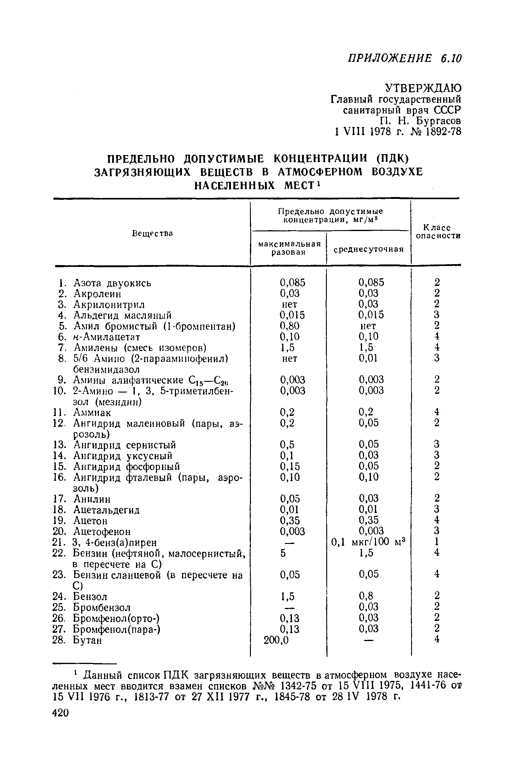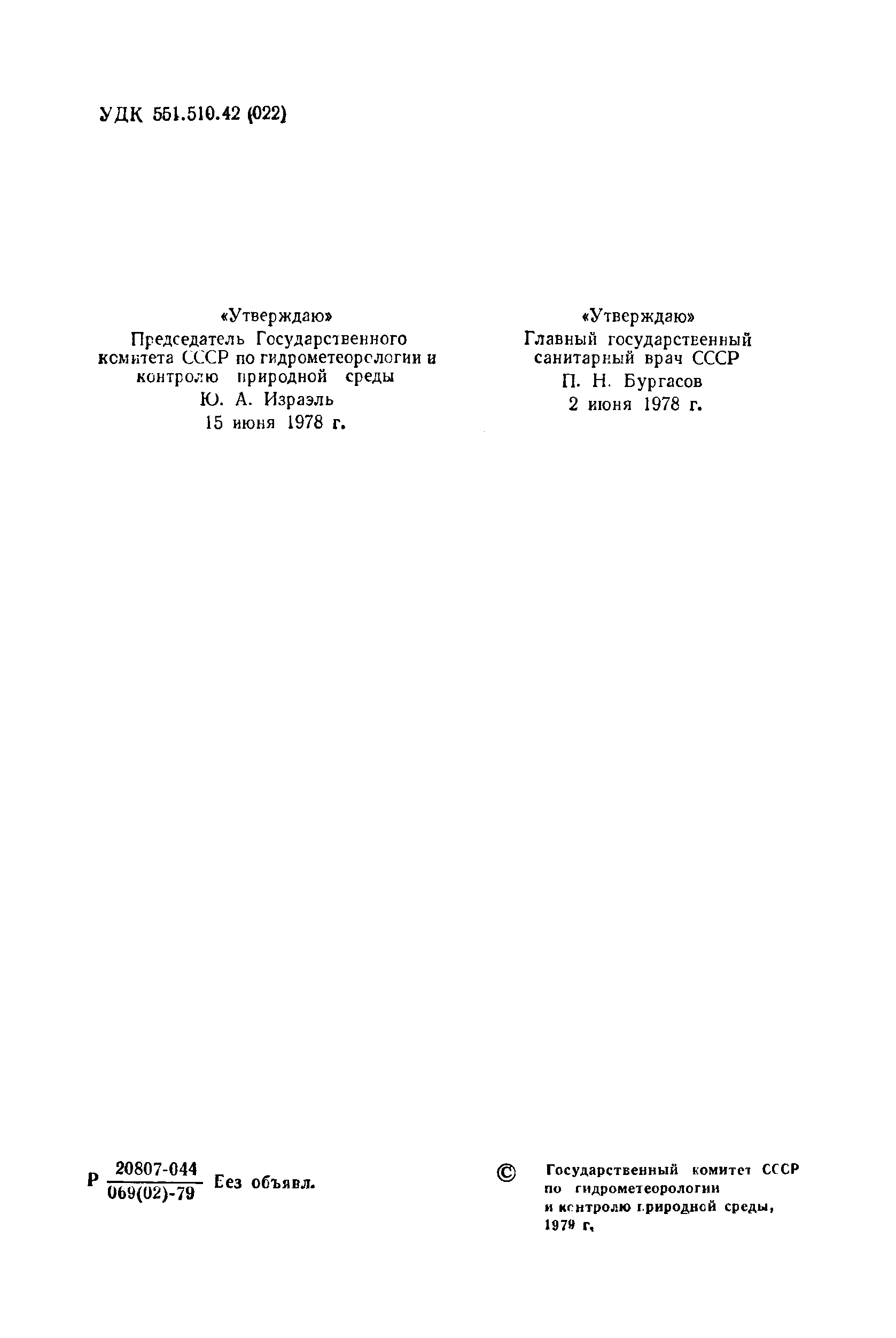 | | Утверждён: | 02.06.1978 Главный государственный санитарный врач СССР (USSR Chief Public Health Officer ) 15.06.1978 Государственный комитет СССР по гидрометеорологии и контролю природной среды (National Committee on Hydrometeorology and Environmental Monitoring )