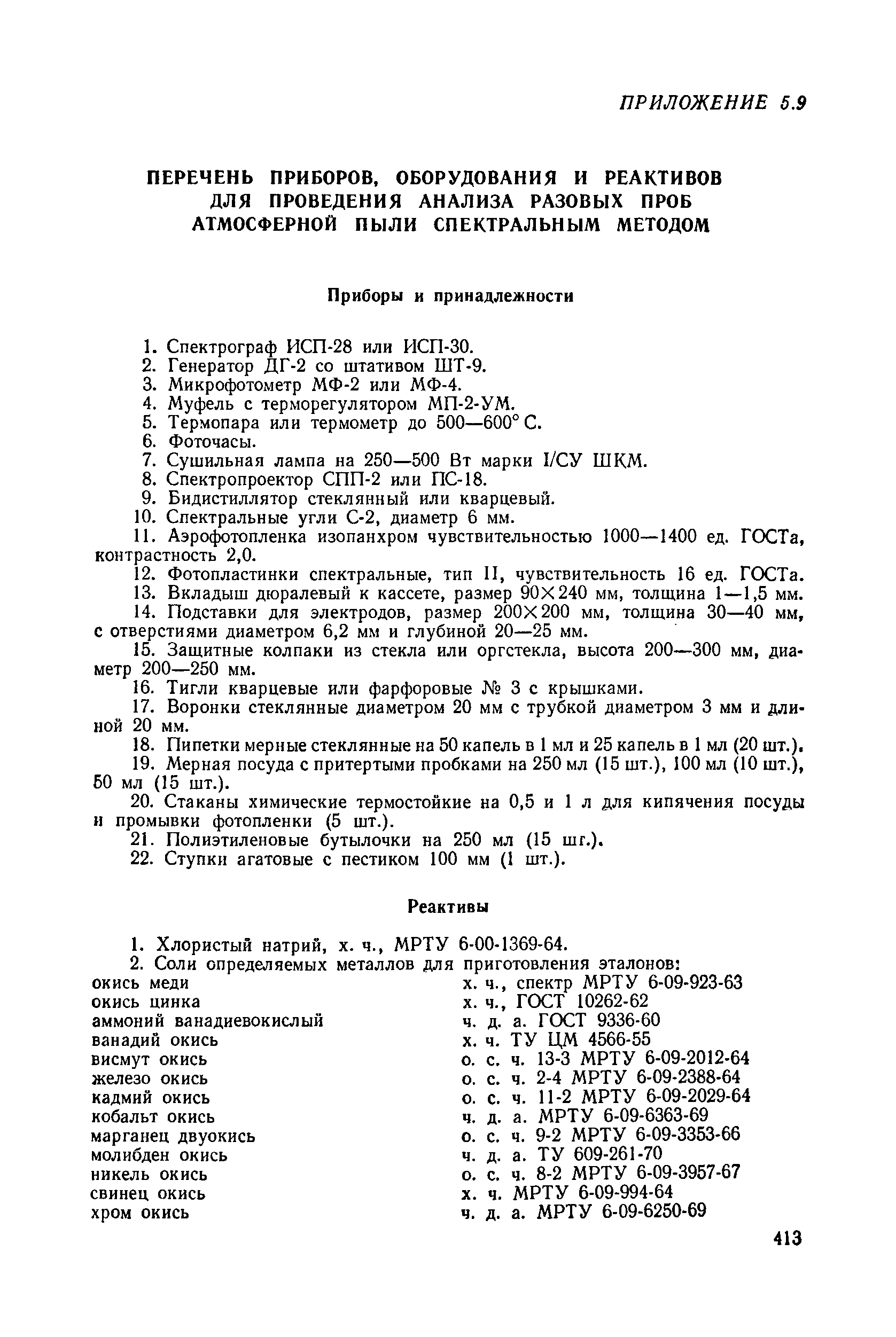 | | Нормативные ссылки: |   СН 245-71 «Санитарные нормы проектирования промышленных предприятий»  ГОСТ 5272-68 «Коррозия металлов. Термины»  ГОСТ 15150-69 «Машины, приборы и другие технические изделия. Исполнения для различных климатических районов. Категории, условия эксплуатации, хранения и транспортирования в части воздействия климатических факторов внешней среды» ГОСТ 2.106-68 «Единая система конструкторской документации. Текстовые документы»  ГОСТ 17.2.1.01-76 «Охрана природы. Атмосфера. Классификация выбросов по составу»  ГОСТ 17.2.1.03-84 «Охрана природы. Атмосфера. Термины и определения контроля загрязнения»  ГОСТ 17.2.3.01-86 «Охрана природы. Атмосфера. Правила контроля качества воздуха населенных пунктов»  ГОСТ 12.2.007.0-75 «Система стандартов безопасности труда. Изделия электротехнические. Общие требования безопасности»  ГОСТ 12.1.009-76 «Система стандартов безопасности труда. Электробезопасность. Термины и определения»  ГОСТ 427-75 «Линейки измерительные металлические. Технические условия»  ГОСТ 23932-90 «Посуда и оборудование лабораторные стеклянные. Общие технические условия»  ГОСТ 8.002-86 «Государственная система обеспечения единства измерений. Государственный надзор и ведомственный контроль за средствами измерений. Основные положения»  ГОСТ 9293-74 «Азот газообразный и жидкий. Технические условия»  ГОСТ 20448-90 «Газы углеводородные сжиженные топливные для коммунально-бытового потребления. Технические условия»  ГОСТ 4233-77 «Реактивы. Натрий хлористый. Технические условия»  ГОСТ 2405-88 «Манометры, вакуумметры, мановакуумметры, напоромеры, тягомеры и тягонапоромеры. Общие технические условия»  ГОСТ 5457-75 «Ацетилен растворенный и газообразный технический. Технические условия»  ГОСТ 17.2.4.05-83 «Охрана природы. Атмосфера. Гравиметрический метод определения взвешенных частиц пыли»  ГОСТ 17.2.4.03-81 «Охрана природы. Атмосфера. Индофенольный метод определения аммиака»  ГОСТ 17.2.6.01-86 «Охрана природы. Атмосфера. Приборы для отбора проб воздуха населенных пунктов. Общие технические требования»  ГОСТ 17.2.6.02-85 «Охрана природы. Атмосфера. Газоанализаторы автоматические для контроля загрязнения атмосферы. Общие технические требования»  ГОСТ 24104-2001 «Весы лабораторные. Общие технические требования»  ГОСТ 17.2.4.02-81 «Охрана природы. Атмосфера. Общие требования к методам определения загрязняющих веществ»  ГОСТ 949-73 «Баллоны стальные малого и среднего объема для газов на Рр<=19,6 МПа (200 кгс/см кв.). Технические условия»  ГОСТ 6709-72 «Вода дистиллированная. Технические условия»  ГОСТ 22261-94 «Средства измерений электрических и магнитных величин. Общие технические условия»  ГОСТ 10157-79 «Аргон газообразный и жидкий. Технические условия» ГОСТ 10163-76 «Реактивы. Крахмал растворимый. Технические условия» ГОСТ 10164-75 «Реактивы. Этиленгликоль. Технические условия» ГОСТ 10216-75 «Реактивы. Висмута (III) окись. Технические условия» ГОСТ 10259-78 «Реактивы. Ацетилацетон. Технические условия» ГОСТ 1027-67 «Реактивы. Свинец (II) уксуснокислый 3-водный. Технические условия» ГОСТ 10455-80 «Реактивы. 1,4-Диоксан. Технические условия»  ГОСТ 1048-79 «Ленты из алюминиевой бронзы для пружин. Технические условия» ГОСТ 10652-73 «Реактивы. Соль динатриевая этилендиамин-N,N,N',N'- тетрауксусной кислоты, 2-водная (трилон Б). Технические условия» ГОСТ 10929-76 «Реактивы. Водорода пероксид. Технические условия» ГОСТ 10931-74 «Реактивы. Натрий молибденов