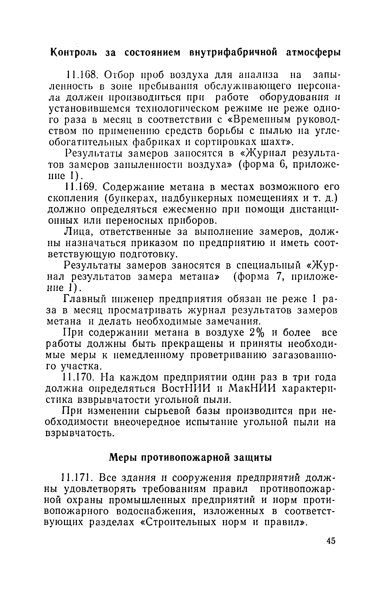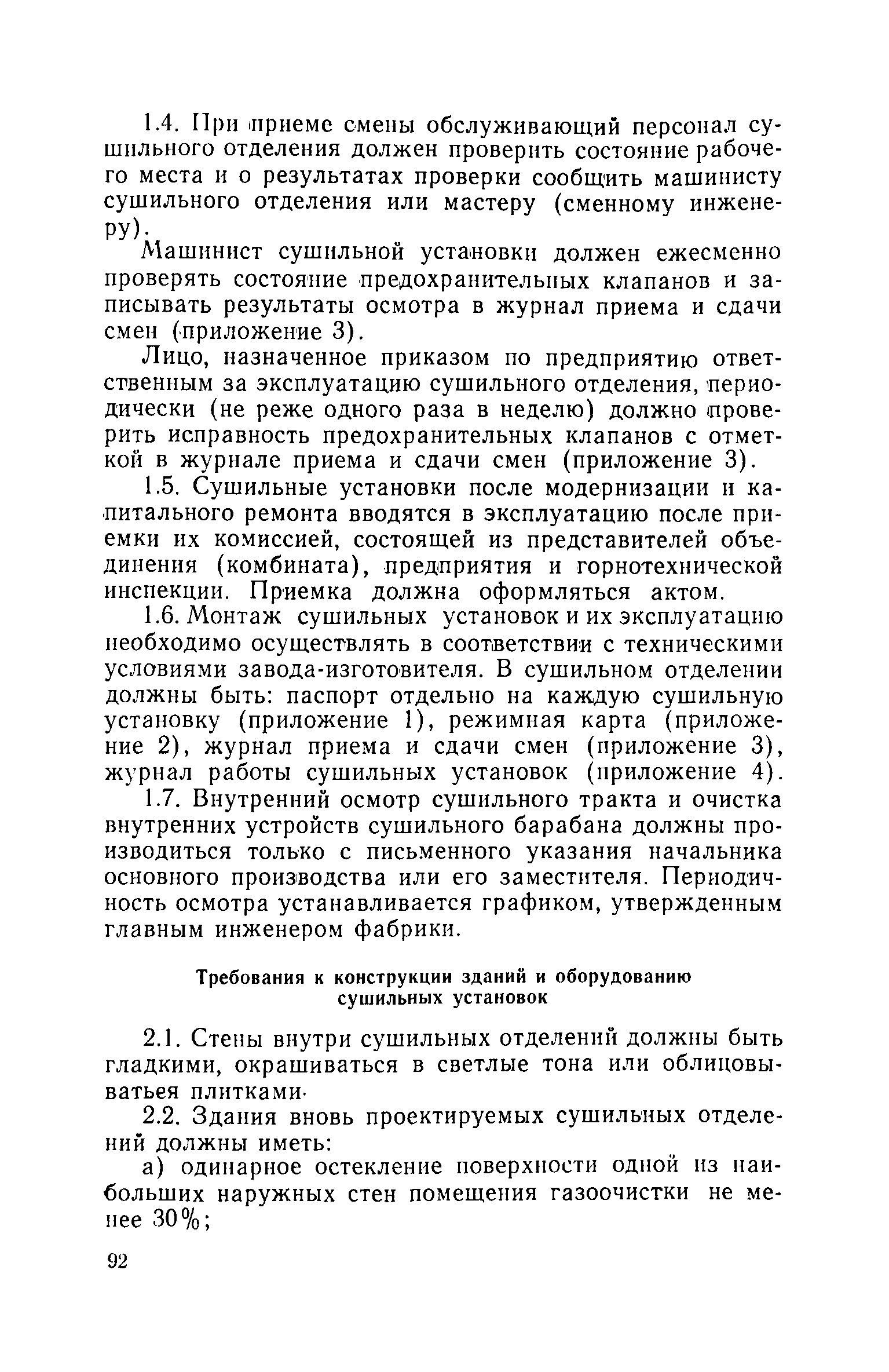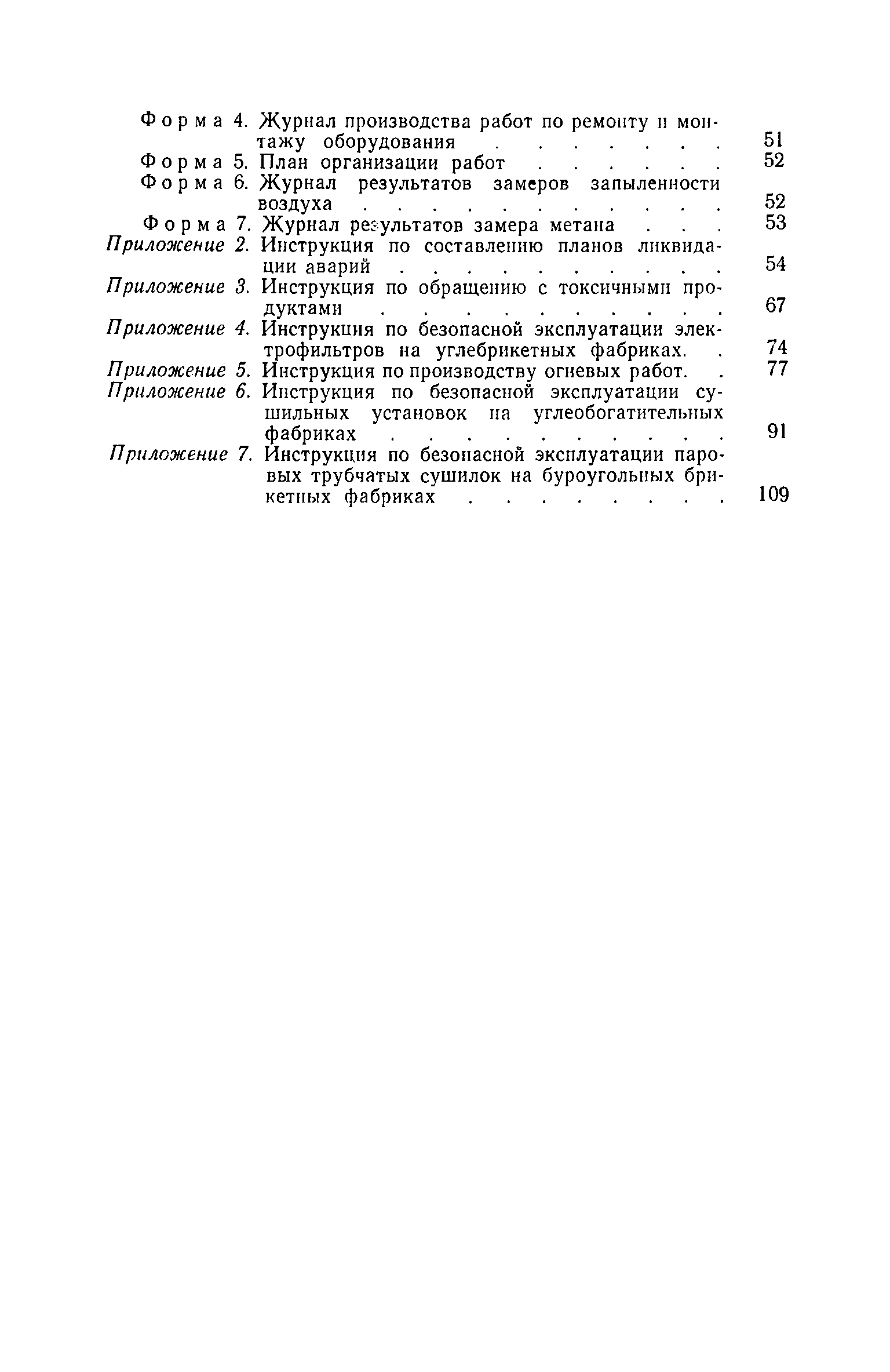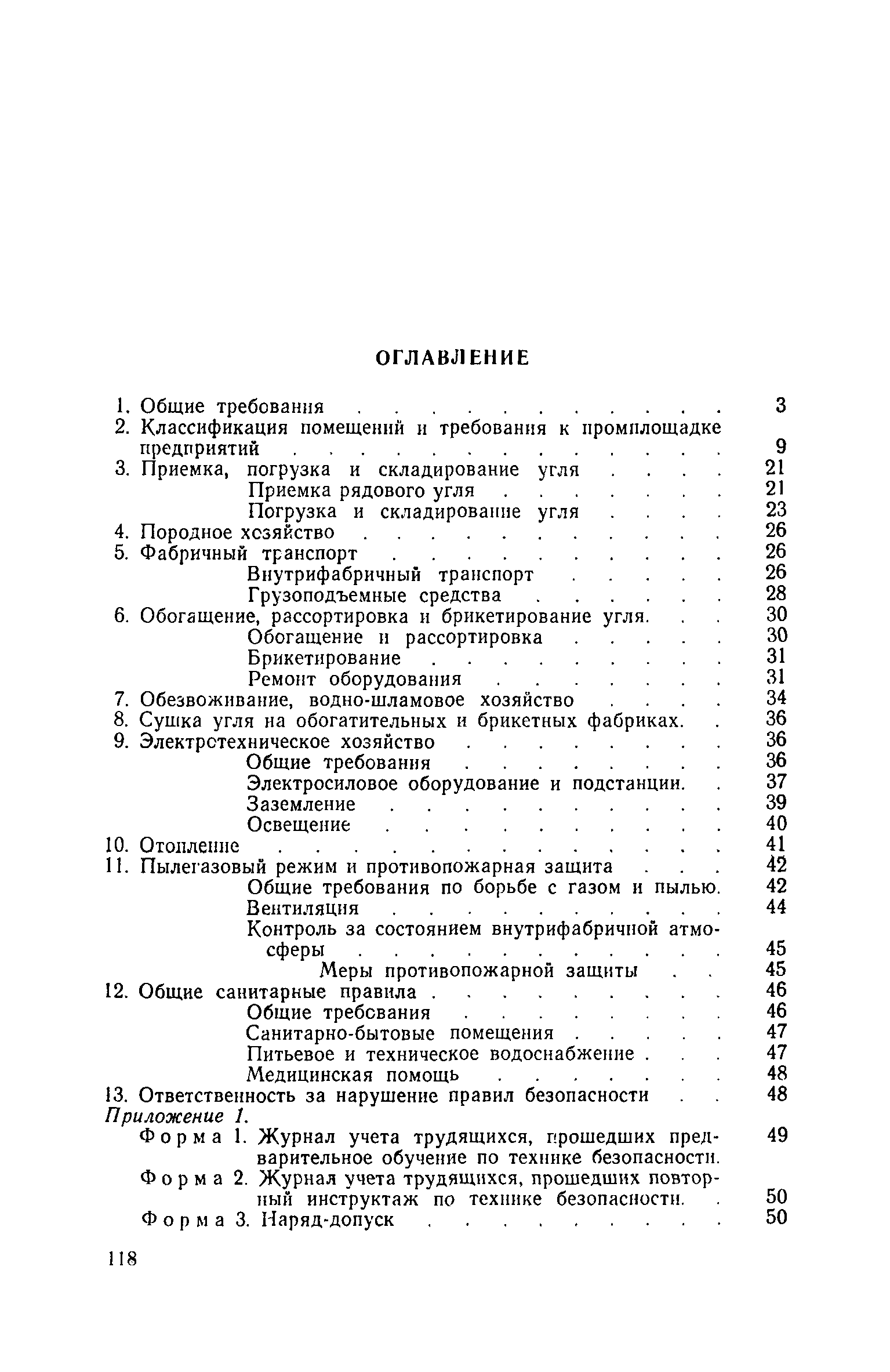 | Оглавление: | 1. Общие требования 2. Классификация помещений и требования к промплощадке предприятий 3. Приемка, погрузка и складирование угля Приемка рядового угля Погрузка и складирование угля 4. Породное хозяйство 5. Фабричный транспорт Внутрифабричный транспорт Грузоподъемные средства 6. Обогащение, рассортировка н брикетирование угля Обогащение н рассортировка Брикетирование Ремонт оборудования 7. Обезвоживание, водно-шламовое хозяйство 8. Сушка угля на обогатительных в брикетных фабриках 9. Электротехническое хозяйство Общие требования Электросиловое оборудование и подстанции. Заземление Освещение 10. Отопление 11. Пылегазовый режим и противопожарная защита Общие требования по борьбе с газом в пылью Вентиляция Контроль за состоянием внутрифабричной атмосферы Меры противопожарной защиты 12. Общие санитарные правила Общие требования Санитарно-бытовые помещения Питьевое и техническое водоснабжение Медицинская помощь 13. Ответственность за нарушение правил безопасности . Приложение 1. Журнал учета трудящихся, прошедших предварительное обучение по технике безопасности. Приложение 2. Инструкция по составлению планов ликвидации аварий Приложение 3. Инструкция по обращению с токсичными продуктами Приложение 4. Инструкция по безопасной эксплуатации электрофильтров на углебрикетных фабриках. Приложение 5. Инструкция по производству огневых работ Приложение 6. Инструкция по безопасной эксплуатации сушильных установок на углеобогатительных фабриках Приложение 7. Инструкция по безопасной эксплуатации паровых трубчатых сушилок на буроугольных брикетных фабриках |