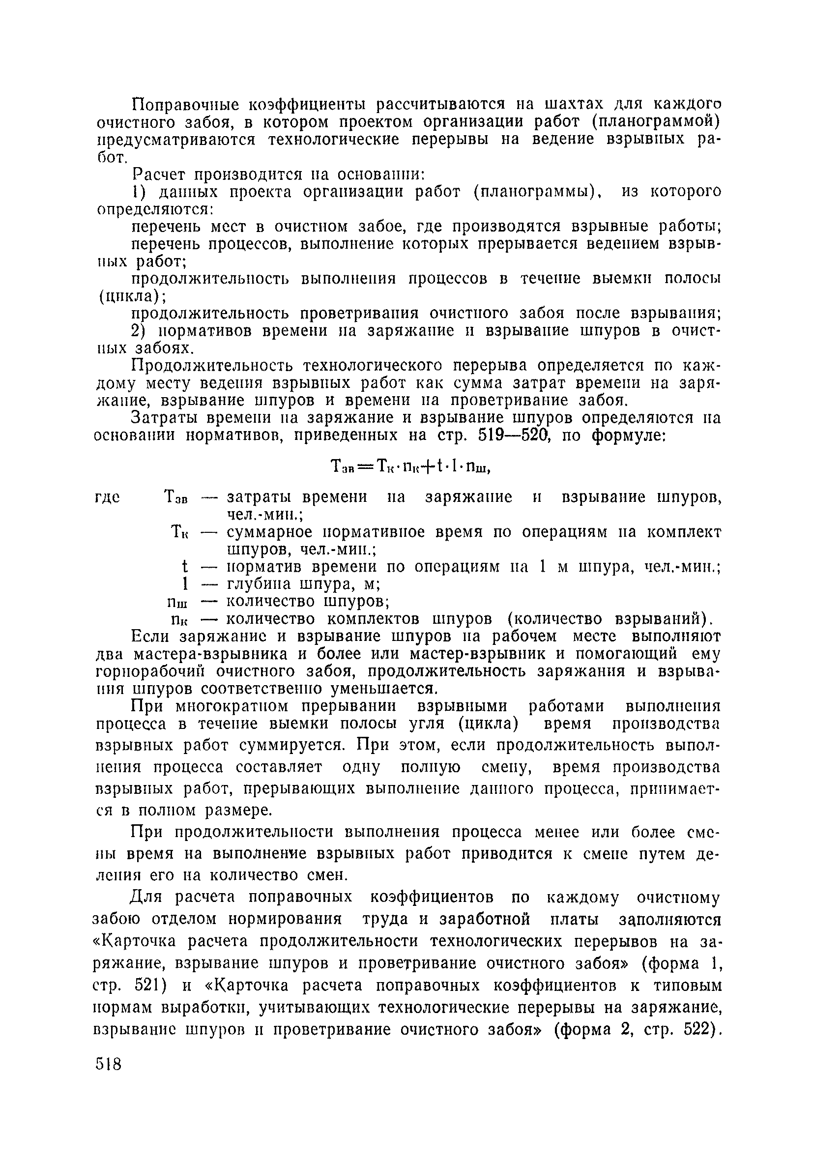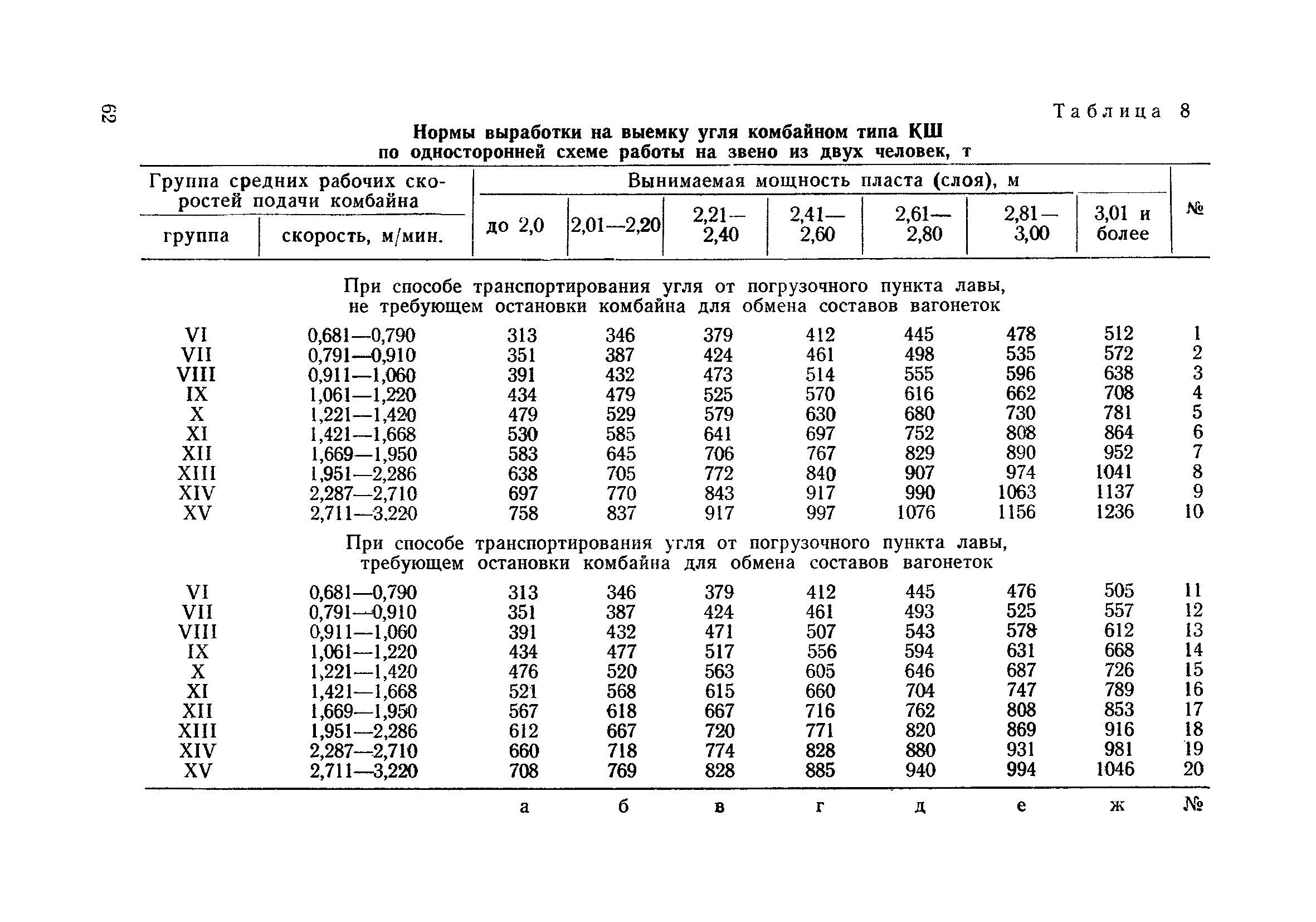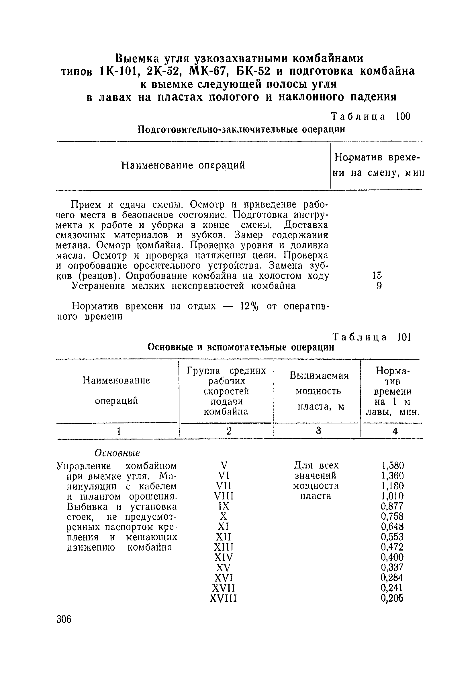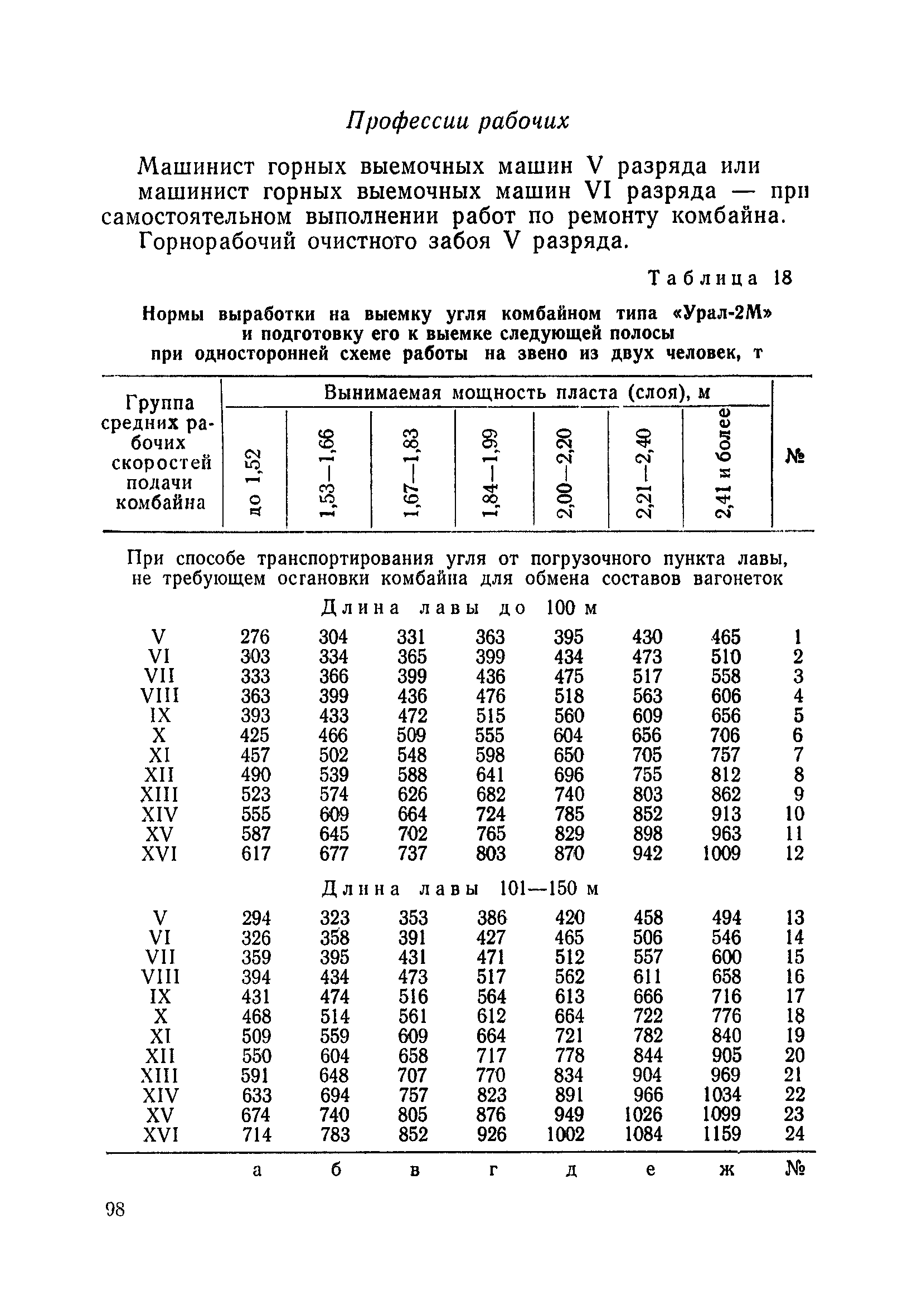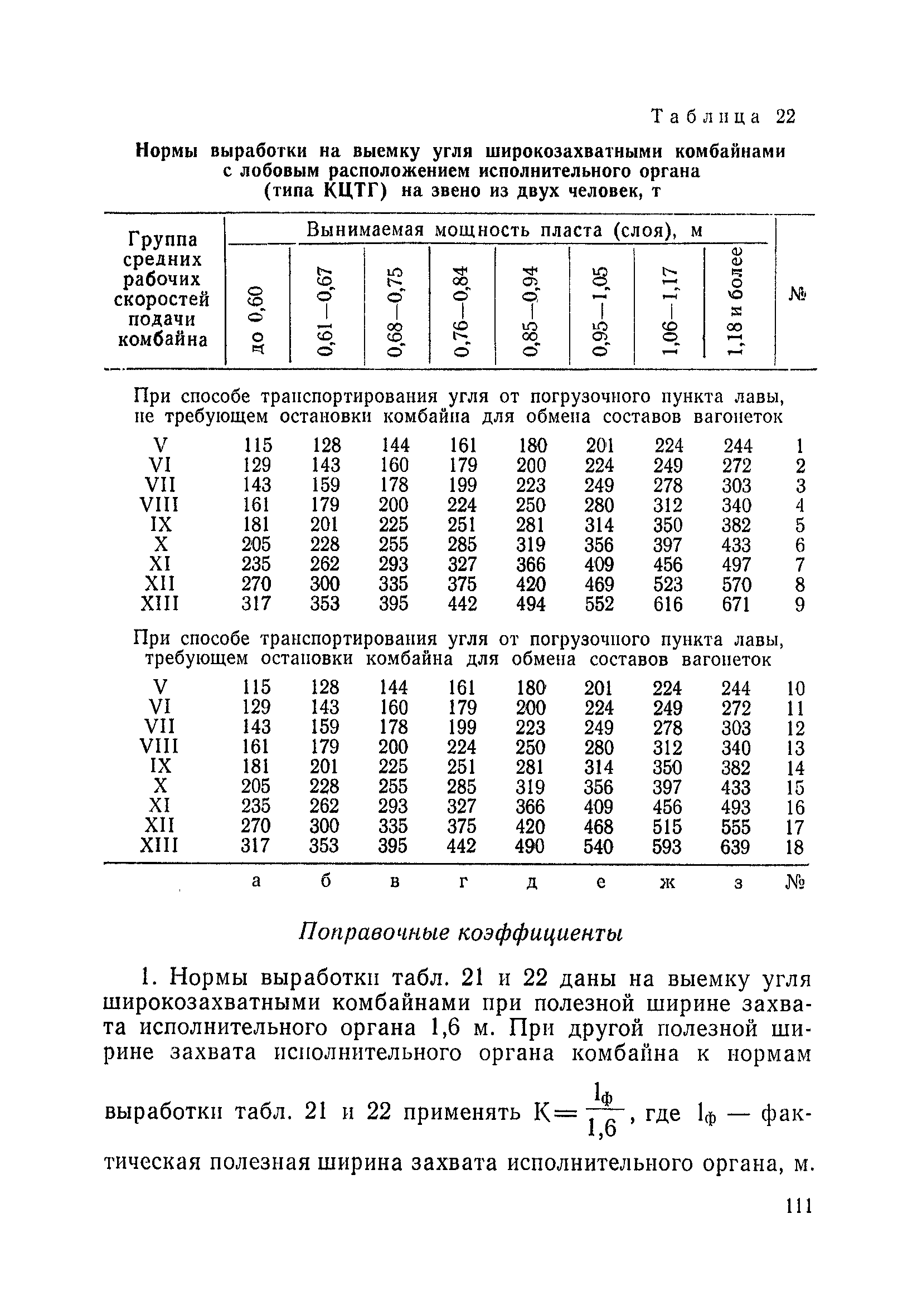 Типовые нормы выработки на очистные работы (кроме агрегатных) для угольных шахт| Статус: | справочные материалы, мп, тпр | | Название рус.: | Типовые нормы выработки на очистные работы (кроме агрегатных) для угольных шахт | | Дата добавления в базу: | 01.01.2019 | | Дата актуализации: | 01.01.2021 | | Область применения: | Типовые нормы выработки на очистные работы для угольных шахт рекомендуются для использования в качестве основы при разработке единых отраслевых и бассейновых норм выработки, а также для применения на предприятиях как местных технически обоснованных норм после утверждения их руководством по согласованию с соответствующим комитетом профсоюза и нормативно-исследовательской станцией производственного объединения (комбината) | | Оглавление: | Общая часть Техническая часть Нормативная часть Глава I. Типовые нормы выработки § 1. Выемка угля агрегатами типа АЩ (АНЩ) в лавах на пластах крутого падения § 2. Выемка угля очистными механизированными комплексами типа КГД в лавах на пластах крутого падения § 3. Передвижка гидрофицированной посадочной крепи «Спутник» § 4. Выемка угля в лавах, оборудованных струговыми установками § 5. Оформление забоя после выемки угля струговыми установками § 6. Передвижка гидродомкратов конвейерного става при выемке угля струговыми установками § 7. Выемка угля узкозахватным комбайном типа КШ и подготовка его к выемке следующей полосы угля § 8. Оформление забоя после выемки угля узкозахватным комбайном типа КШ § 9. Выемка угля узкозахватными комбайнами типов 1К-101, 2К-52, МК-67, БК-52 и подготовка комбайна к выемке следующей полосы угля в лавах на пластах пологого и наклонного падения § 10. Оформление забоя после выемки угля узкозахватными комбайнами типов 1К-101, 2К-52, МК-67 и ВК-52 § 11. Выемка угля комбайнами типов УКР, «Темп», КТ в лавах на пластах наклонного и крутого падения § 12. Спуск (перегон) комбайнов типов УКР, «Темп», КТ в лавах на пластах наклонного и крутого падения с передвижной кран-балки § 13. Передвижка предохранительной лебедки 1ЛГКН § 14. Оформление забоя после выемки угля комбайнами типов УКР, «Темп», КТ в лавах на пластах наклонного падения § 15. Выемка угля в лавах комбайном типа «Урал-2М» и подготовка его к выемке следующей полосы угля § 16. Оформление забоя после выемки угля комбайном типа «Урал-2М» § 17. Выемка угля широкозахватными комбайнами в лавах на пологих и наклонных пластах § 18. Демонтаж, монтаж, перегон и разворот широкозахватных комбайнов в лавах на пологих и наклонных пластах § 19. Оформление забоев после выемки угля широкозахватными комбайнами § 20. Зарубка угля в лавах врубовыми машинами § 21. Перегон (спуск) врубовых машин § 22. Навалоотбойка, навалка угля § 23. Бурение шпуров по углю ручными электросверлами (пневмосверлами) в лавах и камерах § 24. Бурение длинных шпуров ручными электросверлами с принудительной подачей при безлюдной выемке угля на пластах крутого падения § 25. Уборка угля в очистных забоях с помощью скреперной установки § 26. Передвижка скреперной установки § 27. Выемка угля отбойными молотками § 28. Выемка угля с применением ВМ в очистных забоях на пластах крутого падения § 29. Выемка угля под жесткими и эластичными щитами § 30. Выемка угля под арочными щитами § 31. Крепление очистных забоев металлическими (клиновыми и гидравлическими) стойками на пластах пологого и наклонного падения § 32. К