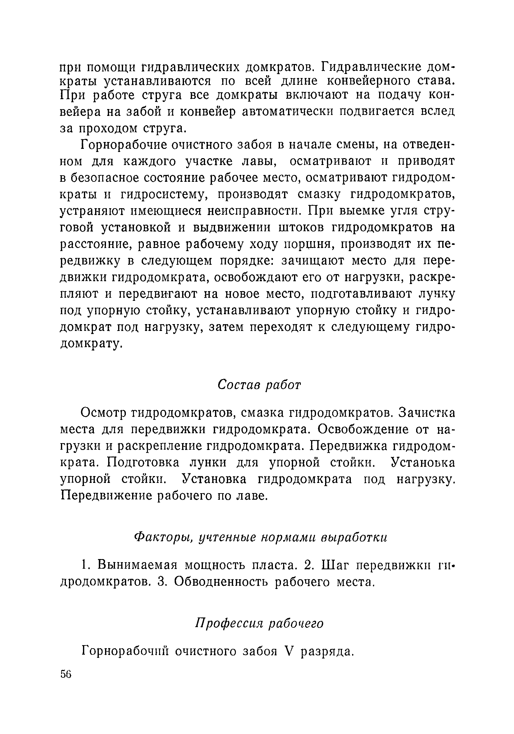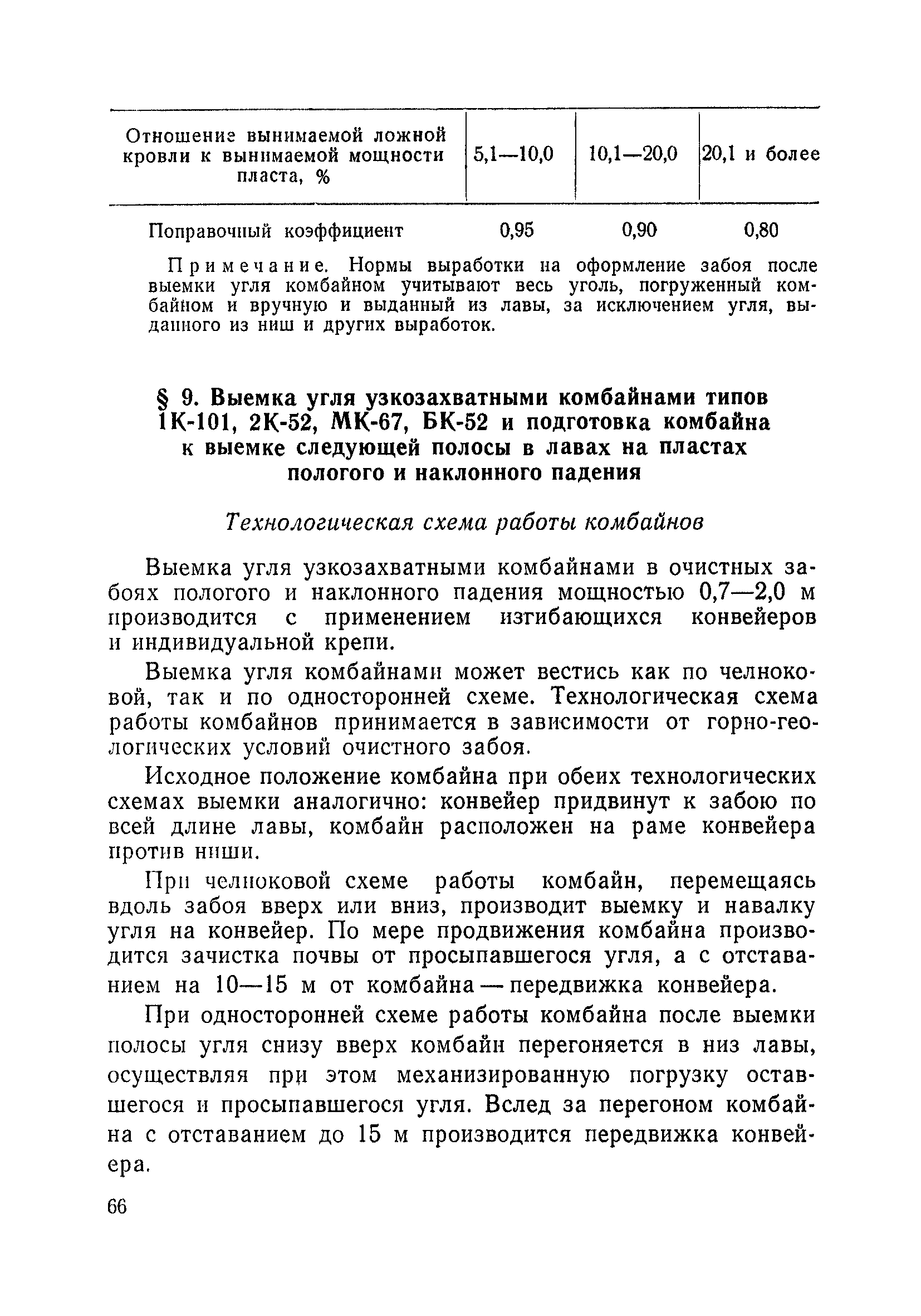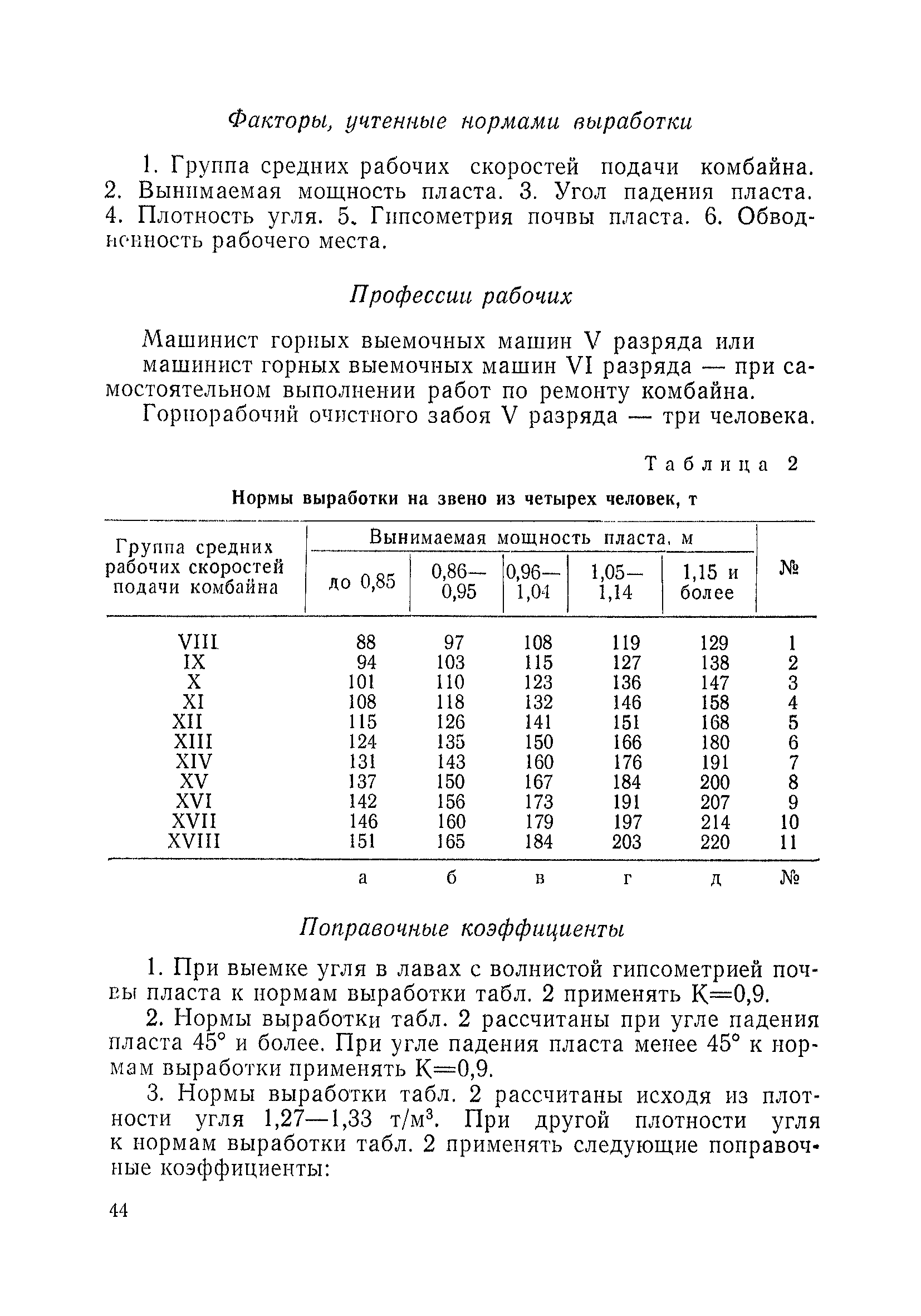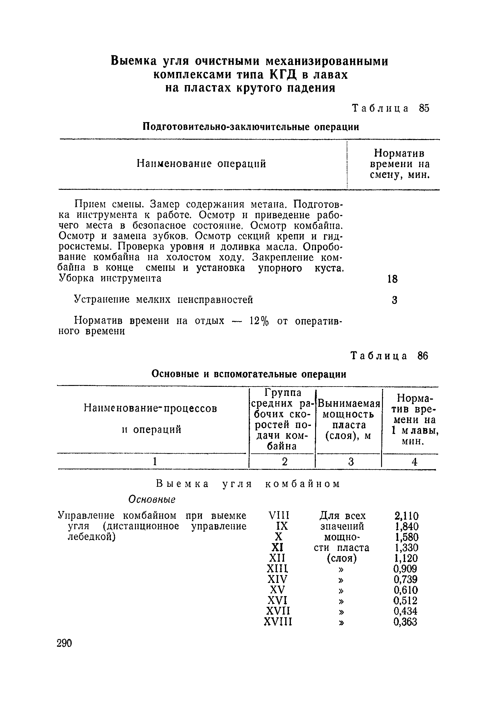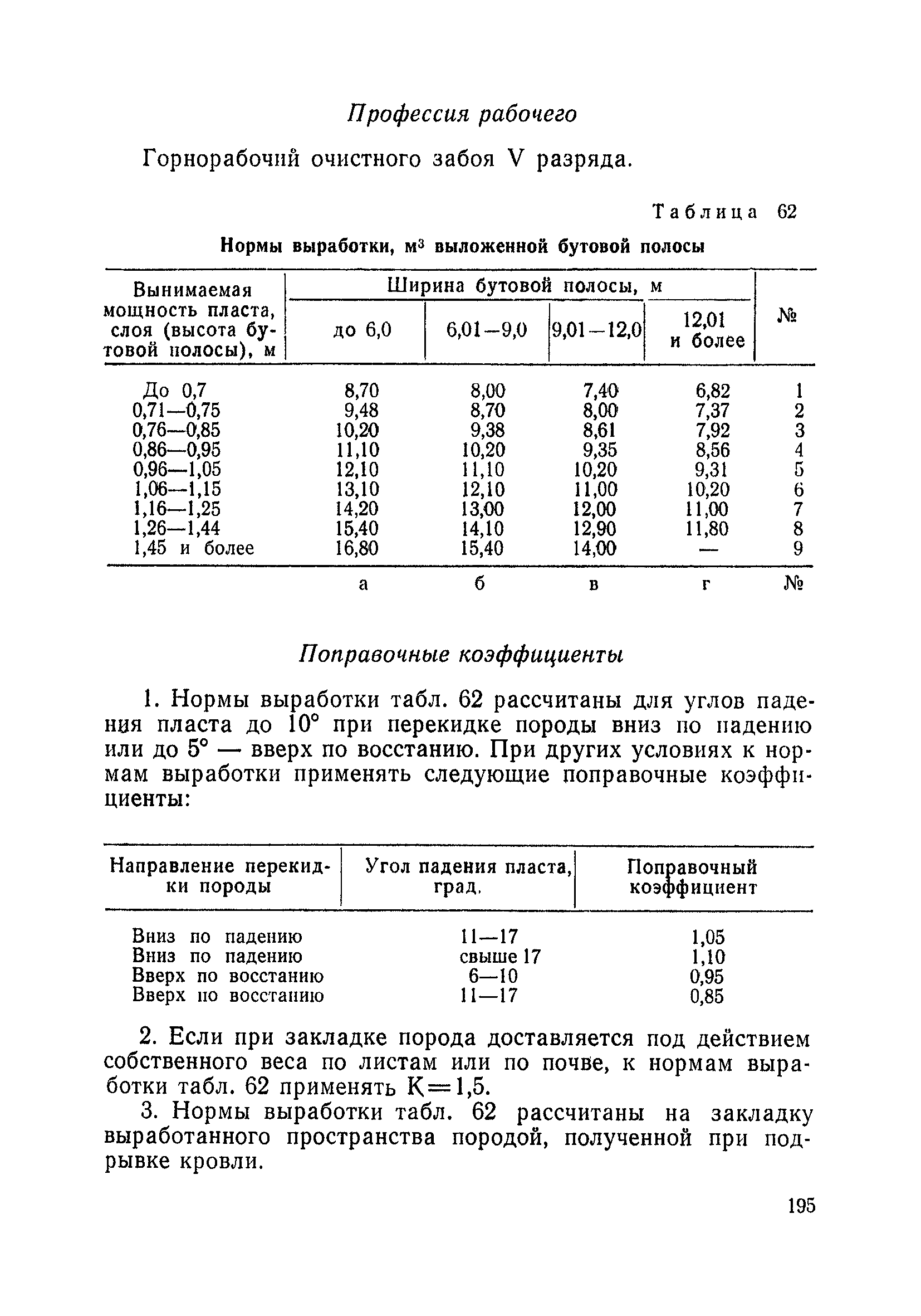 Типовые нормы выработки на очистные работы (кроме агрегатных) для угольных шахт| Статус: | справочные материалы, мп, тпр | | Название рус.: | Типовые нормы выработки на очистные работы (кроме агрегатных) для угольных шахт | | Дата добавления в базу: | 01.01.2019 | | Дата актуализации: | 01.01.2021 | | Область применения: | Типовые нормы выработки на очистные работы для угольных шахт рекомендуются для использования в качестве основы при разработке единых отраслевых и бассейновых норм выработки, а также для применения на предприятиях как местных технически обоснованных норм после утверждения их руководством по согласованию с соответствующим комитетом профсоюза и нормативно-исследовательской станцией производственного объединения (комбината) | | Оглавление: | Общая часть Техническая часть Нормативная часть Глава I. Типовые нормы выработки § 1. Выемка угля агрегатами типа АЩ (АНЩ) в лавах на пластах крутого падения § 2. Выемка угля очистными механизированными комплексами типа КГД в лавах на пластах крутого падения § 3. Передвижка гидрофицированной посадочной крепи «Спутник» § 4. Выемка угля в лавах, оборудованных струговыми установками § 5. Оформление забоя после выемки угля струговыми установками § 6. Передвижка гидродомкратов конвейерного става при выемке угля струговыми установками § 7. Выемка угля узкозахватным комбайном типа КШ и подготовка его к выемке следующей полосы угля § 8. Оформление забоя после выемки угля узкозахватным комбайном типа КШ § 9. Выемка угля узкозахватными комбайнами типов 1К-101, 2К-52, МК-67, БК-52 и подготовка комбайна к выемке следующей полосы угля в лавах на пластах пологого и наклонного падения § 10. Оформление забоя после выемки угля узкозахватными комбайнами типов 1К-101, 2К-52, МК-67 и ВК-52 § 11. Выемка угля комбайнами типов УКР, «Темп», КТ в лавах на пластах наклонного и крутого падения § 12. Спуск (перегон) комбайнов типов УКР, «Темп», КТ в лавах на пластах наклонного и крутого падения с передвижной кран-балки § 13. Передвижка предохранительной лебедки 1ЛГКН § 14. Оформление забоя после выемки угля комбайнами типов УКР, «Темп», КТ в лавах на пластах наклонного падения § 15. Выемка угля в лавах комбайном типа «Урал-2М» и подготовка его к выемке следующей полосы угля § 16. Оформление забоя после выемки угля комбайном типа «Урал-2М» § 17. Выемка угля широкозахватными комбайнами в лавах на пологих и наклонных пластах § 18. Демонтаж, монтаж, перегон и разворот широкозахватных комбайнов в лавах на пологих и наклонных пластах § 19. Оформление забоев после выемки угля широкозахватными комбайнами § 20. Зарубка угля в лавах врубовыми машинами § 21. Перегон (спуск) врубовых машин § 22. Навалоотбойка, навалка угля § 23. Бурение шпуров по углю ручными электросверлами (пневмосверлами) в лавах и камерах § 24. Бурение длинных шпуров ручными электросверлами с принудительной подачей при безлюдной выемке угля на пластах крутого падения § 25. Уборка угля в очистных забоях с помощью скреперной установки § 26. Передвижка скреперной установки § 27. Выемка угля отбойными молотками § 28. Выемка угля с применением ВМ в очистных забоях на пластах крутого падения § 29. Выемка угля под жесткими и эластичными щитами § 30. Выемка угля под арочными щитами § 31. Крепление очистных забоев металлическими (клиновыми и гидравлическими) стойками на пластах пологого и наклонного падения § 32. К