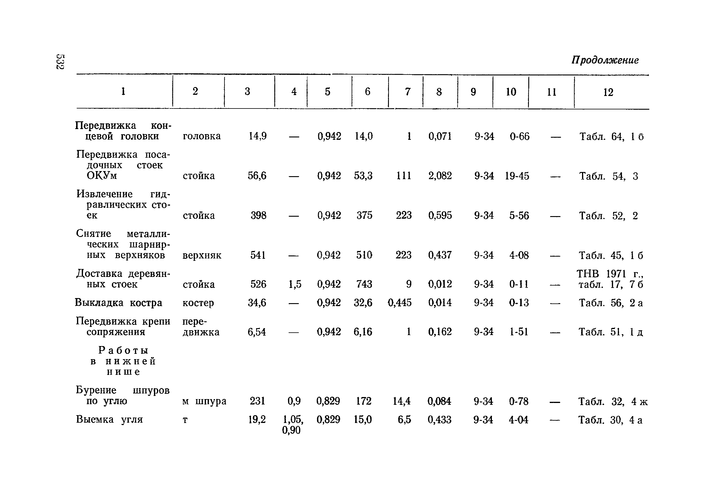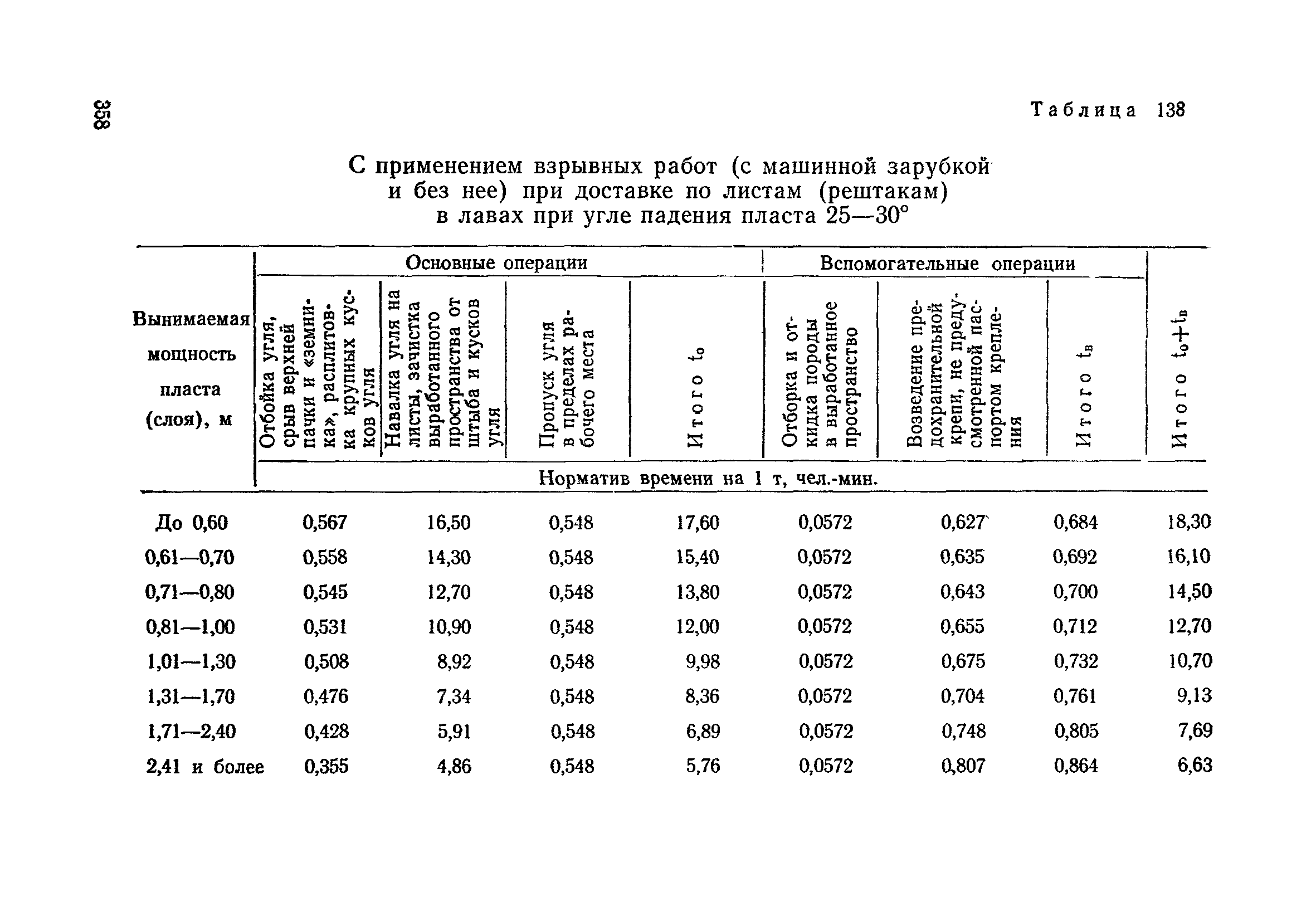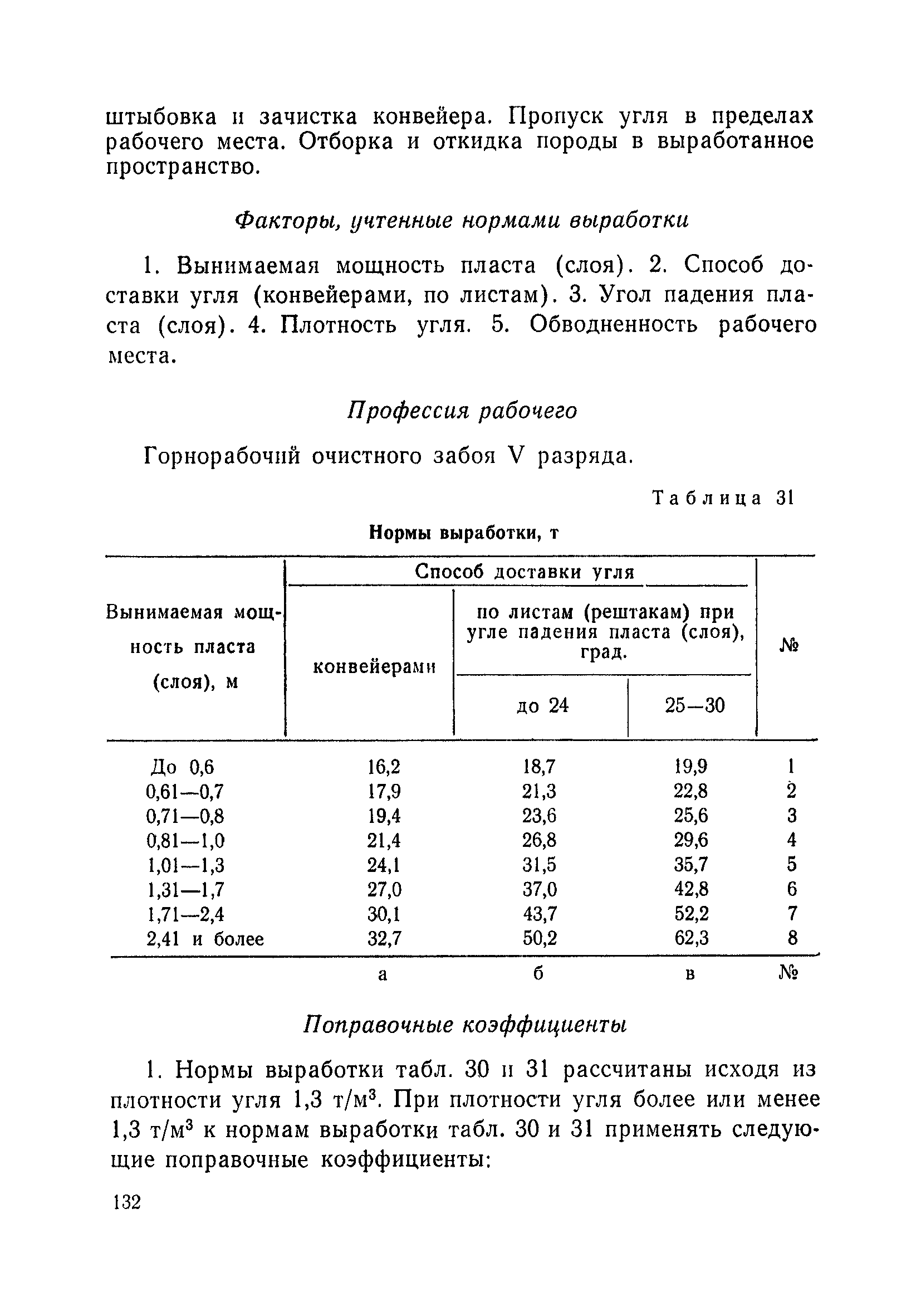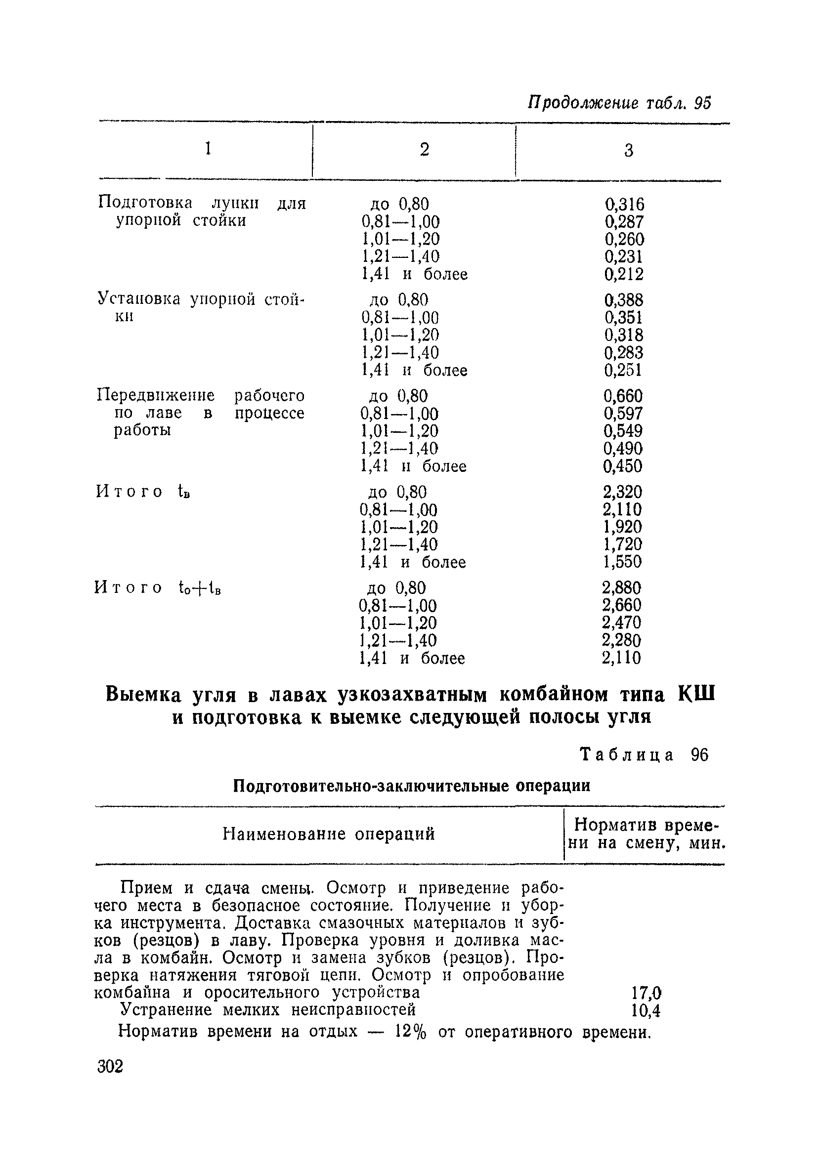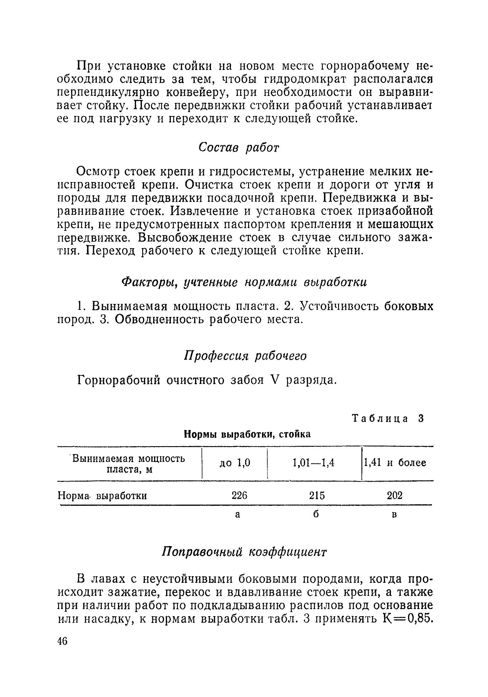 Типовые нормы выработки на очистные работы (кроме агрегатных) для угольных шахт| Статус: | справочные материалы, мп, тпр | | Название рус.: | Типовые нормы выработки на очистные работы (кроме агрегатных) для угольных шахт | | Дата добавления в базу: | 01.01.2019 | | Дата актуализации: | 01.01.2021 | | Область применения: | Типовые нормы выработки на очистные работы для угольных шахт рекомендуются для использования в качестве основы при разработке единых отраслевых и бассейновых норм выработки, а также для применения на предприятиях как местных технически обоснованных норм после утверждения их руководством по согласованию с соответствующим комитетом профсоюза и нормативно-исследовательской станцией производственного объединения (комбината) | | Оглавление: | Общая часть Техническая часть Нормативная часть Глава I. Типовые нормы выработки § 1. Выемка угля агрегатами типа АЩ (АНЩ) в лавах на пластах крутого падения § 2. Выемка угля очистными механизированными комплексами типа КГД в лавах на пластах крутого падения § 3. Передвижка гидрофицированной посадочной крепи «Спутник» § 4. Выемка угля в лавах, оборудованных струговыми установками § 5. Оформление забоя после выемки угля струговыми установками § 6. Передвижка гидродомкратов конвейерного става при выемке угля струговыми установками § 7. Выемка угля узкозахватным комбайном типа КШ и подготовка его к выемке следующей полосы угля § 8. Оформление забоя после выемки угля узкозахватным комбайном типа КШ § 9. Выемка угля узкозахватными комбайнами типов 1К-101, 2К-52, МК-67, БК-52 и подготовка комбайна к выемке следующей полосы угля в лавах на пластах пологого и наклонного падения § 10. Оформление забоя после выемки угля узкозахватными комбайнами типов 1К-101, 2К-52, МК-67 и ВК-52 § 11. Выемка угля комбайнами типов УКР, «Темп», КТ в лавах на пластах наклонного и крутого падения § 12. Спуск (перегон) комбайнов типов УКР, «Темп», КТ в лавах на пластах наклонного и крутого падения с передвижной кран-балки § 13. Передвижка предохранительной лебедки 1ЛГКН § 14. Оформление забоя после выемки угля комбайнами типов УКР, «Темп», КТ в лавах на пластах наклонного падения § 15. Выемка угля в лавах комбайном типа «Урал-2М» и подготовка его к выемке следующей полосы угля § 16. Оформление забоя после выемки угля комбайном типа «Урал-2М» § 17. Выемка угля широкозахватными комбайнами в лавах на пологих и наклонных пластах § 18. Демонтаж, монтаж, перегон и разворот широкозахватных комбайнов в лавах на пологих и наклонных пластах § 19. Оформление забоев после выемки угля широкозахватными комбайнами § 20. Зарубка угля в лавах врубовыми машинами § 21. Перегон (спуск) врубовых машин § 22. Навалоотбойка, навалка угля § 23. Бурение шпуров по углю ручными электросверлами (пневмосверлами) в лавах и камерах § 24. Бурение длинных шпуров ручными электросверлами с принудительной подачей при безлюдной выемке угля на пластах крутого падения § 25. Уборка угля в очистных забоях с помощью скреперной установки § 26. Передвижка скреперной установки § 27. Выемка угля отбойными молотками § 28. Выемка угля с применением ВМ в очистных забоях на пластах крутого падения § 29. Выемка угля под жесткими и эластичными щитами § 30. Выемка угля под арочными щитами § 31. Крепление очистных забоев металлическими (клиновыми и гидравлическими) стойками на пластах пологого и наклонного падения § 32. К