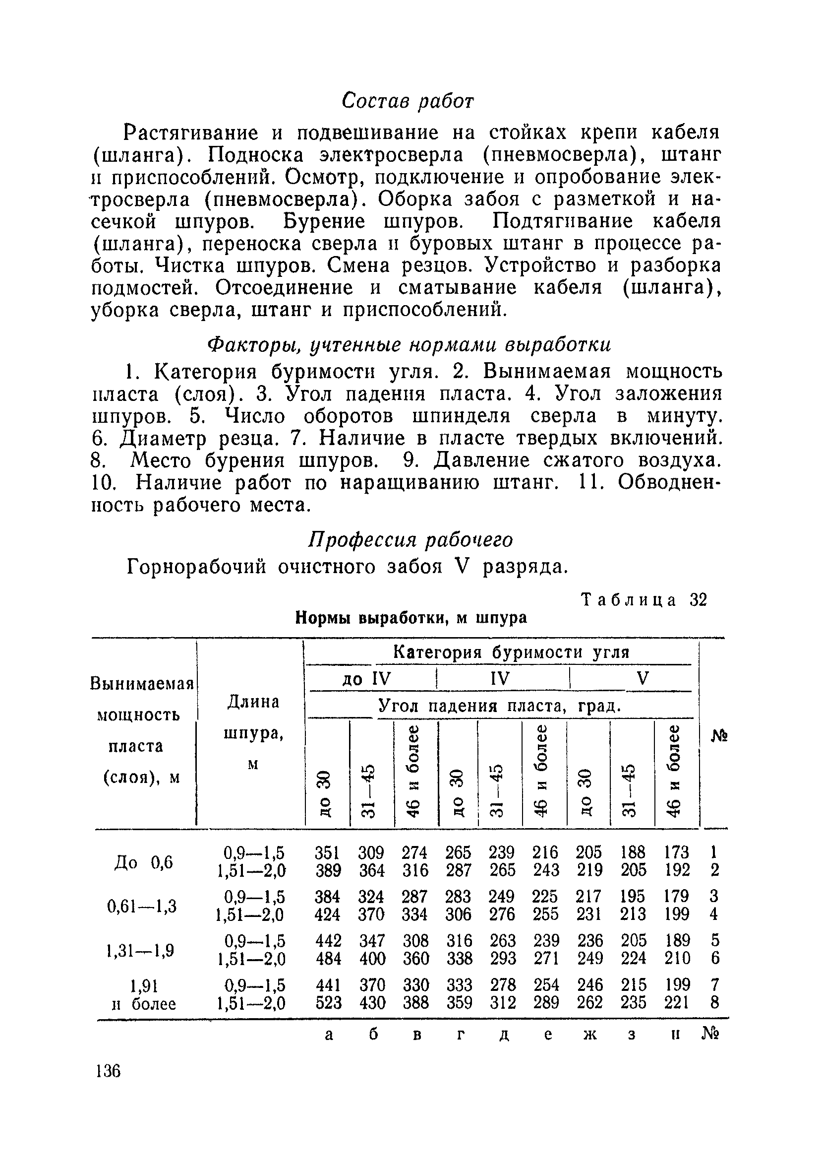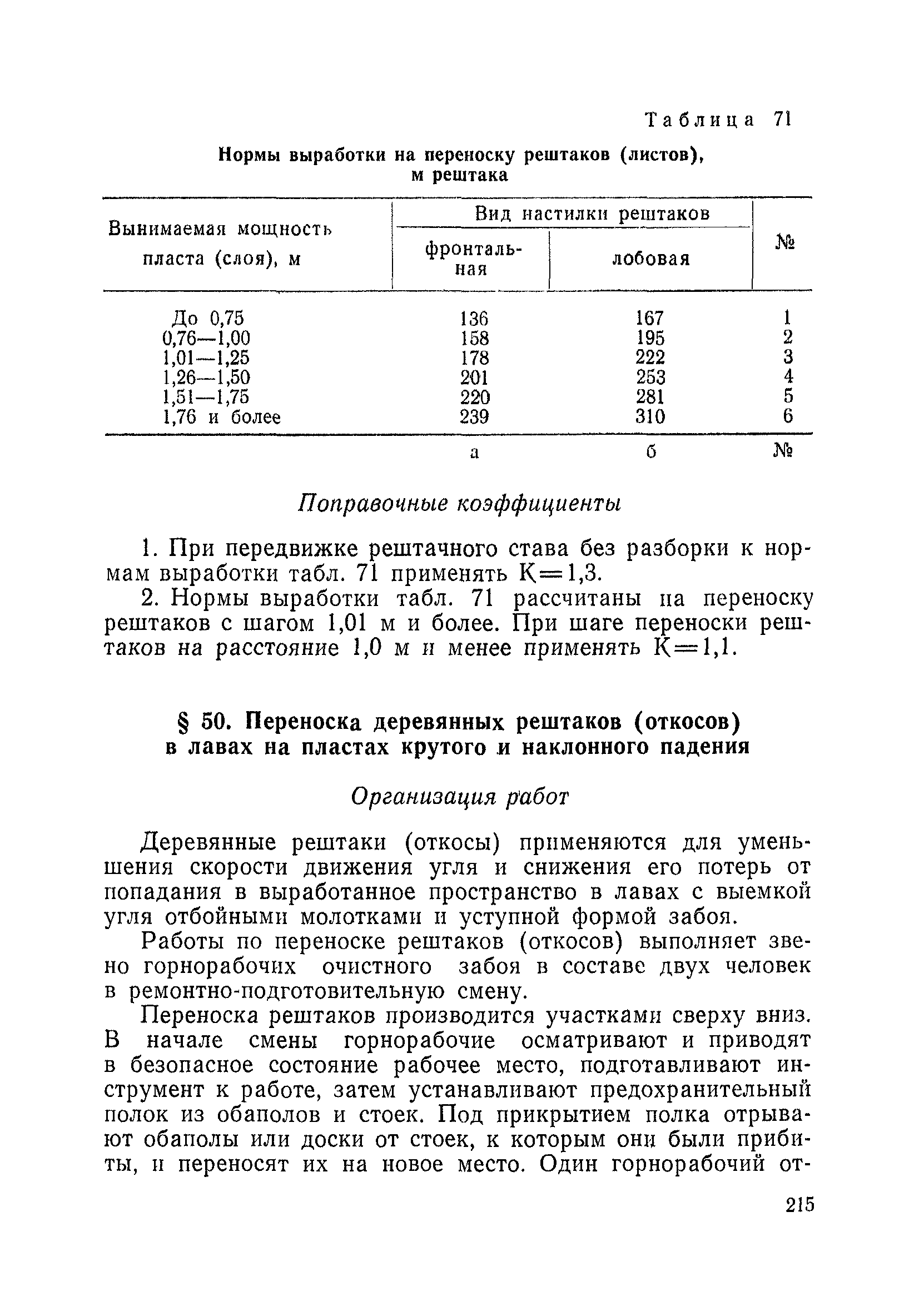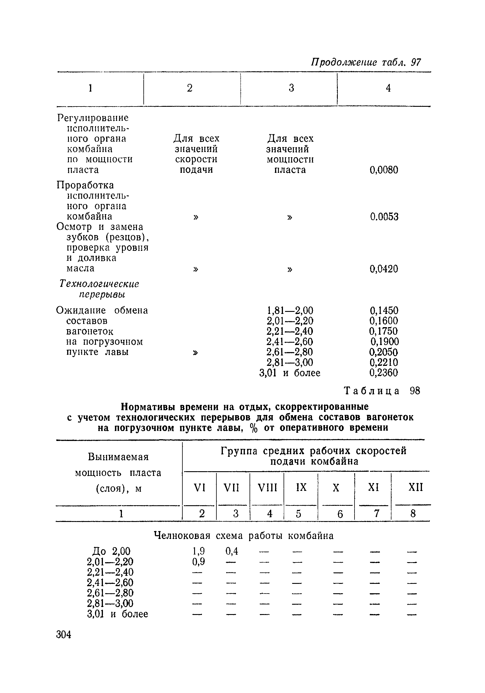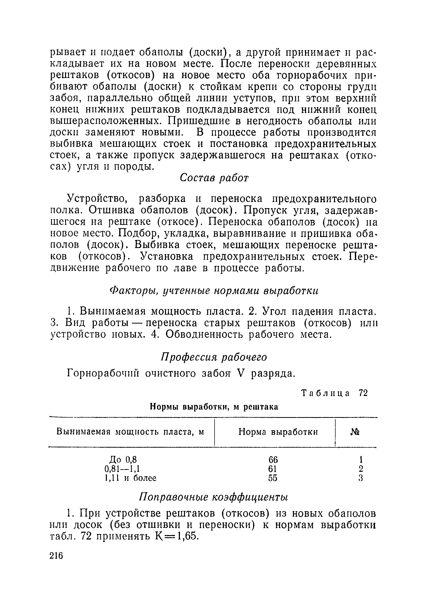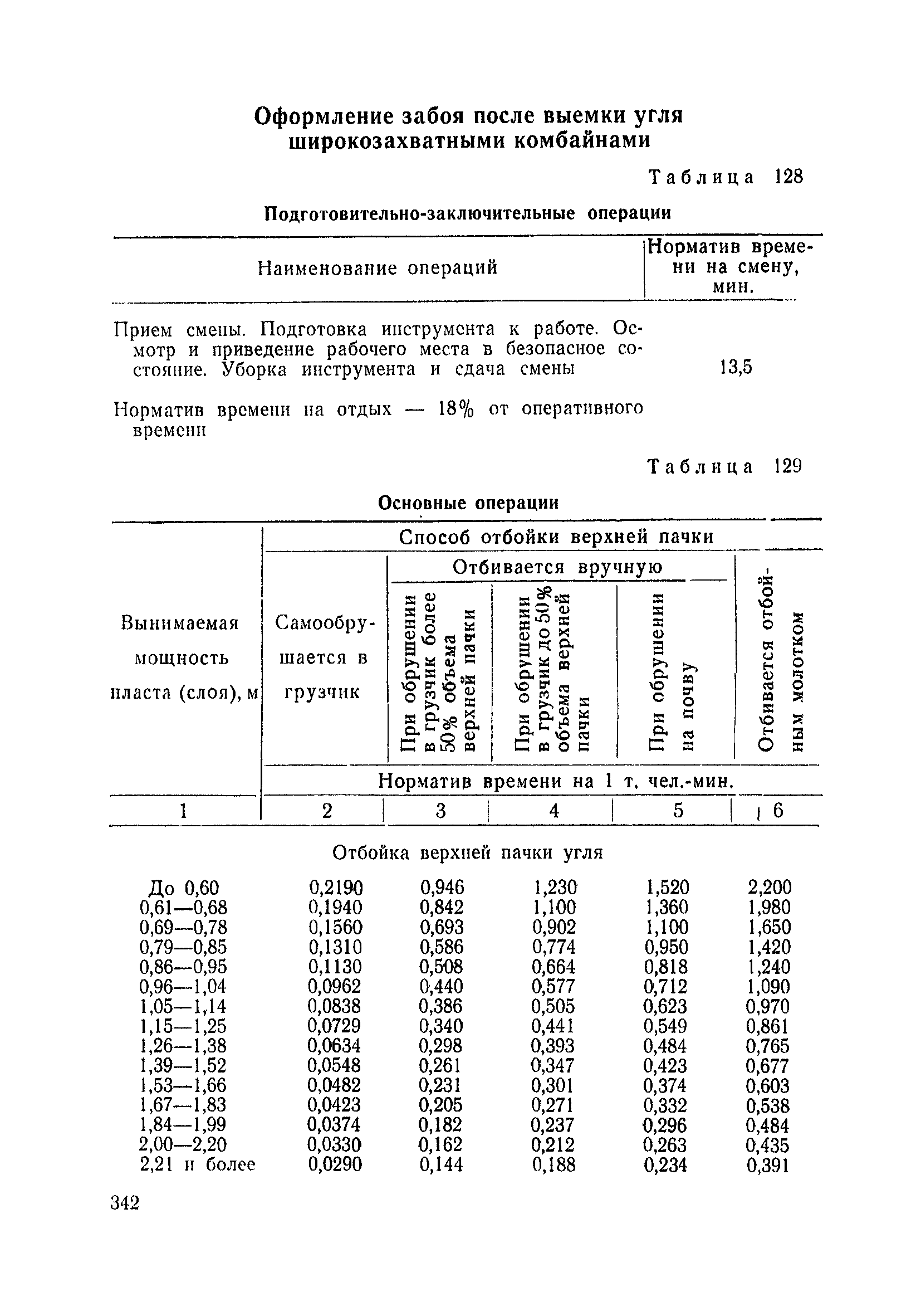 Типовые нормы выработки на очистные работы (кроме агрегатных) для угольных шахт| Статус: | справочные материалы, мп, тпр | | Название рус.: | Типовые нормы выработки на очистные работы (кроме агрегатных) для угольных шахт | | Дата добавления в базу: | 01.01.2019 | | Дата актуализации: | 01.01.2021 | | Область применения: | Типовые нормы выработки на очистные работы для угольных шахт рекомендуются для использования в качестве основы при разработке единых отраслевых и бассейновых норм выработки, а также для применения на предприятиях как местных технически обоснованных норм после утверждения их руководством по согласованию с соответствующим комитетом профсоюза и нормативно-исследовательской станцией производственного объединения (комбината) | | Оглавление: | Общая часть Техническая часть Нормативная часть Глава I. Типовые нормы выработки § 1. Выемка угля агрегатами типа АЩ (АНЩ) в лавах на пластах крутого падения § 2. Выемка угля очистными механизированными комплексами типа КГД в лавах на пластах крутого падения § 3. Передвижка гидрофицированной посадочной крепи «Спутник» § 4. Выемка угля в лавах, оборудованных струговыми установками § 5. Оформление забоя после выемки угля струговыми установками § 6. Передвижка гидродомкратов конвейерного става при выемке угля струговыми установками § 7. Выемка угля узкозахватным комбайном типа КШ и подготовка его к выемке следующей полосы угля § 8. Оформление забоя после выемки угля узкозахватным комбайном типа КШ § 9. Выемка угля узкозахватными комбайнами типов 1К-101, 2К-52, МК-67, БК-52 и подготовка комбайна к выемке следующей полосы угля в лавах на пластах пологого и наклонного падения § 10. Оформление забоя после выемки угля узкозахватными комбайнами типов 1К-101, 2К-52, МК-67 и ВК-52 § 11. Выемка угля комбайнами типов УКР, «Темп», КТ в лавах на пластах наклонного и крутого падения § 12. Спуск (перегон) комбайнов типов УКР, «Темп», КТ в лавах на пластах наклонного и крутого падения с передвижной кран-балки § 13. Передвижка предохранительной лебедки 1ЛГКН § 14. Оформление забоя после выемки угля комбайнами типов УКР, «Темп», КТ в лавах на пластах наклонного падения § 15. Выемка угля в лавах комбайном типа «Урал-2М» и подготовка его к выемке следующей полосы угля § 16. Оформление забоя после выемки угля комбайном типа «Урал-2М» § 17. Выемка угля широкозахватными комбайнами в лавах на пологих и наклонных пластах § 18. Демонтаж, монтаж, перегон и разворот широкозахватных комбайнов в лавах на пологих и наклонных пластах § 19. Оформление забоев после выемки угля широкозахватными комбайнами § 20. Зарубка угля в лавах врубовыми машинами § 21. Перегон (спуск) врубовых машин § 22. Навалоотбойка, навалка угля § 23. Бурение шпуров по углю ручными электросверлами (пневмосверлами) в лавах и камерах § 24. Бурение длинных шпуров ручными электросверлами с принудительной подачей при безлюдной выемке угля на пластах крутого падения § 25. Уборка угля в очистных забоях с помощью скреперной установки § 26. Передвижка скреперной установки § 27. Выемка угля отбойными молотками § 28. Выемка угля с применением ВМ в очистных забоях на пластах крутого падения § 29. Выемка угля под жесткими и эластичными щитами § 30. Выемка угля под арочными щитами § 31. Крепление очистных забоев металлическими (клиновыми и гидравлическими) стойками на пластах пологого и наклонного падения § 32. К