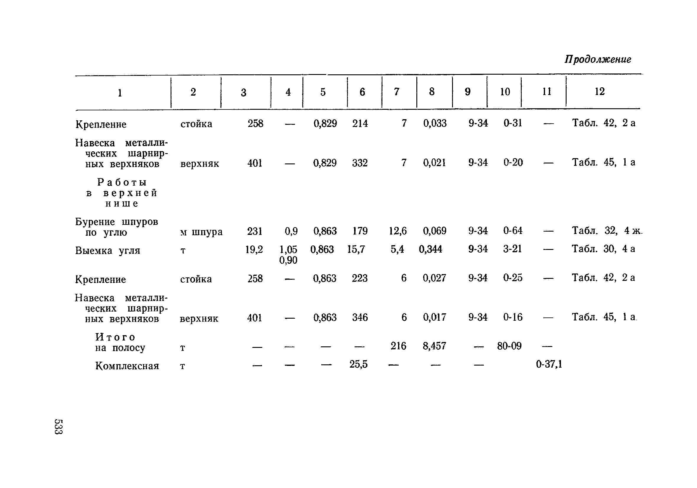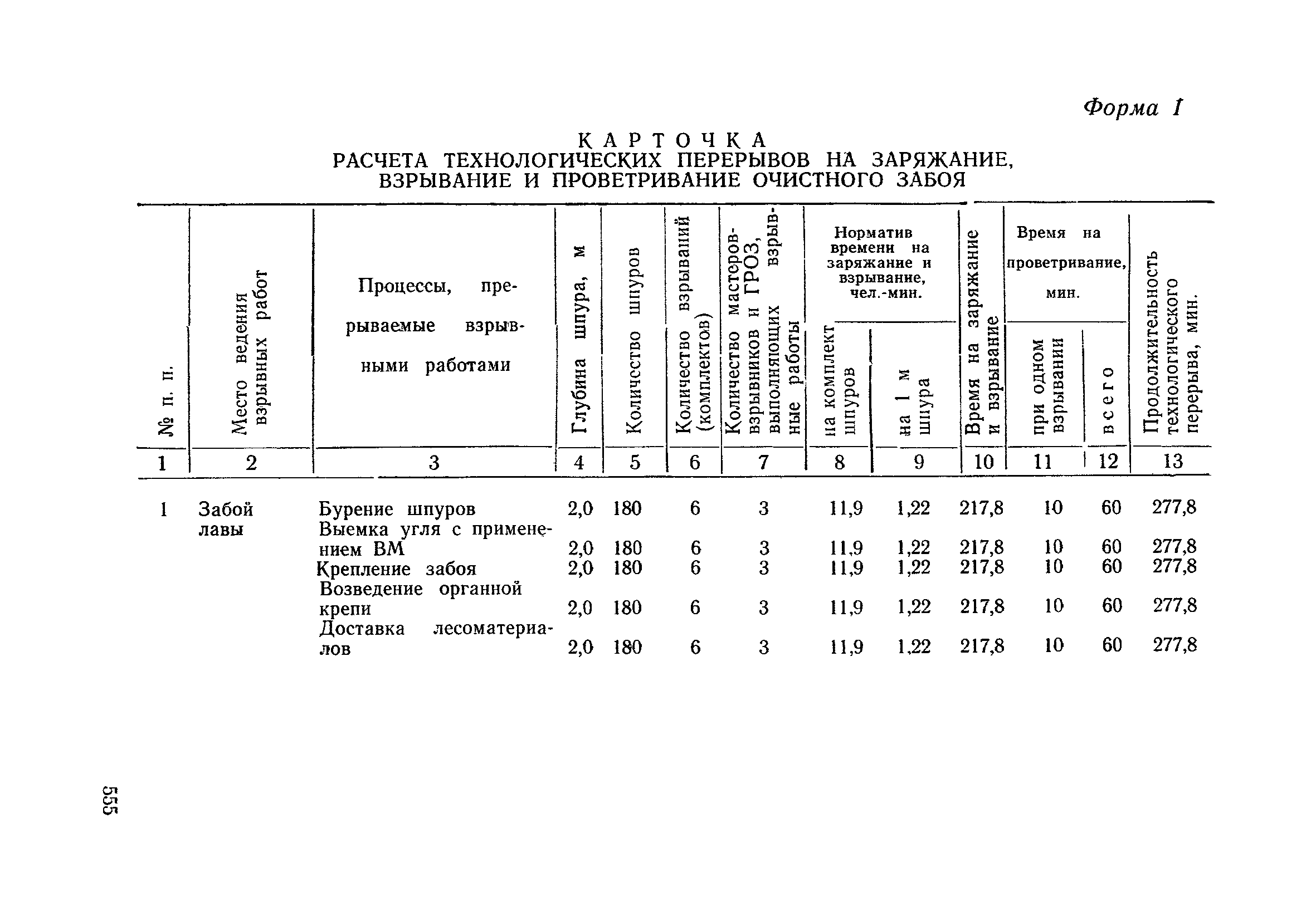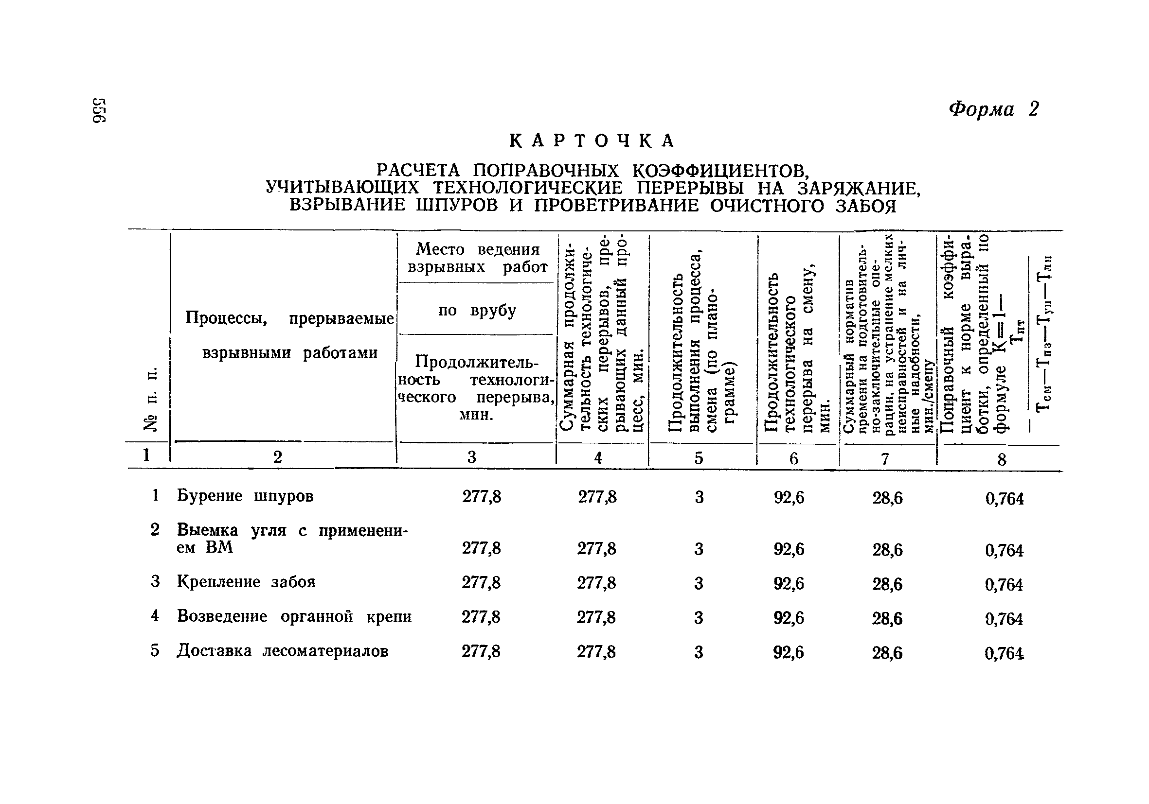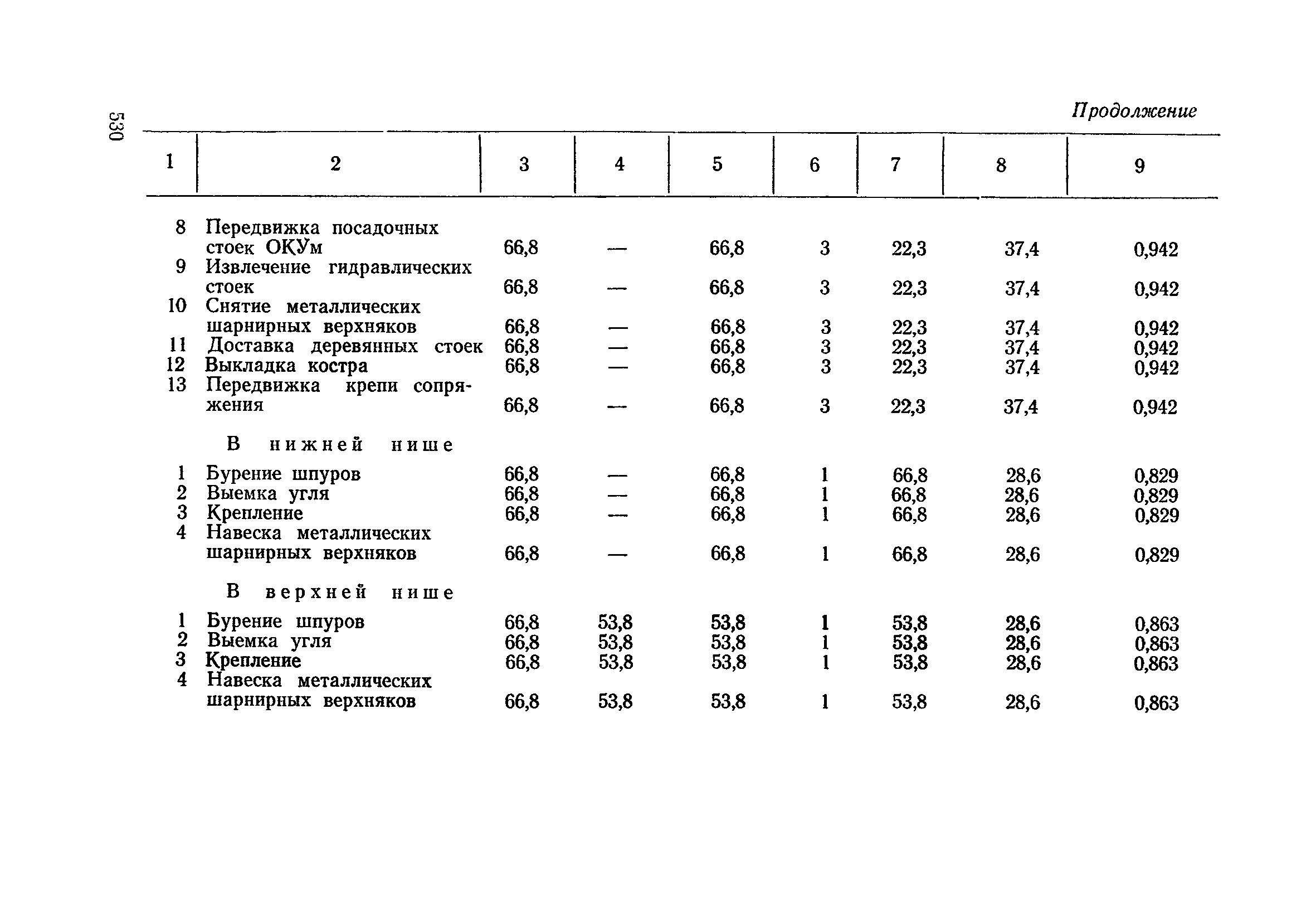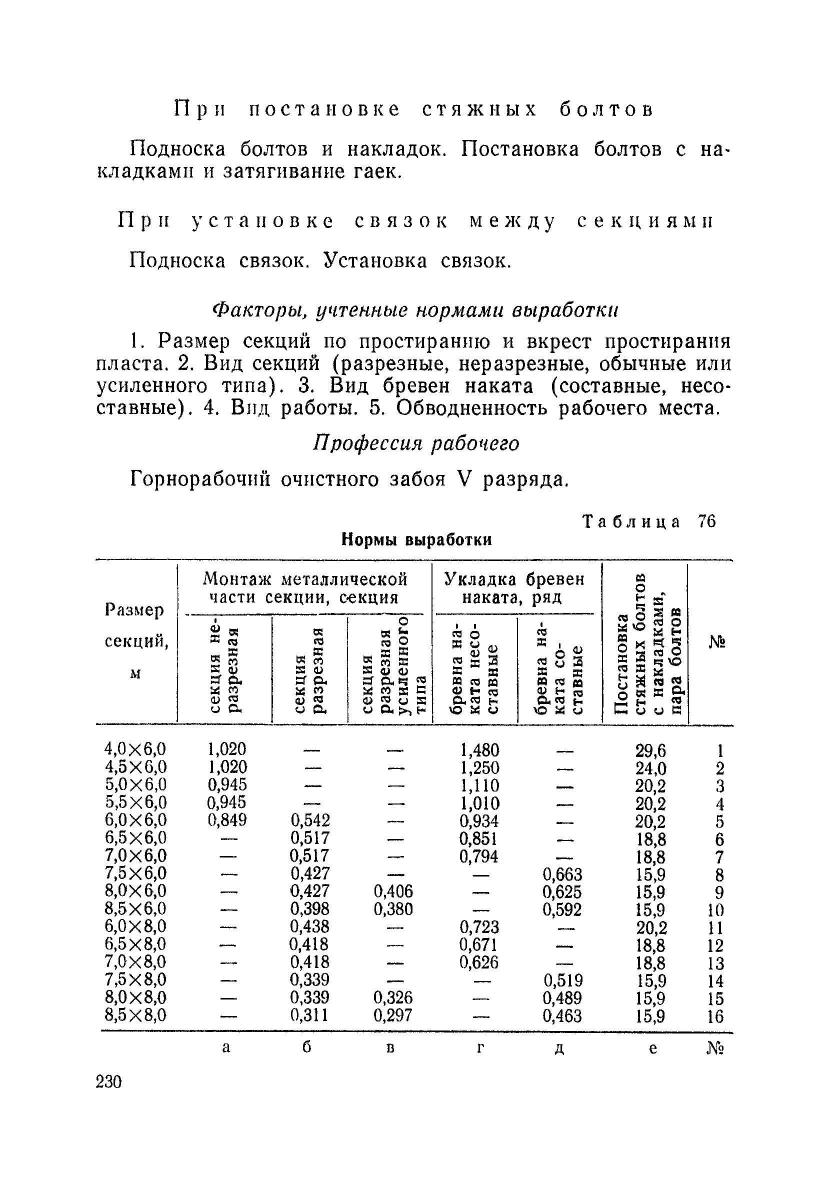 Типовые нормы выработки на очистные работы (кроме агрегатных) для угольных шахт| Статус: | справочные материалы, мп, тпр | | Название рус.: | Типовые нормы выработки на очистные работы (кроме агрегатных) для угольных шахт | | Дата добавления в базу: | 01.01.2019 | | Дата актуализации: | 01.01.2021 | | Область применения: | Типовые нормы выработки на очистные работы для угольных шахт рекомендуются для использования в качестве основы при разработке единых отраслевых и бассейновых норм выработки, а также для применения на предприятиях как местных технически обоснованных норм после утверждения их руководством по согласованию с соответствующим комитетом профсоюза и нормативно-исследовательской станцией производственного объединения (комбината) | | Оглавление: | Общая часть Техническая часть Нормативная часть Глава I. Типовые нормы выработки § 1. Выемка угля агрегатами типа АЩ (АНЩ) в лавах на пластах крутого падения § 2. Выемка угля очистными механизированными комплексами типа КГД в лавах на пластах крутого падения § 3. Передвижка гидрофицированной посадочной крепи «Спутник» § 4. Выемка угля в лавах, оборудованных струговыми установками § 5. Оформление забоя после выемки угля струговыми установками § 6. Передвижка гидродомкратов конвейерного става при выемке угля струговыми установками § 7. Выемка угля узкозахватным комбайном типа КШ и подготовка его к выемке следующей полосы угля § 8. Оформление забоя после выемки угля узкозахватным комбайном типа КШ § 9. Выемка угля узкозахватными комбайнами типов 1К-101, 2К-52, МК-67, БК-52 и подготовка комбайна к выемке следующей полосы угля в лавах на пластах пологого и наклонного падения § 10. Оформление забоя после выемки угля узкозахватными комбайнами типов 1К-101, 2К-52, МК-67 и ВК-52 § 11. Выемка угля комбайнами типов УКР, «Темп», КТ в лавах на пластах наклонного и крутого падения § 12. Спуск (перегон) комбайнов типов УКР, «Темп», КТ в лавах на пластах наклонного и крутого падения с передвижной кран-балки § 13. Передвижка предохранительной лебедки 1ЛГКН § 14. Оформление забоя после выемки угля комбайнами типов УКР, «Темп», КТ в лавах на пластах наклонного падения § 15. Выемка угля в лавах комбайном типа «Урал-2М» и подготовка его к выемке следующей полосы угля § 16. Оформление забоя после выемки угля комбайном типа «Урал-2М» § 17. Выемка угля широкозахватными комбайнами в лавах на пологих и наклонных пластах § 18. Демонтаж, монтаж, перегон и разворот широкозахватных комбайнов в лавах на пологих и наклонных пластах § 19. Оформление забоев после выемки угля широкозахватными комбайнами § 20. Зарубка угля в лавах врубовыми машинами § 21. Перегон (спуск) врубовых машин § 22. Навалоотбойка, навалка угля § 23. Бурение шпуров по углю ручными электросверлами (пневмосверлами) в лавах и камерах § 24. Бурение длинных шпуров ручными электросверлами с принудительной подачей при безлюдной выемке угля на пластах крутого падения § 25. Уборка угля в очистных забоях с помощью скреперной установки § 26. Передвижка скреперной установки § 27. Выемка угля отбойными молотками § 28. Выемка угля с применением ВМ в очистных забоях на пластах крутого падения § 29. Выемка угля под жесткими и эластичными щитами § 30. Выемка угля под арочными щитами § 31. Крепление очистных забоев металлическими (клиновыми и гидравлическими) стойками на пластах пологого и наклонного падения § 32. К