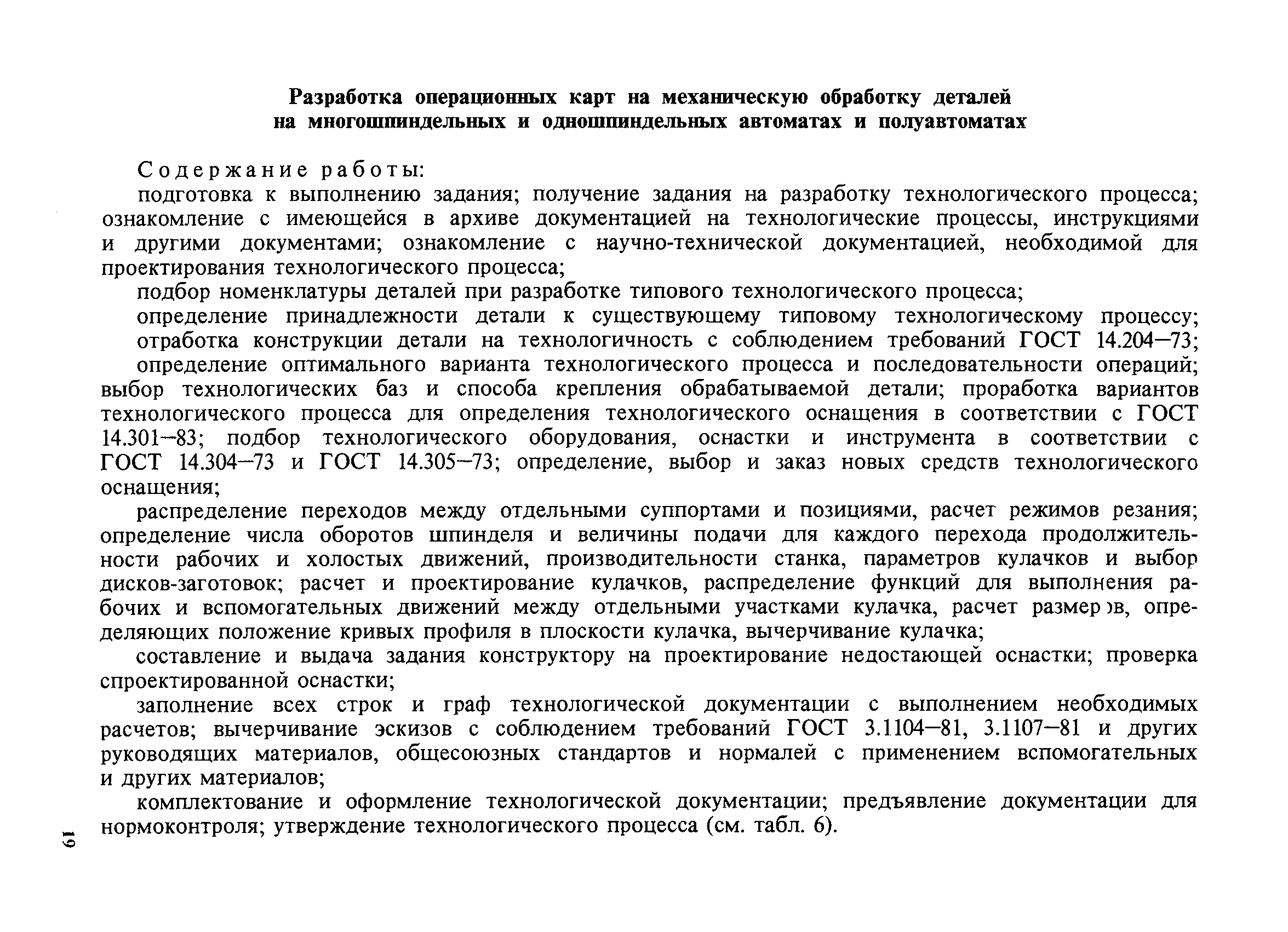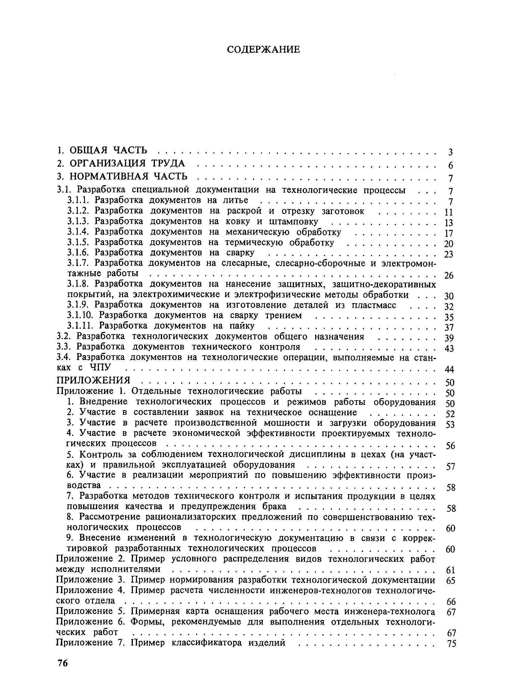 | Оглавление: | 1. Общая часть 2. Организация труда 3. Нормативная часть 3.1. Разработка специальной документации на технологические процессы 3.1.1. Разработка документов на литье 3.1.2. Разработка документов на раскрой и отрезку заготовок 3.1.3. Разработка документов на ковку и штамповку 3.1.4. Разработка документов на механическую обработку 3.1.5. Разработка документов на термическую обработку 3.1.6. Разработка документов на сварку 3.1.7. Разработка документов на слесарные, слесарно-сборочные и электромонтажные работы 3.1.8. Разработка документов на нанесение защитных, защитно-декоративных покрытий, на электрохимические и электрофизические методы обработки 3.1.9. Разработка Документов на изготовление деталей из пластмасс 3.1.10. Разработка документов на сварку трением 3.1.11. Разработка документов на пайку 3.2. Разработка технологических документов общего назначения 3.3. Разработка документов технического контроля 3.4. Разработка документов на технологические операции, выполняемые на станках с ЧПУ Приложение 1. Отдельные технологические работы 1. Внедрение технологических процессов и режимов работы оборудования 2. Участие в составлении заявок на техническое оснащение 3. Участие в расчете производственной мощности и загрузки оборудования 4. Участие в расчете экономической эффективности проектируемых технологических процессов 5. Контроль за соблюдением технологической дисциплины в цехах (на участках) и правильной эксплуатацией оборудования 6. Участие в реализации мероприятий по повышению эффективности производства 7. Разработка методов технического контроля и испытания продукции в целях повышения качества и предупреждения брака 8. Рассмотрение рационализаторских предложений по совершенствованию технологических процессов 9. Внесение изменений в технологическую документацию в связи с корректировкой разработанных технологических процессов Приложение 2. Пример условного распределения видов технологических работ между исполнителями Приложение 3. Пример нормирования разработки технологической документации Приложение 4. Пример расчета численности инженеров-технологов технологического отдела Приложение 5. Примерная карта оснащения рабочего места инженера-технолога Приложение 6. Формы, рекомендуемые для выполнения отдельных технологических работ Приложение 7. Пример классификатора изделий |