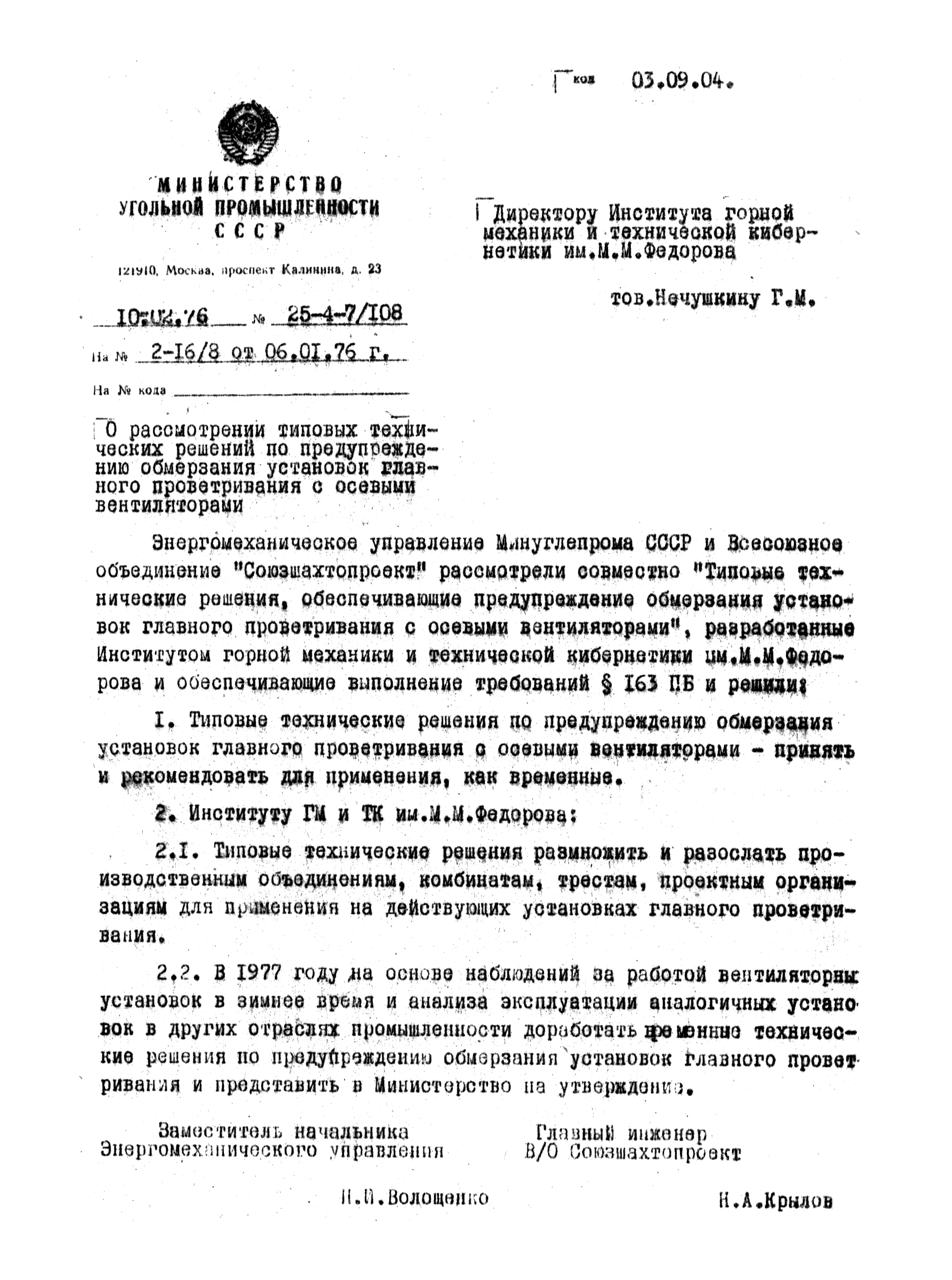 | Утверждён: | 10.02.1976 Министерство угольной промышленности СССР (USSR Ministry of the Coal Industry 25-4-7/108)