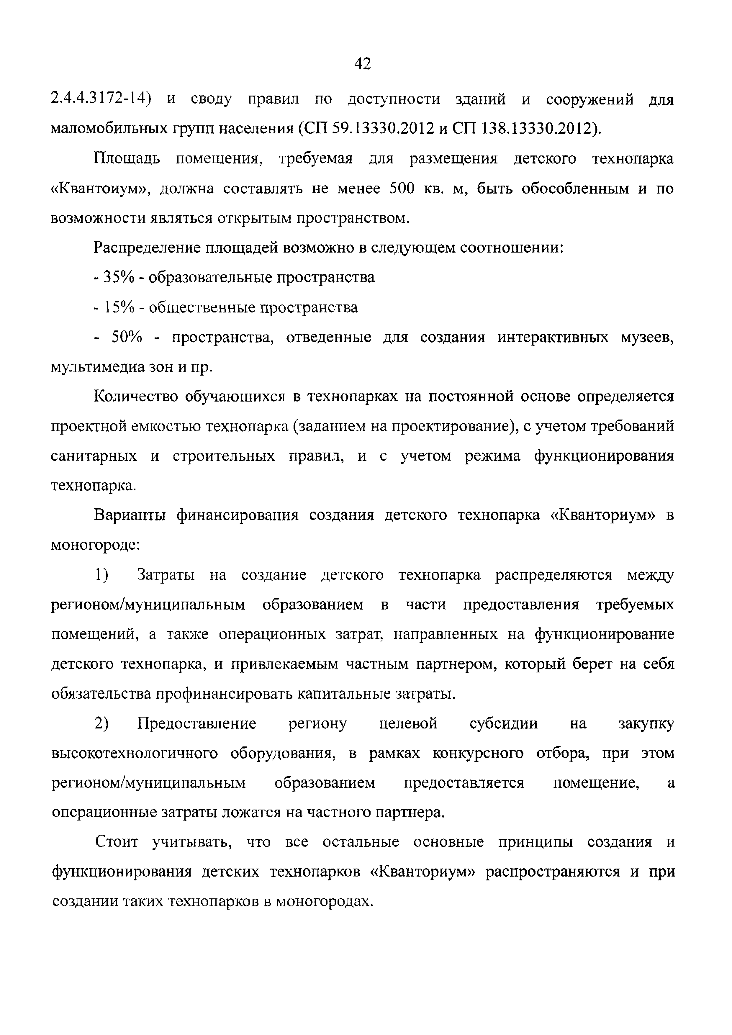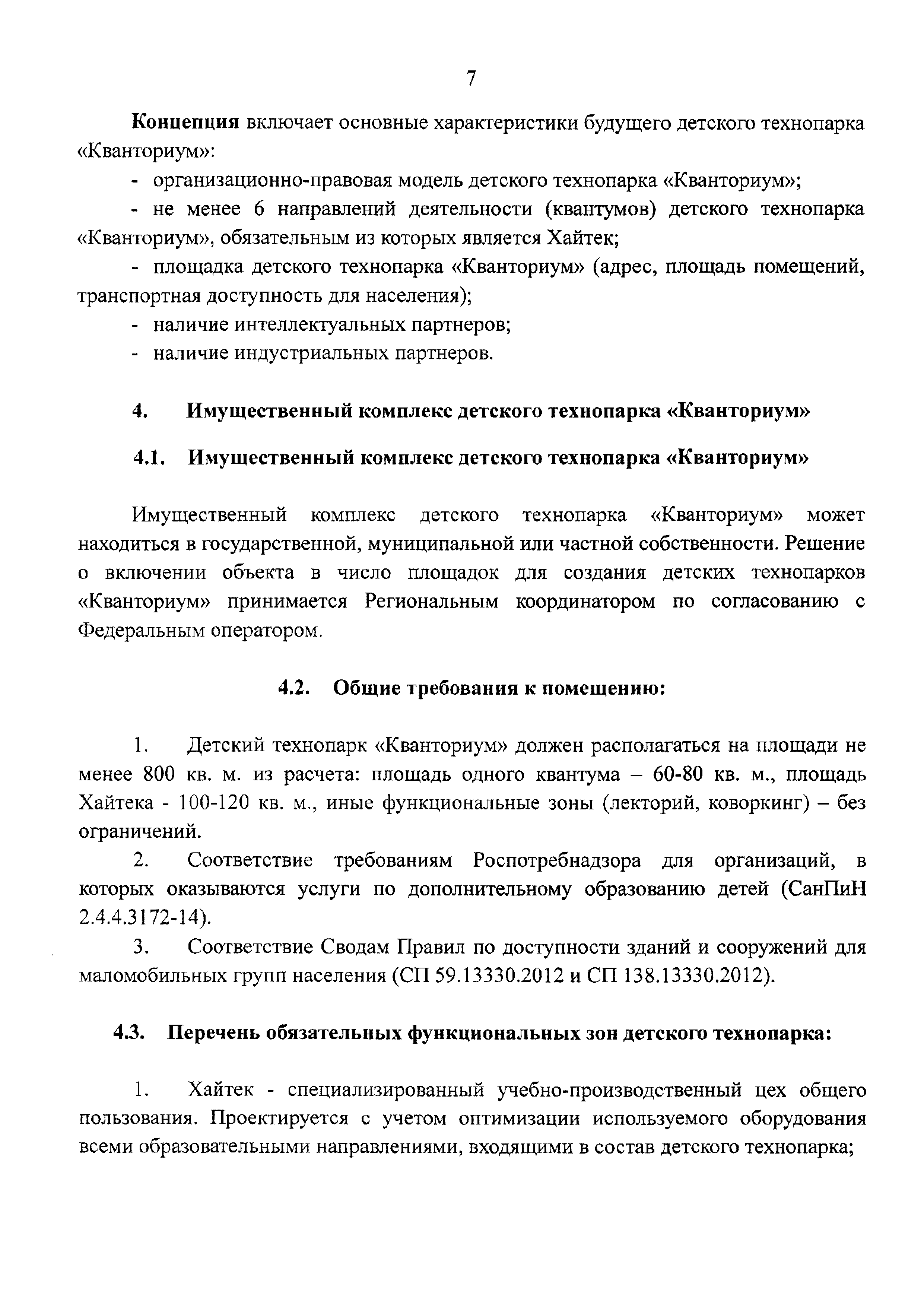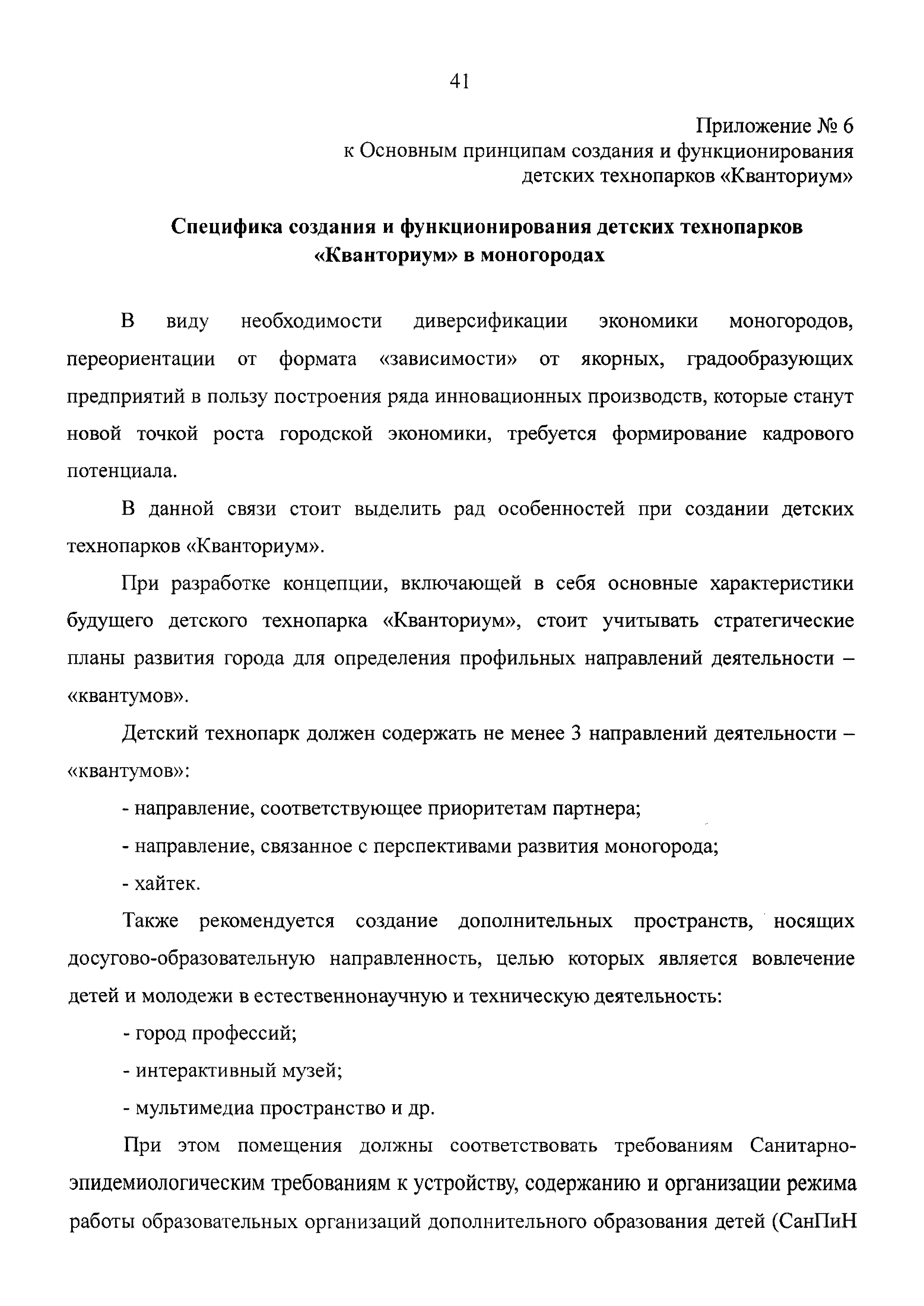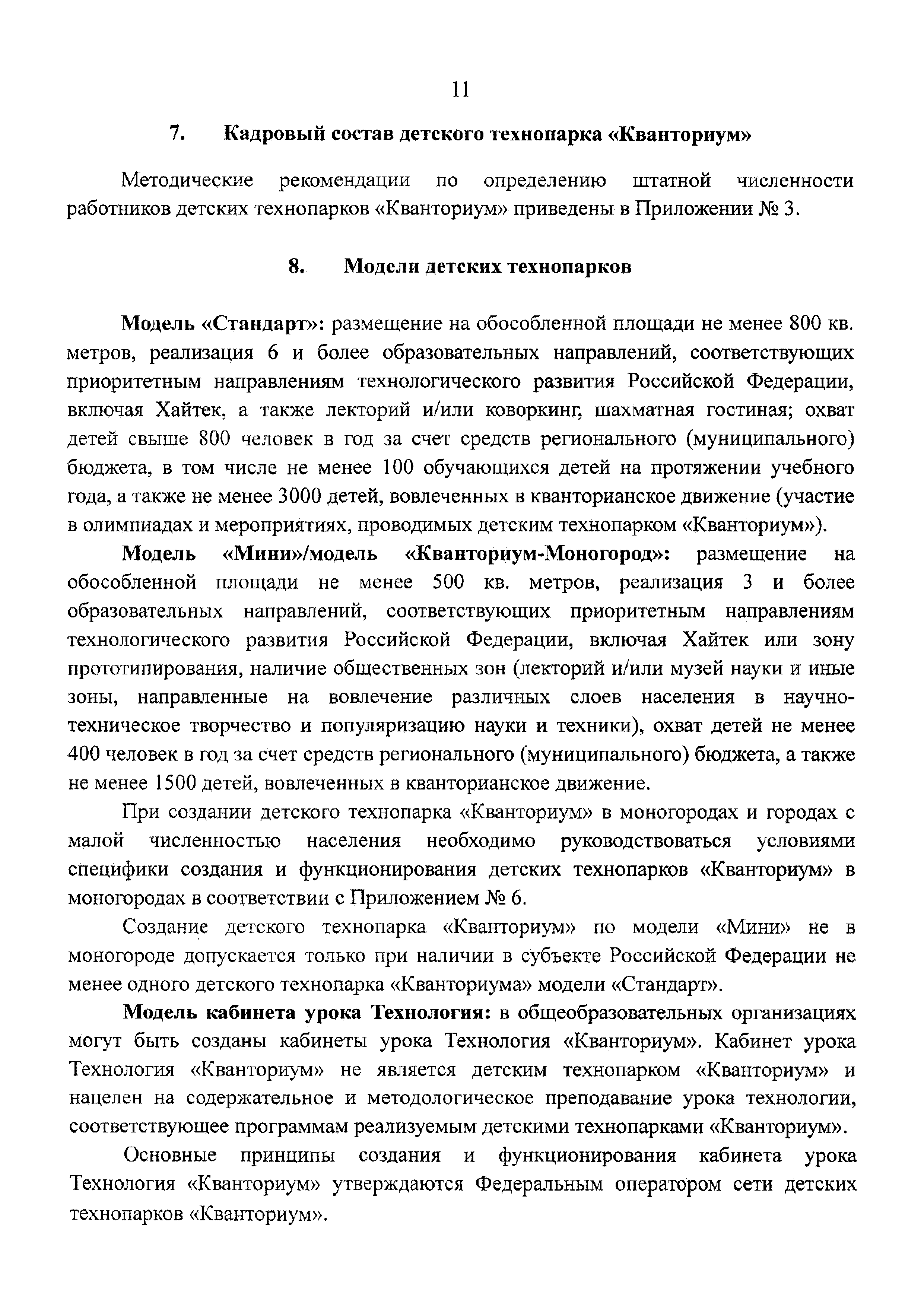 | Оглавление: | 1 Общая информация 2 Термины и определения 3 Нормативно-правовое обеспечение деятельности детского технопарка "Кванториум" 4 Имущественный комплекс детского технопарка "Кванториум" 5 Образовательные направления детского технопарка "Кванториум" 6 Требования к формату образовательного процесса 7 Кадровый состав детского технопарка "Кванториум" 8 Модели детских технопарков Приложение 1. Чек-лист по созданию детского технопарка "Кванториум" Приложение 2. Примерные операционные расходы Приложение 3. Методические рекомендации по определению штатной численности работников детских технопарков "Кванториум" Приложение 4. Положение о формировании плана-графика деятельности детского технопарка "Кванториум" Приложение 5. Руководство по брендированию интерьеров детского технопарка "Кванториум" Приложение 6. Специфика создания и функционирования детских технопарков "Кванториум" в моногородах |