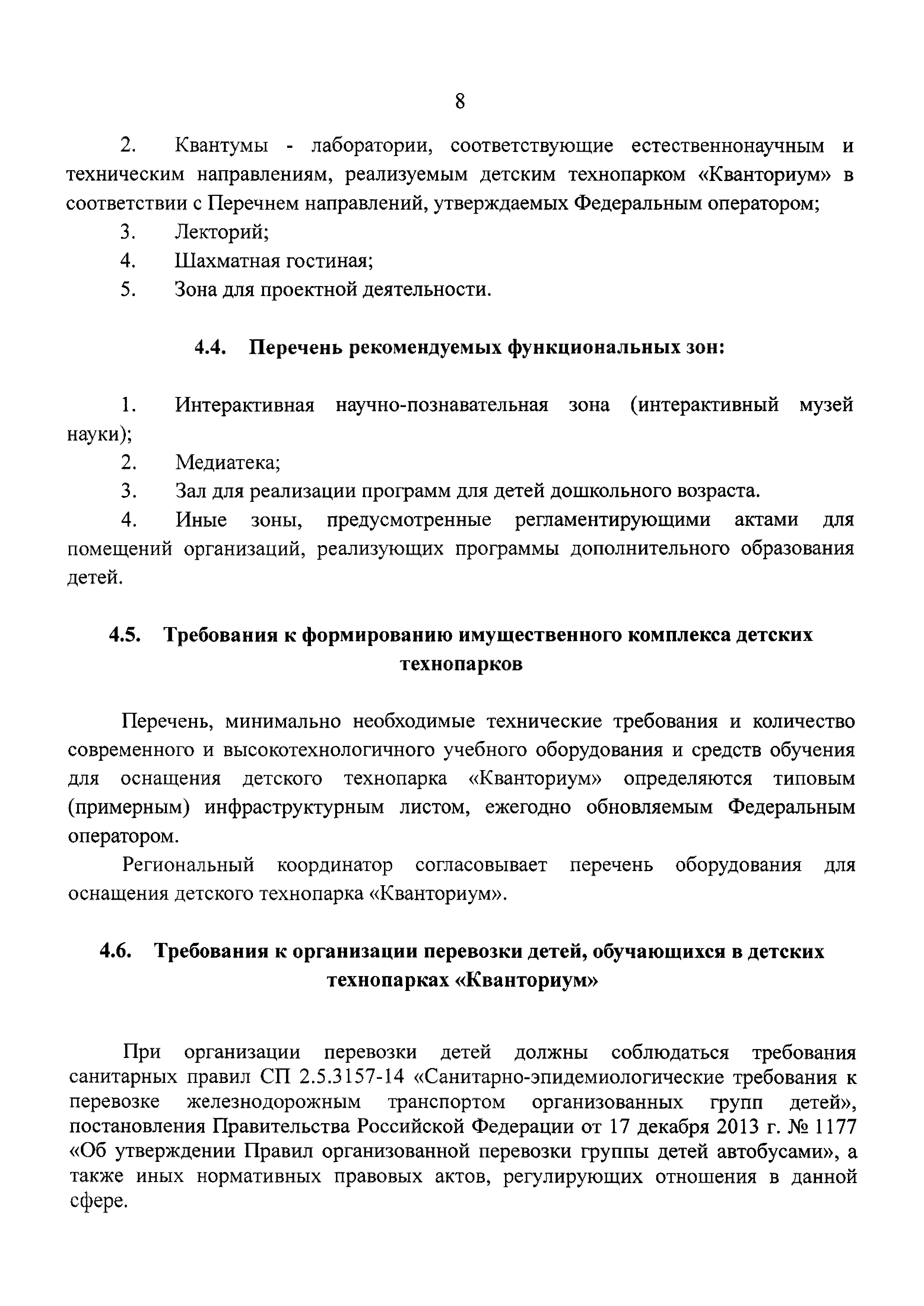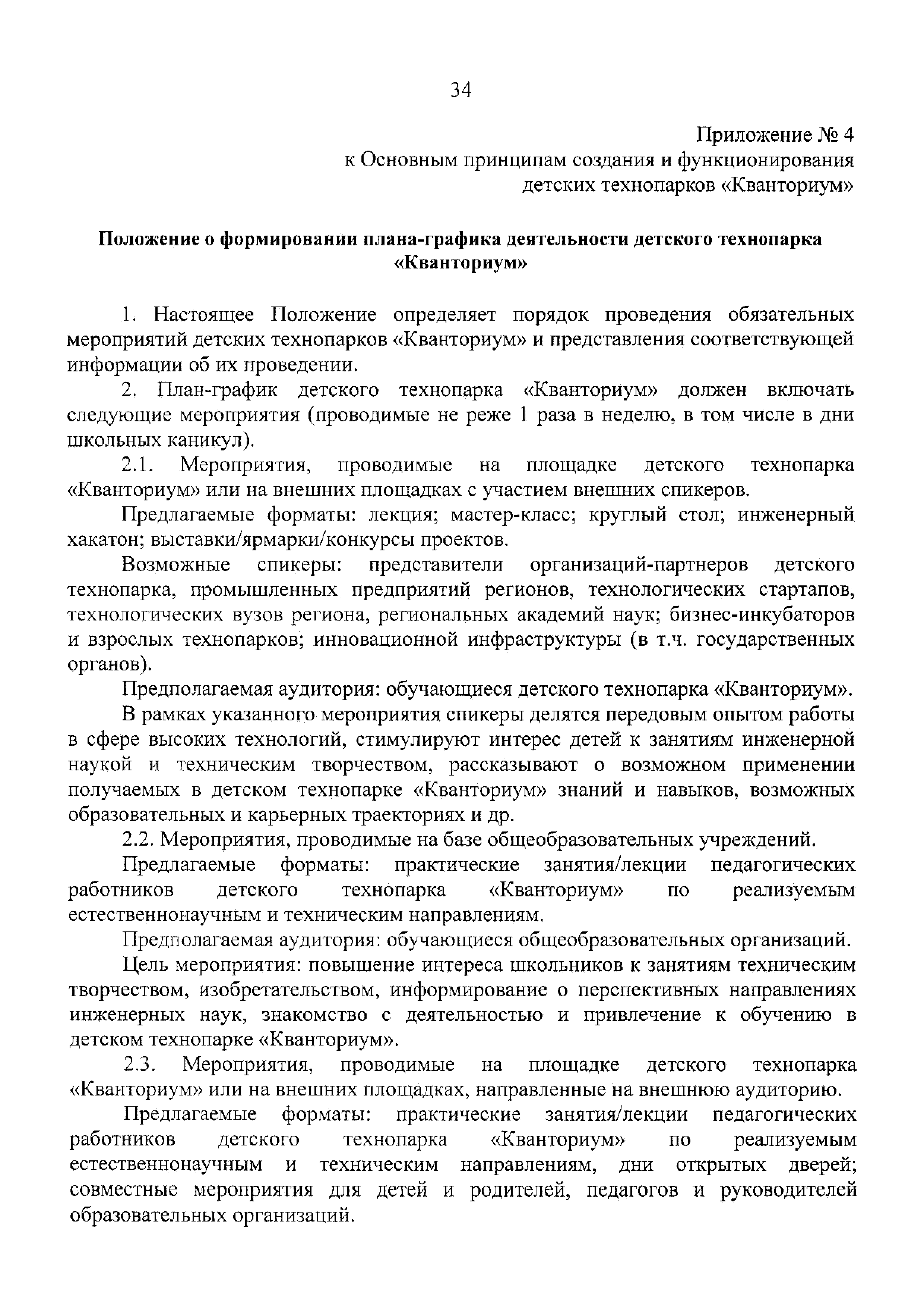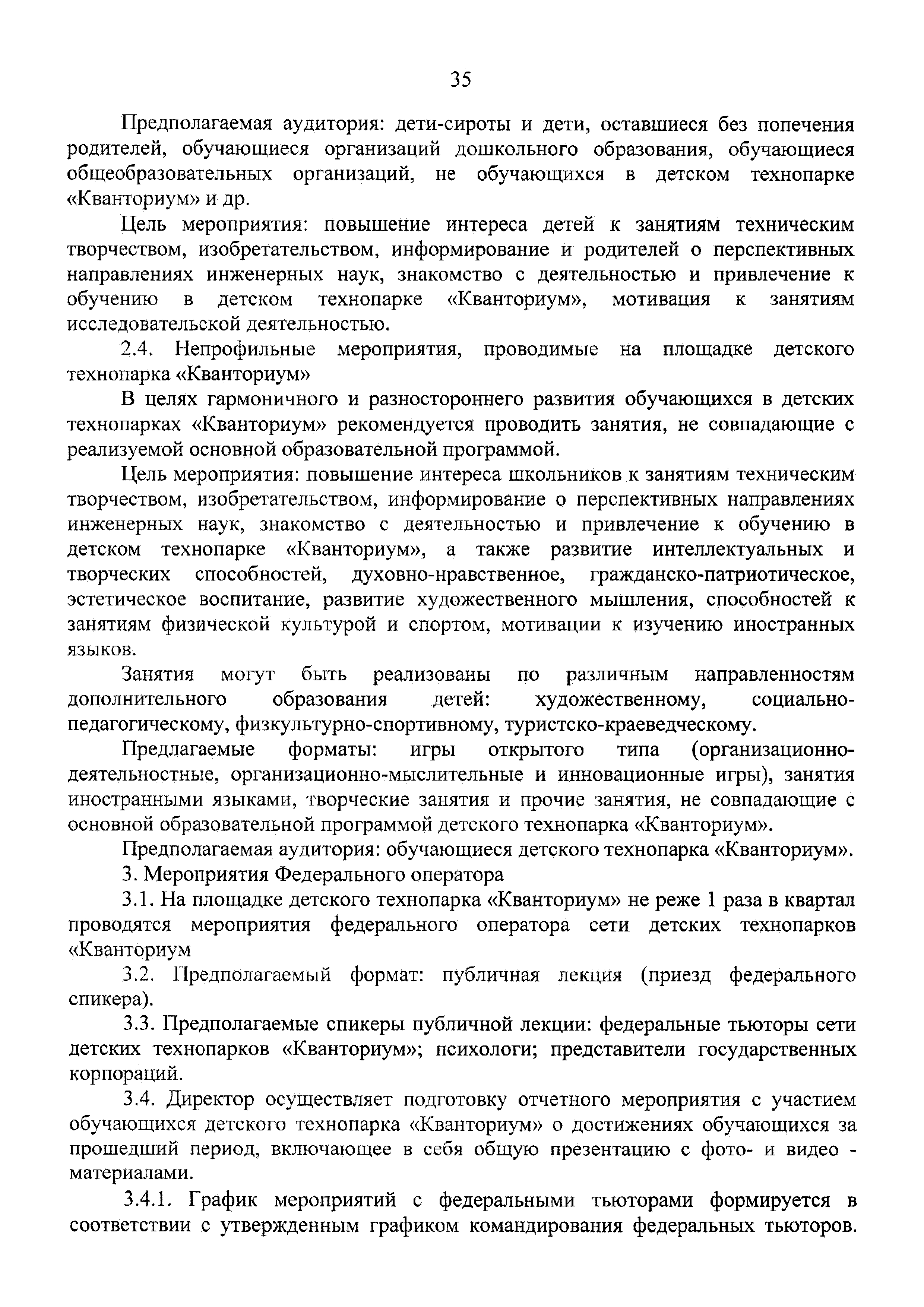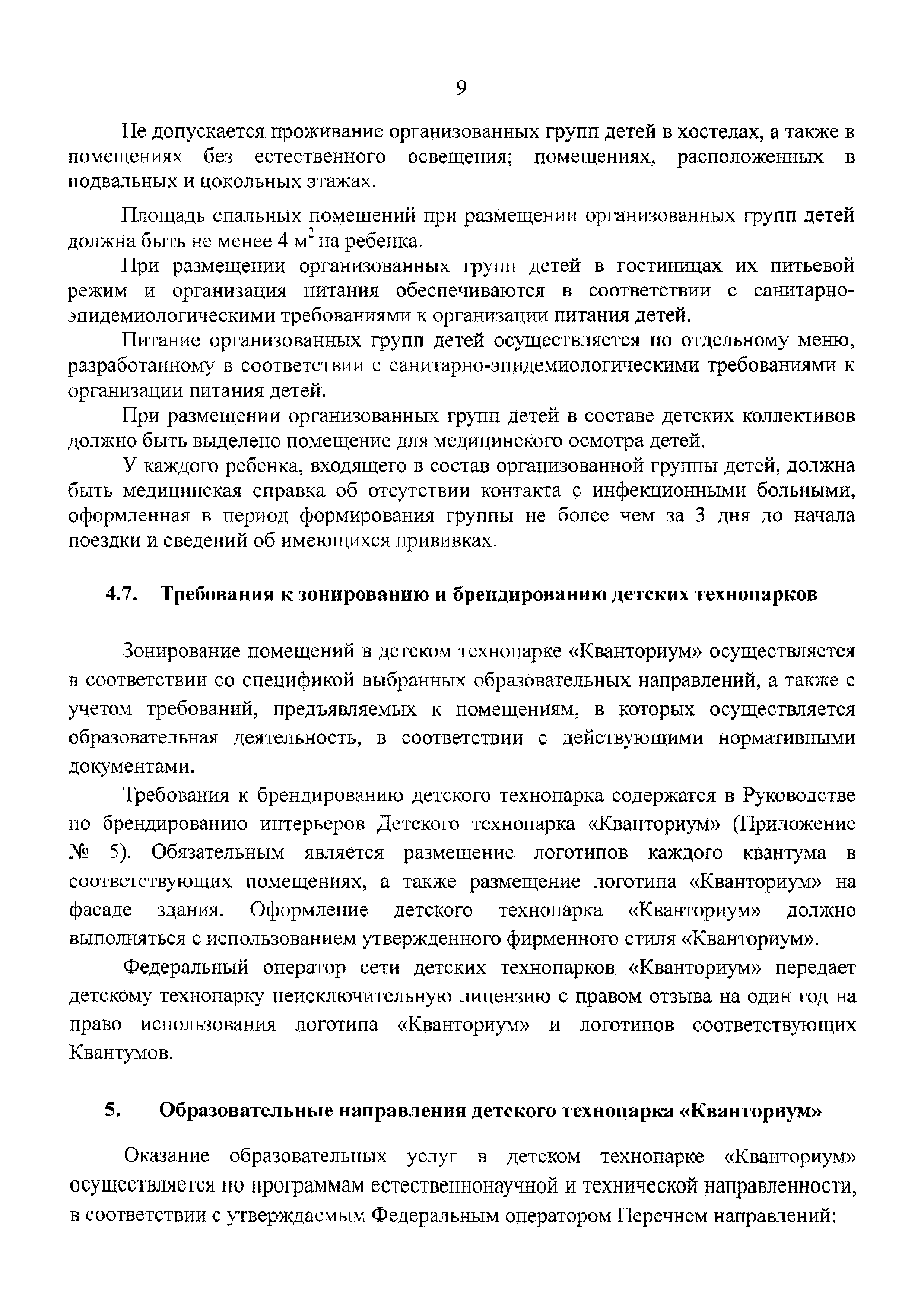 | Оглавление: | 1 Общая информация 2 Термины и определения 3 Нормативно-правовое обеспечение деятельности детского технопарка "Кванториум" 4 Имущественный комплекс детского технопарка "Кванториум" 5 Образовательные направления детского технопарка "Кванториум" 6 Требования к формату образовательного процесса 7 Кадровый состав детского технопарка "Кванториум" 8 Модели детских технопарков Приложение 1. Чек-лист по созданию детского технопарка "Кванториум" Приложение 2. Примерные операционные расходы Приложение 3. Методические рекомендации по определению штатной численности работников детских технопарков "Кванториум" Приложение 4. Положение о формировании плана-графика деятельности детского технопарка "Кванториум" Приложение 5. Руководство по брендированию интерьеров детского технопарка "Кванториум" Приложение 6. Специфика создания и функционирования детских технопарков "Кванториум" в моногородах |