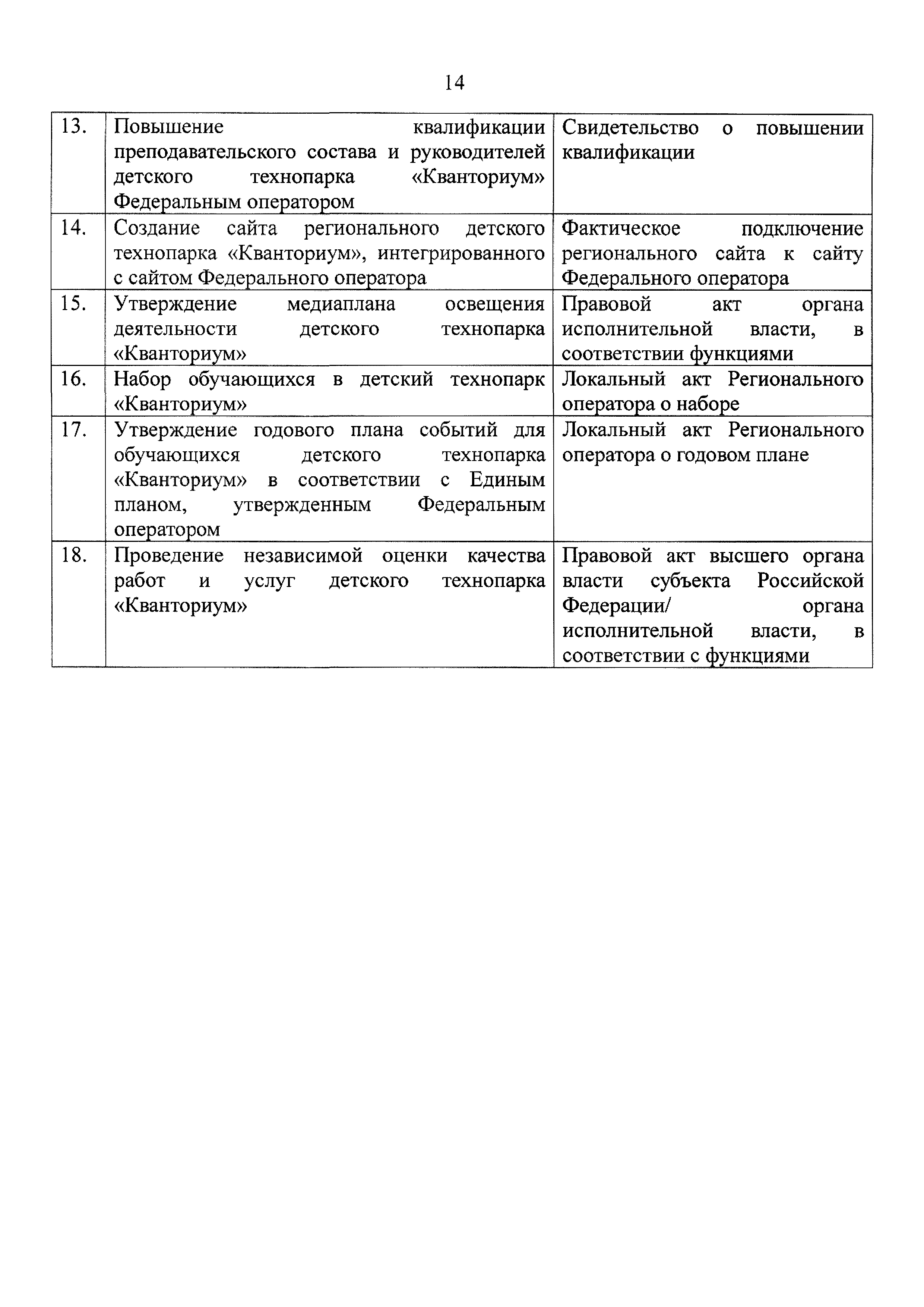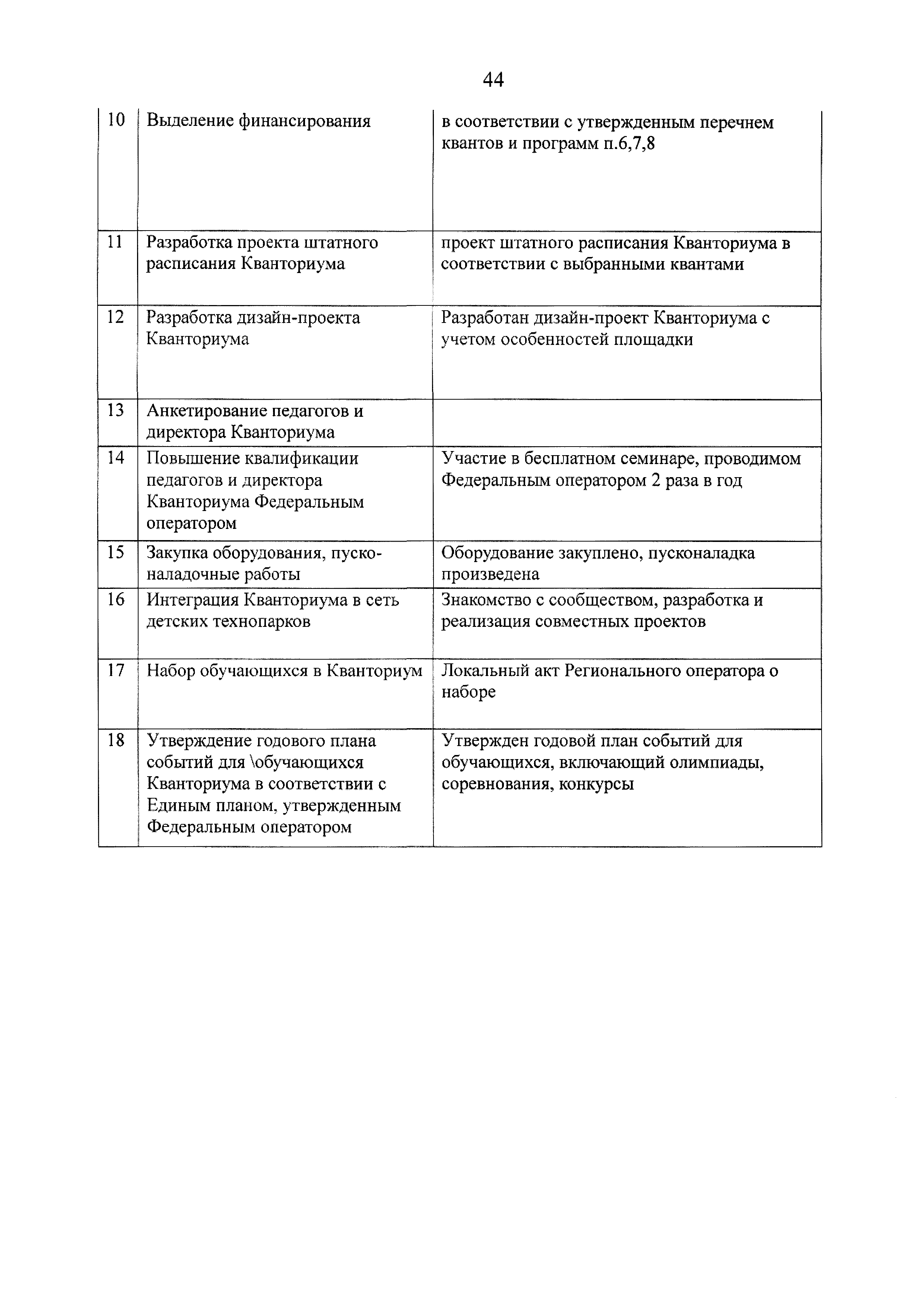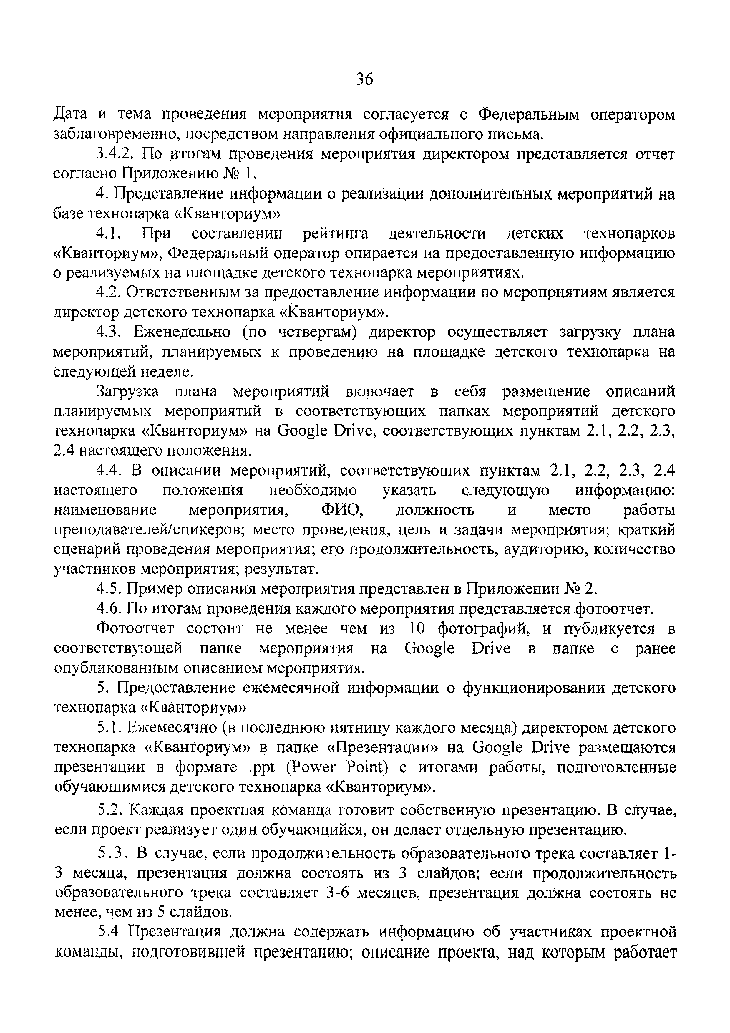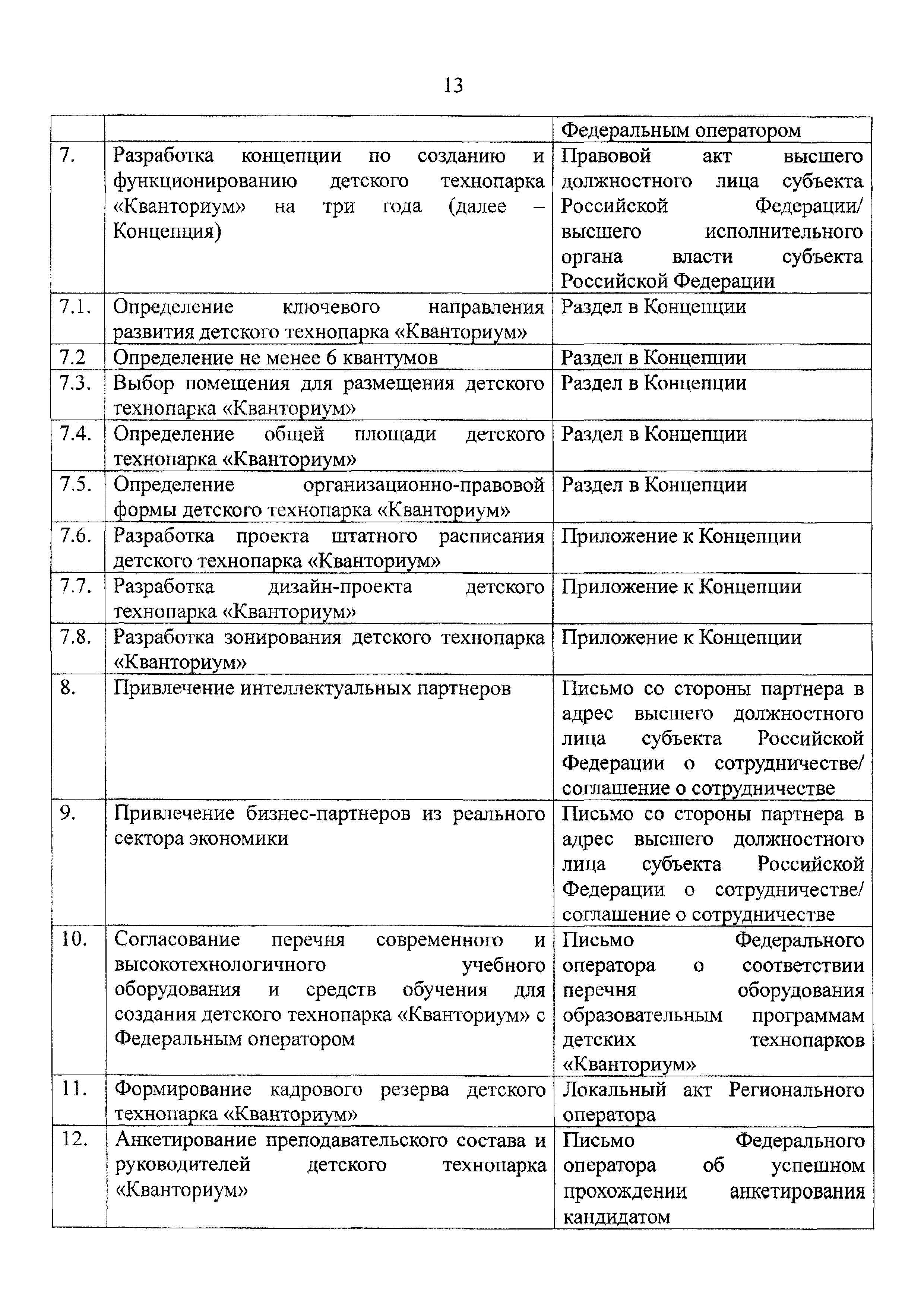 | Оглавление: | 1 Общая информация 2 Термины и определения 3 Нормативно-правовое обеспечение деятельности детского технопарка "Кванториум" 4 Имущественный комплекс детского технопарка "Кванториум" 5 Образовательные направления детского технопарка "Кванториум" 6 Требования к формату образовательного процесса 7 Кадровый состав детского технопарка "Кванториум" 8 Модели детских технопарков Приложение 1. Чек-лист по созданию детского технопарка "Кванториум" Приложение 2. Примерные операционные расходы Приложение 3. Методические рекомендации по определению штатной численности работников детских технопарков "Кванториум" Приложение 4. Положение о формировании плана-графика деятельности детского технопарка "Кванториум" Приложение 5. Руководство по брендированию интерьеров детского технопарка "Кванториум" Приложение 6. Специфика создания и функционирования детских технопарков "Кванториум" в моногородах |
