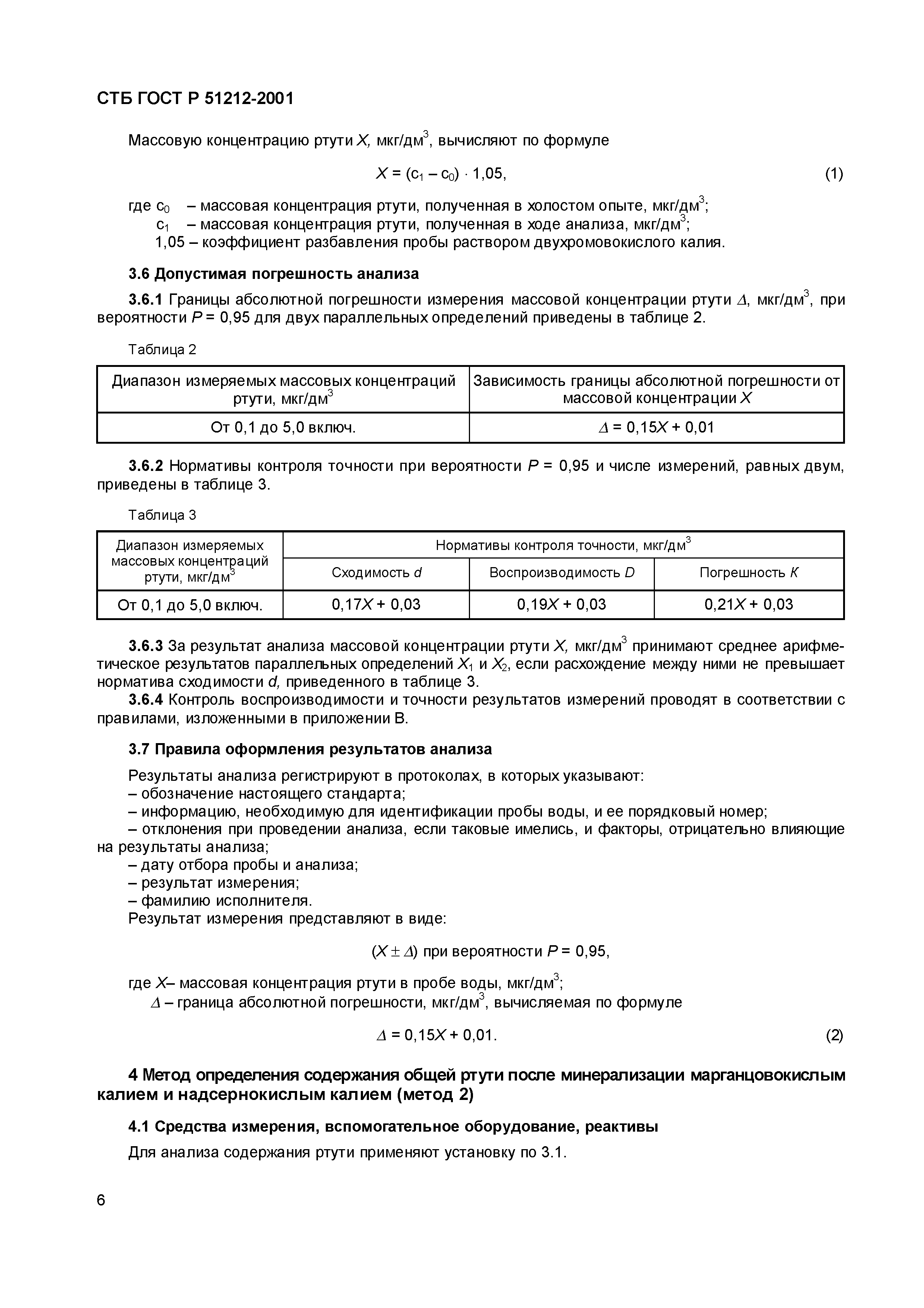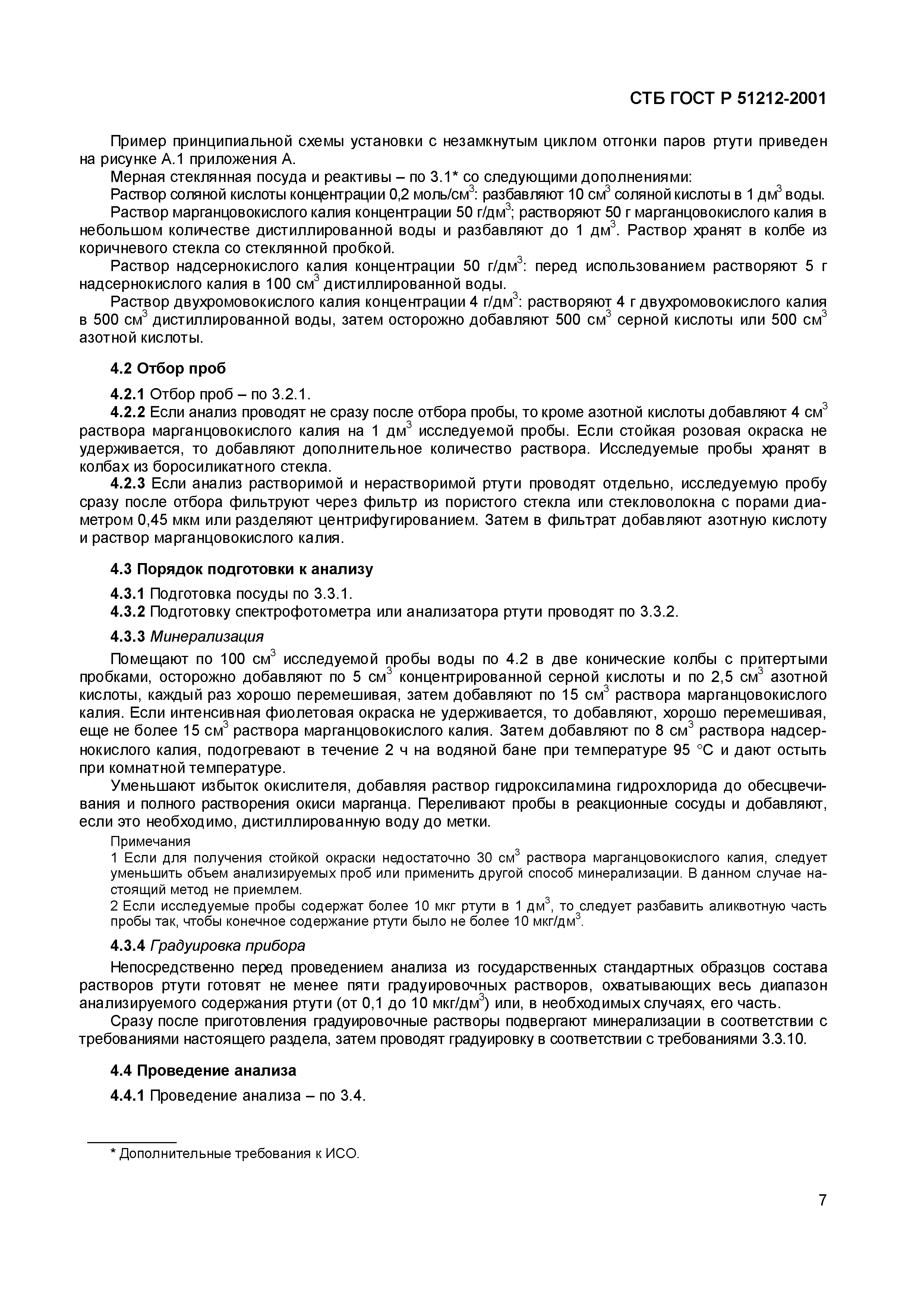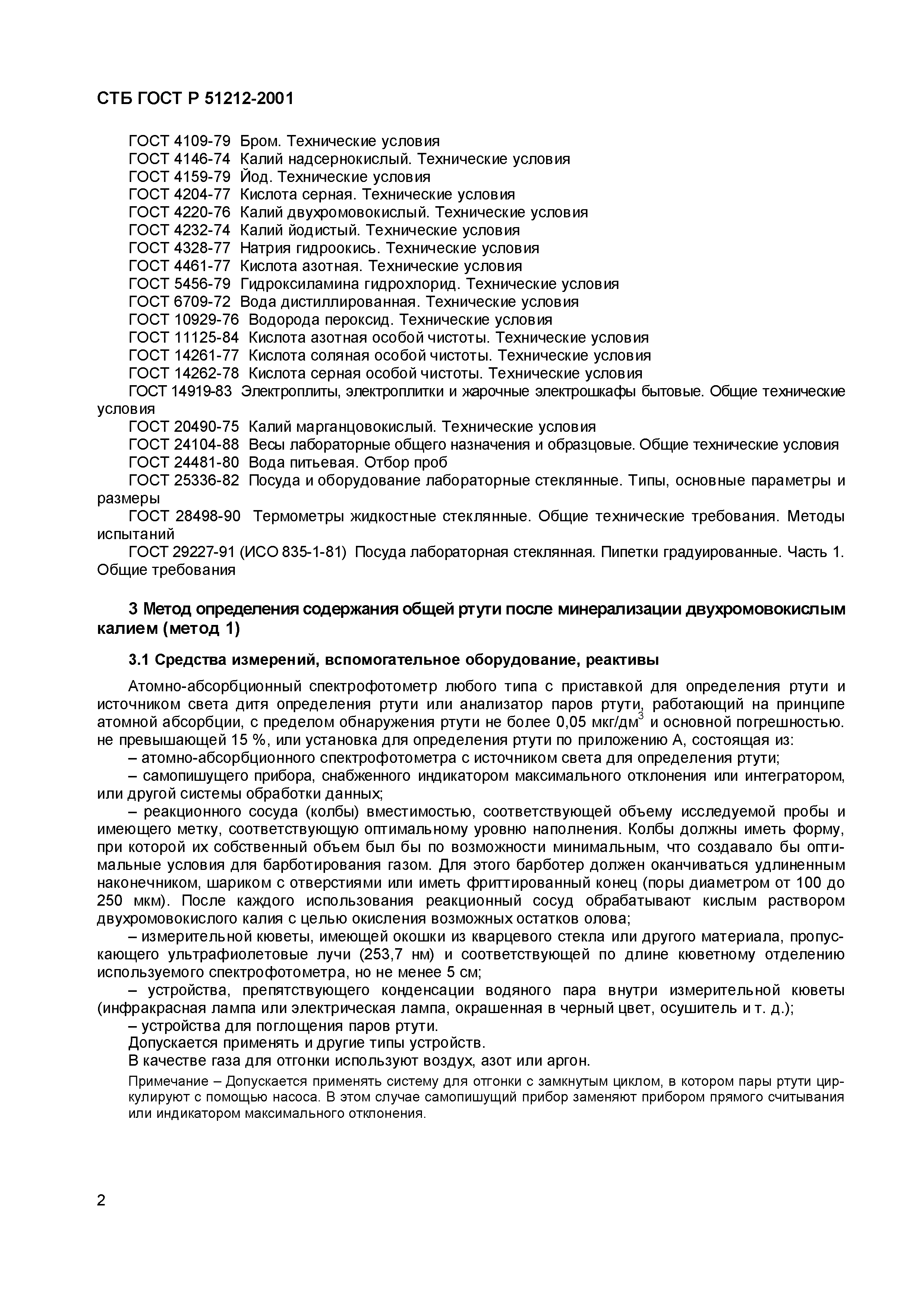 | Оглавление: | 1 Область применения 2 Нормативные ссылки 3 Метод определения содержания общей ртути после минерализации двухромовокислым калием (метод 1) 4 Метод определения содержания общей ртути после минерализации марганцовокислым калием и надсернокислым калием (метод 2) 5 Метод определения содержания общей ртути после минерализации ультрафиолетовым облучением (метод 3) 6 Метод определения содержания общей ртути после минерализации бромом (метод 4) Приложение А Примеры принципиальных схем установок с незамкнутым циклом отгонки паров ртути Приложение Б Контроль результатов холостых опытов Приложение В Правила проведения контроля точности Приложение Г Характеристики точности результатов анализа Приложение Д Примеры установок для ультрафиолетового облучения |