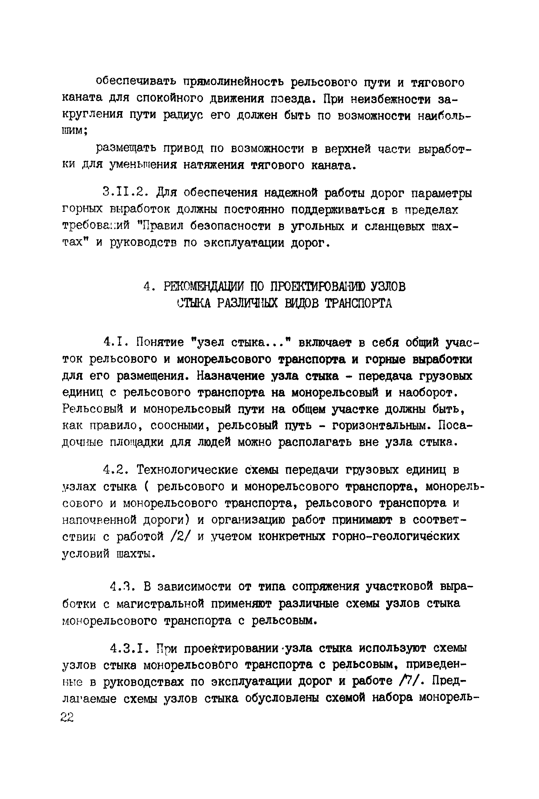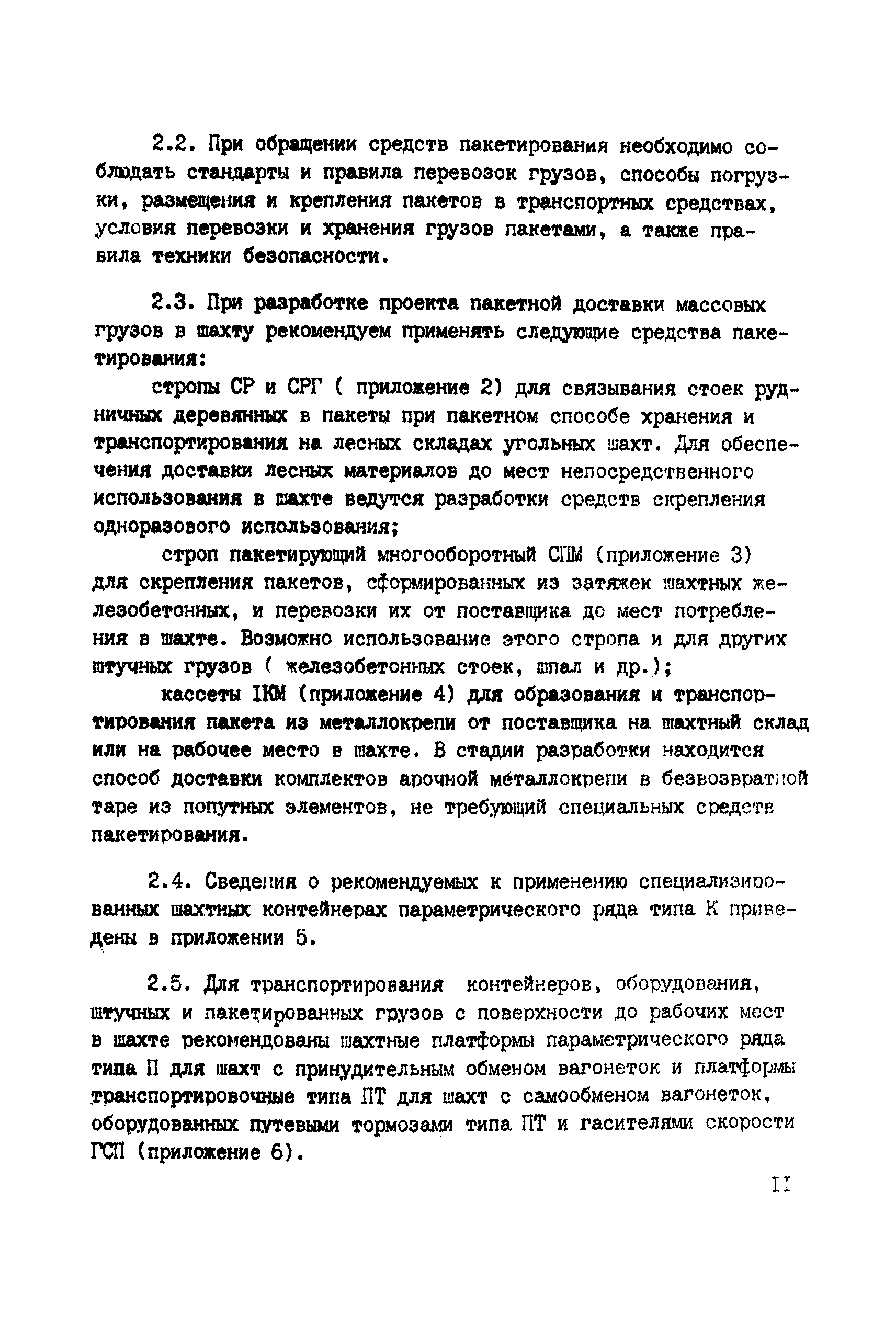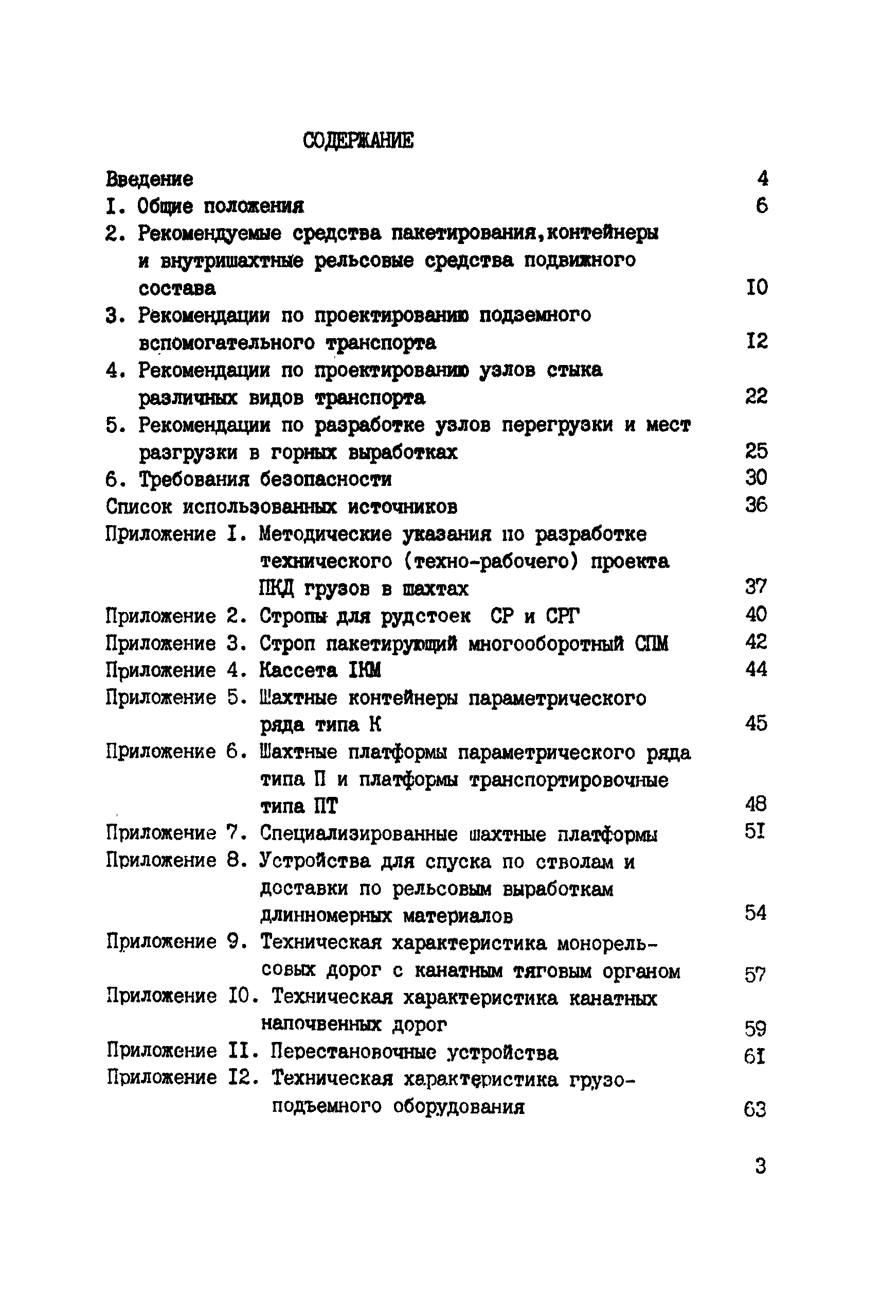 | Оглавление: | Введение 1. Общие положения 2. Рекомендуемые средства пакетирования, контейнеры и внутришахтные рельсовые средства подвижного состава 3. Рекомендации по проектированию подземного вспомогательного транспорта 4. Рекомендации по проектированию узлов стыка различных видов транспорта 5. Рекомендации по разработке узлов перегрузки и мест разгрузки в горных выработках 6. Требования безопасности Список использованных источников Приложение 1. Методические указания по разработке технического (техно-рабочего) проекта ПДК грузов в шахтах Приложение 2. Стропы для рудстоек СР и СРГ Приложение 3. Строп пакетирующий многооборотный СПМ Приложение 4. Кассета 1КМ Приложение 5. Шахтные контейнеры параметрического ряда типа К Приложение 6. Шахтные платформы параметрического ряда типа П и платформы транспортировочные типа ПТ Приложение 7. Специализированные шахтные платформы Приложение 8. Устройства для спуска по стволам и доставки по рельсовым выработкам длинномерных материалов Приложение 9. Техническая характеристика монорельсовых дорог с канатным тяговым органом Приложение 10. Техническая характеристика канатных напочвенных дорог Приложение 11. Перестановочные устройства Приложение 12. Техническая характеристика грузоподъемного оборудования |