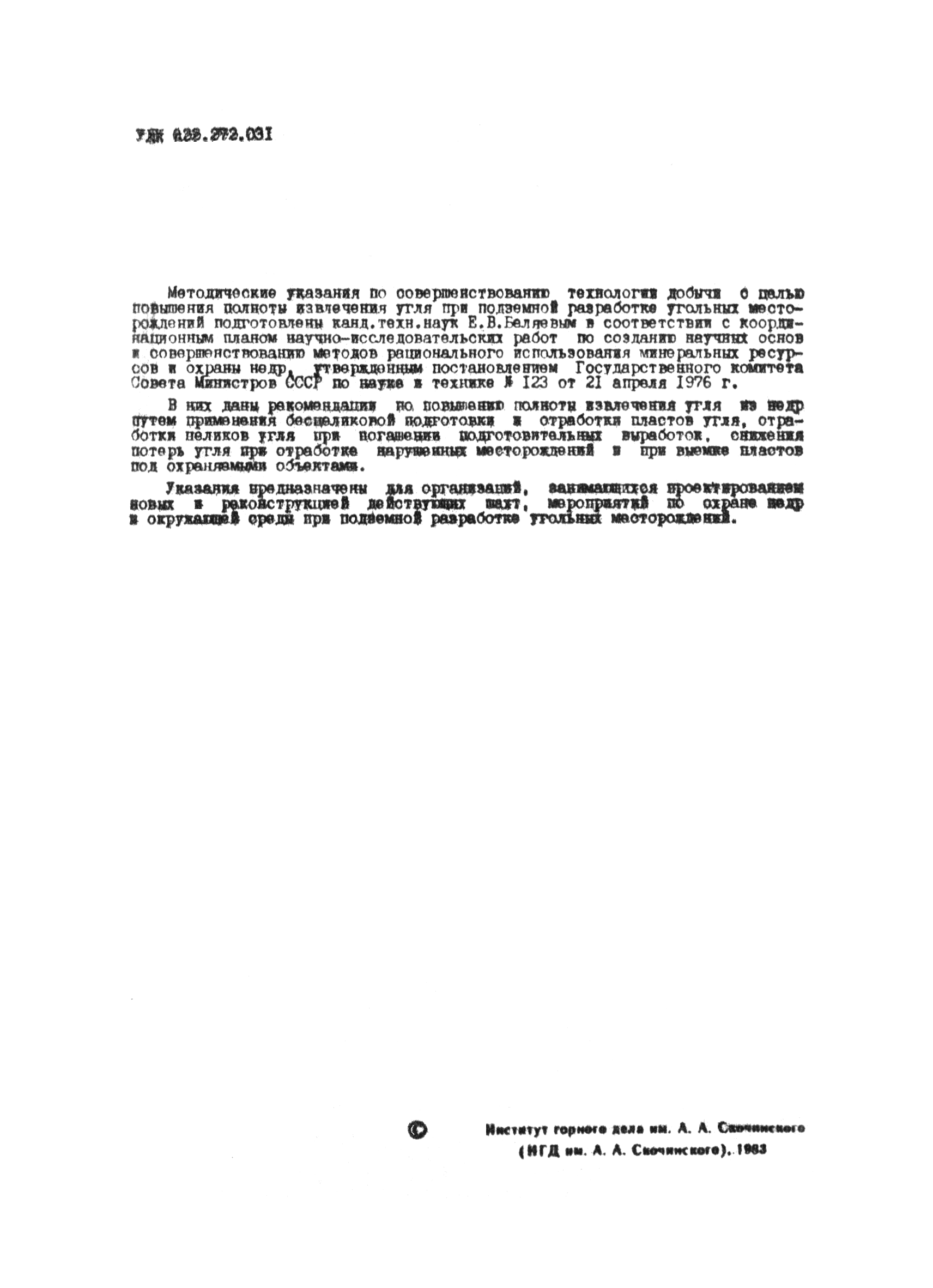 | Название рус.: | Методические указания по совершенствованию технологии добычи с целью повышения полноты извлечения угля при подземной разработке угольных месторождений |