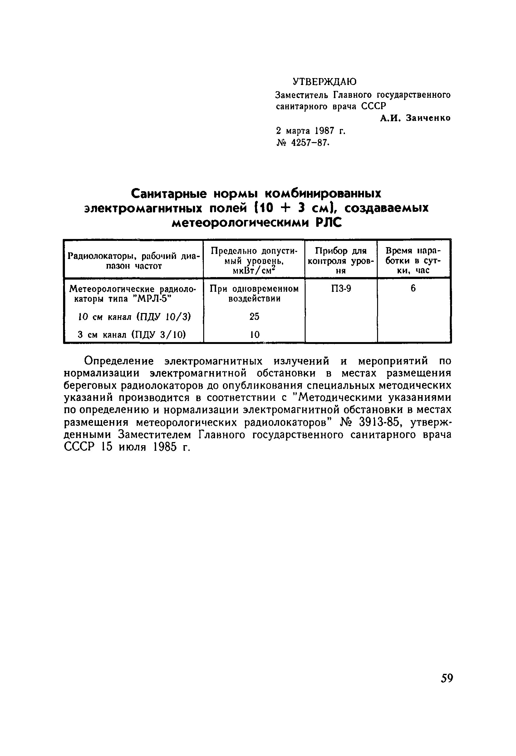 Санитарные нормы комбинированных электромагнитных полей (10 + 3 см), создаваемых метеорологическими РЛС| Статус: | действует | | Название рус.: | Санитарные нормы комбинированных электромагнитных полей (10 + 3 см), создаваемых метеорологическими РЛС | | Дата добавления в базу: | 01.01.2019 | | Дата актуализации: | 01.01.2021 | | Утверждён: | 02.03.1987 Заместитель Главного государственного санитарного врача CCCР (4257-87)