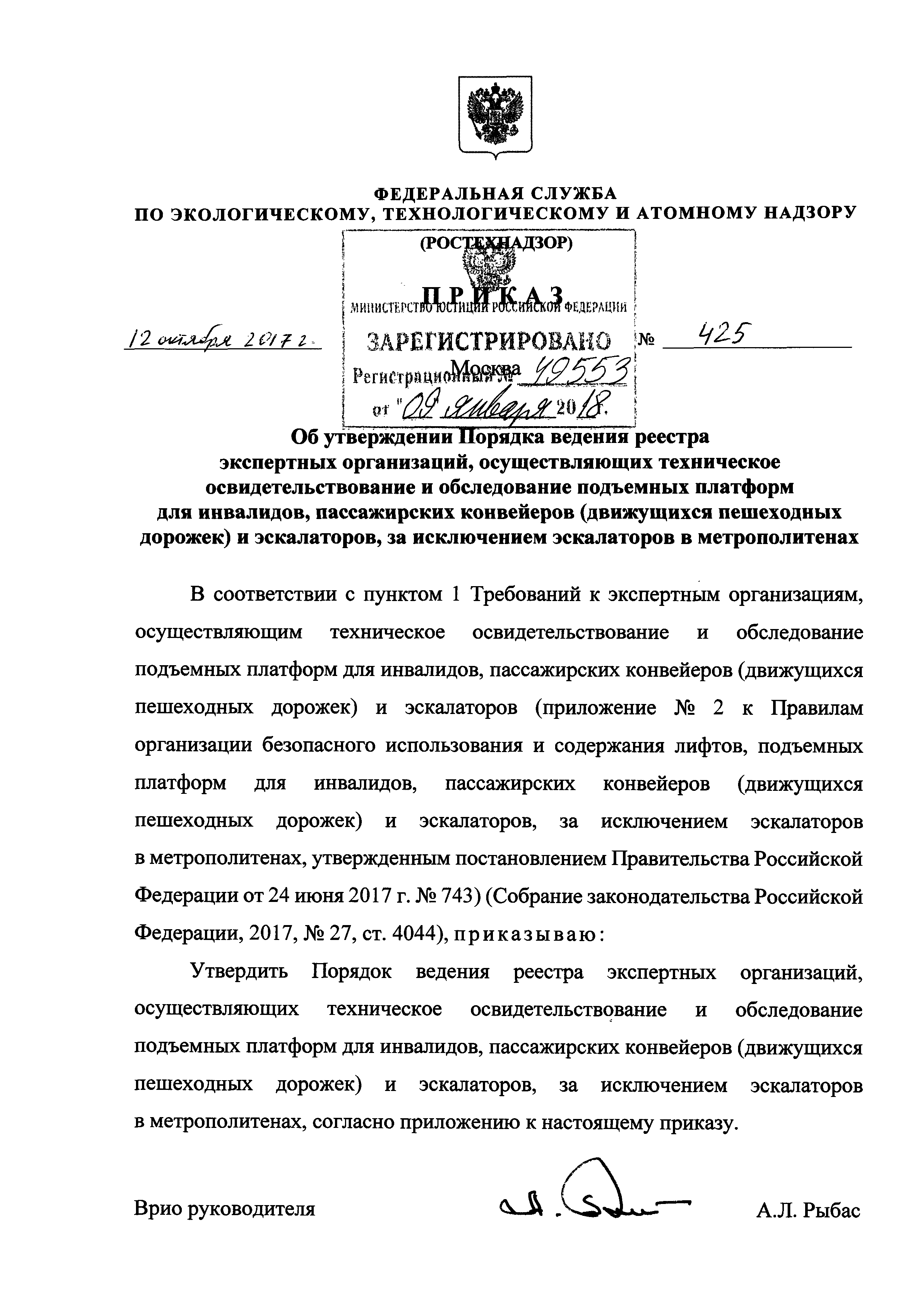 Порядок ведения реестра экспертных организаций, осуществляющих техническое освидетельствование и обследование подъемных платформ для инвалидов, пассажирских конвейеров (движущихся пешеходных дорожек) и эскалаторов, за исключением эскалаторов в метрополитенах| Статус: | действует | | Название рус.: | Порядок ведения реестра экспертных организаций, осуществляющих техническое освидетельствование и обследование подъемных платформ для инвалидов, пассажирских конвейеров (движущихся пешеходных дорожек) и эскалаторов, за исключением эскалаторов в метрополитенах | | Дата добавления в базу: | 01.01.2019 | | Дата актуализации: | 01.01.2021 | | Дата введения: | 20.01.2018 | | Область применения: | Порядок устанавливает правила формирования и ведения реестра экспертных организаций, осуществляющих техническое освидетельствование и обследование подъемных платформ для инвалидов, пассажирских конвейеров (движущихся пешеходных дорожек) и эскалаторов, за исключением эскалаторов в метрополитенах | | Утверждён: | 12.10.2017 Федеральная служба по экологическому, технологическому и атомному надзору (425)