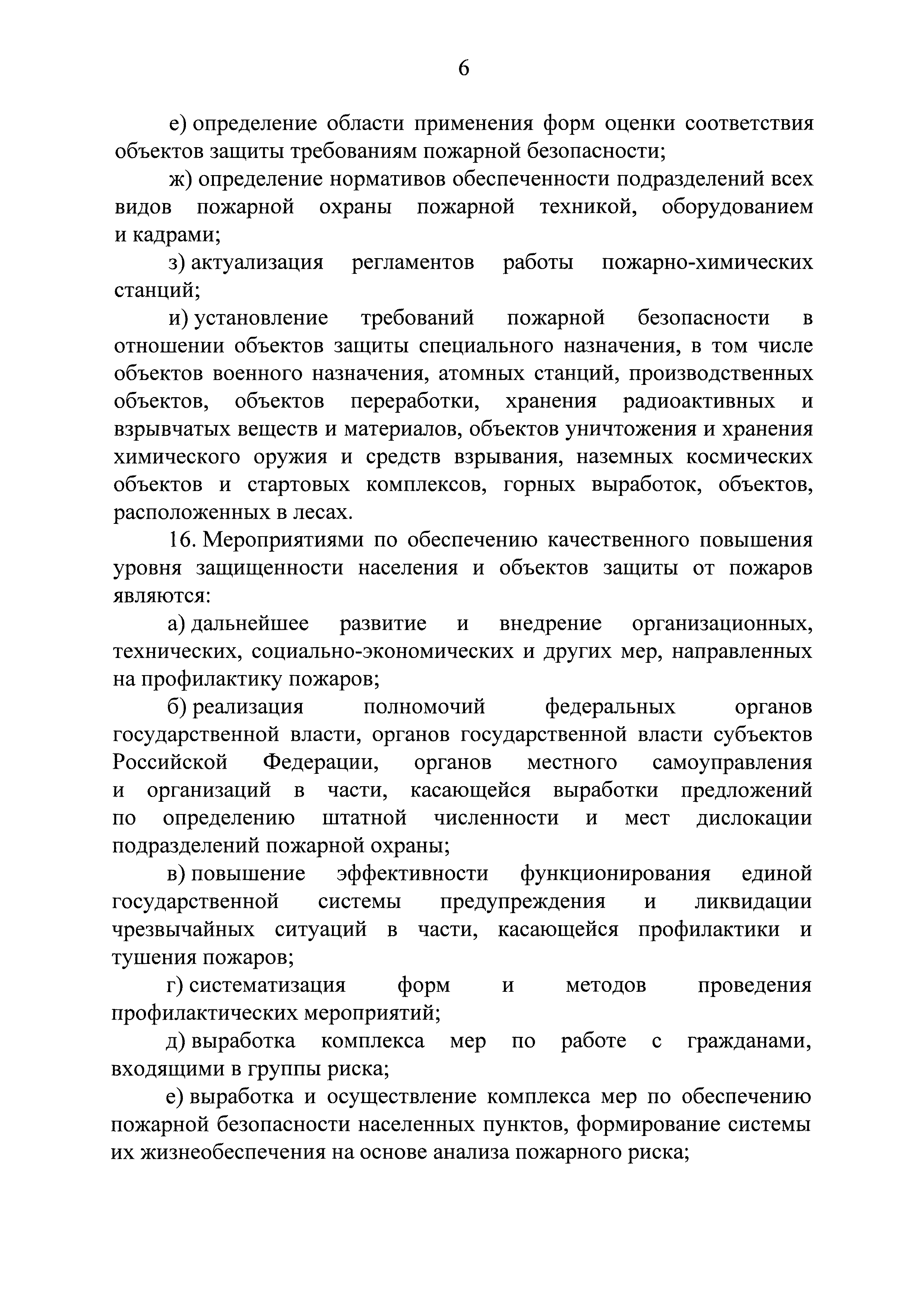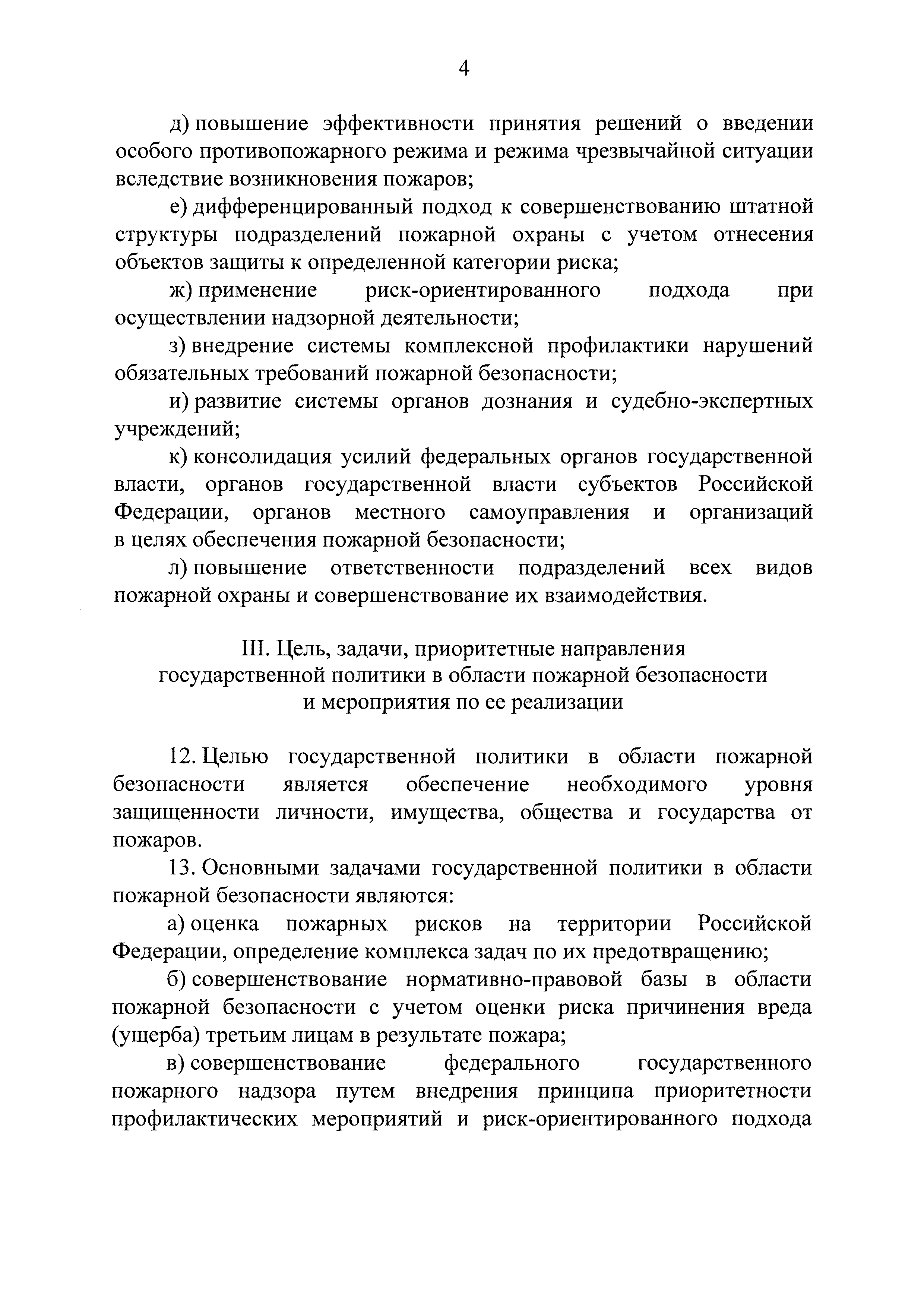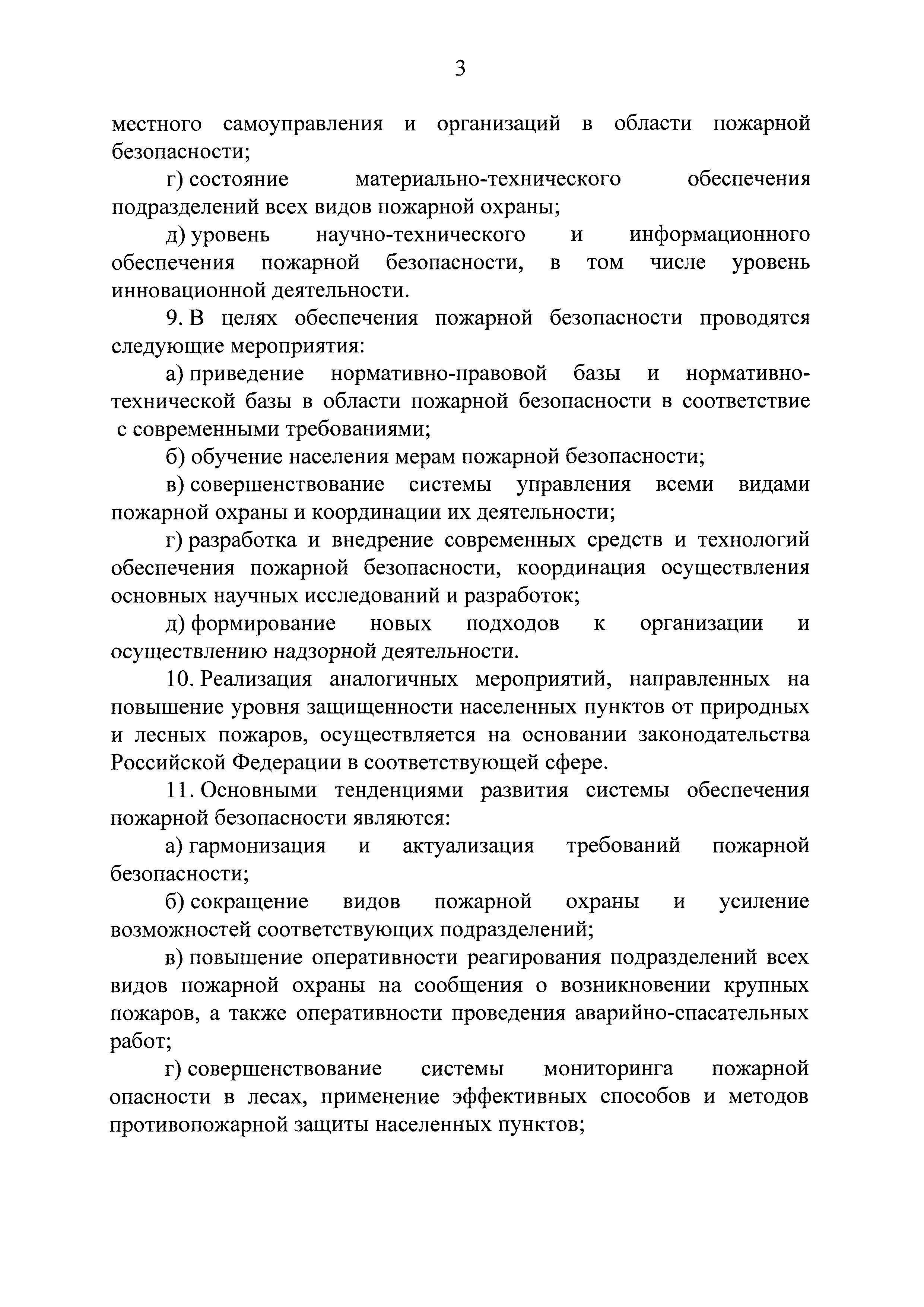 | Оглавление: | I. Общие положения II. Оценка состояния пожарной безопасности и основные тенденции развития системы ее обеспечения III. Цель, задачи, приоритетные направления государственной политики в области пожарной безопасности и мероприятия по ее реализации IV. Механизмы реализации государственной политики в области пожарной безопасности V. Показатели состояния системы обеспечения пожарной безопасности VI. Функции, направления деятельности и порядок взаимодействия федеральных органов государственной власти, органов государственной власти субъектов Российской Федерации, органов местного самоуправления и организаций при реализации государственной политики в области пожарной безопасности VII. Ресурсное обеспечение мероприятий по реализации государственной политики в области пожарной безопасности |