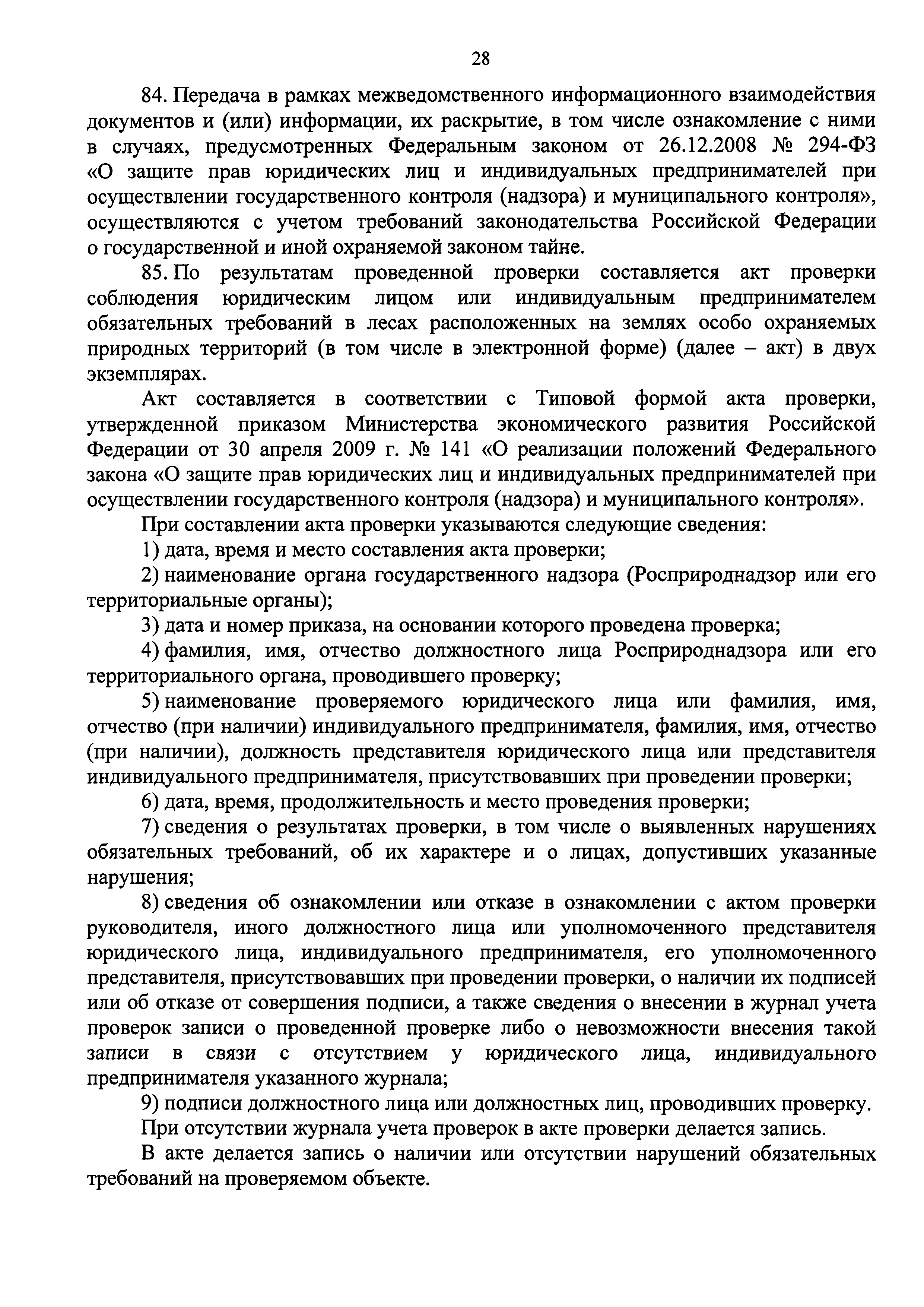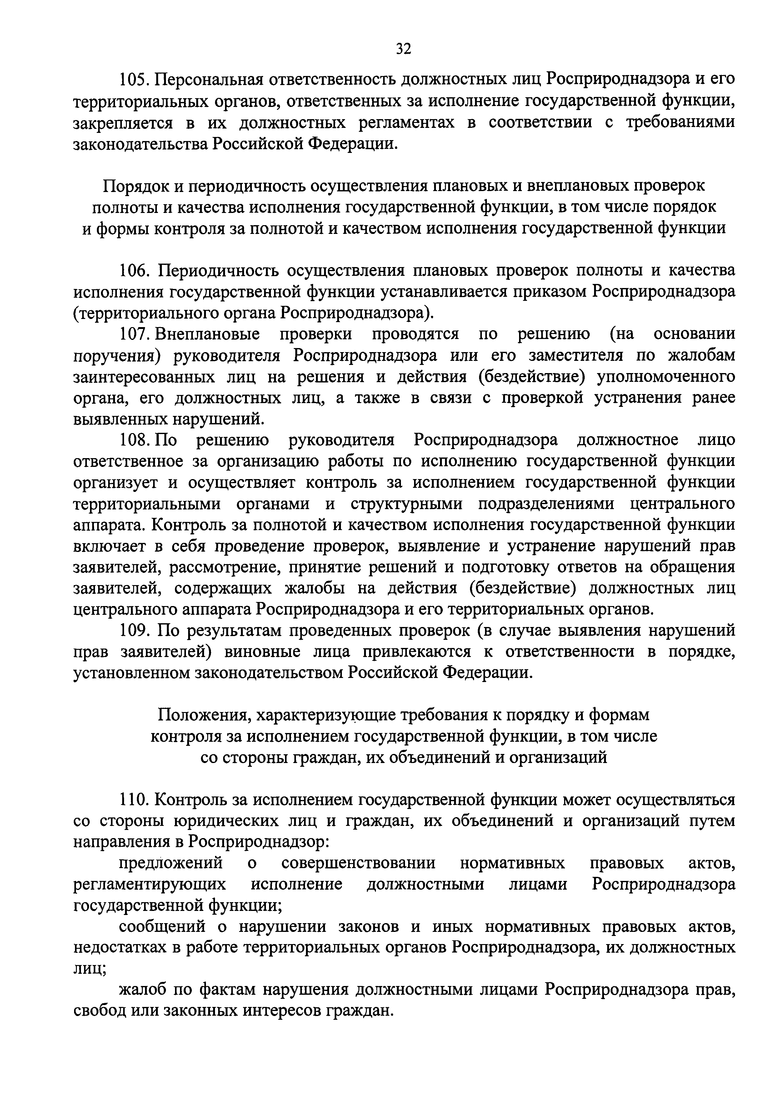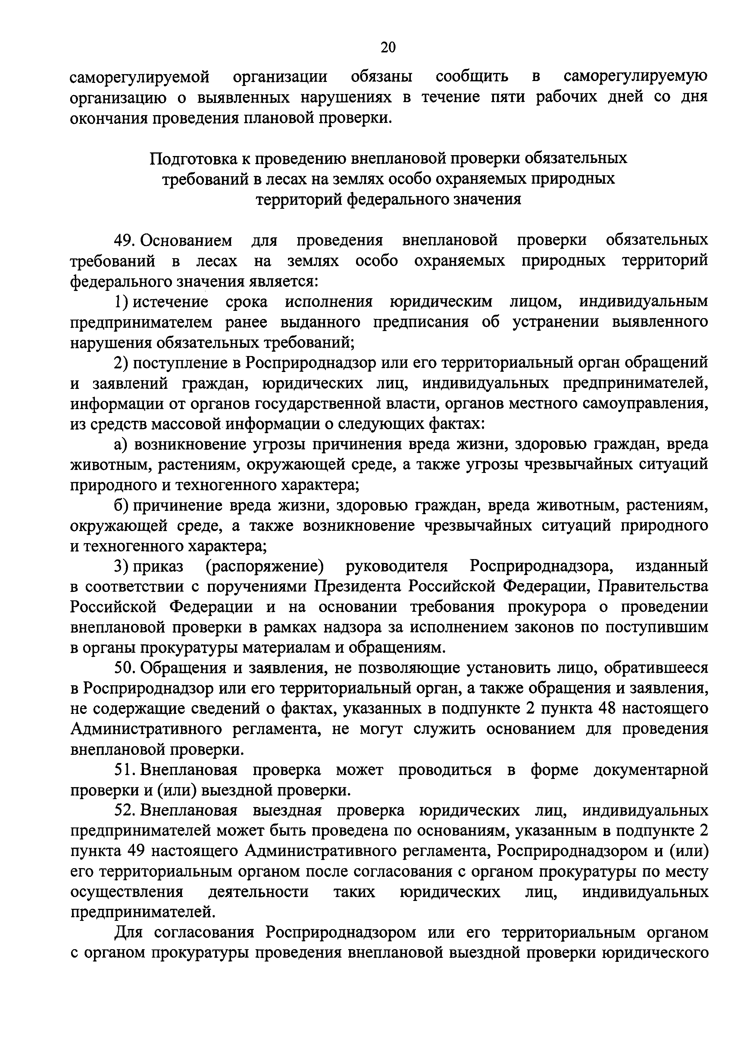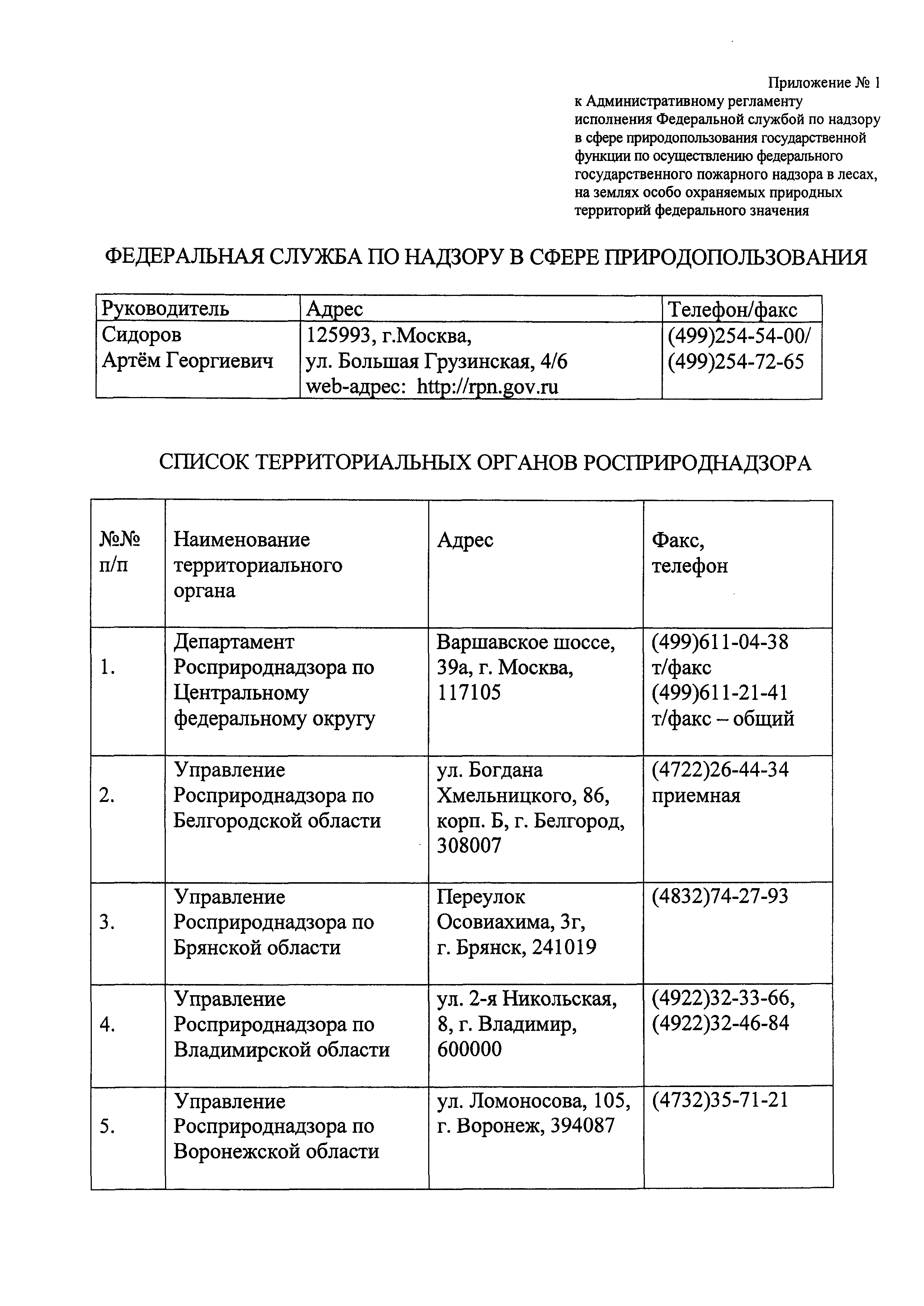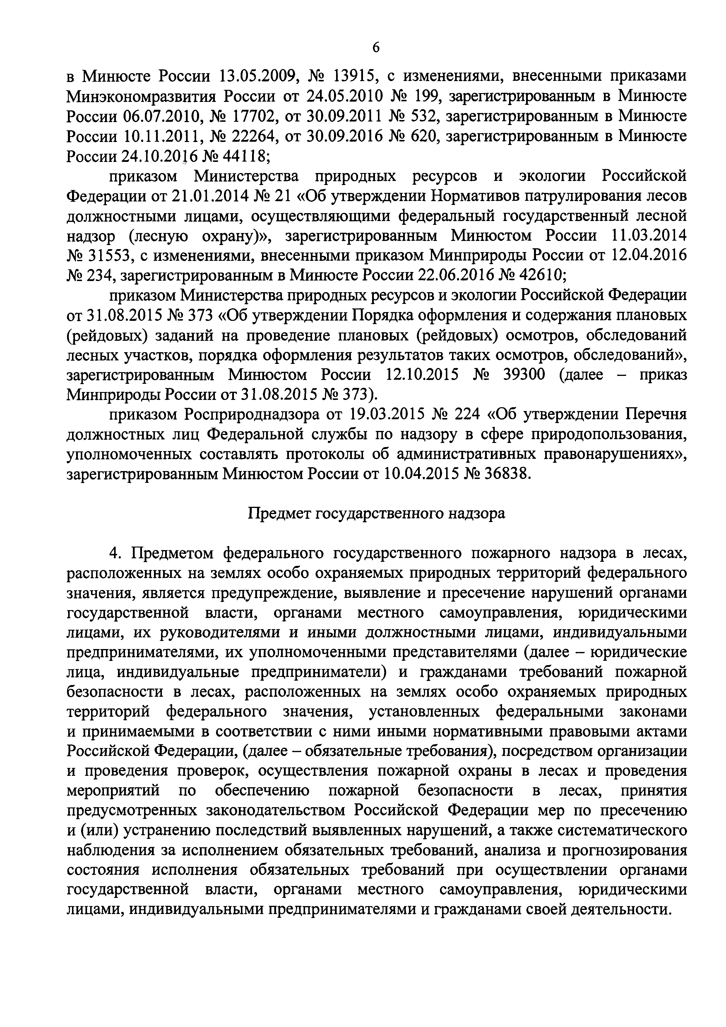 | Оглавление: | I. Общие положения II. Требования к порядку исполнения государственной функции III. Состав, последовательность и сроки выполнения административных процедур (действий), требования к порядку их выполнения, в том числе особенности выполнения административных процедур (действий) в электронной форме. Исчерпывающий перечень административных процедур при исполнении государственной функции Раздел IV. Порядок и формы контроля за исполнением государственной функции Раздел V. Досудебный (внесудебный) порядок обжалования решений и действий (бездействия) органа, исполняющего государственную функцию, а также их должностных лиц Приложение № 1. Список территориальных органов Росприроднадзора Приложение № 2. Блок-схема последовательности административных процедур при осуществлении федерального государственного пожарного надзора в лесах, расположенных на землях особо охраняемых природных территорий федерального значения |