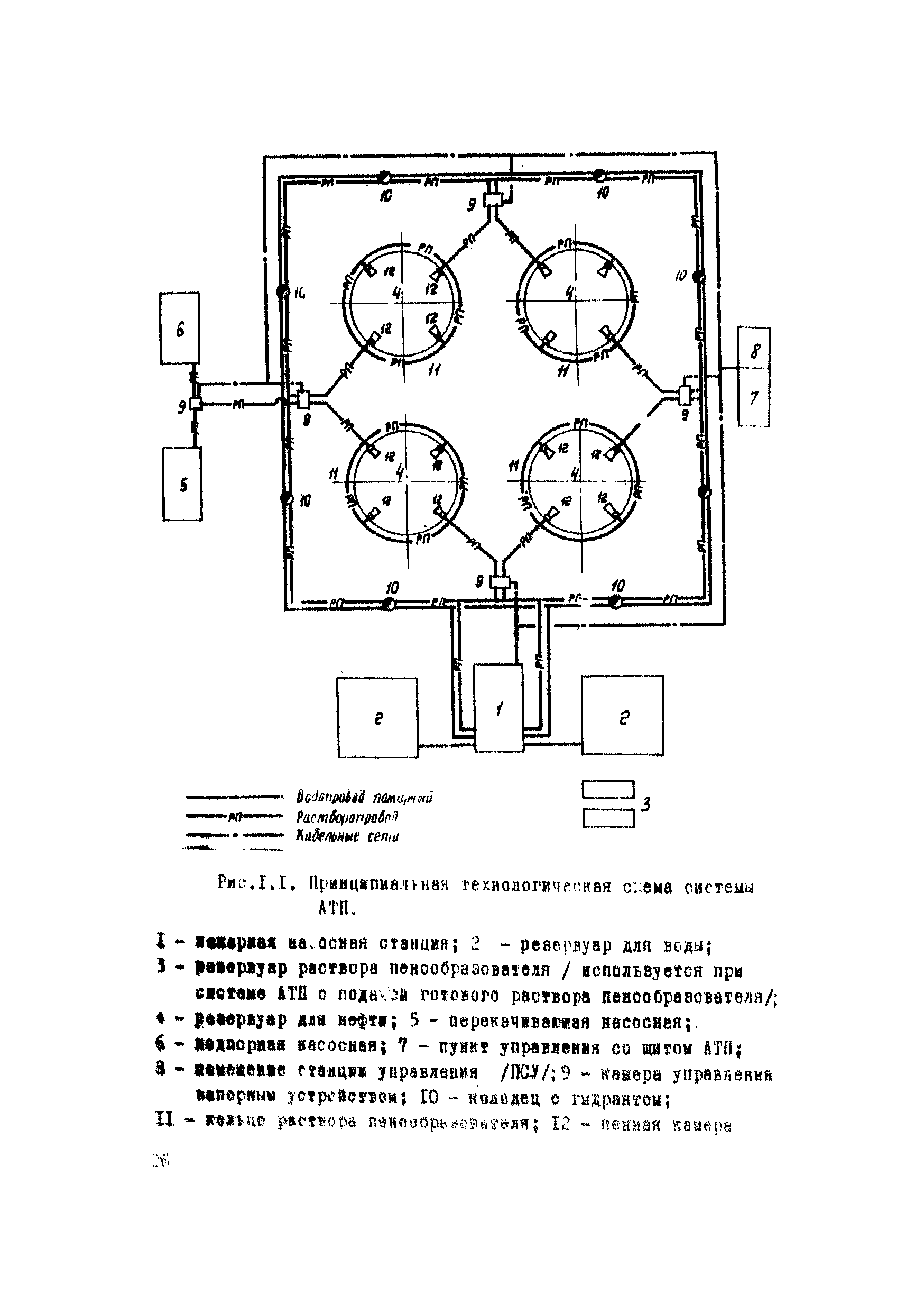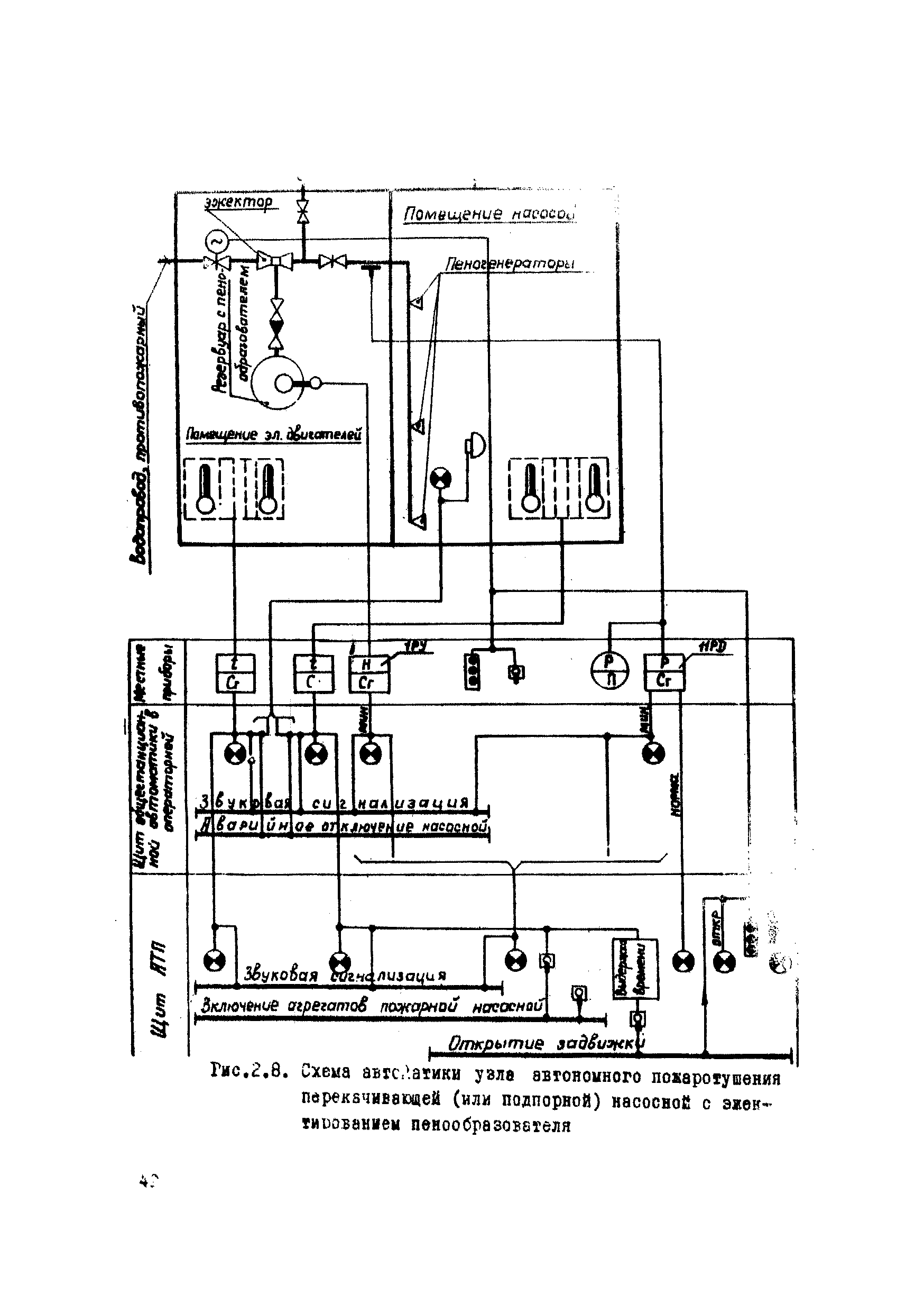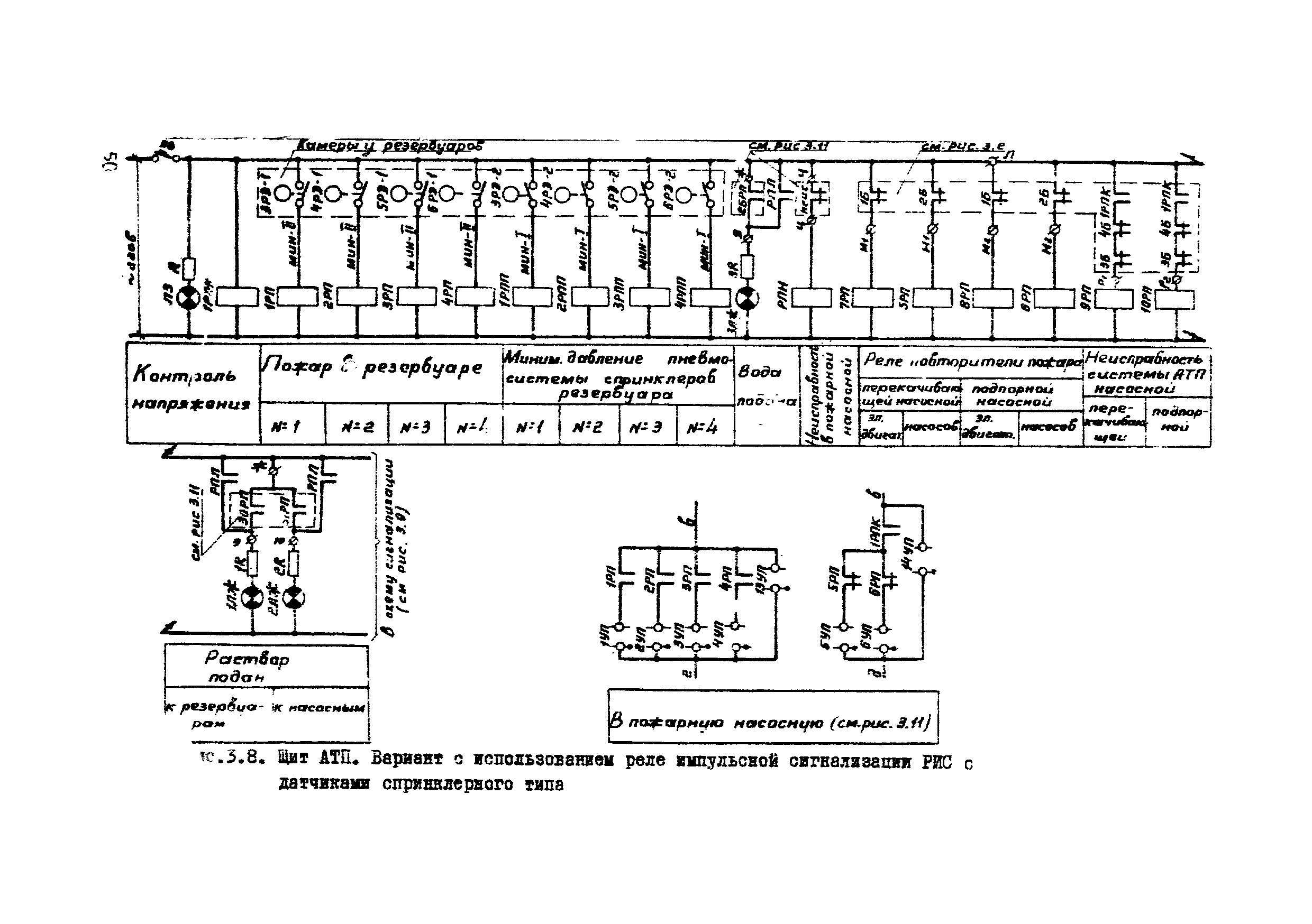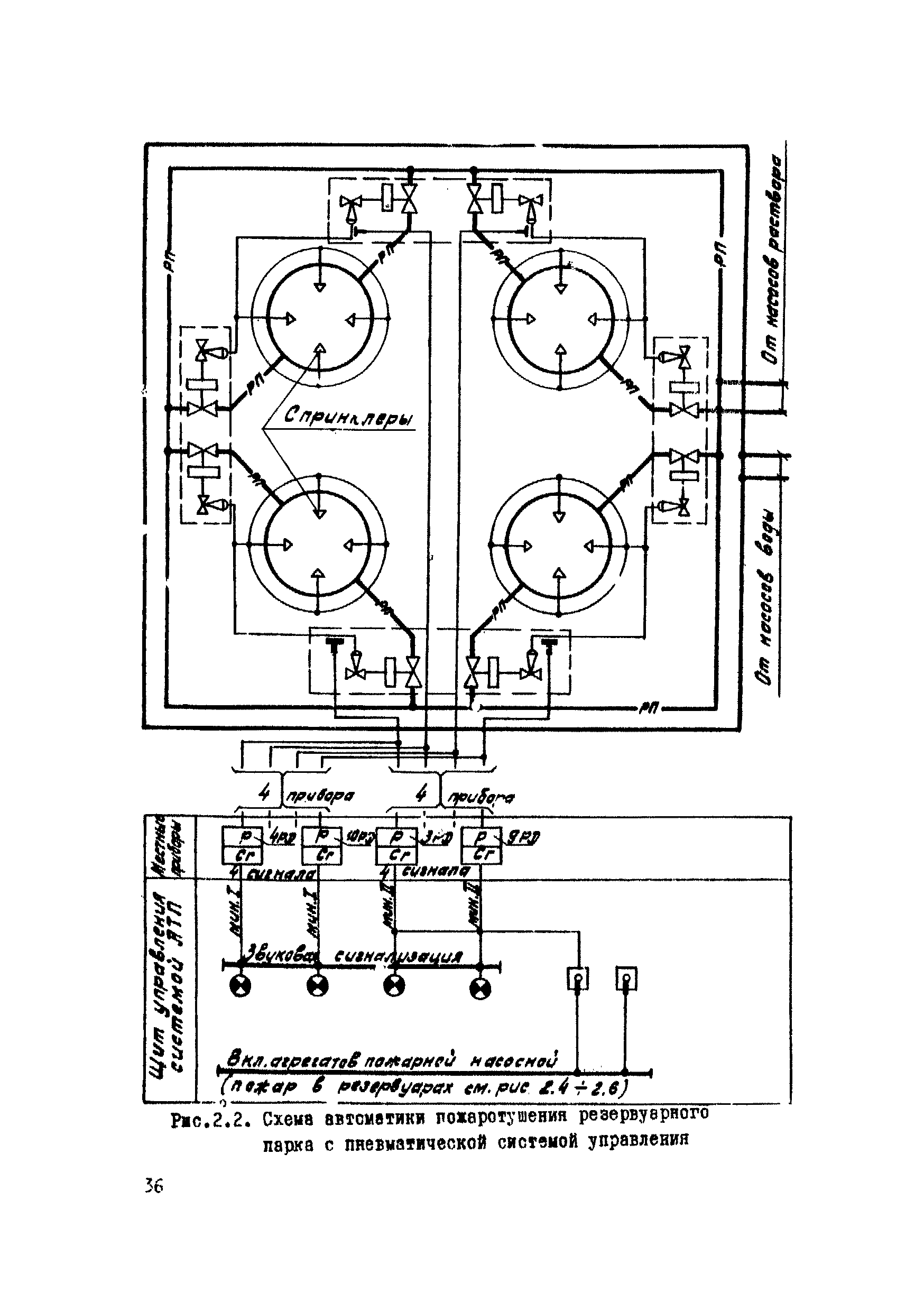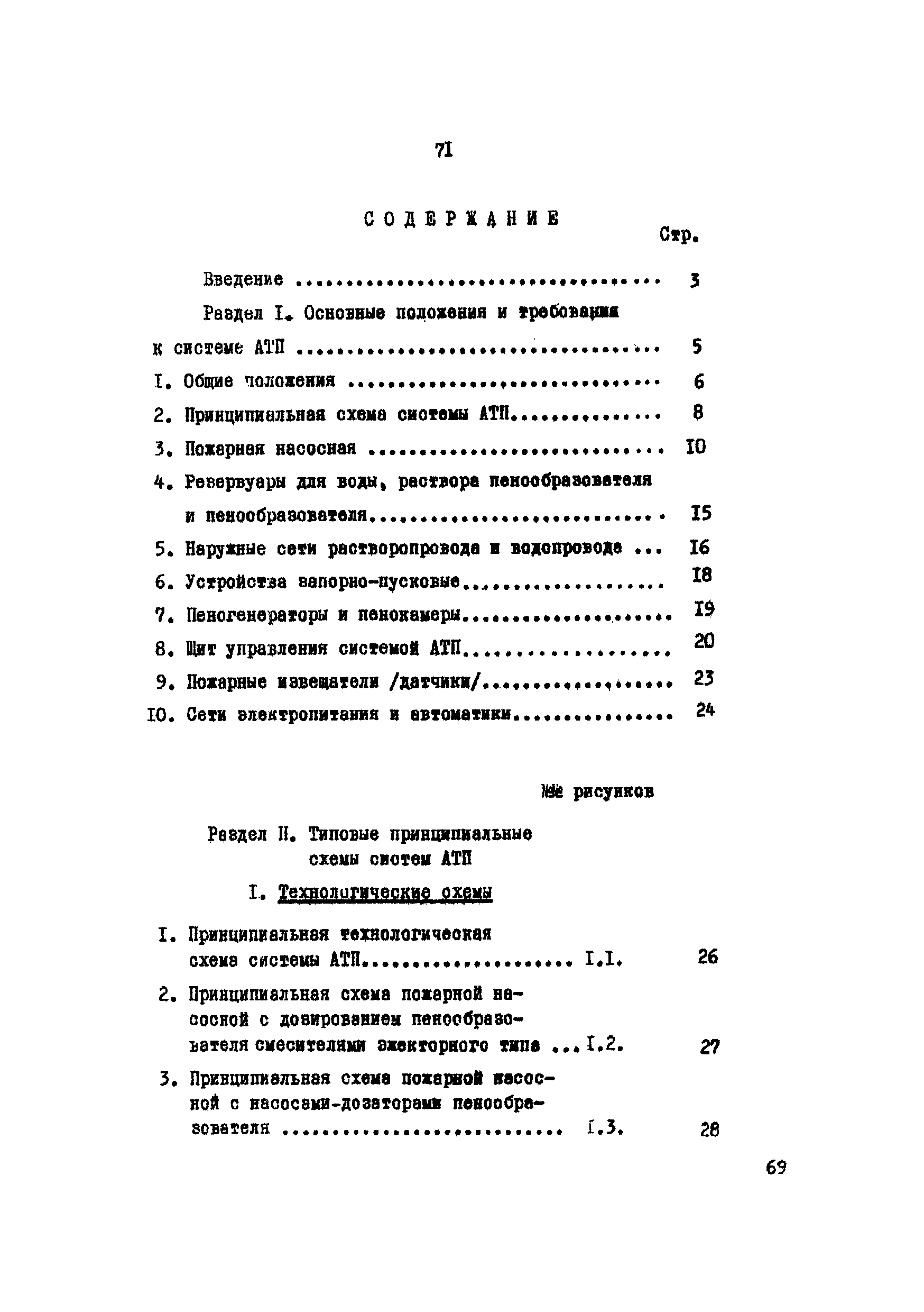 | Оглавление: | Введение Раздел I. Основные положения и требования к системе АТП 1 Общие положения 2 Принципиальная схема системы АТП 3 Пожарная насосная 4 Резервуары для воды, раствора пенообразователя и пенообразователя 5 Наружные сети растворопровода и водопровода 6 Устройства запорно—пусковые 7 Пеногенераторы и пенокамеры 8 Щит управления системой АТП 9 Пожарные извещатели (датчики) 10 Сети электропитания и автоматики Раздел II. Типовые принципиальные схемы систем АТП I Технологические схемы 1 Принципиальная технологическая схема системы АТП 2 Принципиальная схема пожарной насосной с дозированием пенообразователя смесителями эжекторного типа 3 Принципиальная схема пожарной насосной с насосами-дозаторами пенообразователя 4 Принципиальная схема пожарной насосной с подачей готового раствора пенообразователя 5 Принципиальные схемы автономных систем АТП 6 Схема установки для поддержания давления в растворопроводе 7 Схема подачи раствора пенообразователя с установкой в камере задвижки с электроприводом 8 Схема подачи раствора пенообразователя с установкой в камере клапанов БК или КБГЭМ 9 Принципиальная схема пожаротушения подземных железобетонных резервуаров 2 Схемы автоматики 1 Схема автоматики пожаротушения резервуарного парка с электрической системой управления 2 Схема автоматики пожаротушения резервуарного парка с пневматической системой управления 3 Схема автоматики пожаротушения перекачивающей (или подпорной) насосной 4 Схема автоматики пожарной насосной с дозированием пенообразователя смесителями эжекторного типа 5 Схема автоматики пожарной насосной с насосами-дозаторами 6 Схема автоматики пожарной насосной с подачей готового раствора пенообразователя (или воды) 7 Схема автоматики узла автономного пожаротушения перекачивающей (или подпорной) насосной с подачей пенообразователя под давлением 8 Схема автоматики узла автономного пожаротушения перекачивающей (или подпорной) насосной с эжектированием пенообразователя 3 Электрические схемы автоматики 1 Щит диспетчера (оператора) защищаемого сооружения. Узел общестанционной автоматики для вариантов с датчиками типа ТРВ и приставкой ПИО-017 2 Щит диспетчера (оператора) защищаемого сооружения. Узел общестанционной автоматики для вариантов с датчиками спринклерного типа. Узел сигнализации 3 Щит АТП. Вариант с использованием станции пожарной сигнализации ТОЛ с датчиками ТРВ с приставкой ПИО-017 4 Щит АТП. Вариант с использованием станции пожарной сигнализации ТОЛ с датчиками ТРВ с приставкой ПИО-017. Узел лучевых реле 5 Щит АТП. Вариант с использованием станции пожарной сигнализации ТОЛ с датчиками спринклерного типа 6 Щит АТП. Вариант с использованием станции пожарной сигнализации ТОЛ с датчиками спринклерного типа. Узел лучевых реле 7 Щит АТП. Вариант с использованием реле импульсной сигнализации РИС с датчиками типа ТРВ и приставкой ПИО-017 8 Щит АТП. Вариант с использованием реле импульсной сигнализации РИС с датчиками спринклерного типа 9 Щит АТП. Вариант с использованием реле импульсной сигнализации РИС с датчиками спринклерного типа (продолжение) 10 Щит АТП. Узел управления электроприводными задвижками растворопроводов 11 Пожарная насосная. Связи со щитом АТП и сигнализация 12 Пожарная насосная. Связи со щитом АТП и сигнализация (продолжение) 13 Пожарн