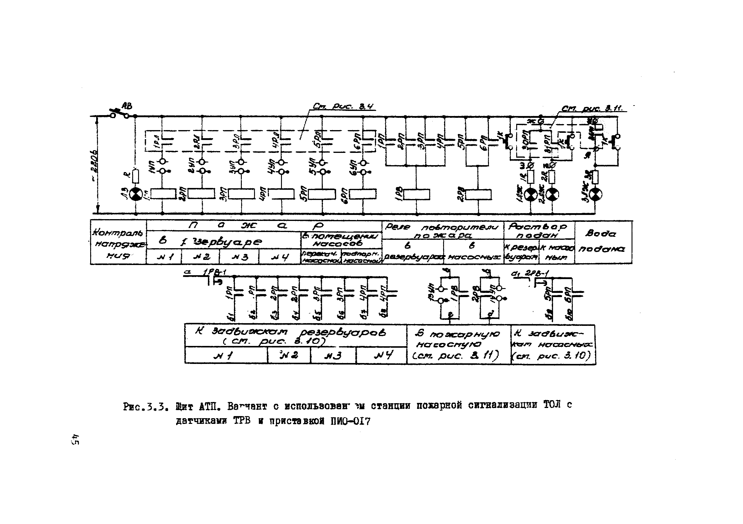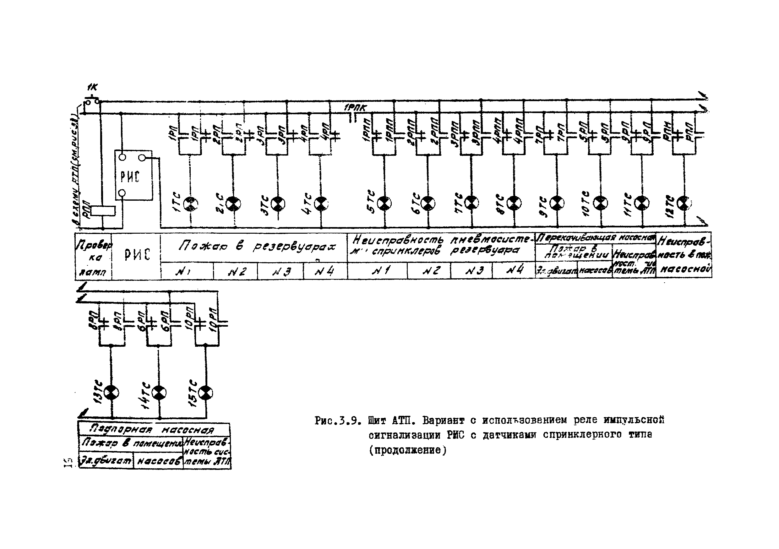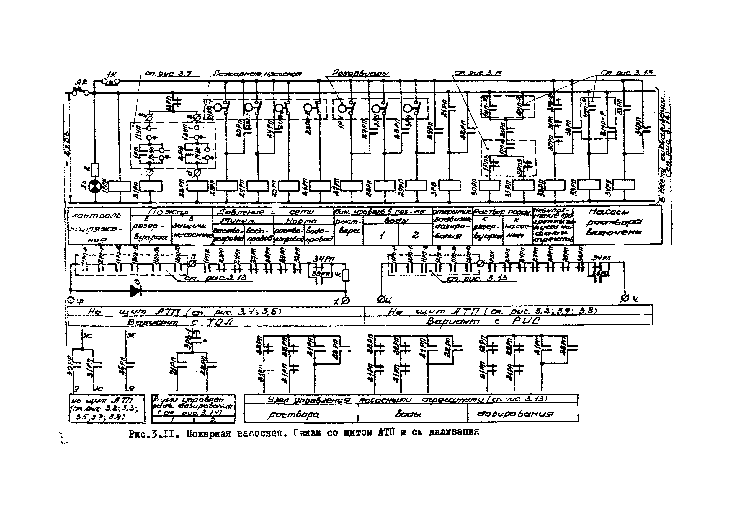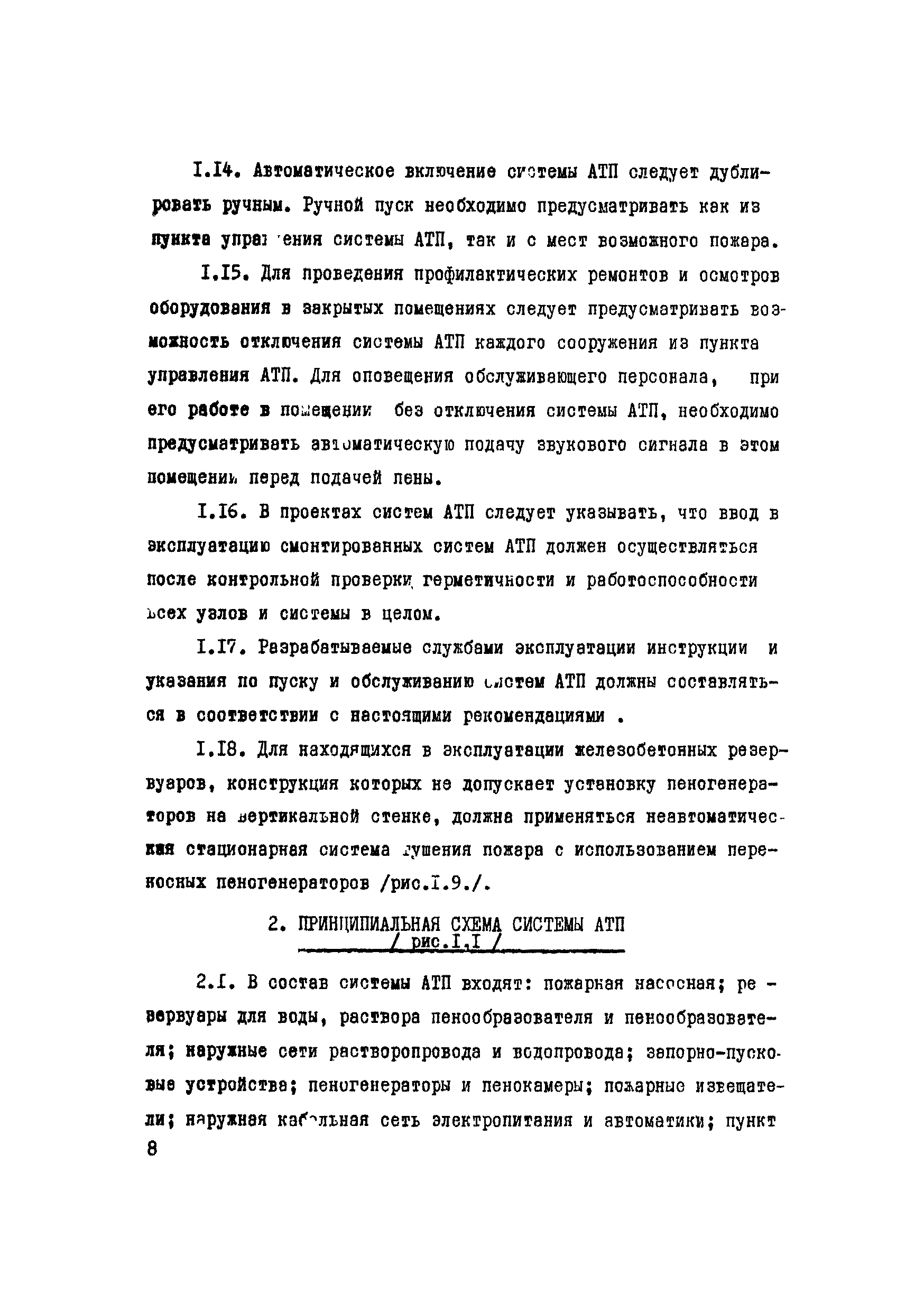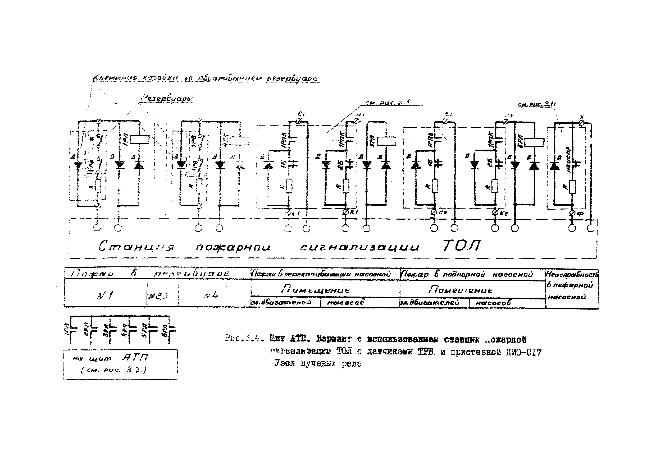| Оглавление: | Введение Раздел I. Основные положения и требования к системе АТП 1 Общие положения 2 Принципиальная схема системы АТП 3 Пожарная насосная 4 Резервуары для воды, раствора пенообразователя и пенообразователя 5 Наружные сети растворопровода и водопровода 6 Устройства запорно—пусковые 7 Пеногенераторы и пенокамеры 8 Щит управления системой АТП 9 Пожарные извещатели (датчики) 10 Сети электропитания и автоматики Раздел II. Типовые принципиальные схемы систем АТП I Технологические схемы 1 Принципиальная технологическая схема системы АТП 2 Принципиальная схема пожарной насосной с дозированием пенообразователя смесителями эжекторного типа 3 Принципиальная схема пожарной насосной с насосами-дозаторами пенообразователя 4 Принципиальная схема пожарной насосной с подачей готового раствора пенообразователя 5 Принципиальные схемы автономных систем АТП 6 Схема установки для поддержания давления в растворопроводе 7 Схема подачи раствора пенообразователя с установкой в камере задвижки с электроприводом 8 Схема подачи раствора пенообразователя с установкой в камере клапанов БК или КБГЭМ 9 Принципиальная схема пожаротушения подземных железобетонных резервуаров 2 Схемы автоматики 1 Схема автоматики пожаротушения резервуарного парка с электрической системой управления 2 Схема автоматики пожаротушения резервуарного парка с пневматической системой управления 3 Схема автоматики пожаротушения перекачивающей (или подпорной) насосной 4 Схема автоматики пожарной насосной с дозированием пенообразователя смесителями эжекторного типа 5 Схема автоматики пожарной насосной с насосами-дозаторами 6 Схема автоматики пожарной насосной с подачей готового раствора пенообразователя (или воды) 7 Схема автоматики узла автономного пожаротушения перекачивающей (или подпорной) насосной с подачей пенообразователя под давлением 8 Схема автоматики узла автономного пожаротушения перекачивающей (или подпорной) насосной с эжектированием пенообразователя 3 Электрические схемы автоматики 1 Щит диспетчера (оператора) защищаемого сооружения. Узел общестанционной автоматики для вариантов с датчиками типа ТРВ и приставкой ПИО-017 2 Щит диспетчера (оператора) защищаемого сооружения. Узел общестанционной автоматики для вариантов с датчиками спринклерного типа. Узел сигнализации 3 Щит АТП. Вариант с использованием станции пожарной сигнализации ТОЛ с датчиками ТРВ с приставкой ПИО-017 4 Щит АТП. Вариант с использованием станции пожарной сигнализации ТОЛ с датчиками ТРВ с приставкой ПИО-017. Узел лучевых реле 5 Щит АТП. Вариант с использованием станции пожарной сигнализации ТОЛ с датчиками спринклерного типа 6 Щит АТП. Вариант с использованием станции пожарной сигнализации ТОЛ с датчиками спринклерного типа. Узел лучевых реле 7 Щит АТП. Вариант с использованием реле импульсной сигнализации РИС с датчиками типа ТРВ и приставкой ПИО-017 8 Щит АТП. Вариант с использованием реле импульсной сигнализации РИС с датчиками спринклерного типа 9 Щит АТП. Вариант с использованием реле импульсной сигнализации РИС с датчиками спринклерного типа (продолжение) 10 Щит АТП. Узел управления электроприводными задвижками растворопроводов 11 Пожарная насосная. Связи со щитом АТП и сигнализация 12 Пожарная насосная. Связи со щитом АТП и сигнализация (продолжение) 13 Пожарн
