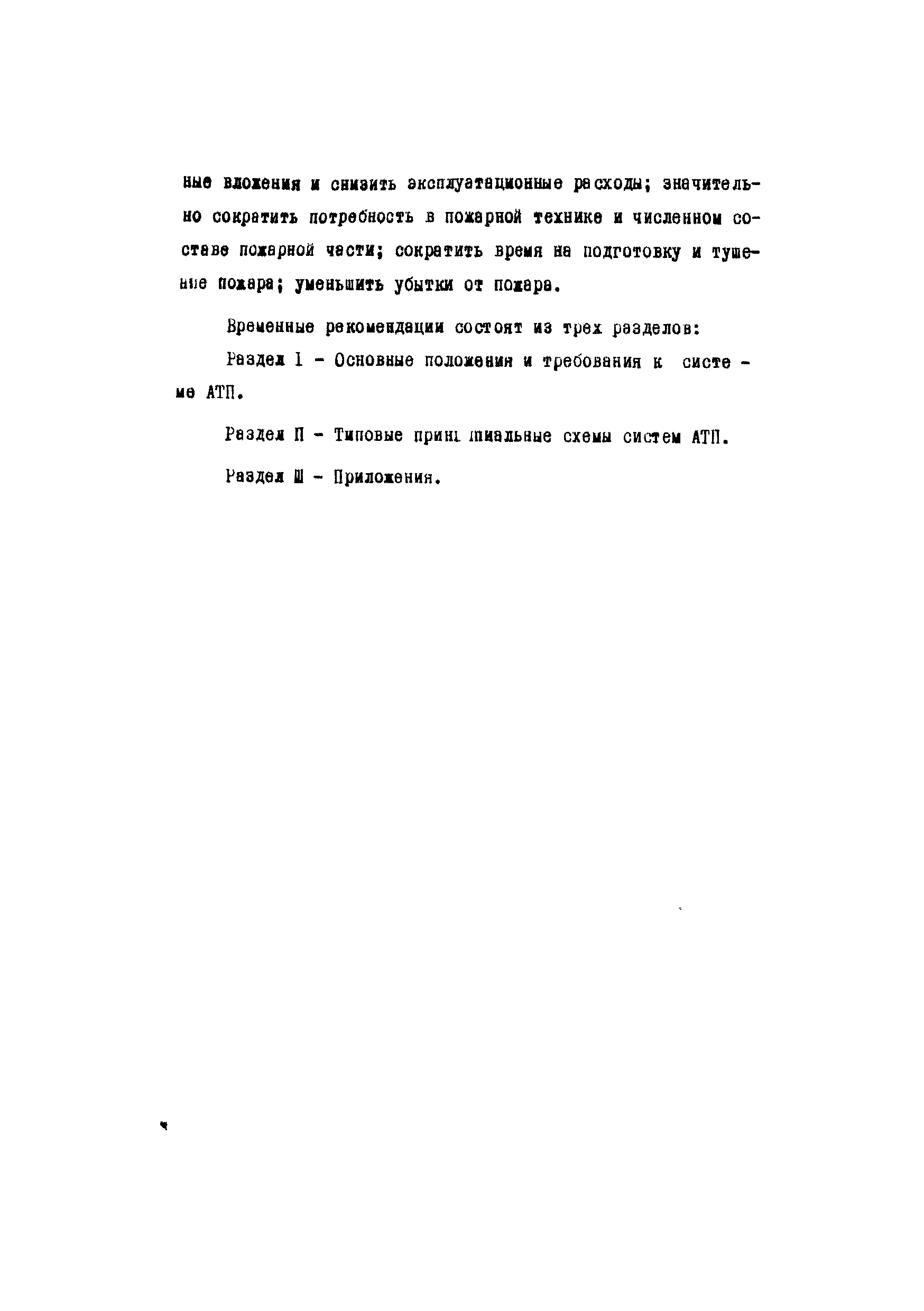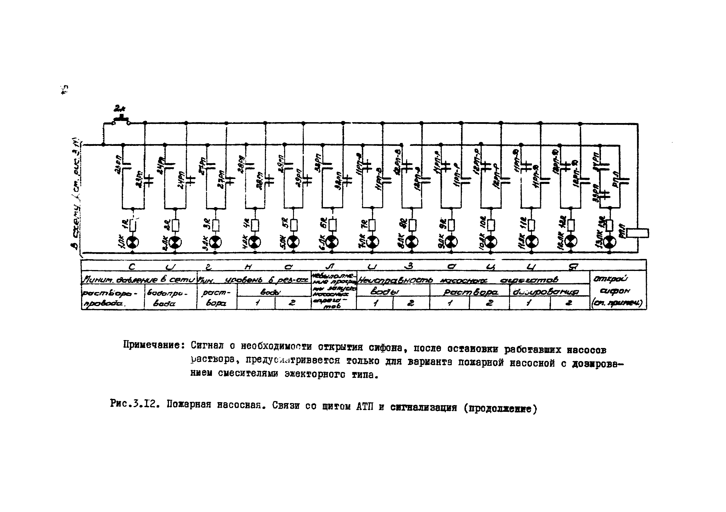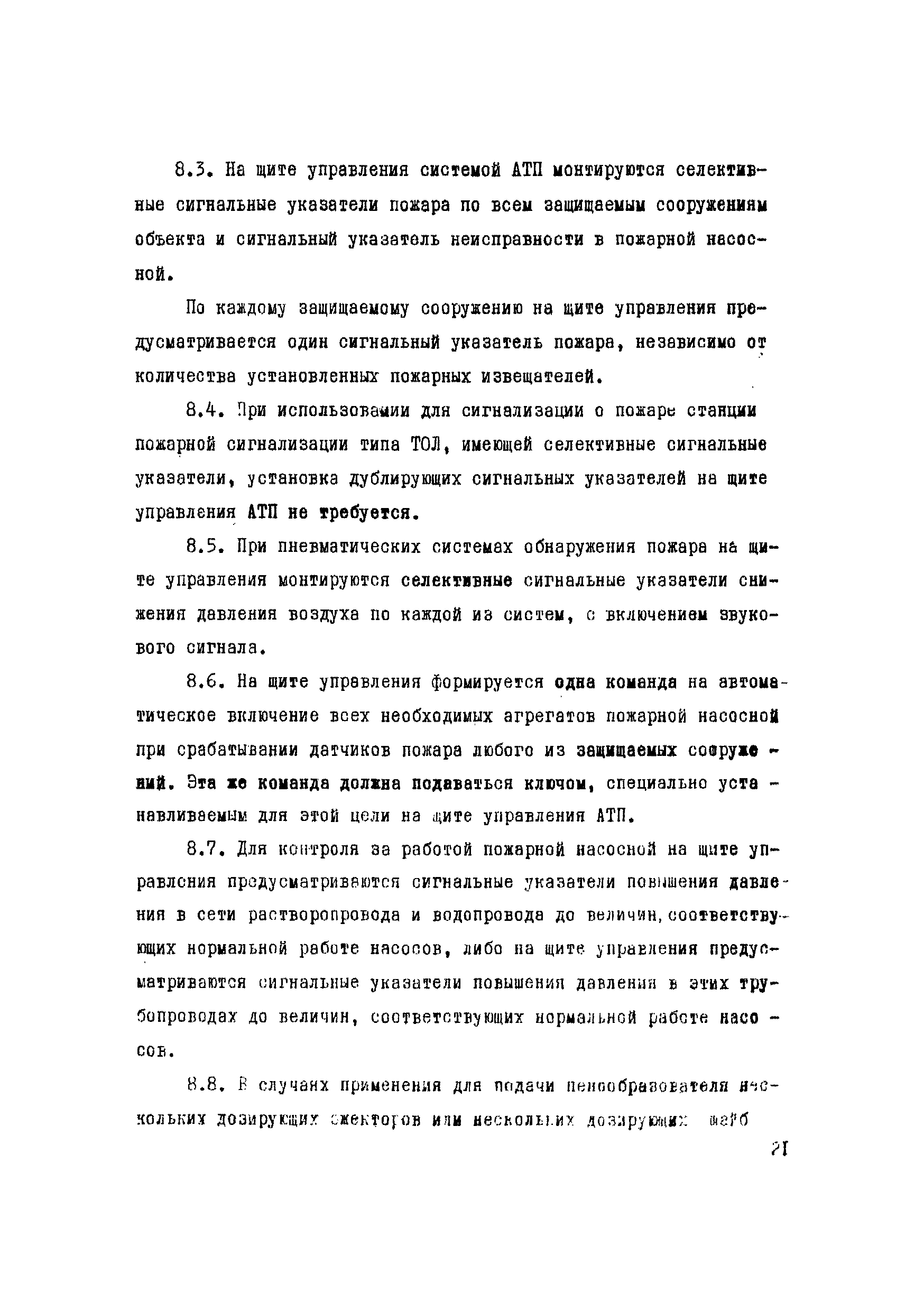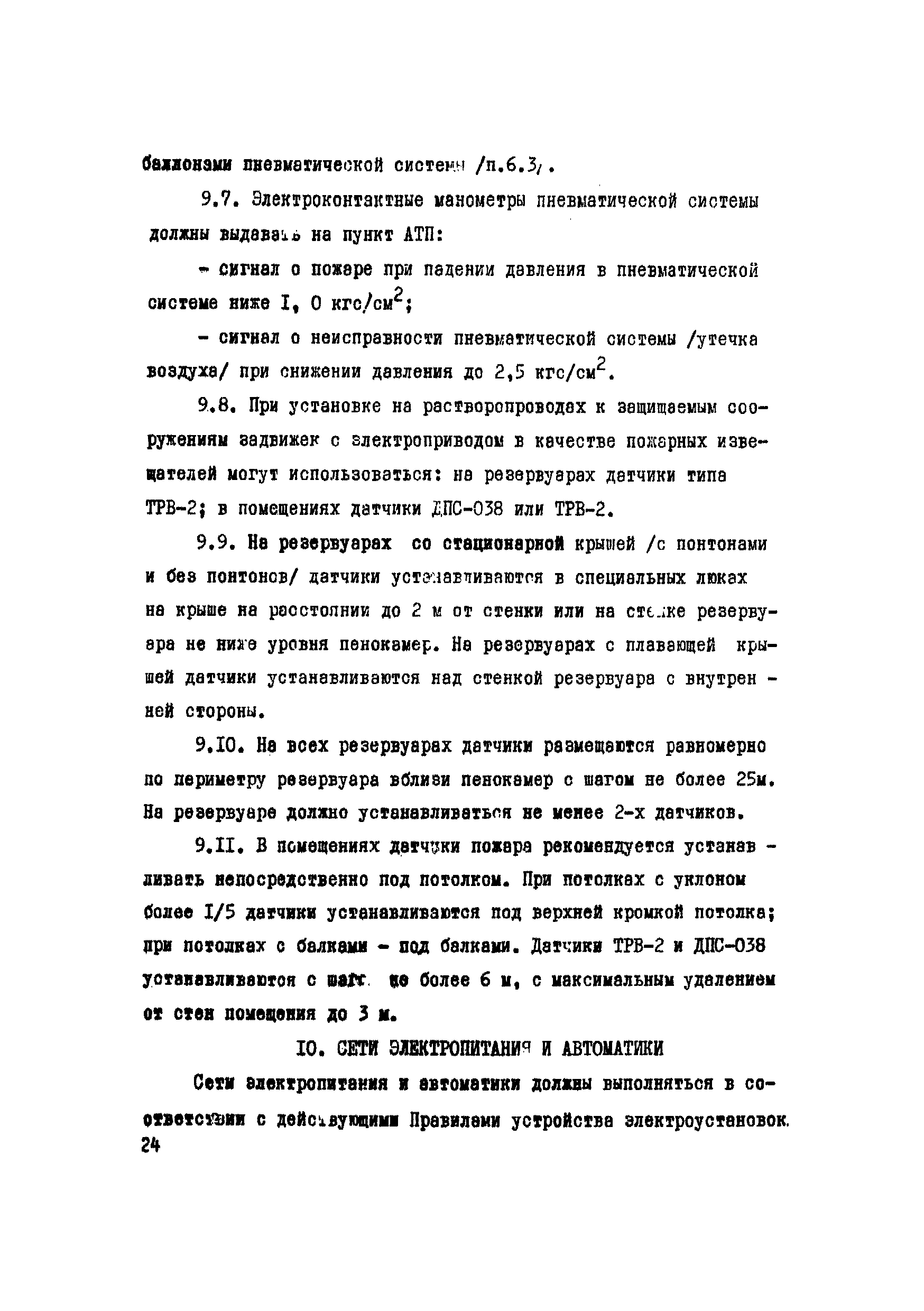 | Оглавление: | Введение Раздел I. Основные положения и требования к системе АТП 1 Общие положения 2 Принципиальная схема системы АТП 3 Пожарная насосная 4 Резервуары для воды, раствора пенообразователя и пенообразователя 5 Наружные сети растворопровода и водопровода 6 Устройства запорно—пусковые 7 Пеногенераторы и пенокамеры 8 Щит управления системой АТП 9 Пожарные извещатели (датчики) 10 Сети электропитания и автоматики Раздел II. Типовые принципиальные схемы систем АТП I Технологические схемы 1 Принципиальная технологическая схема системы АТП 2 Принципиальная схема пожарной насосной с дозированием пенообразователя смесителями эжекторного типа 3 Принципиальная схема пожарной насосной с насосами-дозаторами пенообразователя 4 Принципиальная схема пожарной насосной с подачей готового раствора пенообразователя 5 Принципиальные схемы автономных систем АТП 6 Схема установки для поддержания давления в растворопроводе 7 Схема подачи раствора пенообразователя с установкой в камере задвижки с электроприводом 8 Схема подачи раствора пенообразователя с установкой в камере клапанов БК или КБГЭМ 9 Принципиальная схема пожаротушения подземных железобетонных резервуаров 2 Схемы автоматики 1 Схема автоматики пожаротушения резервуарного парка с электрической системой управления 2 Схема автоматики пожаротушения резервуарного парка с пневматической системой управления 3 Схема автоматики пожаротушения перекачивающей (или подпорной) насосной 4 Схема автоматики пожарной насосной с дозированием пенообразователя смесителями эжекторного типа 5 Схема автоматики пожарной насосной с насосами-дозаторами 6 Схема автоматики пожарной насосной с подачей готового раствора пенообразователя (или воды) 7 Схема автоматики узла автономного пожаротушения перекачивающей (или подпорной) насосной с подачей пенообразователя под давлением 8 Схема автоматики узла автономного пожаротушения перекачивающей (или подпорной) насосной с эжектированием пенообразователя 3 Электрические схемы автоматики 1 Щит диспетчера (оператора) защищаемого сооружения. Узел общестанционной автоматики для вариантов с датчиками типа ТРВ и приставкой ПИО-017 2 Щит диспетчера (оператора) защищаемого сооружения. Узел общестанционной автоматики для вариантов с датчиками спринклерного типа. Узел сигнализации 3 Щит АТП. Вариант с использованием станции пожарной сигнализации ТОЛ с датчиками ТРВ с приставкой ПИО-017 4 Щит АТП. Вариант с использованием станции пожарной сигнализации ТОЛ с датчиками ТРВ с приставкой ПИО-017. Узел лучевых реле 5 Щит АТП. Вариант с использованием станции пожарной сигнализации ТОЛ с датчиками спринклерного типа 6 Щит АТП. Вариант с использованием станции пожарной сигнализации ТОЛ с датчиками спринклерного типа. Узел лучевых реле 7 Щит АТП. Вариант с использованием реле импульсной сигнализации РИС с датчиками типа ТРВ и приставкой ПИО-017 8 Щит АТП. Вариант с использованием реле импульсной сигнализации РИС с датчиками спринклерного типа 9 Щит АТП. Вариант с использованием реле импульсной сигнализации РИС с датчиками спринклерного типа (продолжение) 10 Щит АТП. Узел управления электроприводными задвижками растворопроводов 11 Пожарная насосная. Связи со щитом АТП и сигнализация 12 Пожарная насосная. Связи со щитом АТП и сигнализация (продолжение) 13 Пожарн