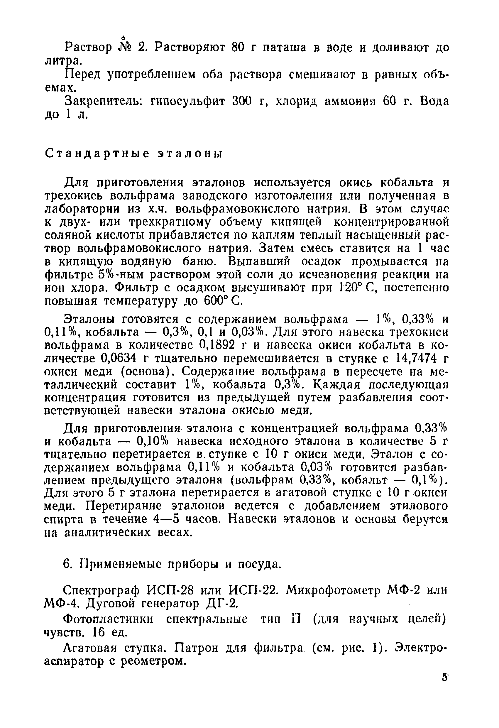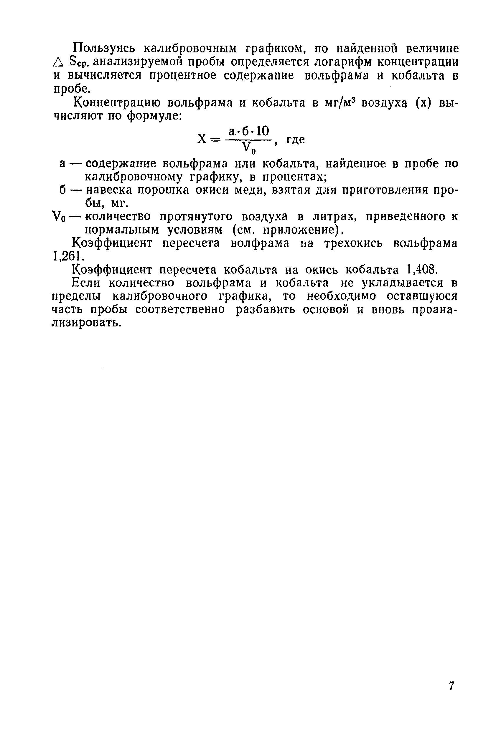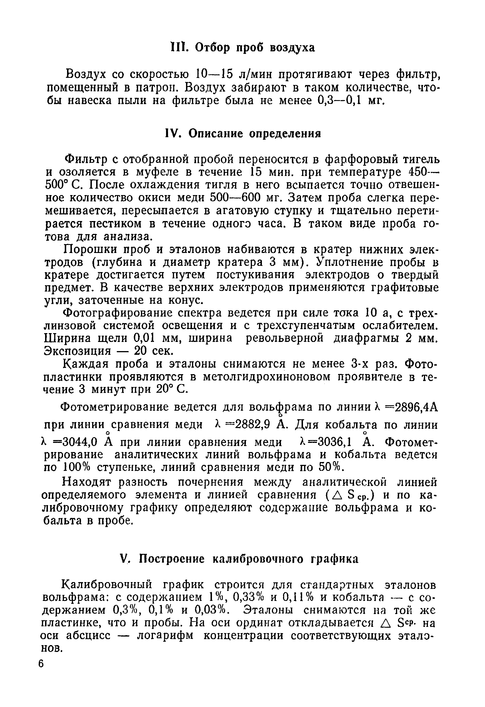 Определение вольфрама и кобальта в воздухе спектрографическим методом| Статус: | действует | | Название рус.: | Определение вольфрама и кобальта в воздухе спектрографическим методом | | Дата добавления в базу: | 01.01.2019 | | Дата актуализации: | 01.01.2021 | | Оглавление: | I. Общая часть II. Реактивы и аппаратура III. Отбор проб воздуха IV. Описание определения V. Построение калибровочного графика Приложение 1. Формула приведения объема воздуха к нормальным условиям при аспирационном методе отбора проб Приложение 2. Таблица коэффициентов для различных температур и давлений, на которые надо умножить Vt для приведения объема воздуха к нормальным условиям | | Разработан: | ВЦСПС