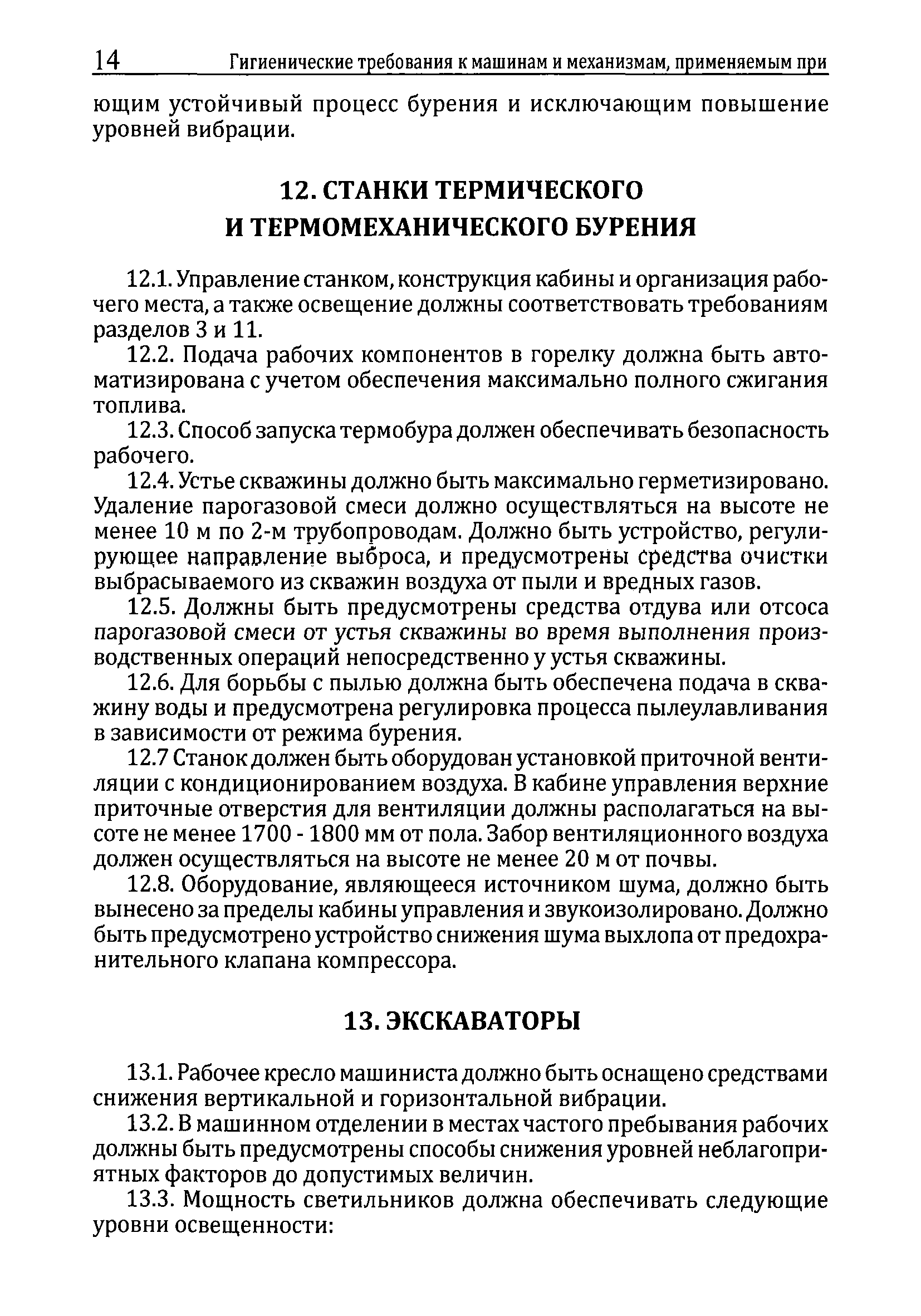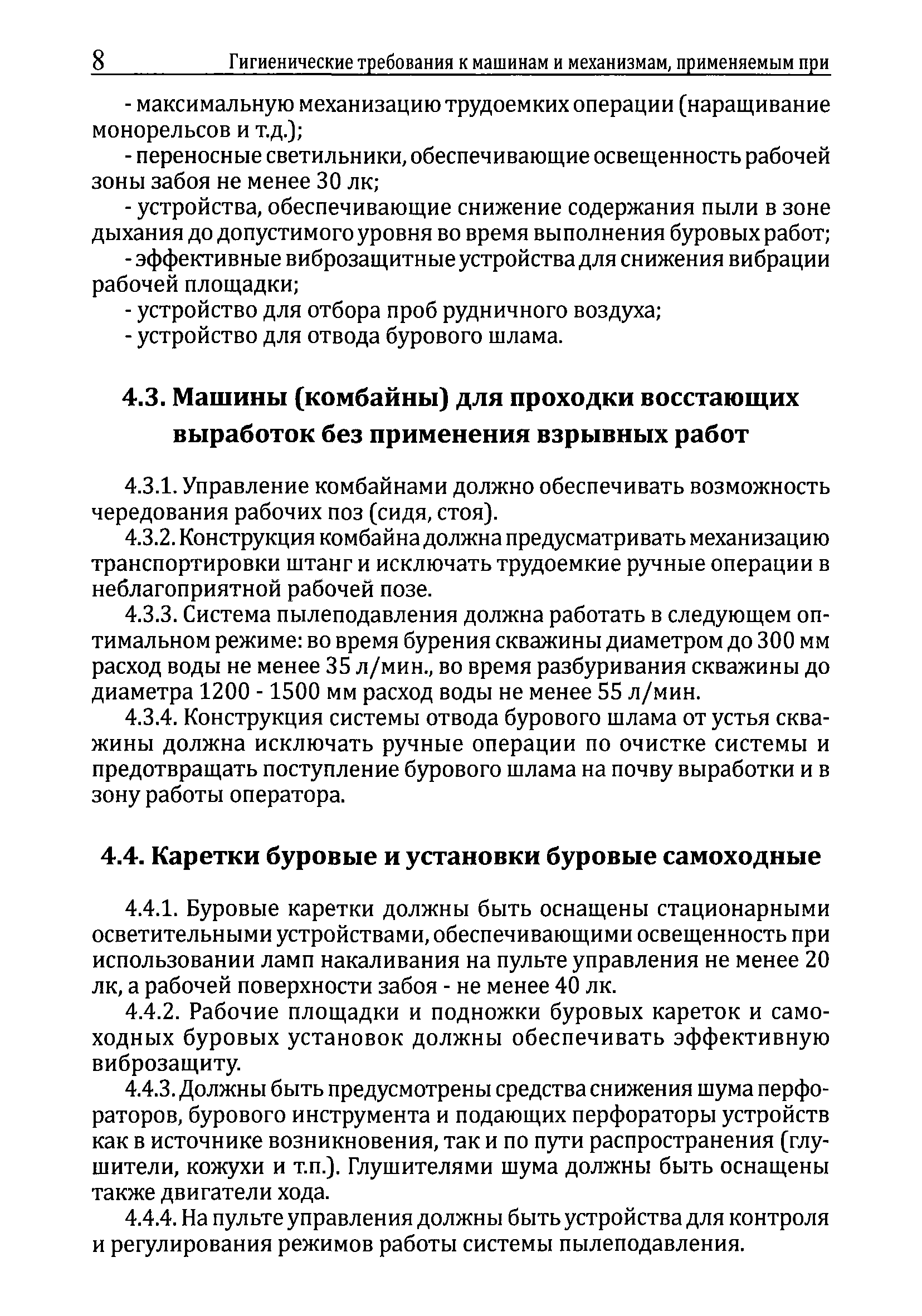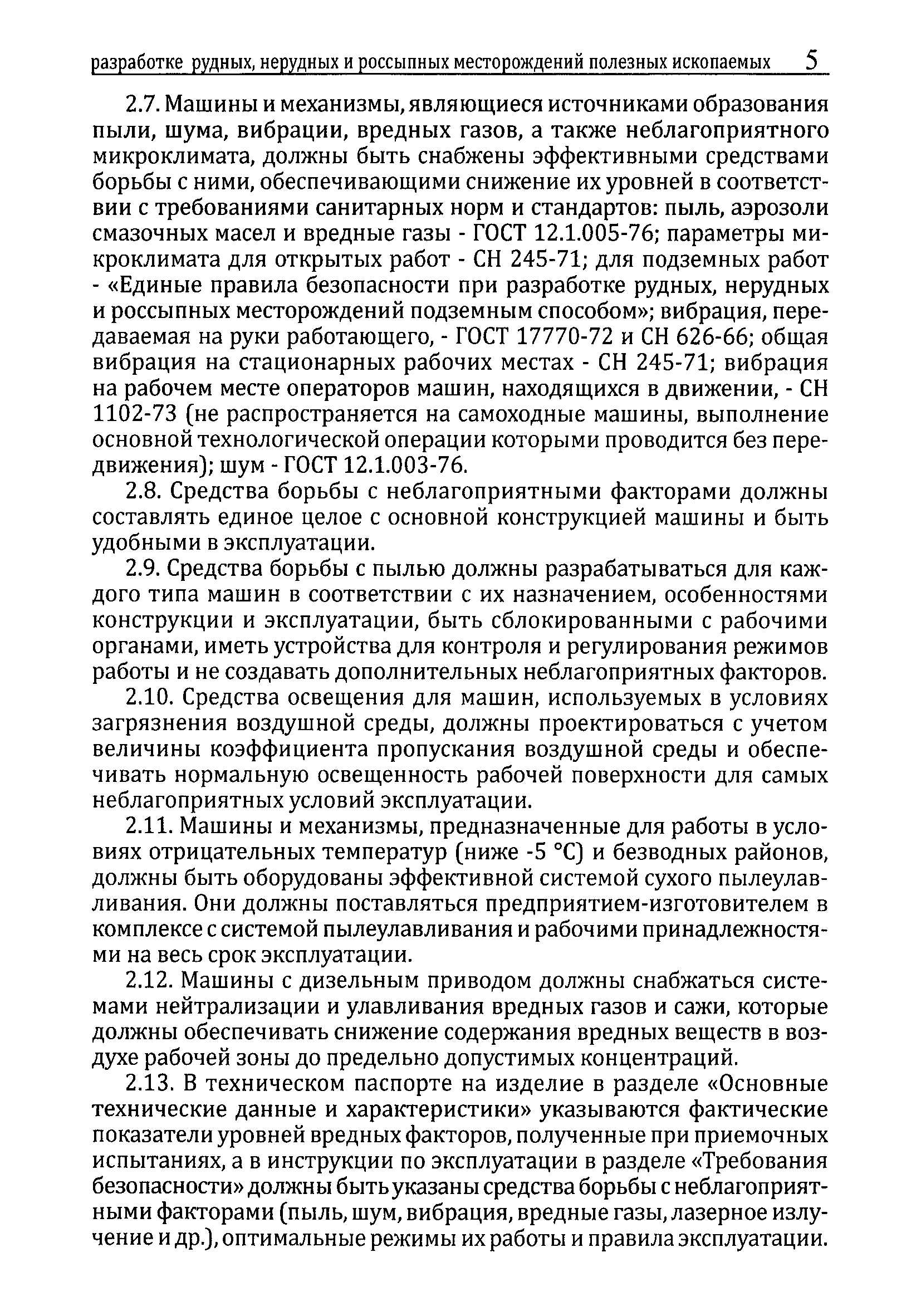 Гигиенические требования к машинам и механизмам, применяемым при разработке рудных, нерудных и россыпных месторождений полезных ископаемых| Статус: | утратил силу | | Название рус.: | Гигиенические требования к машинам и механизмам, применяемым при разработке рудных, нерудных и россыпных месторождений полезных ископаемых | | Дата добавления в базу: | 01.01.2021 | | Дата актуализации: | 01.01.2021 | | Дата введения: | 19.02.1979 | | Дата окончания срока действия: | 14.12.2017 | | Область применения: | Требования предназначены для проектных и научно-исследовательских организаций, которые проводят конструирование и испытание машин и механизмов, для предприятий, изготавливающих и эксплуатирующих эти машины и механизмы, санэпидстанций | | Оглавление: | 1. Общие положения 2. Общие требования к машинам и механизмам 3. Требования к кабинам 4. Буровая техника 4.1. Перфораторы ручные, телескопные и колонковые 4.2. Комплексы механизированные для проходки восстающих выработок буровзрывным способом 4.3. Машины (комбайны) для проходки восстающих выработок без применения взрывных работ 4.4. Каретки буровые и установки буровые самоходные 4.5. Станки буровые для подземных горных работ 4.6. Проходческие комбайны и комплексы 5. Машины погрузочные 6. Машины погрузочно-доставочные 7. Машины и механизмы для выпуска и доставки горной массы 8. Вагонетки 9. Машины для зарядки и забойки скважин 10. Машины самоходные с дизельным приводом и автосамосвалы 11. Станки буровые шарошечные, применяемые для открытых горных работ 12. Станки термического и термомеханического бурения 13. Экскаваторы 14. Машины ручные (ручной механизированный инструмент) для вспомогательных работ Приложение. Список нормативных документов | | Утверждён: | 19.02.1979 Главный государственный санитарный врач CCCР (1964-79)