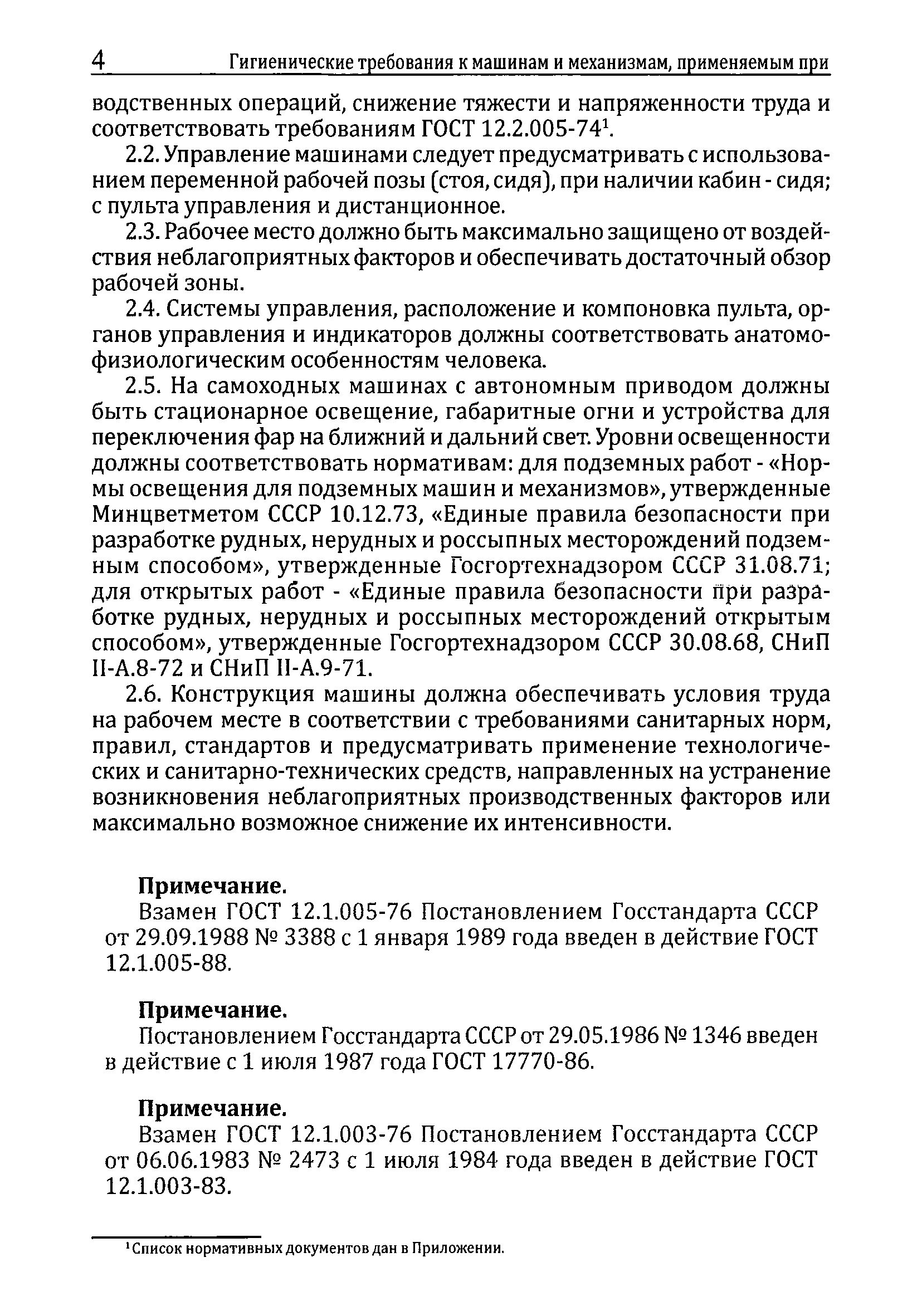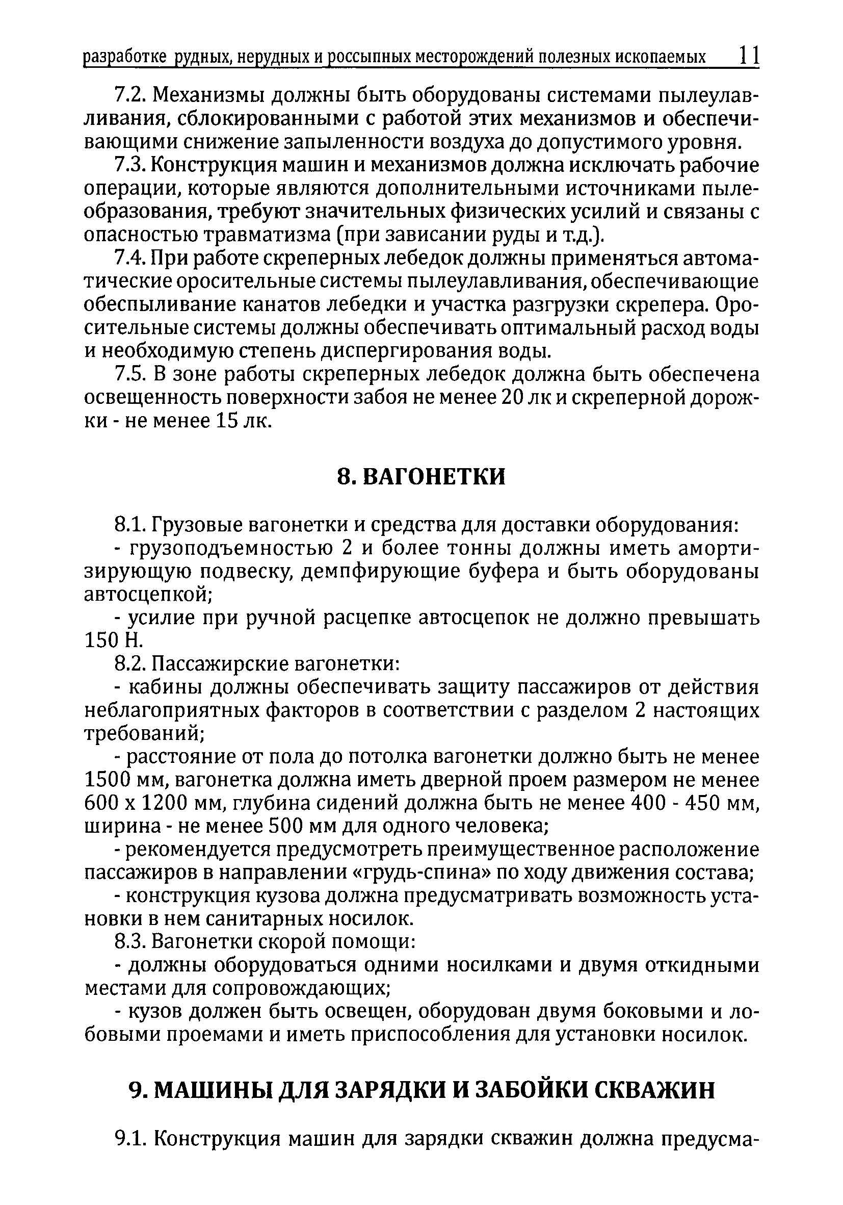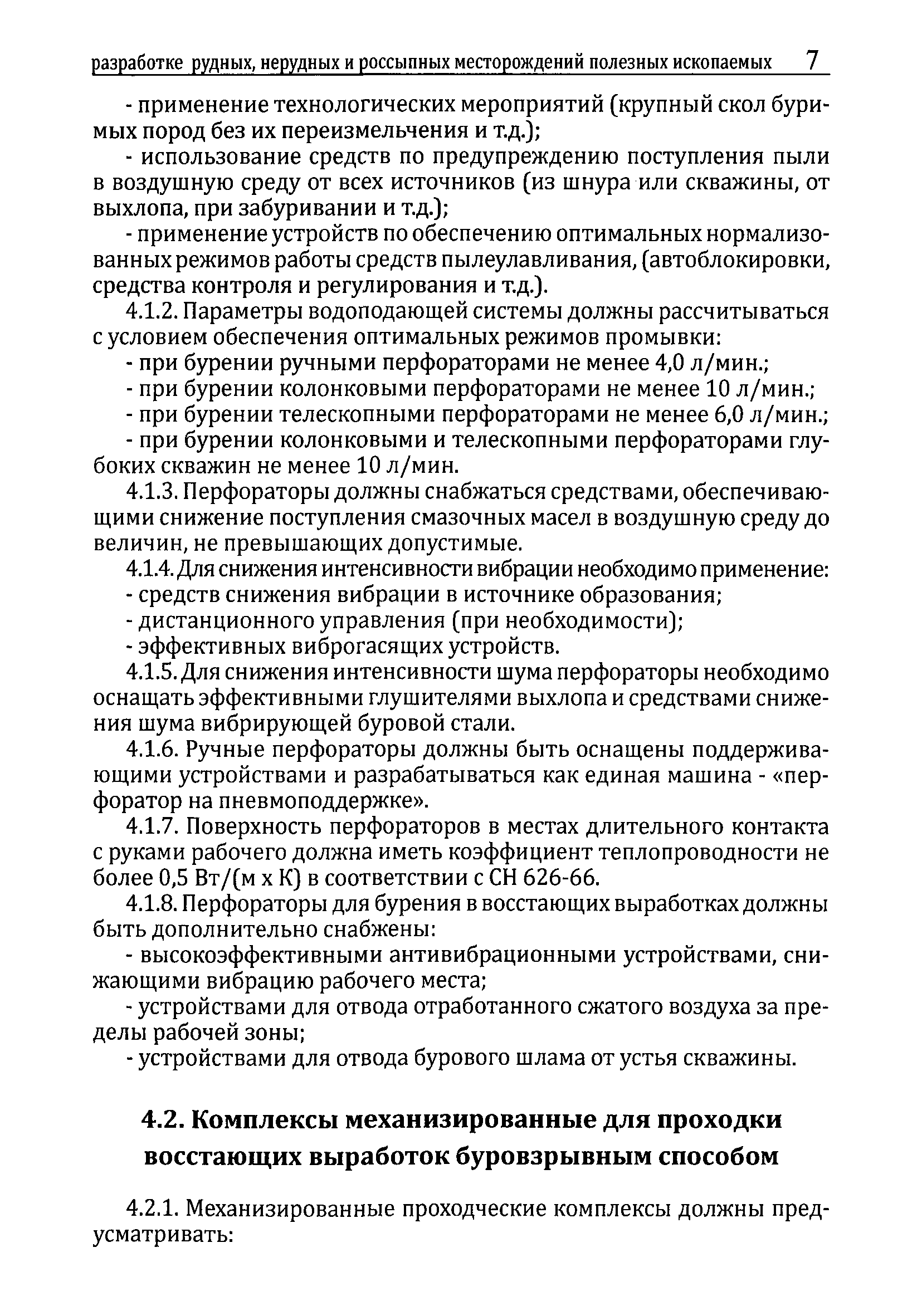 Гигиенические требования к машинам и механизмам, применяемым при разработке рудных, нерудных и россыпных месторождений полезных ископаемых| Статус: | утратил силу | | Название рус.: | Гигиенические требования к машинам и механизмам, применяемым при разработке рудных, нерудных и россыпных месторождений полезных ископаемых | | Дата добавления в базу: | 01.01.2021 | | Дата актуализации: | 01.01.2021 | | Дата введения: | 19.02.1979 | | Дата окончания срока действия: | 14.12.2017 | | Область применения: | Требования предназначены для проектных и научно-исследовательских организаций, которые проводят конструирование и испытание машин и механизмов, для предприятий, изготавливающих и эксплуатирующих эти машины и механизмы, санэпидстанций | | Оглавление: | 1. Общие положения 2. Общие требования к машинам и механизмам 3. Требования к кабинам 4. Буровая техника 4.1. Перфораторы ручные, телескопные и колонковые 4.2. Комплексы механизированные для проходки восстающих выработок буровзрывным способом 4.3. Машины (комбайны) для проходки восстающих выработок без применения взрывных работ 4.4. Каретки буровые и установки буровые самоходные 4.5. Станки буровые для подземных горных работ 4.6. Проходческие комбайны и комплексы 5. Машины погрузочные 6. Машины погрузочно-доставочные 7. Машины и механизмы для выпуска и доставки горной массы 8. Вагонетки 9. Машины для зарядки и забойки скважин 10. Машины самоходные с дизельным приводом и автосамосвалы 11. Станки буровые шарошечные, применяемые для открытых горных работ 12. Станки термического и термомеханического бурения 13. Экскаваторы 14. Машины ручные (ручной механизированный инструмент) для вспомогательных работ Приложение. Список нормативных документов | | Утверждён: | 19.02.1979 Главный государственный санитарный врач CCCР (1964-79)