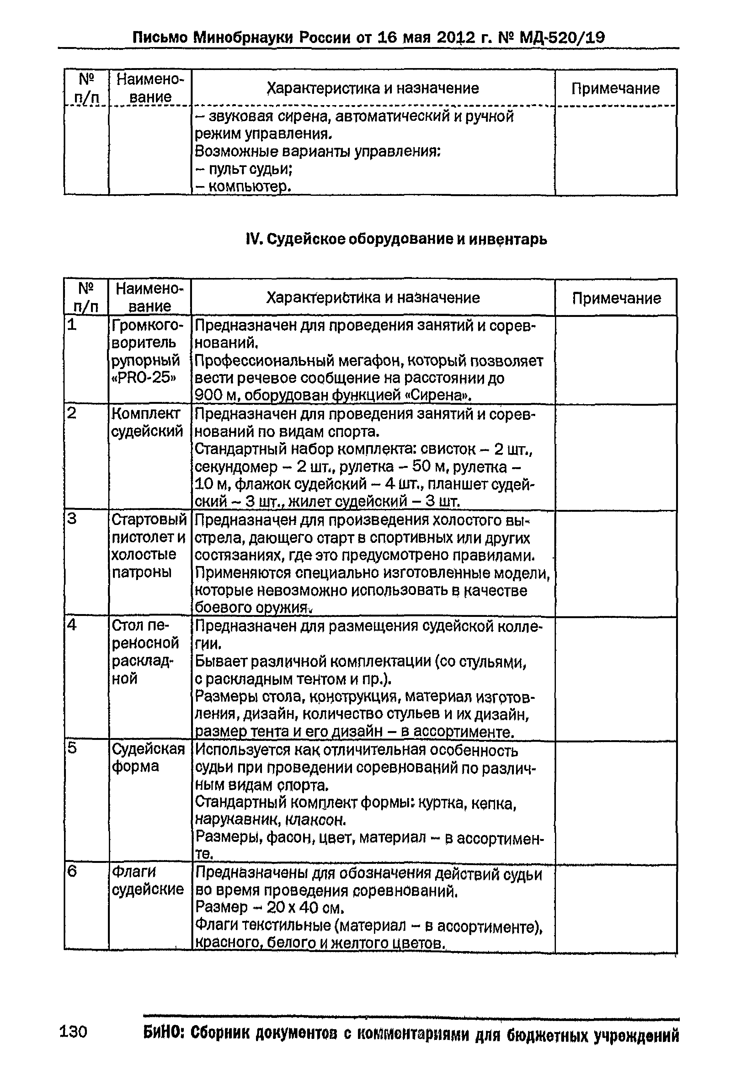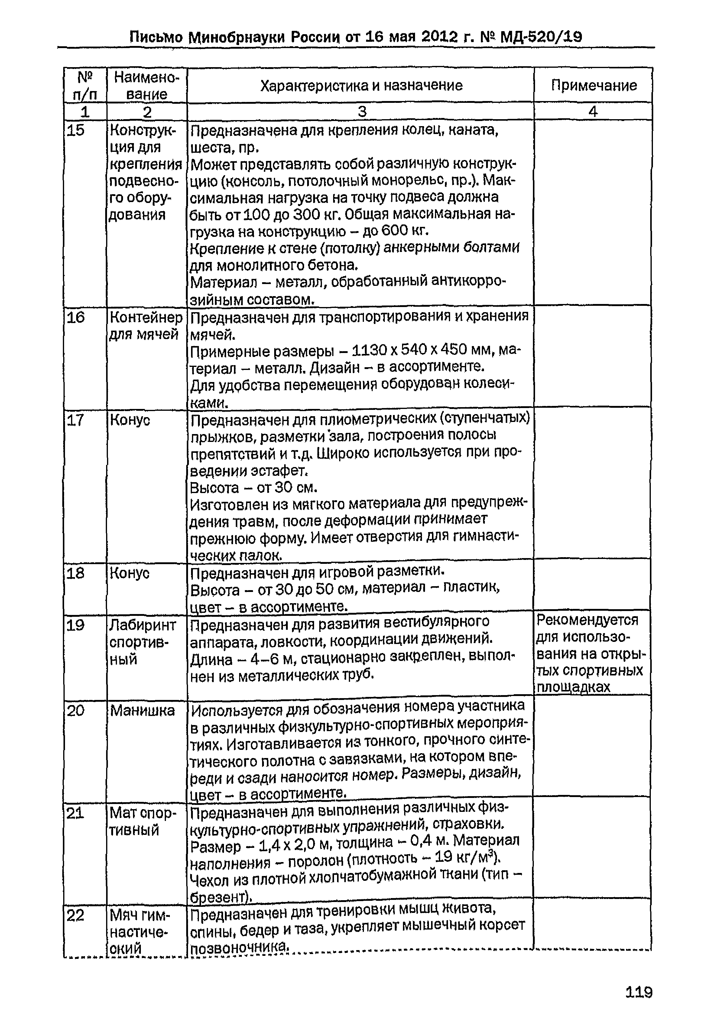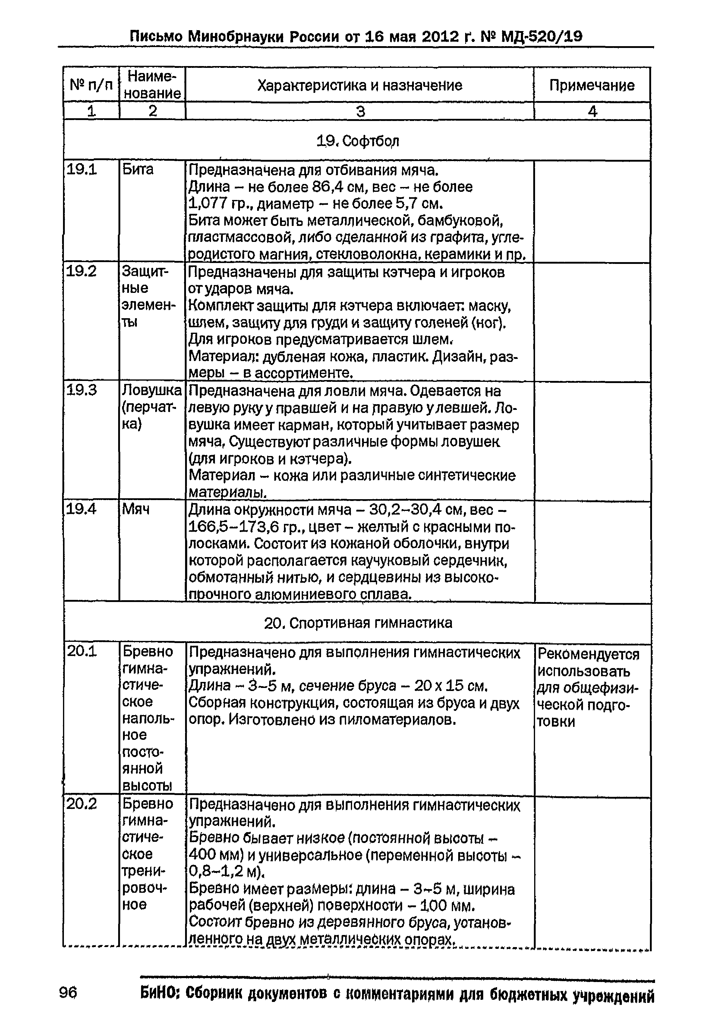 | Область применения: | Перечень подготовлен с целью оказания помощи органам исполнительной власти субъектов Российской Федерации и муниципальным органам, осуществляющим управление в сфере образования, а также общеобразовательным учреждениям в приобретении современного спортивного оборудования и инвентаря для организации учебной деятельности по предмету "Физическая культура", внеучебной деятельности физкультурно-спортивной направленности, реализации программ дополнительного образования детей физкультурно-спортивной направленности, организации деятельности школьных спортивных клубов и т.д. В Перечне представлены обобщенные характеристики современного спортивного оборудования и инвентаря, которые могут быть более детально представлены у конкретных производителей. В Перечень не включены оборудование и инвентарь, предназначенные для личного пользования обучающихся. Перечень может быть дополнен органами исполнительной власти субъектов Российской Федерации, осуществляющими управление в сфере образования, в части, касающейся национальных видов спорта и видов спорта, не включенных в перечень, но являющихся приоритетными в субъекте Российской Федерации. |