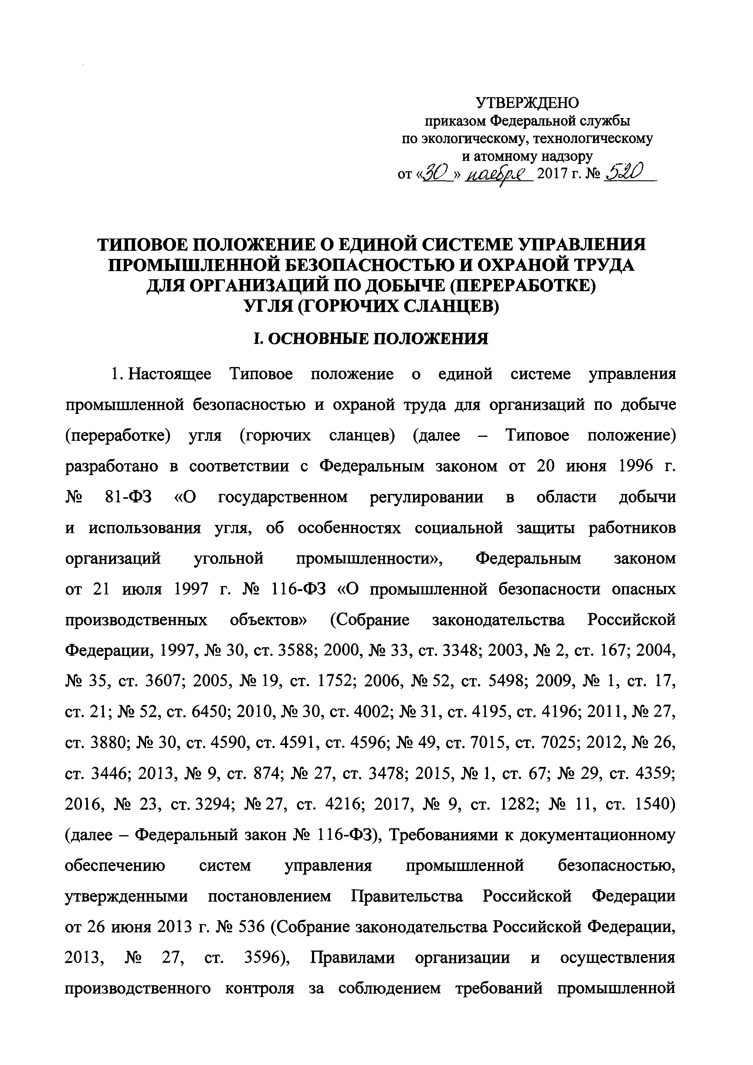 | Название рус.: | Типовое положение о единой системе управления промышленной безопасностью и охраной труда для организаций по добыче (переработке) угля (горючих сланцев) |