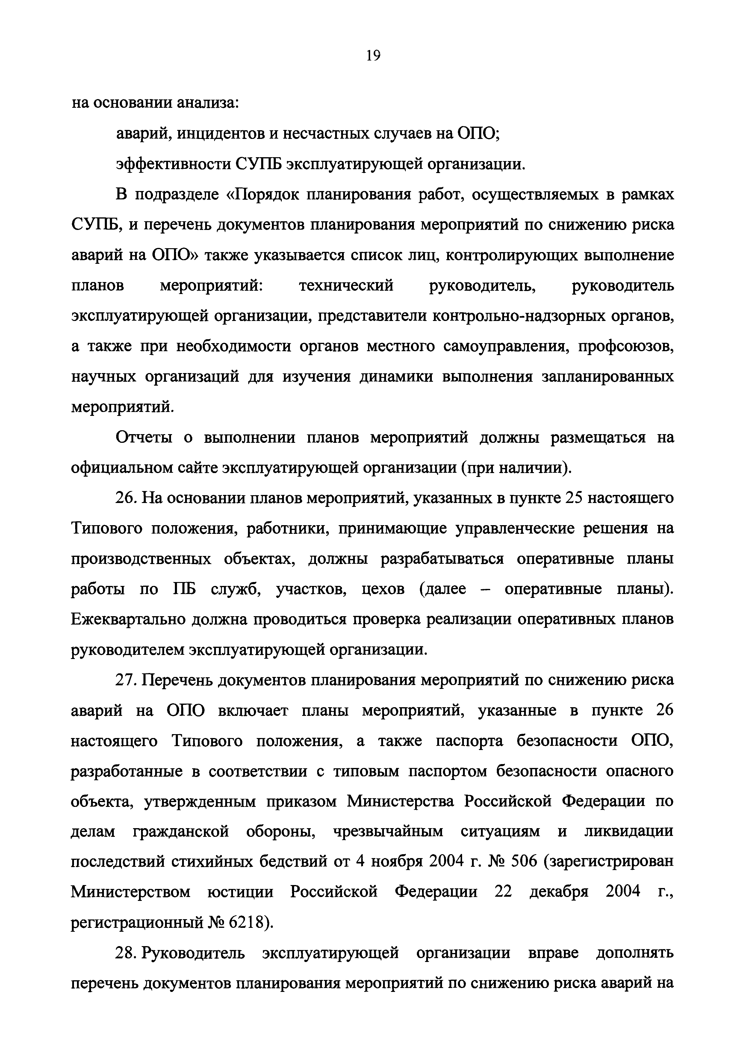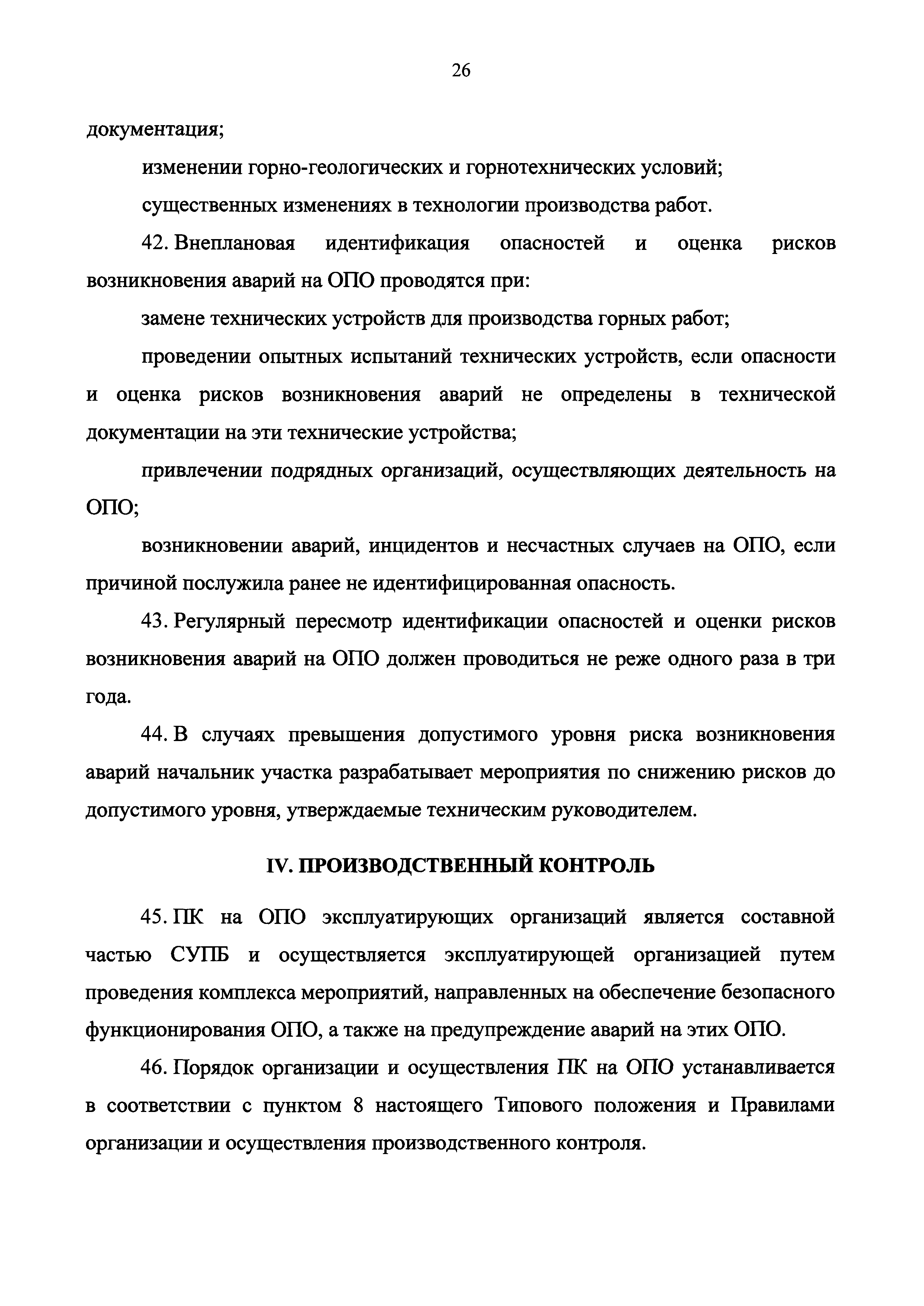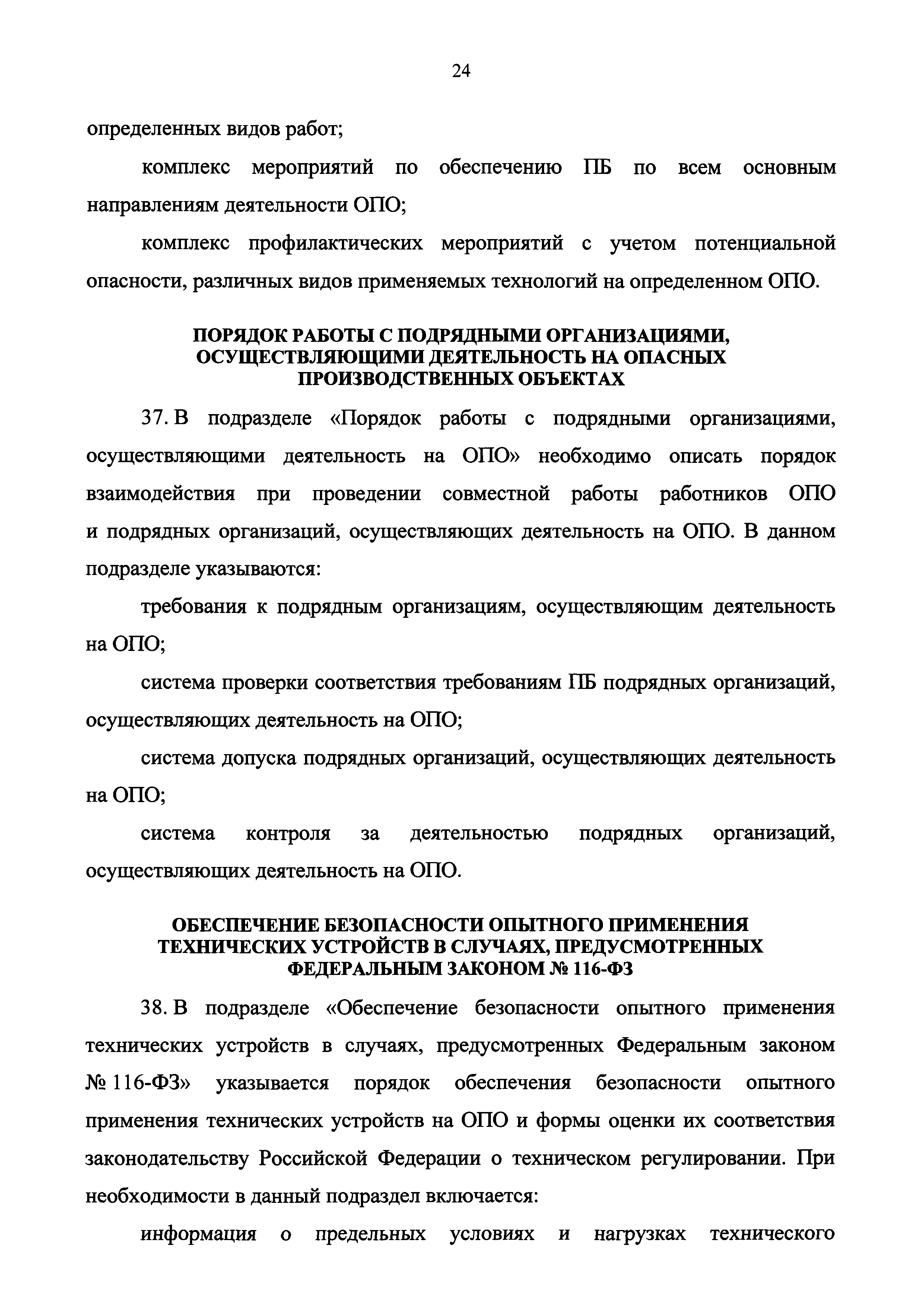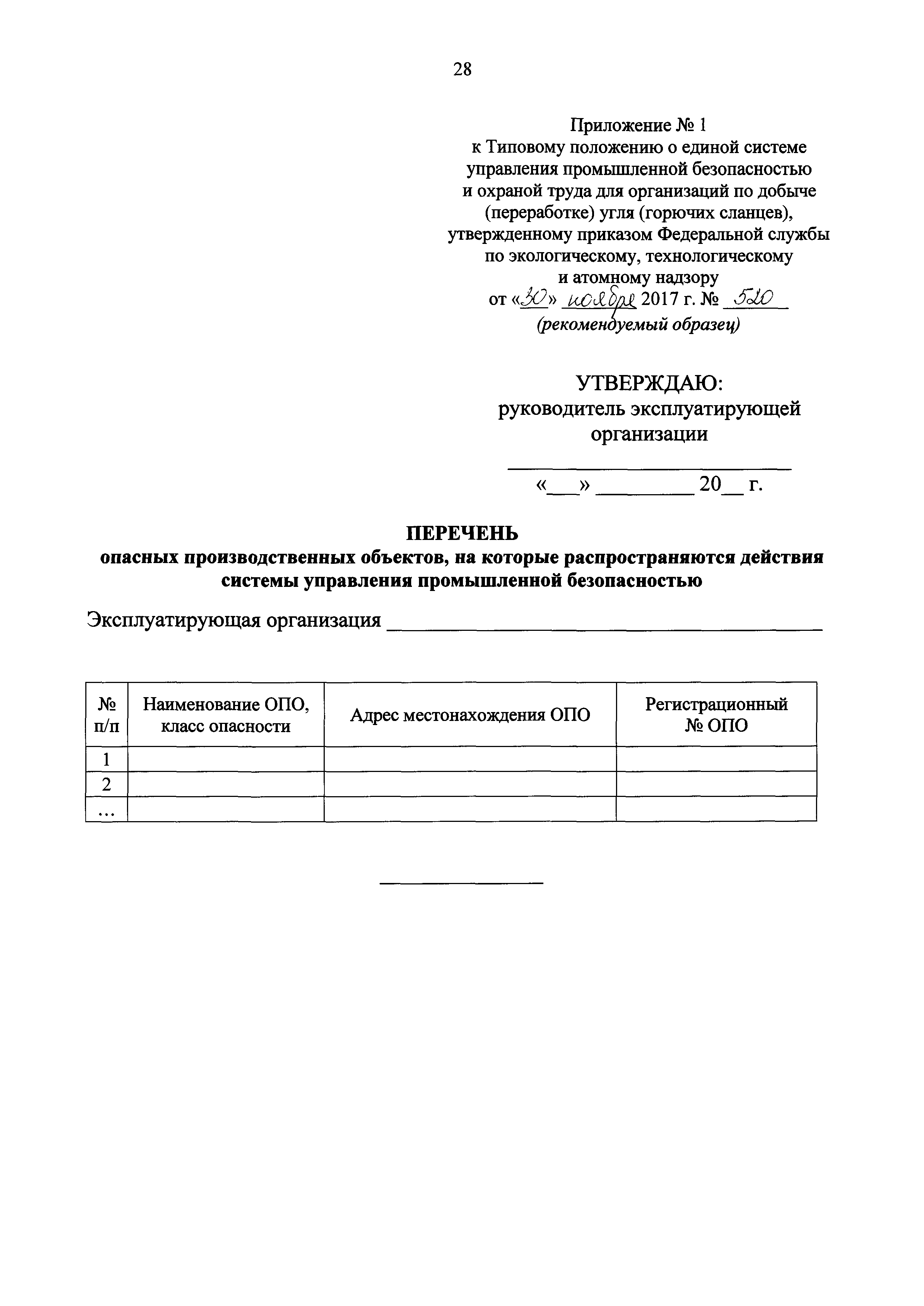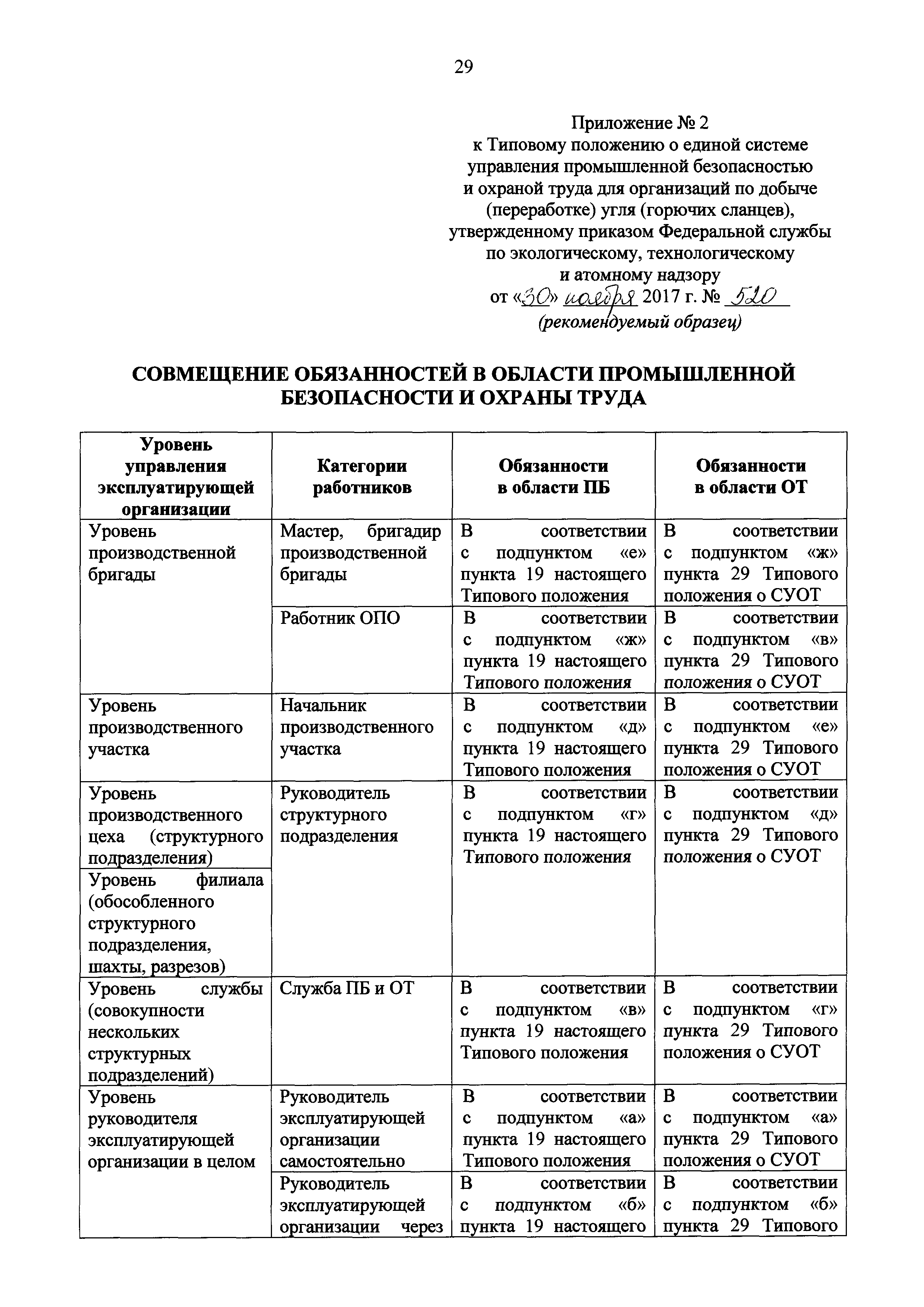 | Оглавление: | I. Основные положения II. Структура и основные положения системы управления промышленной безопасностью и охрана труда III. Система управления промышленной безопасностью эксплуатирующей организации Задачи эксплуатирующей организации в области промышленной безопасности Описание структуры системы управления промышленной безопасностью и ее места в общей системе управления эксплуатирующей организации Перечень опасных производственных объектов эксплуатирующей организации, на которые распространяется действие системы управления промышленной безопасностью Функции, права и обязанности руководителей эксплуатирующих организаций, их заместителей, работников в области промышленной безопасности Порядок проведения консультаций с работниками опасных производственных объектов и их представителями по вопросам обеспечения промышленной безопасности Организация материального и финансового обеспечения мероприятий, осуществляемых в рамках системы управления промышленной безопасностью Порядок планирования работ, осуществляемых в рамках системы управления промышленной безопасностью, и перечень документов планирования мероприятий по снижению риска аварий на опасных производственных объектах Порядок проведения анализа функционирования системы управления промышленной безопасностью, разработки и осуществления корректирующих мероприятий, направленных на устранение выявленных несоответствий требованиям промышленной безопасности и повышения уровня промышленной безопасности Организация информационного обеспечения в рамках системы управления промышленной безопасностью Порядок проведения предаттестационной подготовки и аттестации в области промышленной безопасности руководителей и работников эксплуатирующей организации Порядок проведения обучения и проверки знаний в области промышленной безопасности работников опасных производственных объектов Организация документационного обеспечения мероприятий осуществляемых в рамках системы управления промышленной безопасностью Порядок работы с подрядными организациями, осуществляющими деятельность на опасных производственных объектах Обеспечение безопасности опытного применения технических устройств в случаях, предусмотренных федеральным законом № 116-ФЗ Порядок идентификации опасностей и оценки рисков возникновения аварий на опасных производственных объектах IV. Производственный контроль V. Система управления охраной труда Приложение № 1 Перечень опасных производственных объектов, на которые распространяются действия системы управления промышленной безопасностью Приложение № 2 Совмещение обязанностей в области промышленной безопасности и охраны труда |