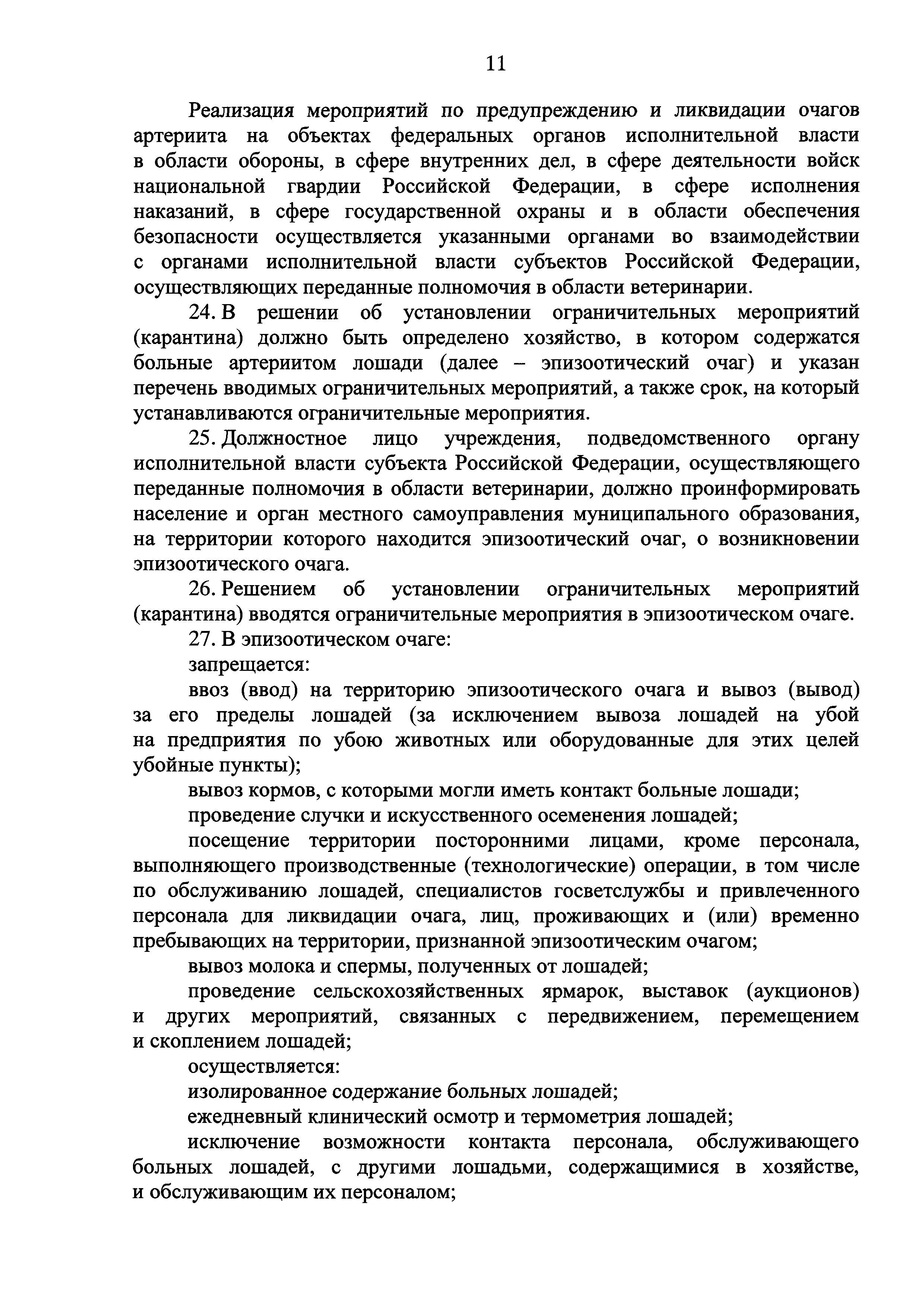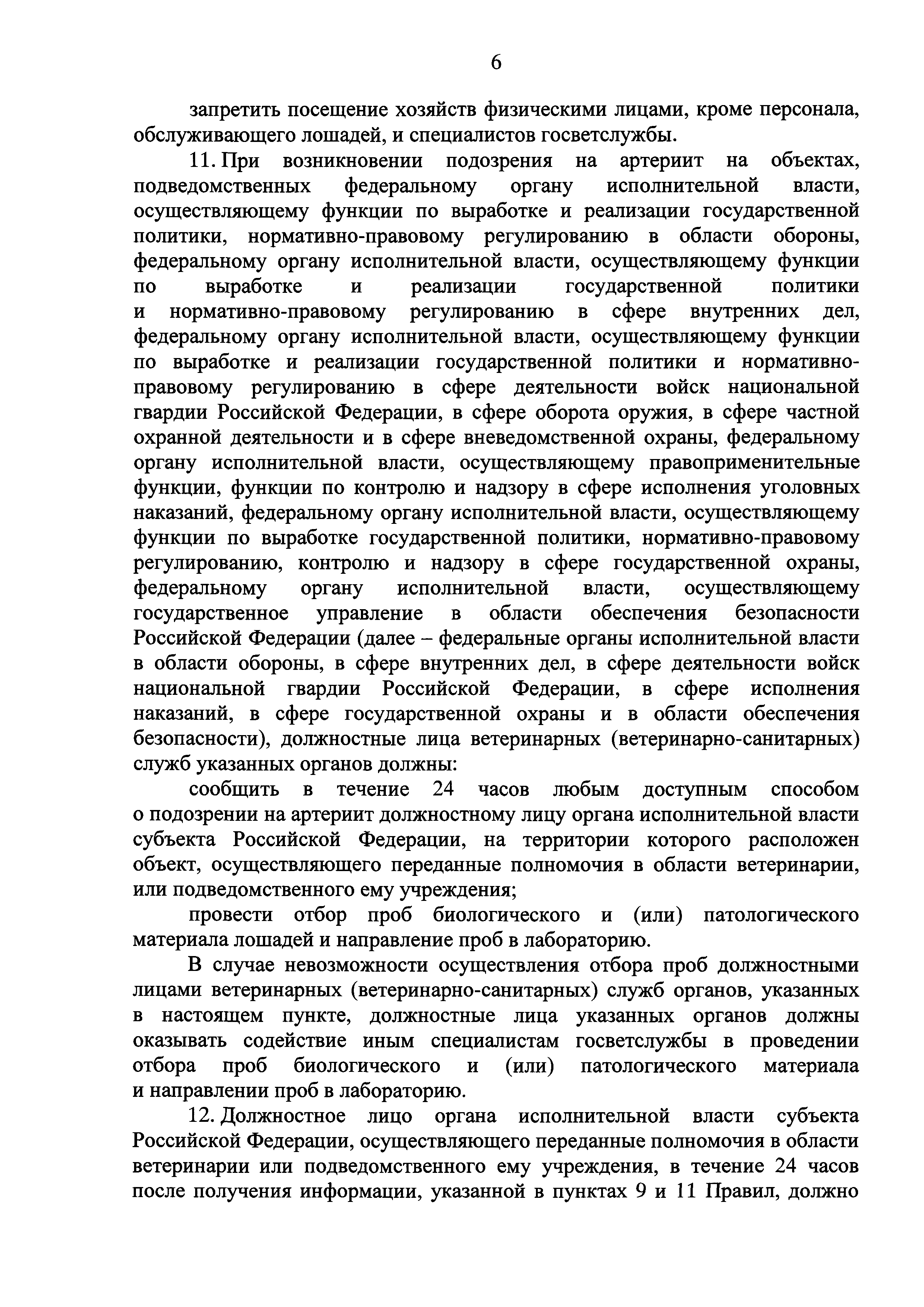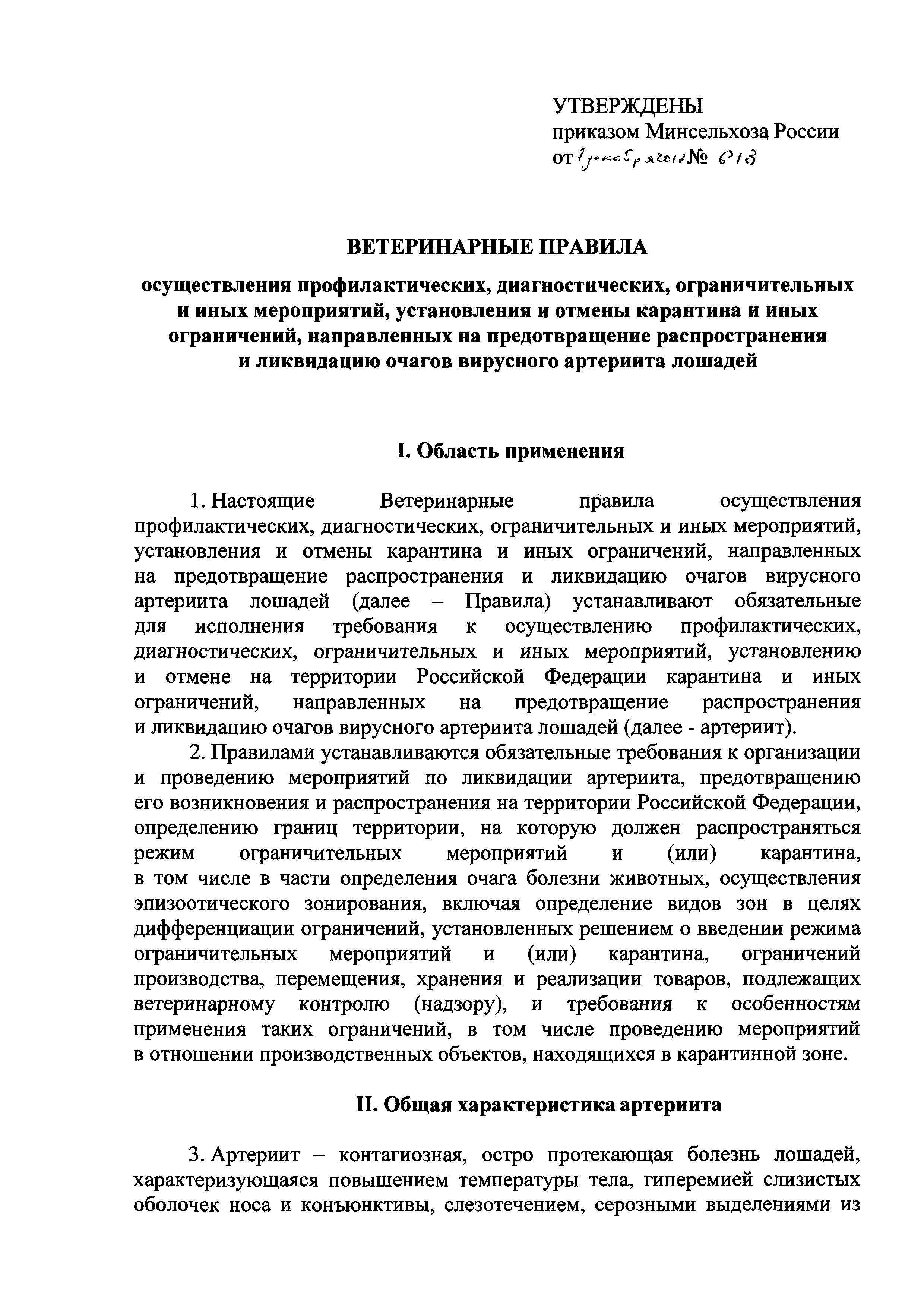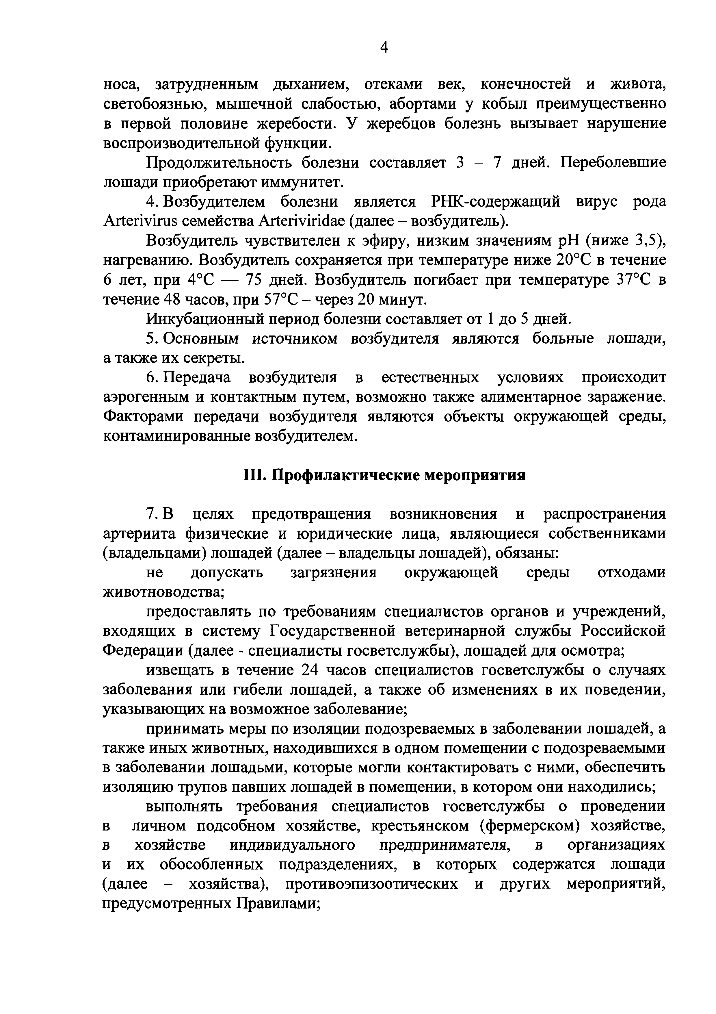 Ветеринарные правила осуществления профилактических, диагностических, ограничительных и иных мероприятий, установления и отмены карантина и иных ограничений, направленных на предотвращение распространения и ликвидацию очагов вирусного артериита лошадей| Статус: | действует | | Название рус.: | Ветеринарные правила осуществления профилактических, диагностических, ограничительных и иных мероприятий, установления и отмены карантина и иных ограничений, направленных на предотвращение распространения и ликвидацию очагов вирусного артериита лошадей | | Дата добавления в базу: | 01.01.2019 | | Дата актуализации: | 01.01.2021 | | Дата введения: | 20.01.2018 | | Область применения: | Ветеринарные правила устанавливают обязательные для исполнения требования к осуществлению профилактических, диагностических, ограничительных и иных мероприятий, установлению и отмене на территории Российской Федерации карантина и иных ограничений, направленных на предотвращение распространения и ликвидацию очагов вирусного артериита лошадей. | | Оглавление: | I. Область применения II. Общая характеристика артериита III. Профилактические мероприятия IV. Мероприятия при подозрении на артериит V. Диагностические мероприятия VI. Установление карантина, ограничительные и иные мероприятия, направленные на ликвидацию очагов артериита, а также на предотвращение его распространения VII. Отмена карантина | | Утверждён: | 07.12.2017 Министерство сельского хозяйства Российской Федерации (613)